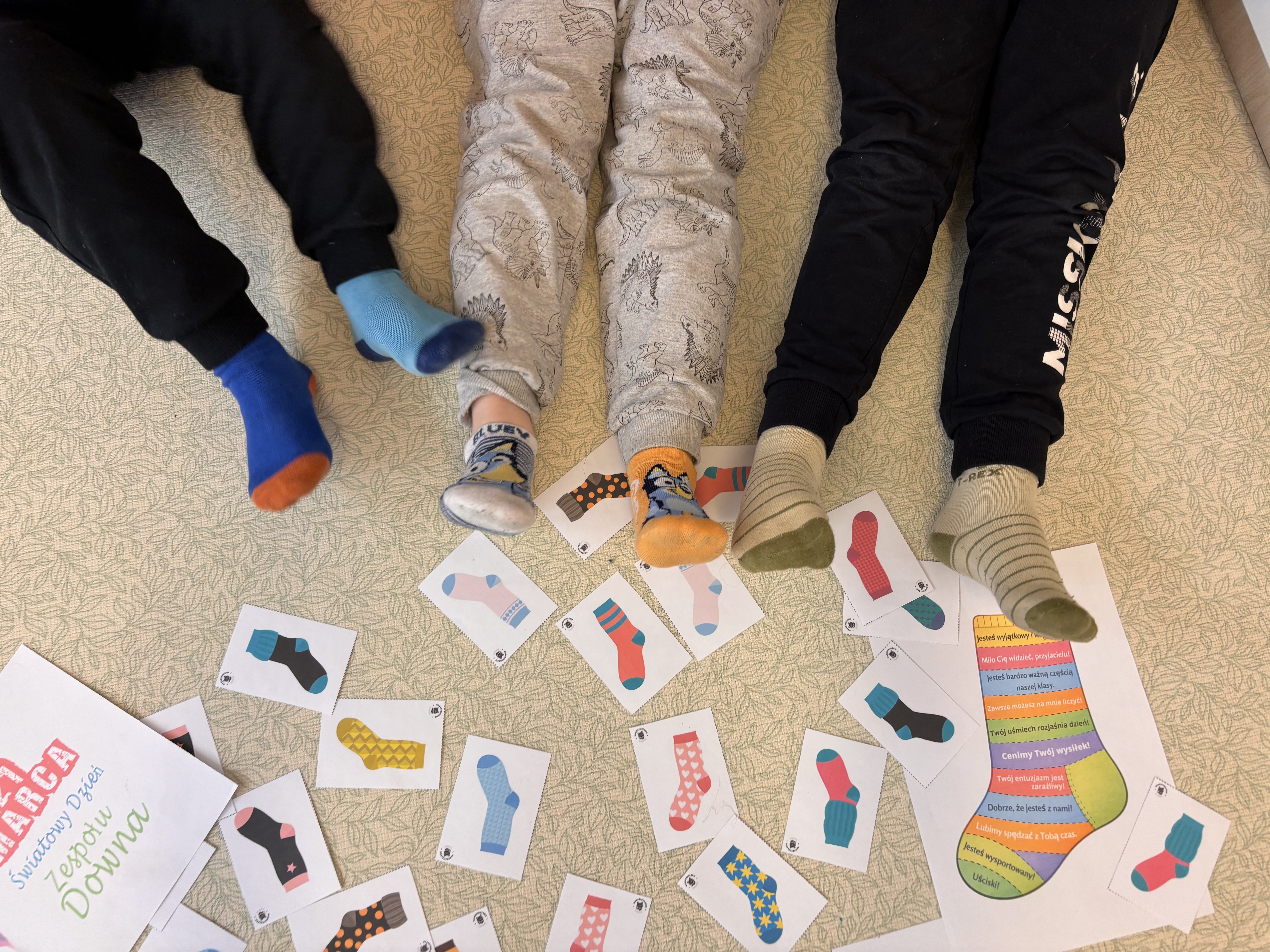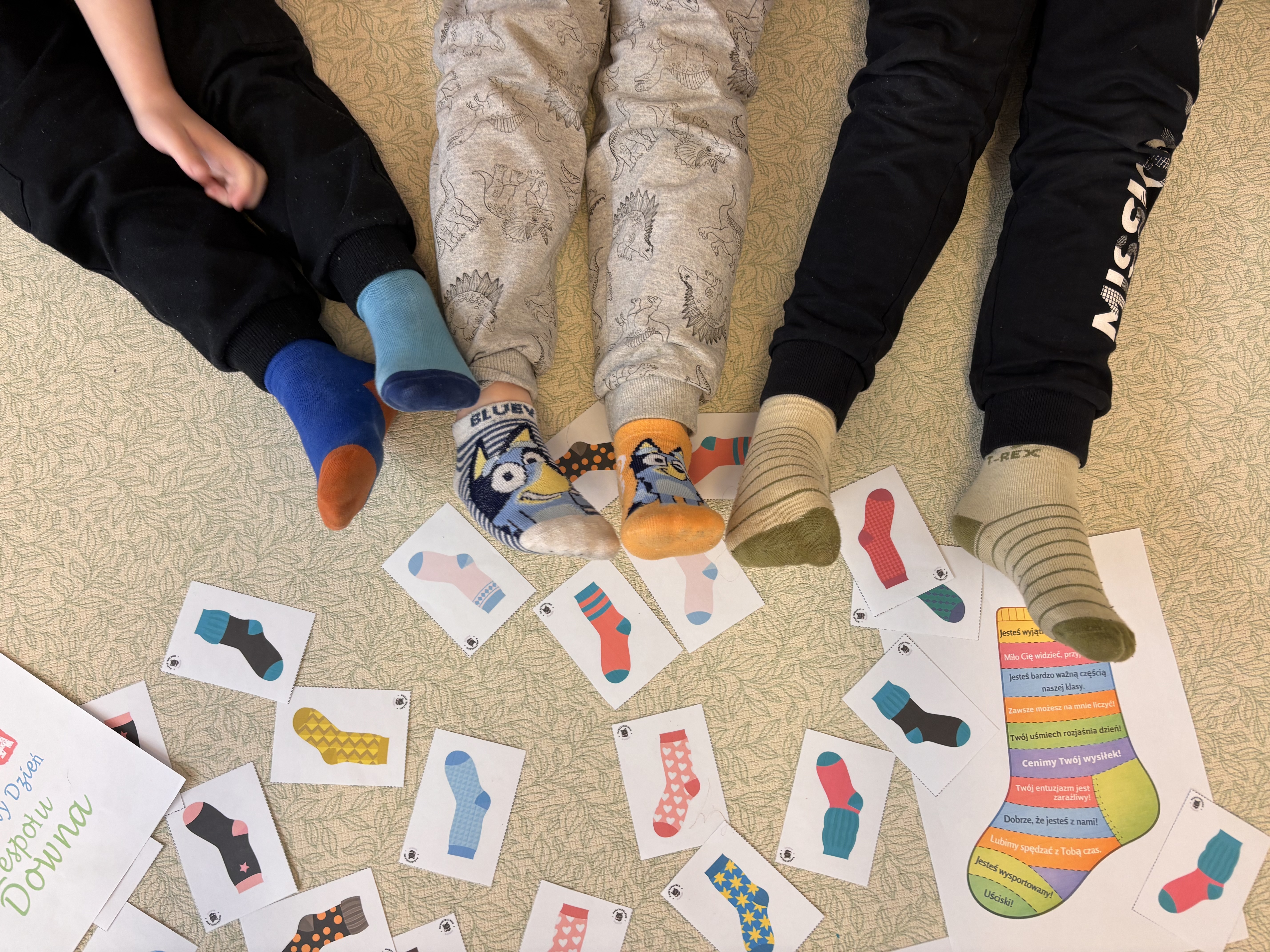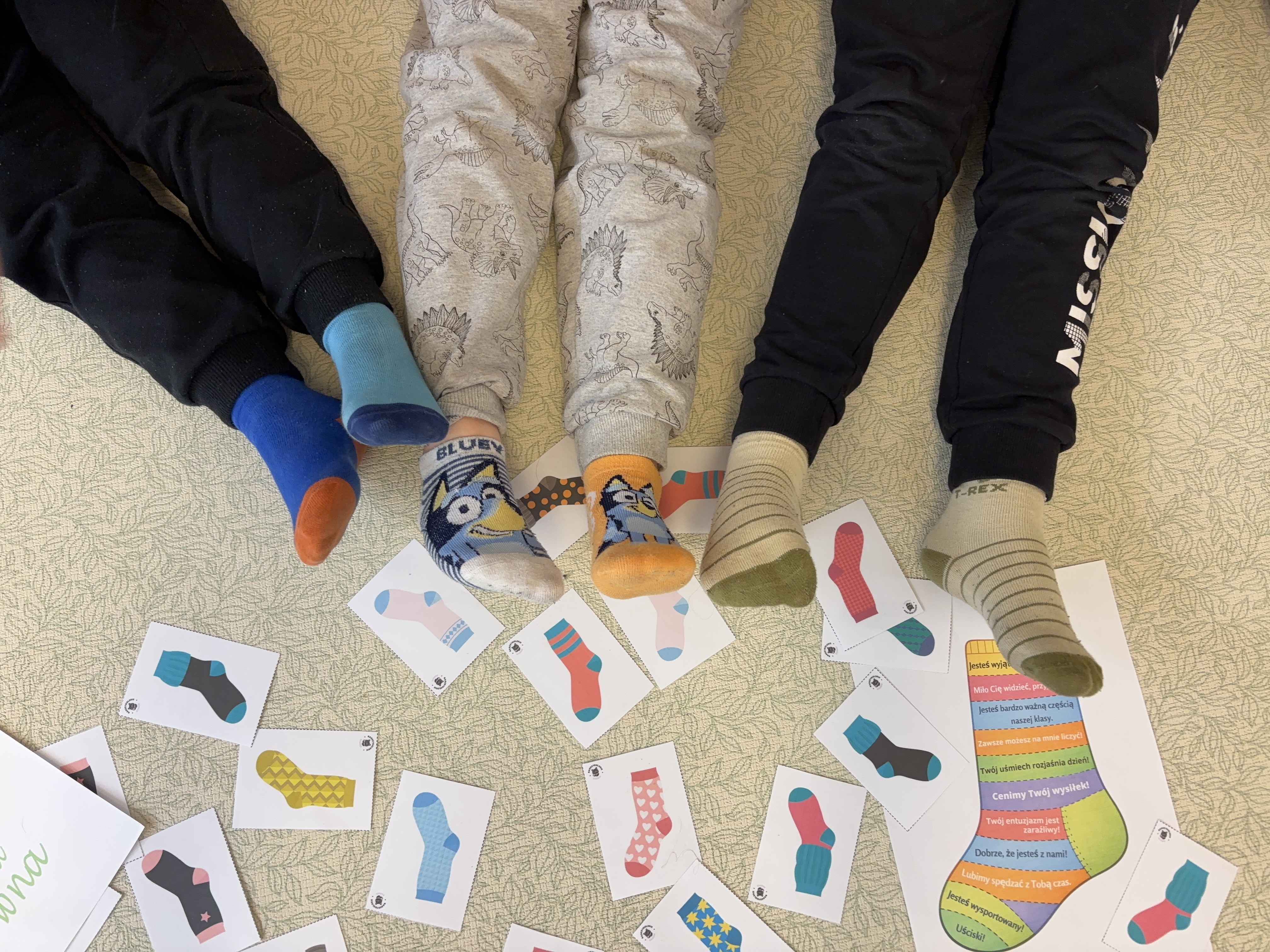 Dzieci przyszły w kolorowych skarpetkach, pokazując, że każdy z nas jest wyjątkowy i niepowtarzalny. Rozmawialiśmy o tym, jak ważna jest akceptacja, szacunek i bycie dobrym dla innych.