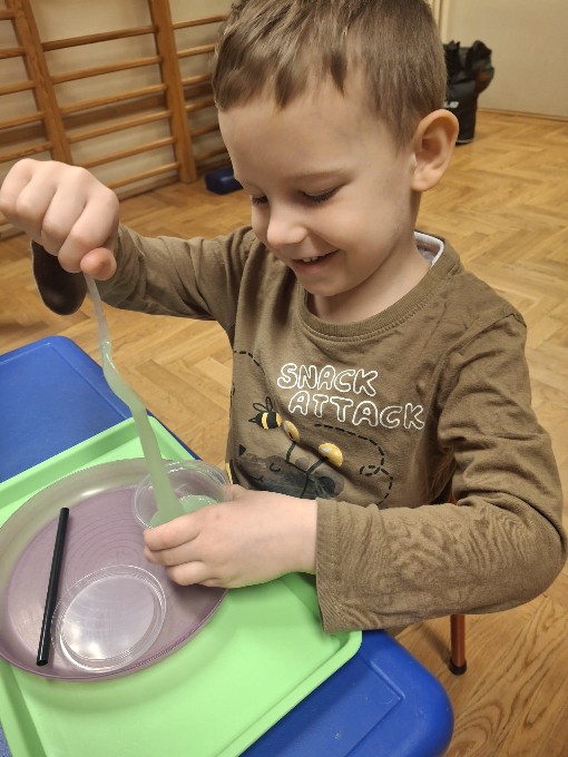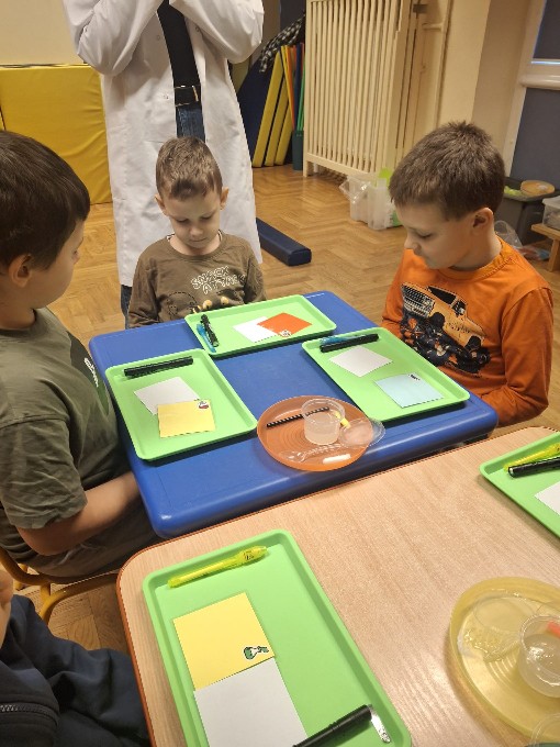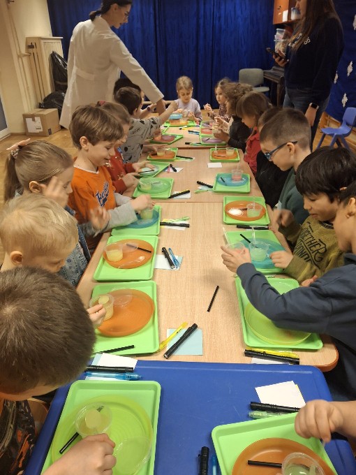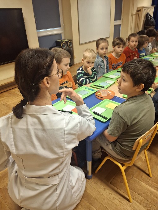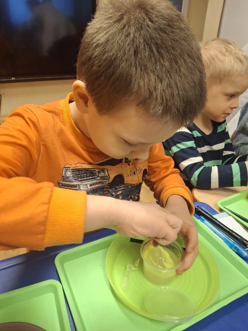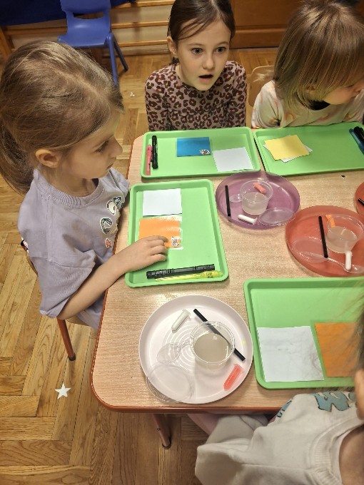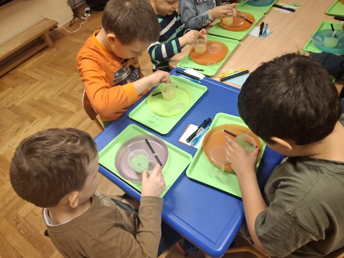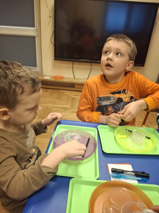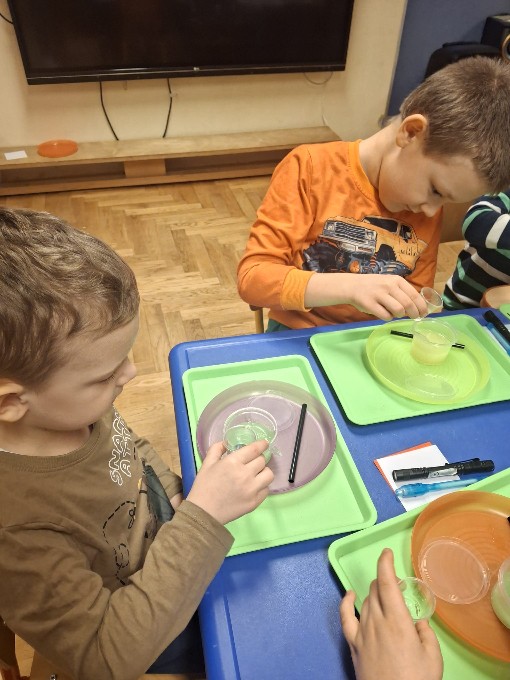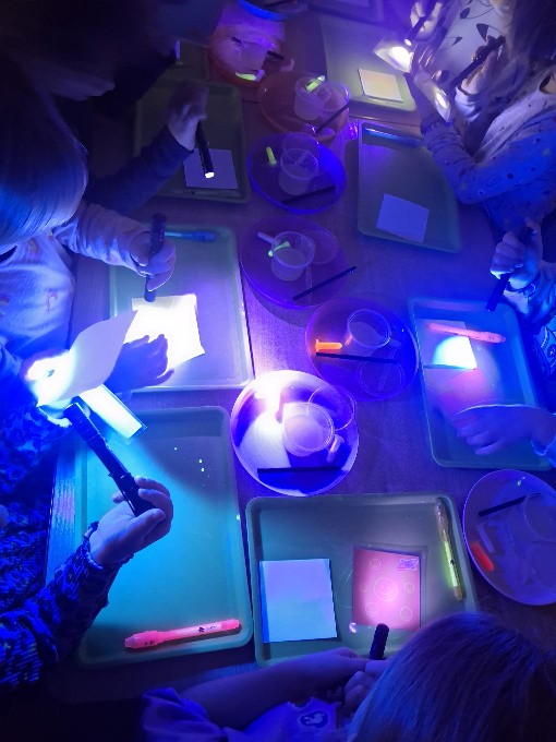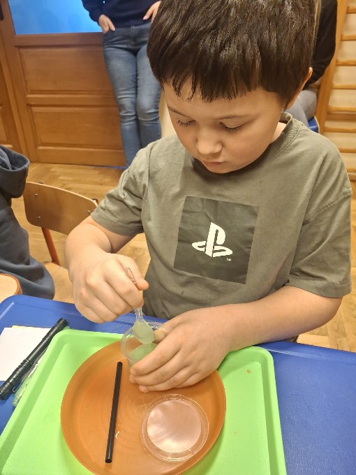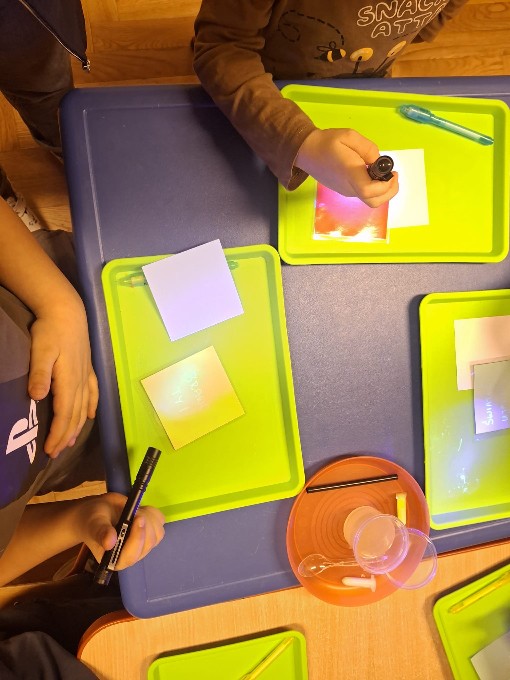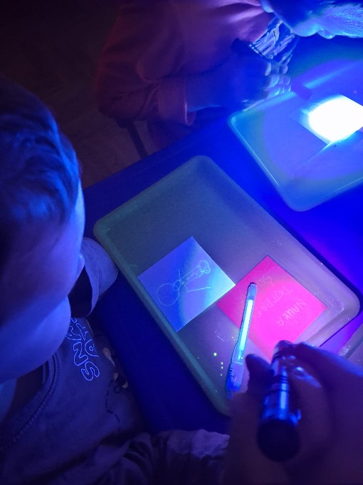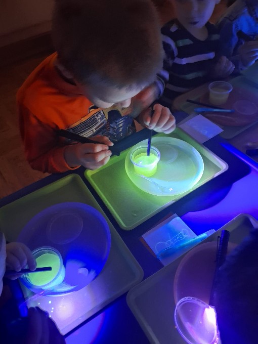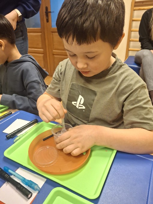 Podczas zajęć dzieci przeniosły się w niezwykły świat fluorescencji czyli zjawiska, dzięki któremu zwyczajne rzeczy nagle zaczynają świecić niezwykłymi kolorami. To było spotkanie z magią nauki, która wyglądała jak czarodziejski pokaz, a tak naprawdę kryła w sobie fascynującą fizykę i chemię.