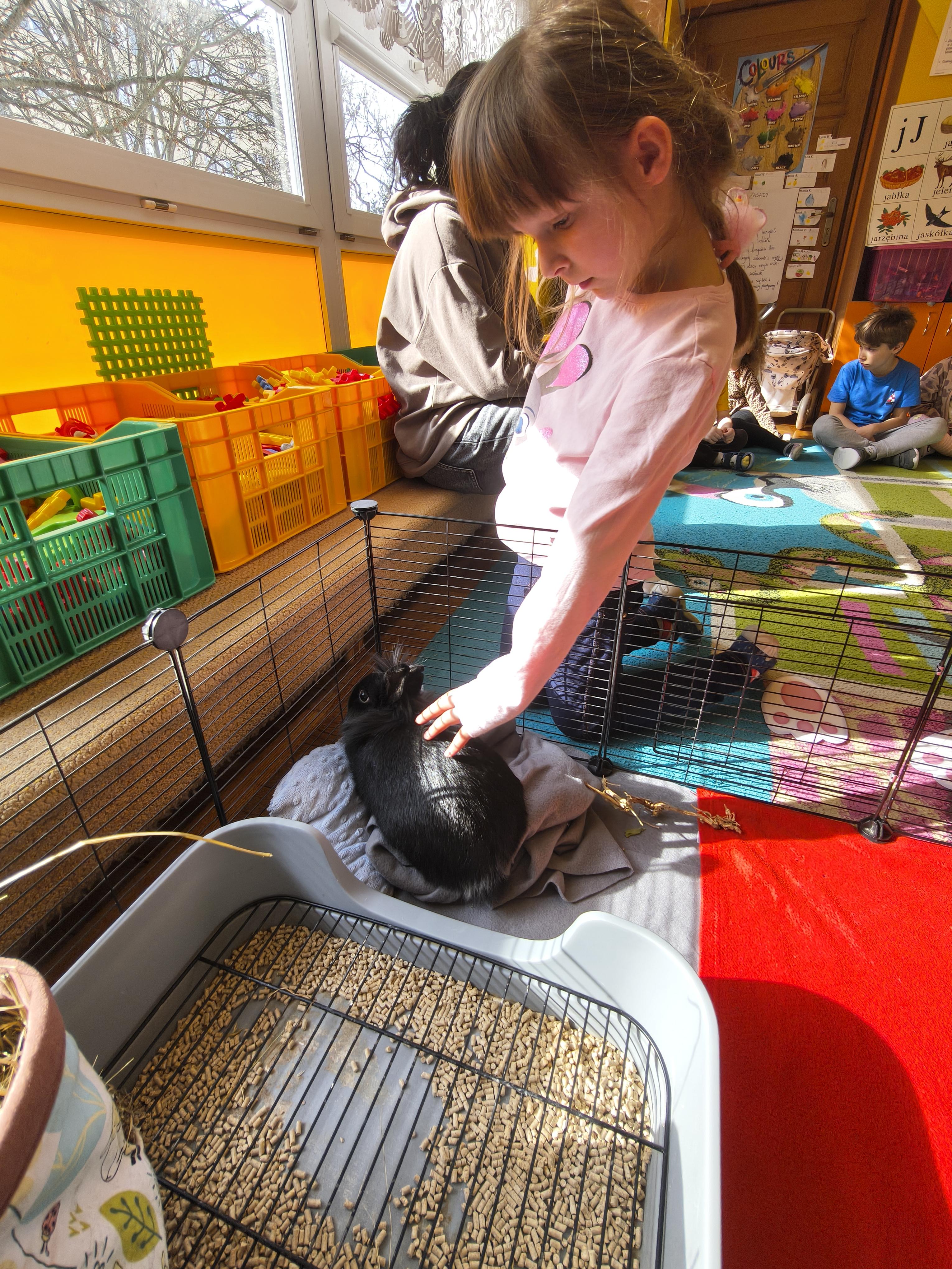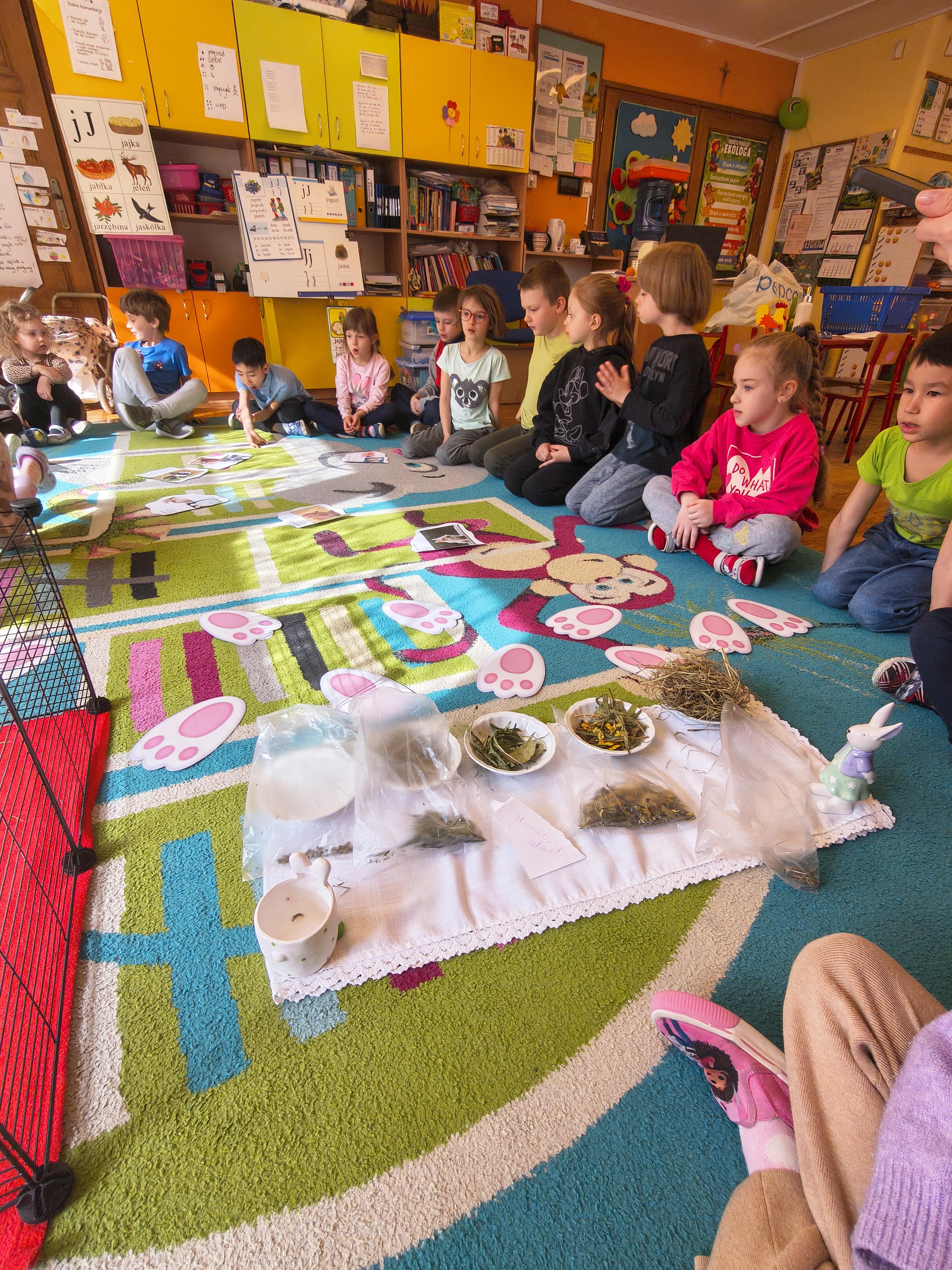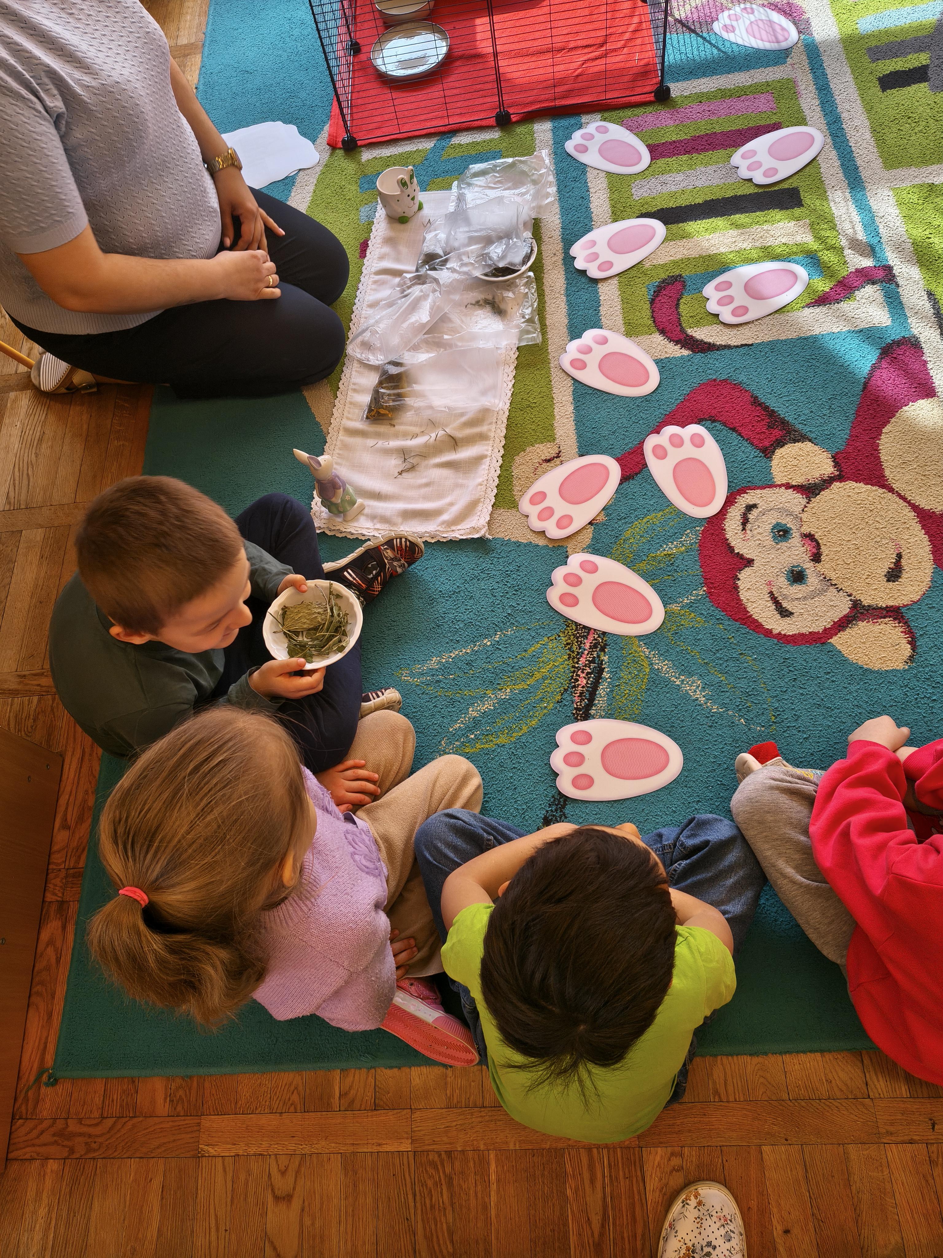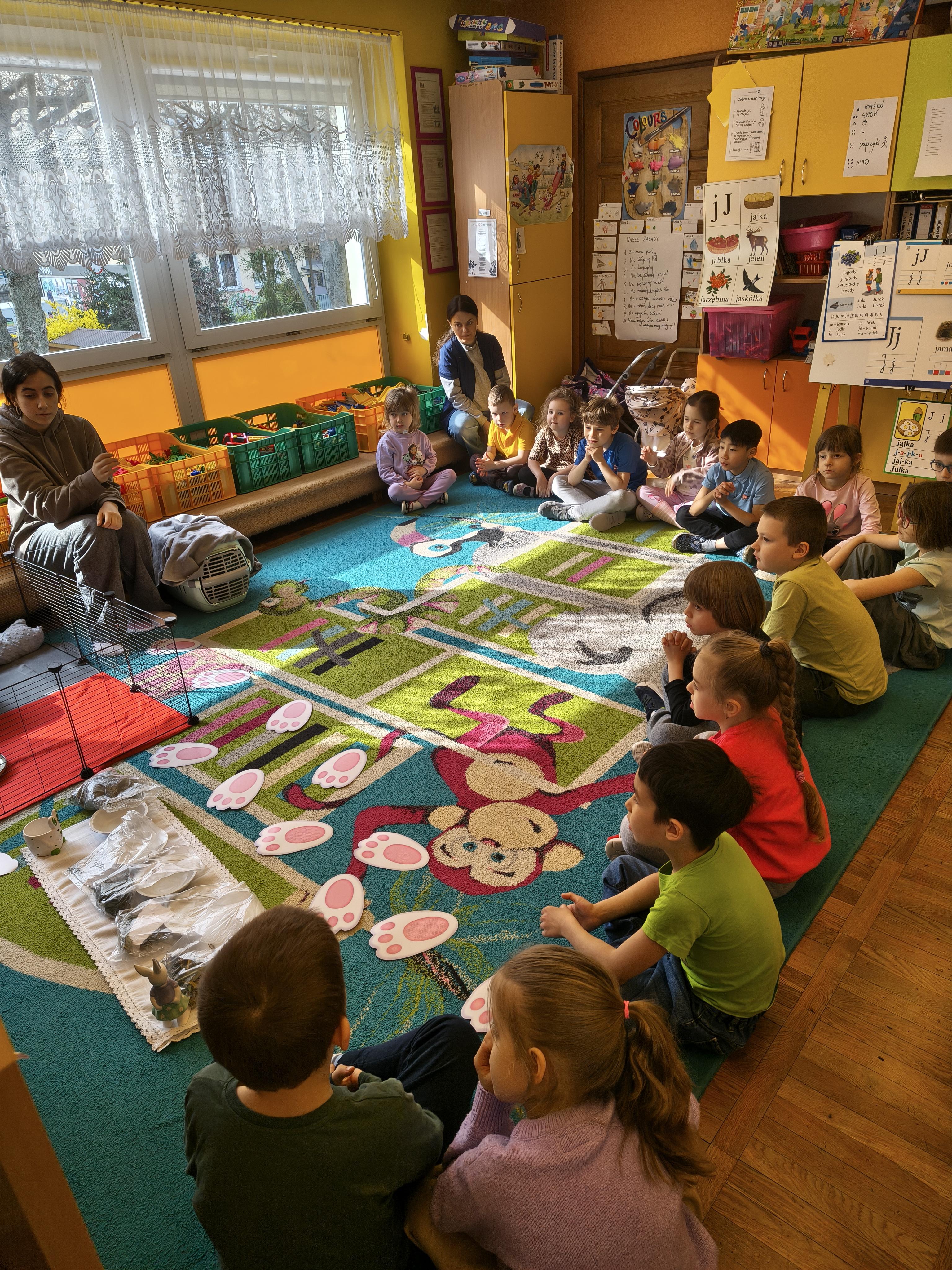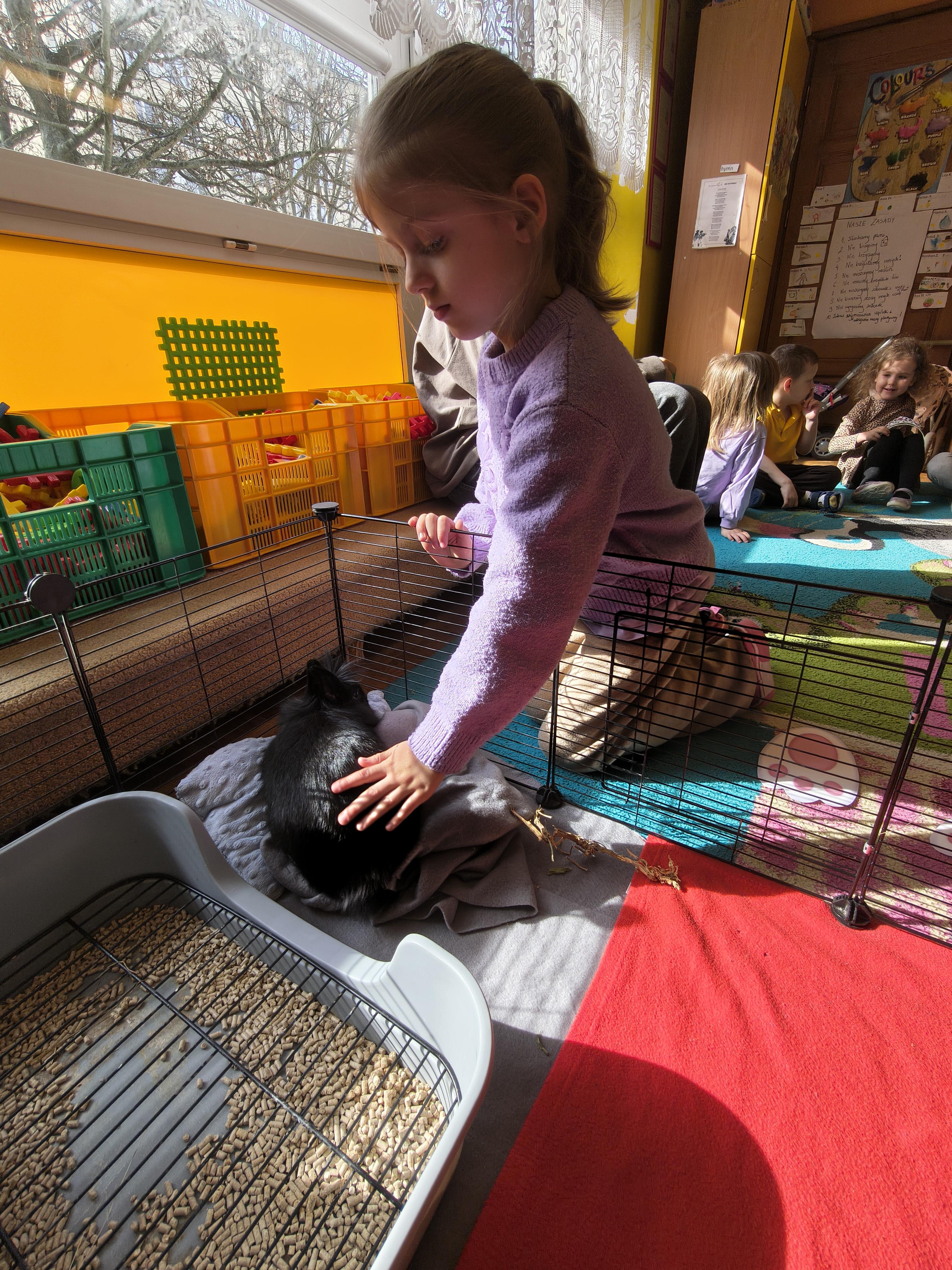 Dzieci spotkały się z niezwykłym gościem- króliczkiem i "jego rodziną". Mama i siostra Majki opowiedziały o hodowli zwierzaka, przytoczyły ciekawostki i opowiedziały o rasach i zwyczajach tych ssaków. Dzieci mogły samodzielnie skomponować jedzenie dla gościa i pogłaskać jego miękkie futerko. Spotkenie było ciekawą lekcją uczącą odpowiedzialności za żywe istoty.