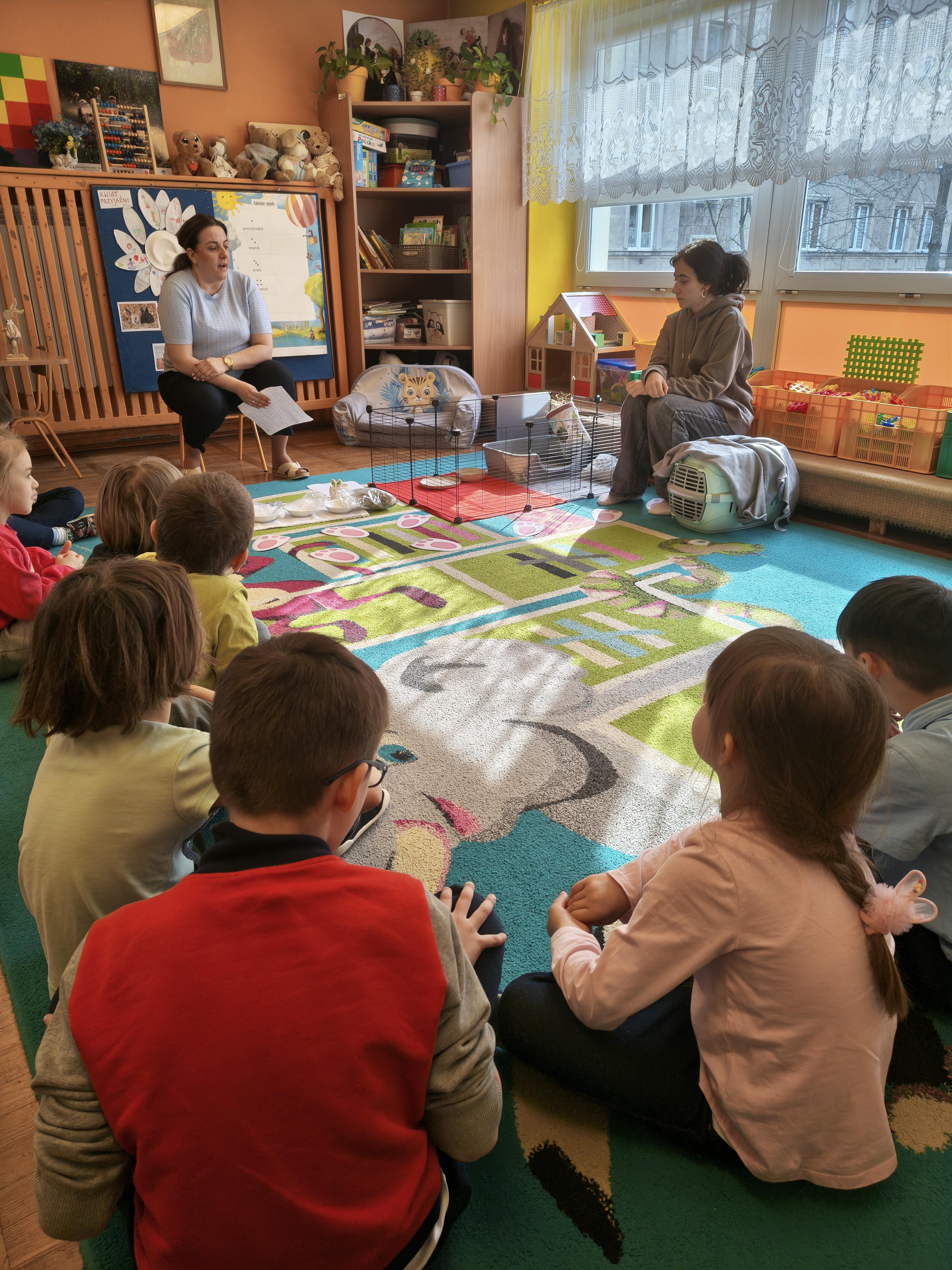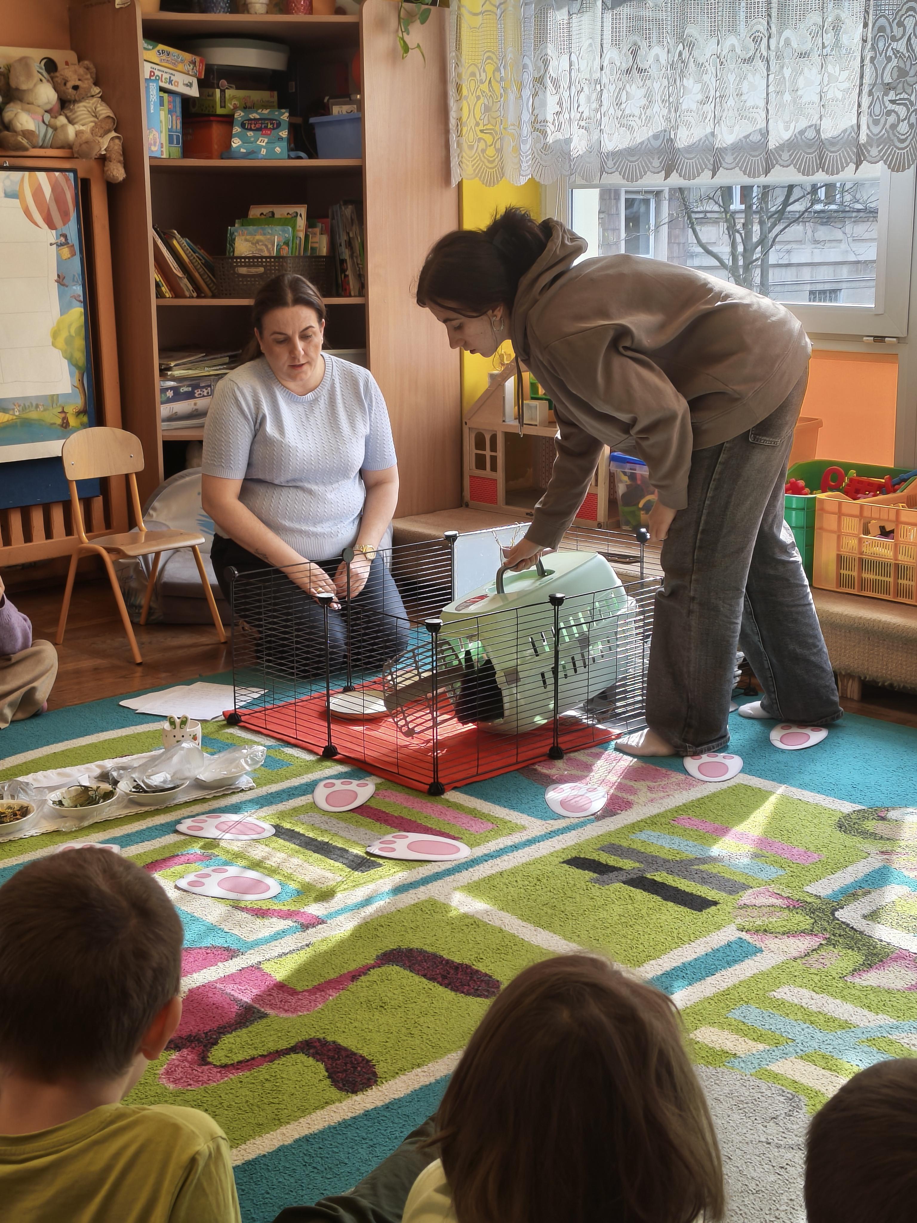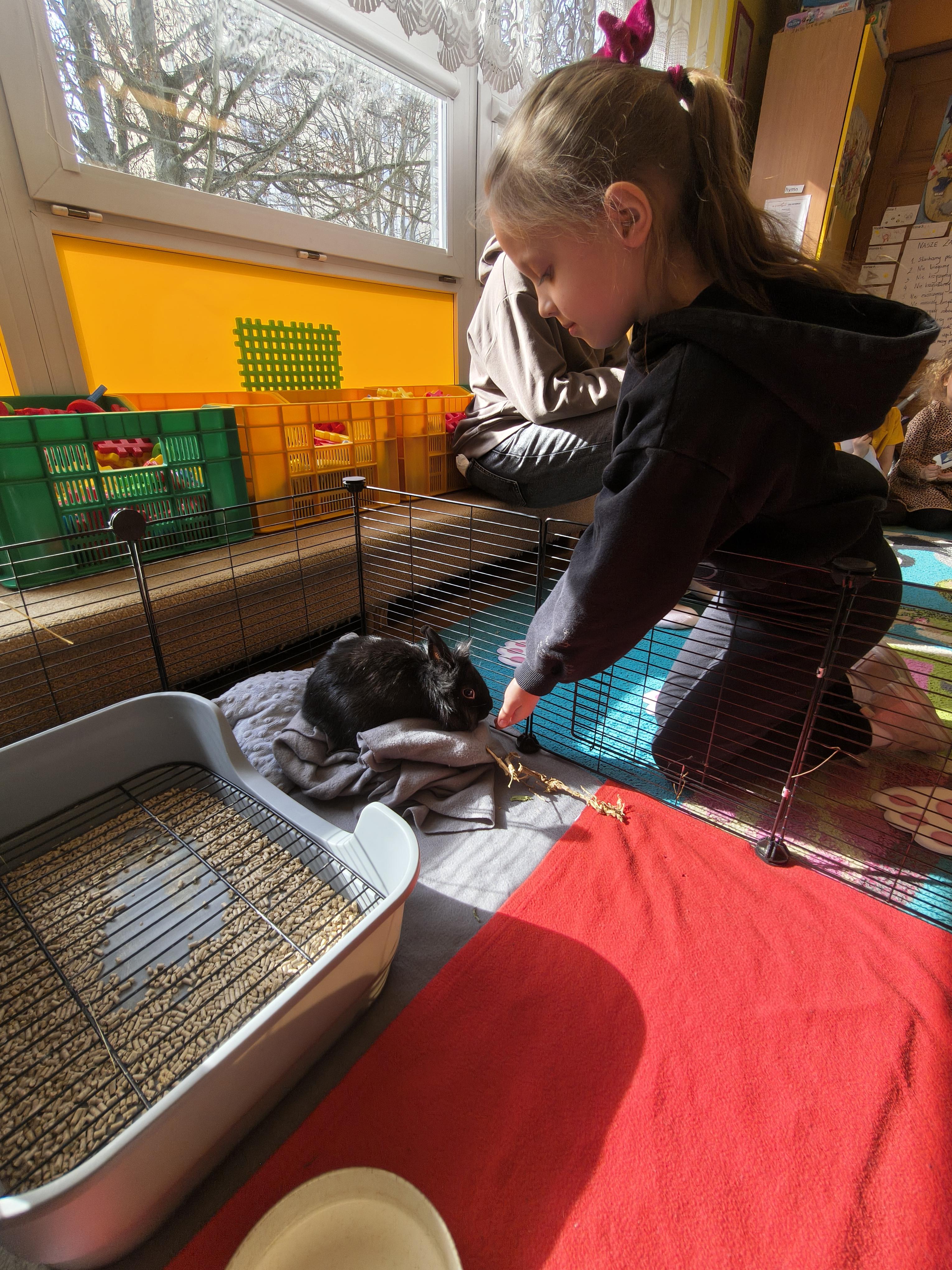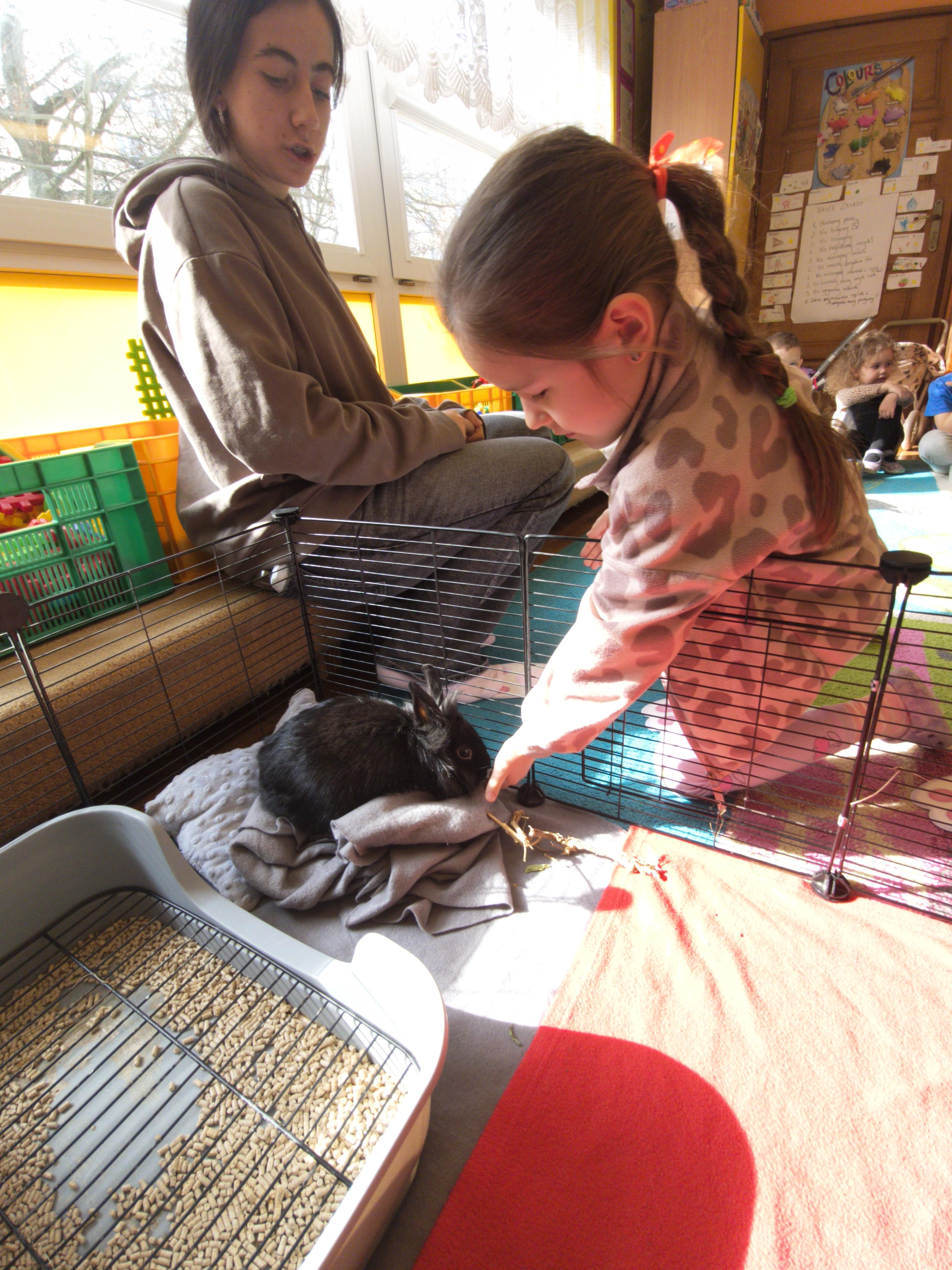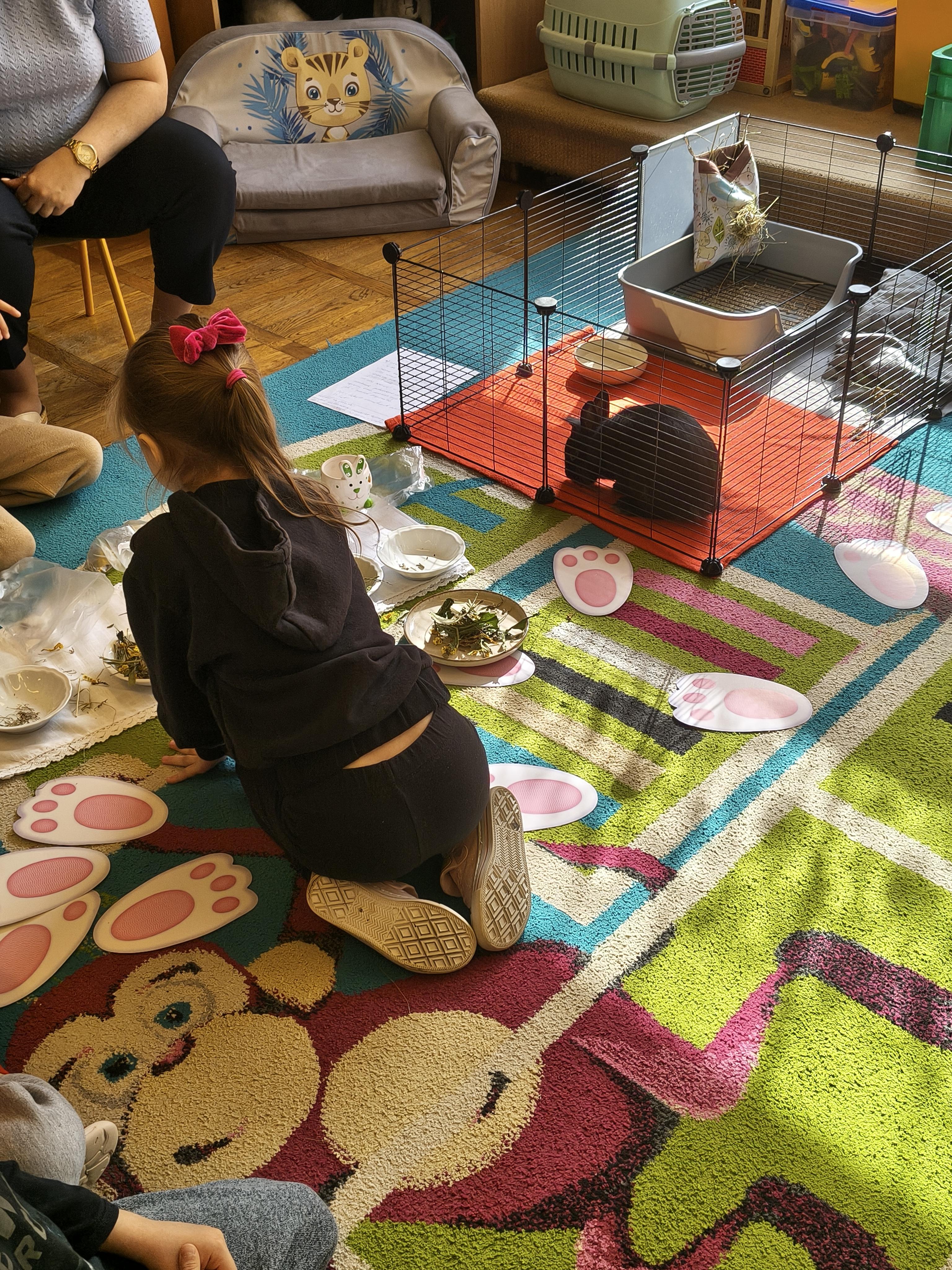 Dzieci spotkały się z niezwykłym gościem- króliczkiem i "jego rodziną". Mama i siostra Majki opowiedziały o hodowli zwierzaka, przytoczyły ciekawostki i opowiedziały o rasach i zwyczajach tych ssaków. Dzieci mogły samodzielnie skomponować jedzenie dla gościa i pogłaskać jego miękkie futerko. Spotkenie było ciekawą lekcją uczącą odpowiedzialności za żywe istoty.