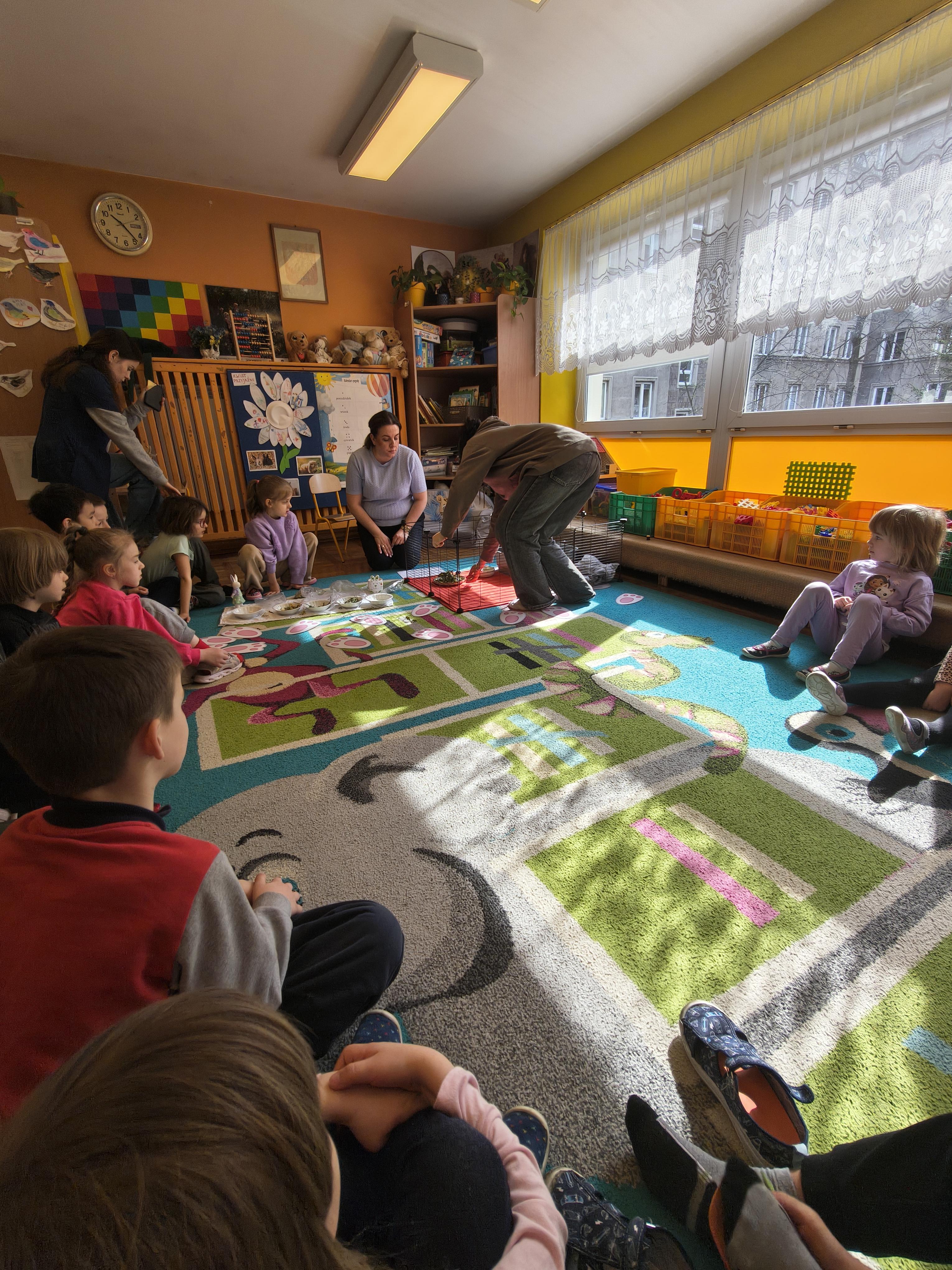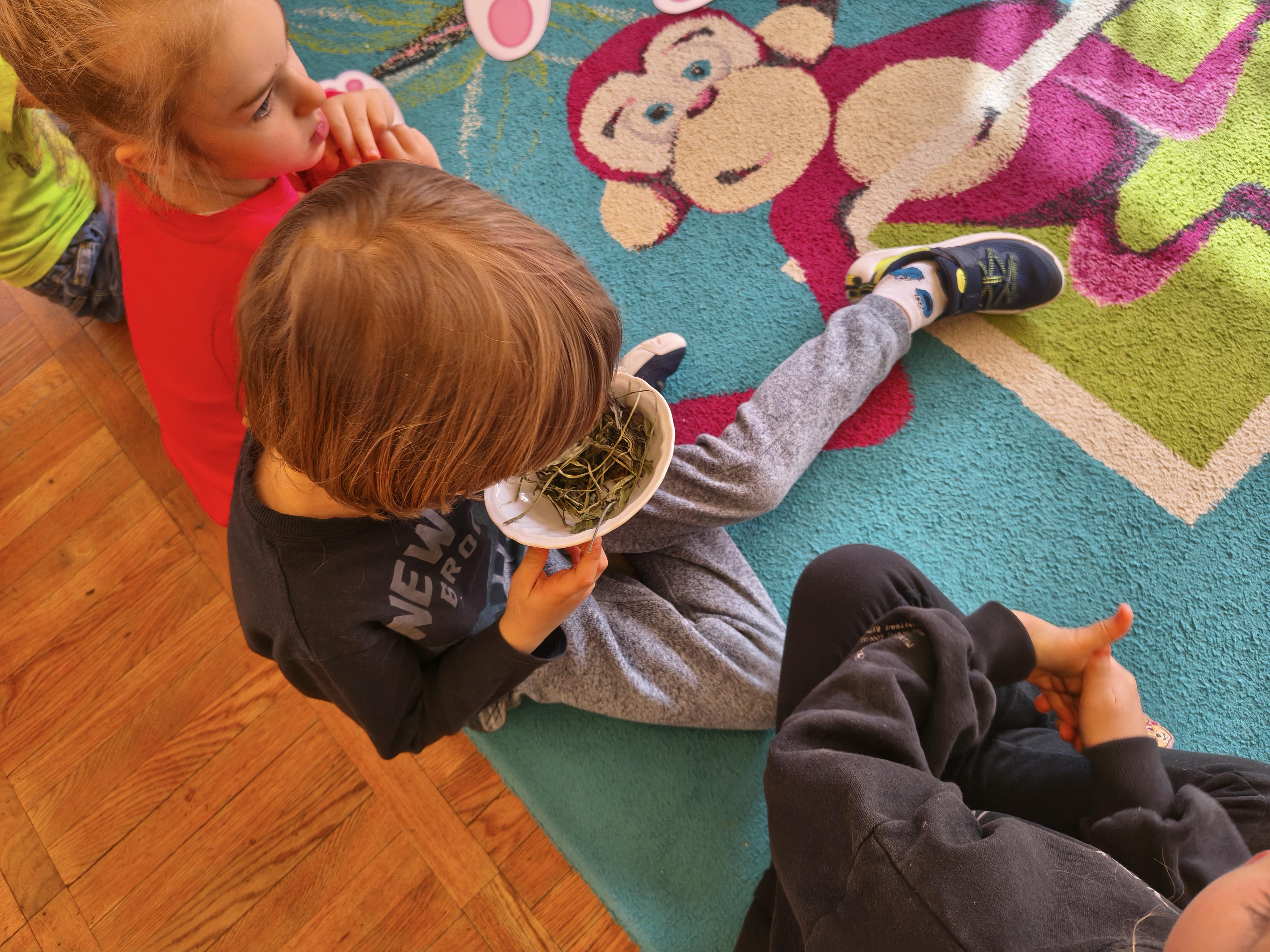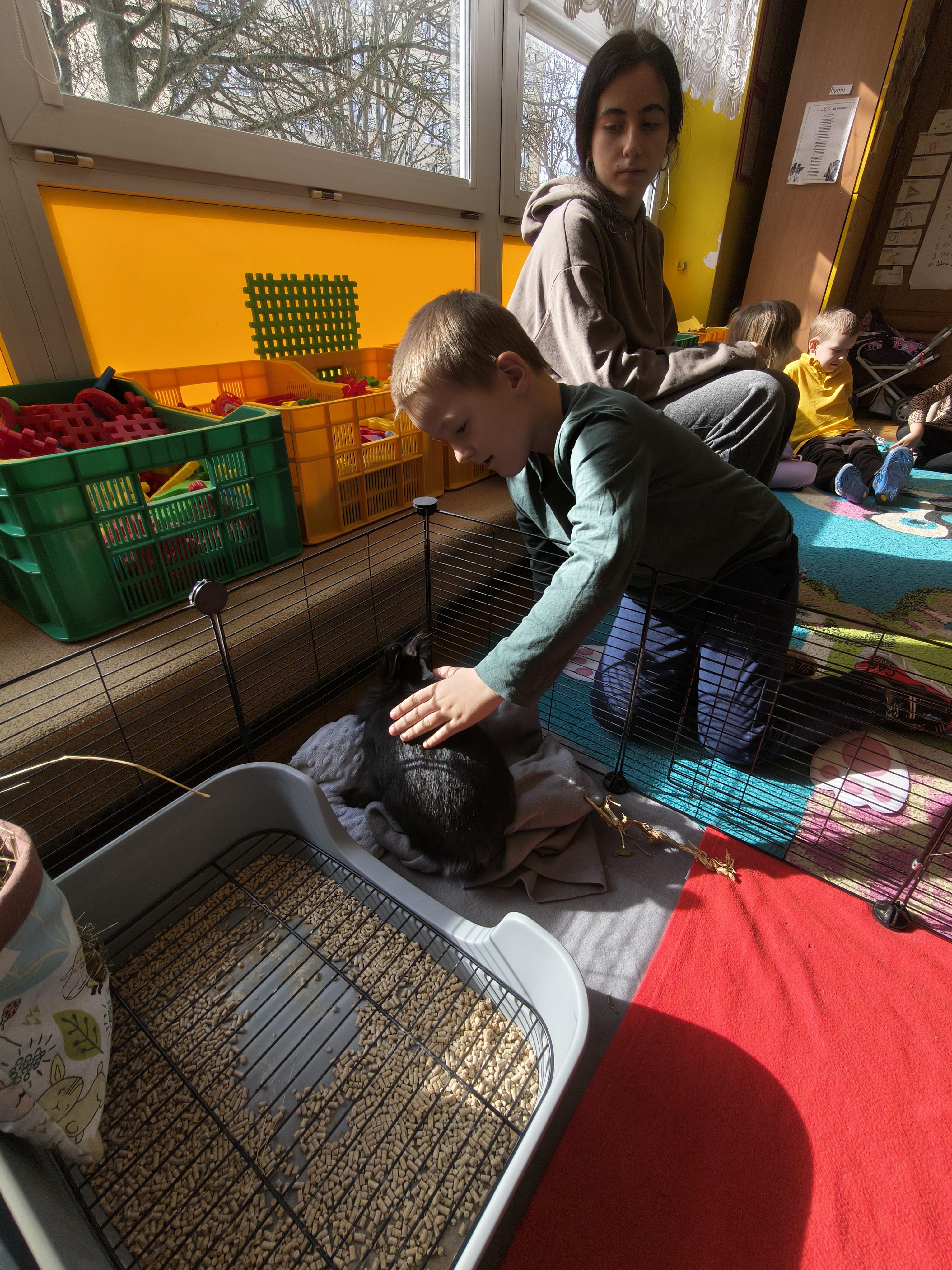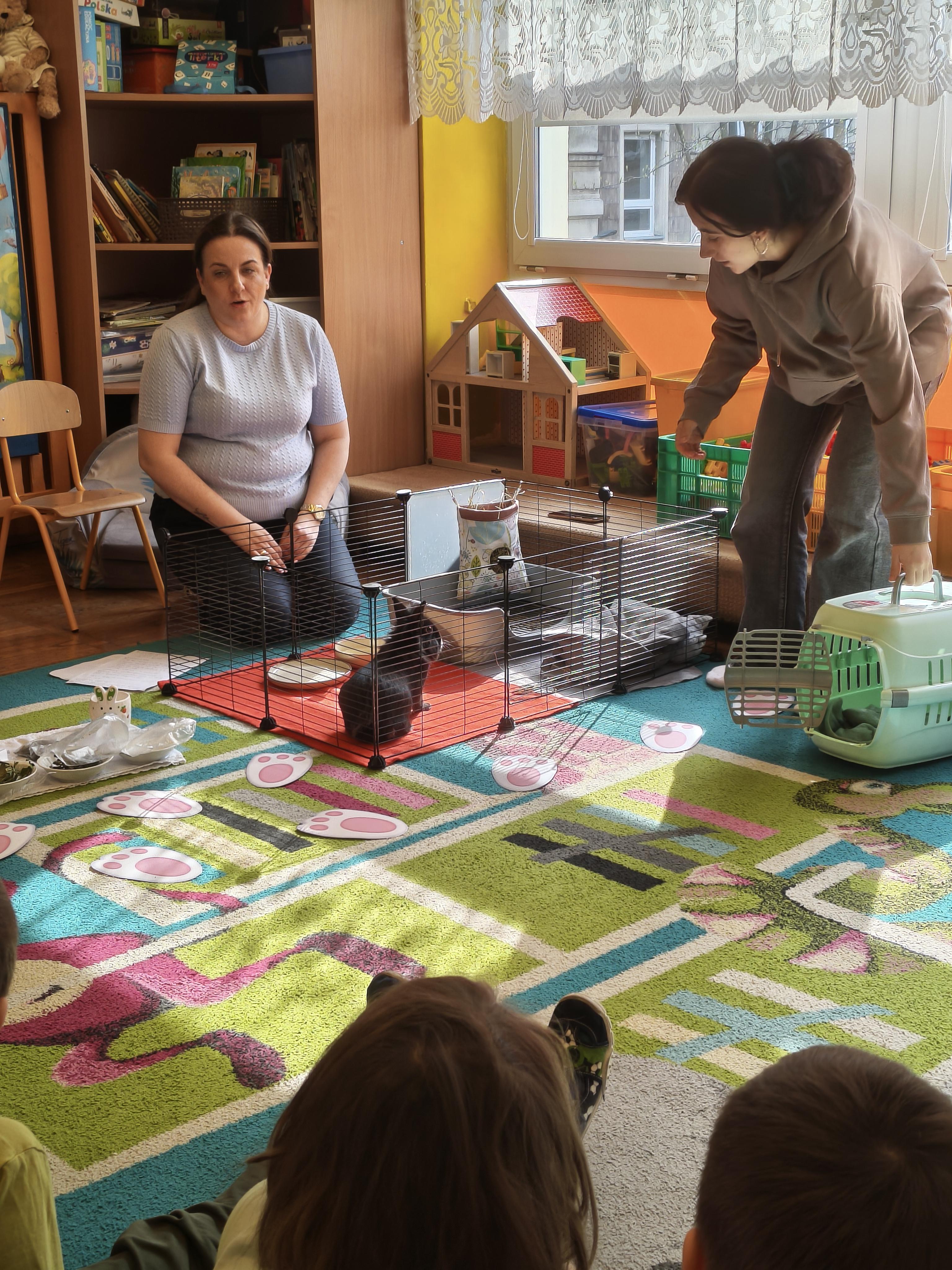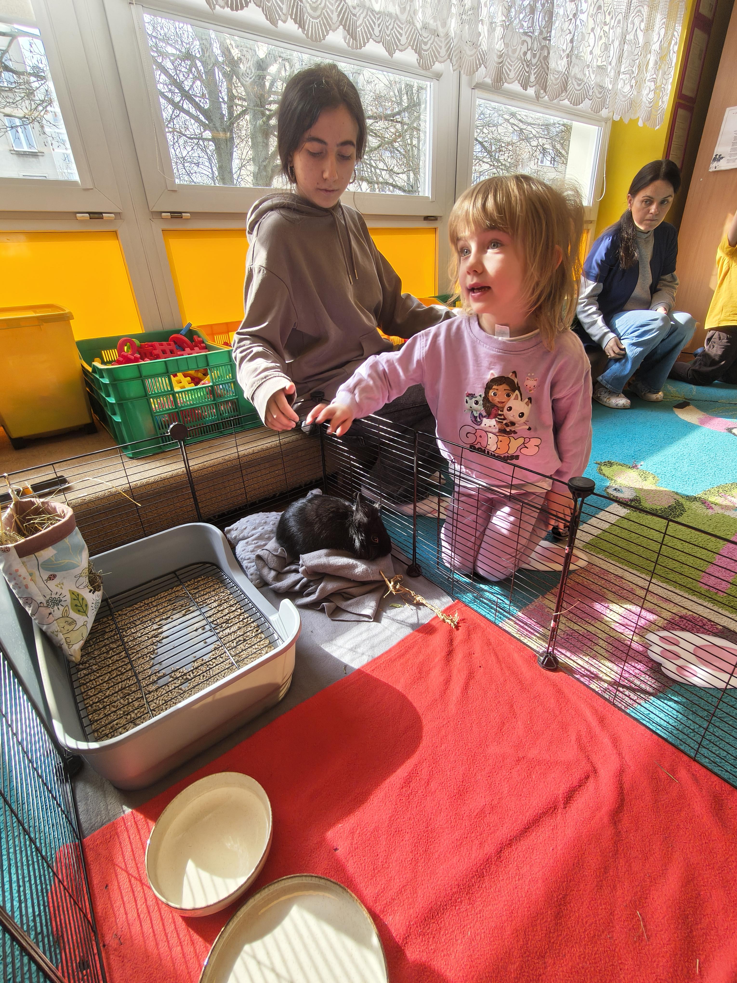 Dzieci spotkały się z niezwykłym gościem- króliczkiem i "jego rodziną". Mama i siostra Majki opowiedziały o hodowli zwierzaka, przytoczyły ciekawostki i opowiedziały o rasach i zwyczajach tych ssaków. Dzieci mogły samodzielnie skomponować jedzenie dla gościa i pogłaskać jego miękkie futerko. Spotkenie było ciekawą lekcją uczącą odpowiedzialności za żywe istoty.