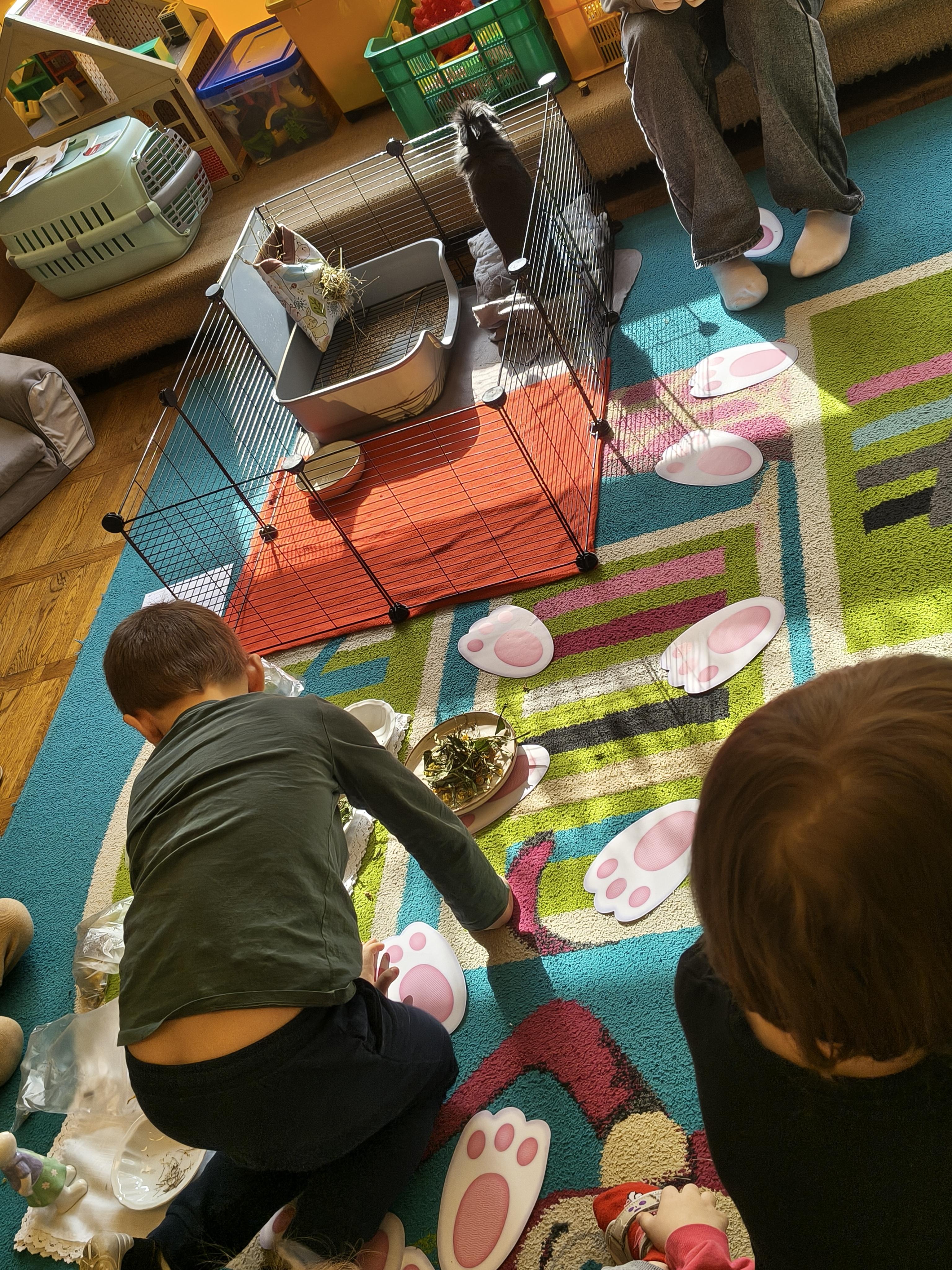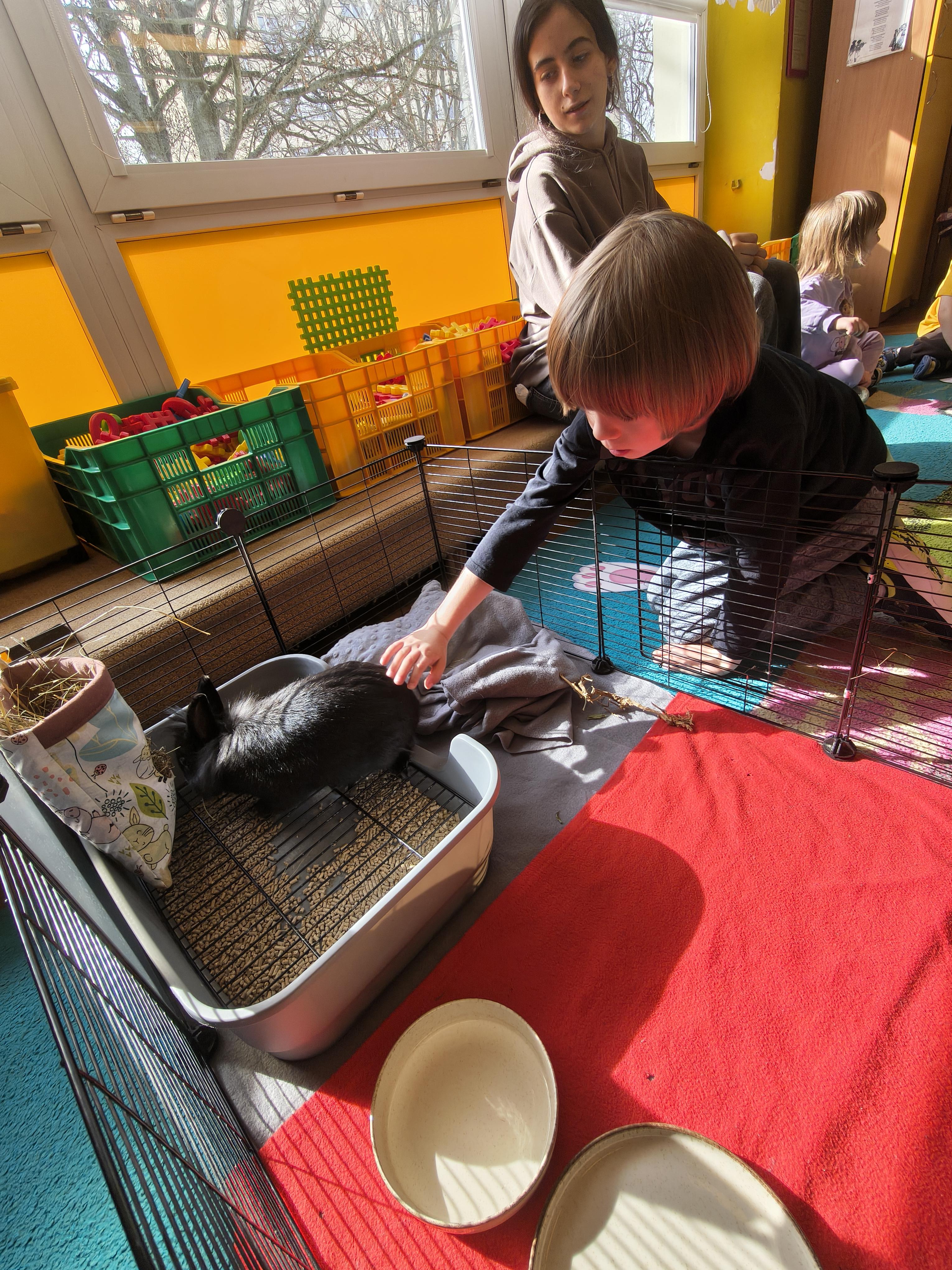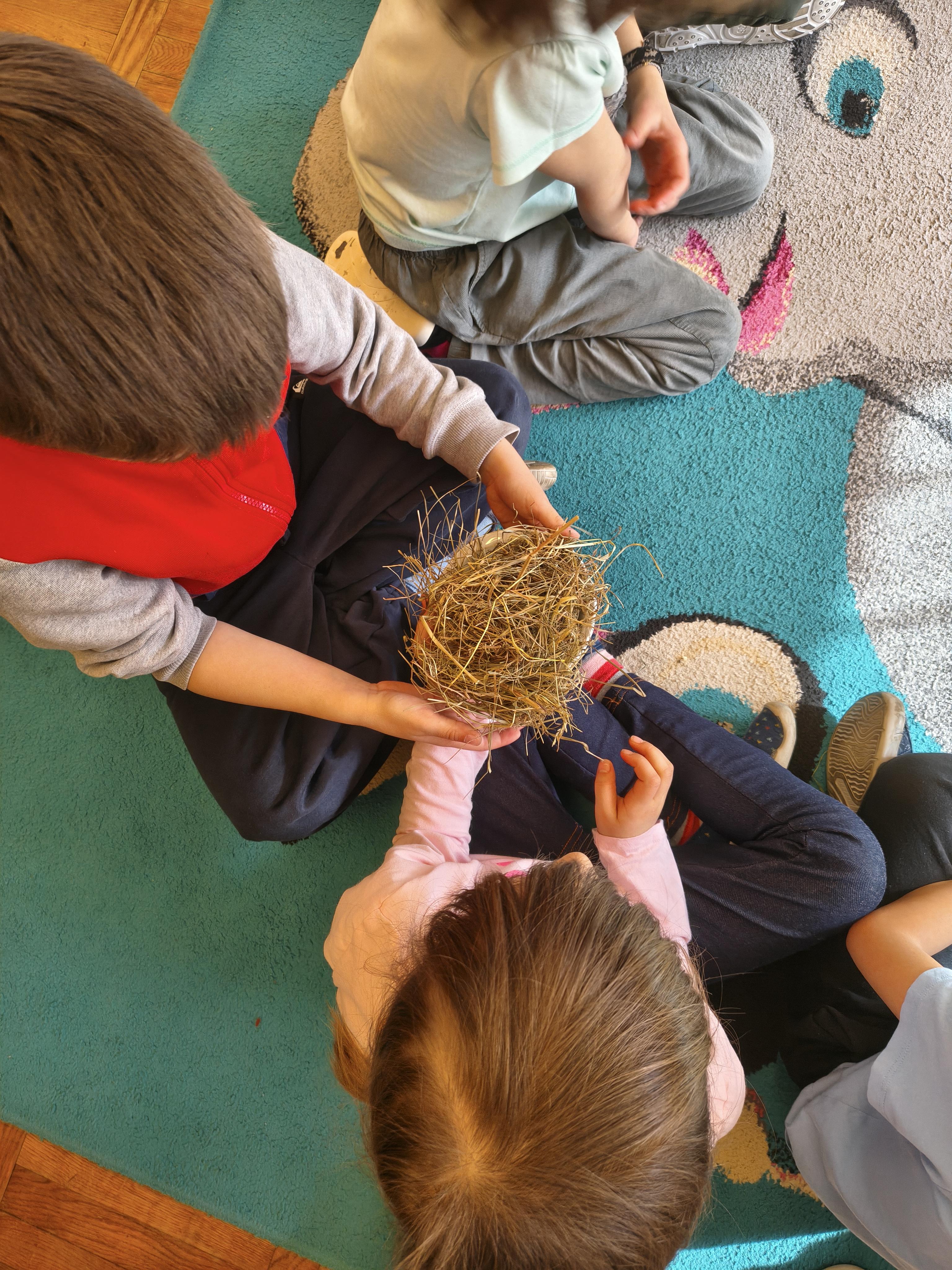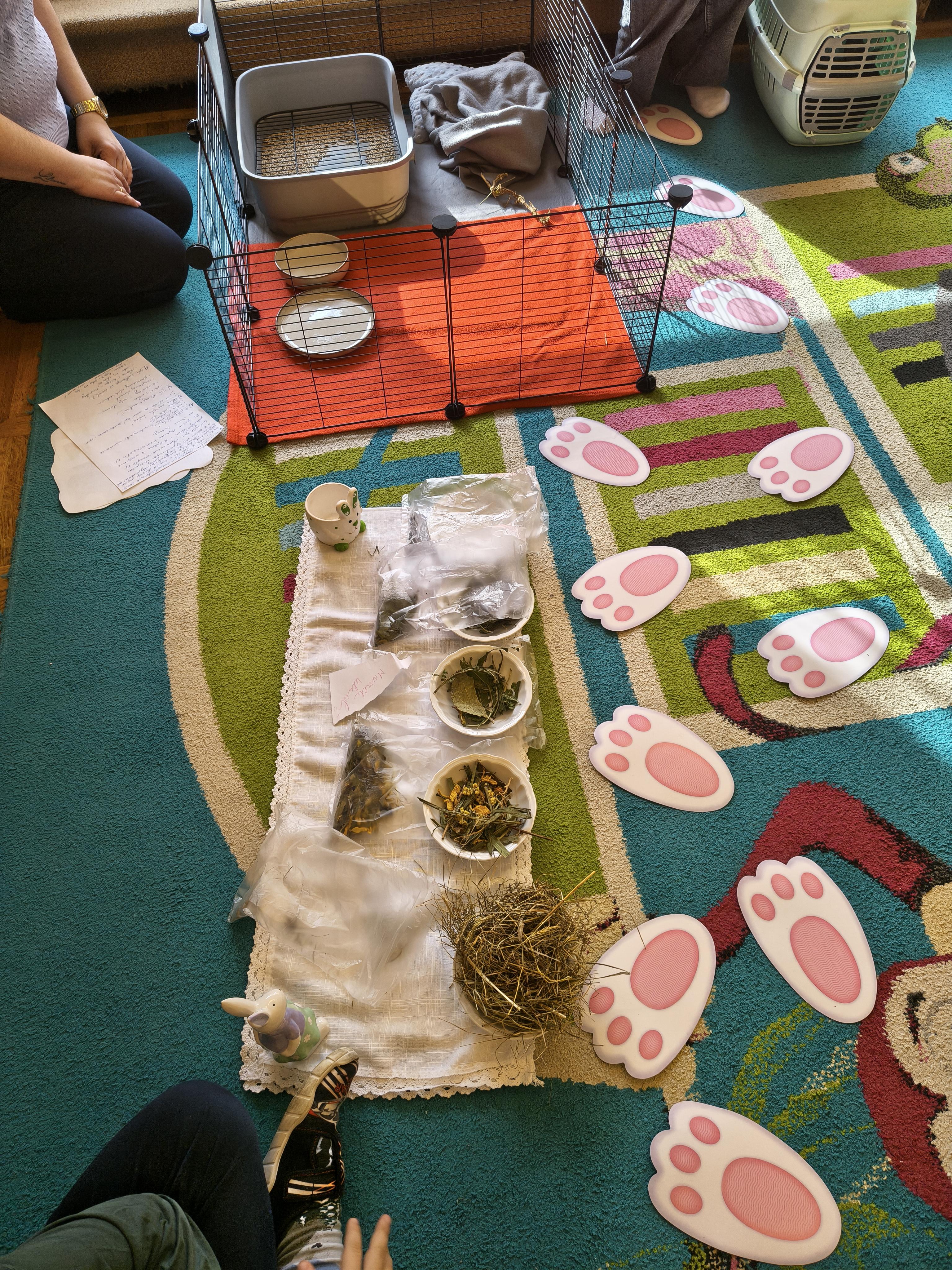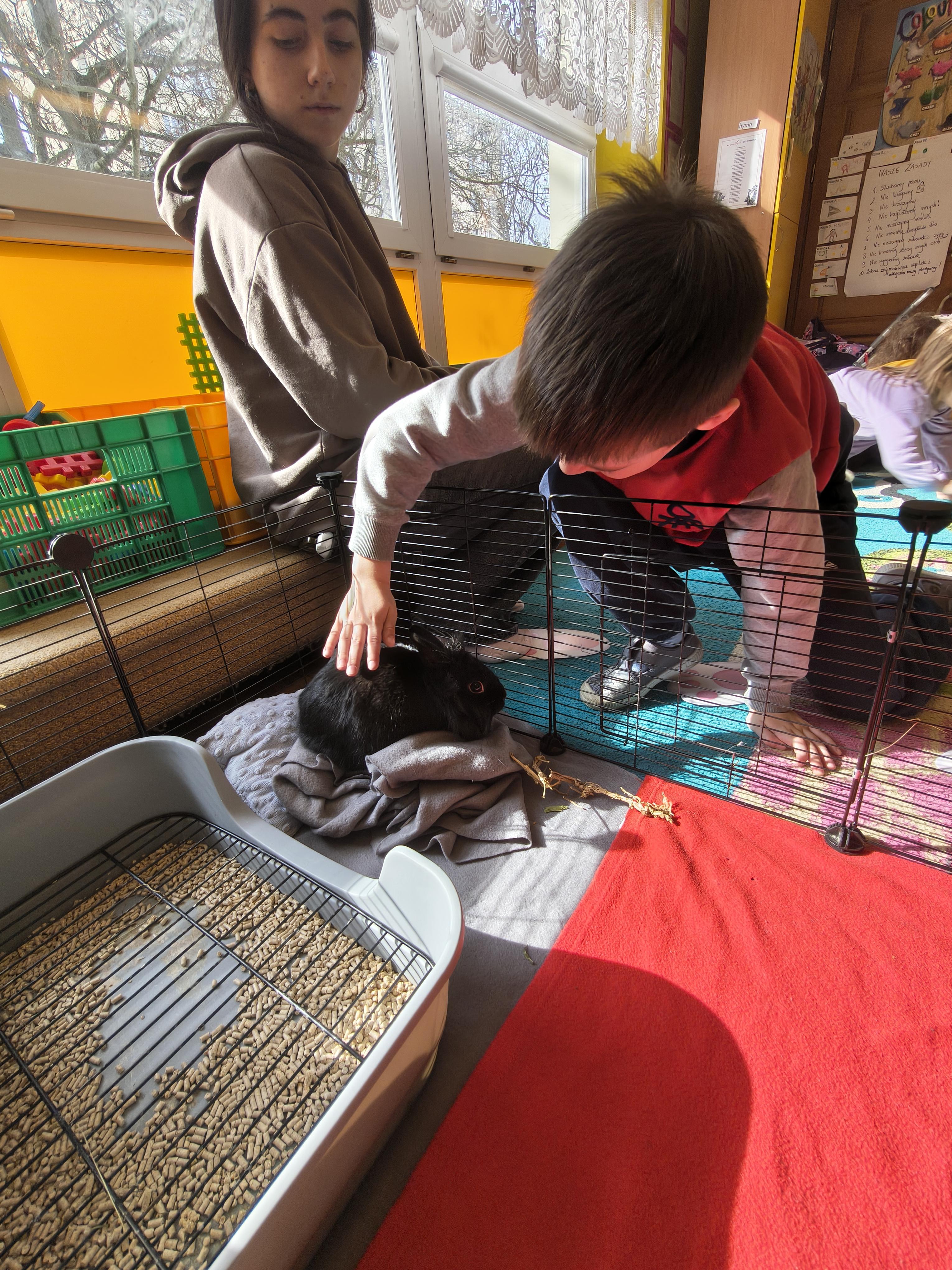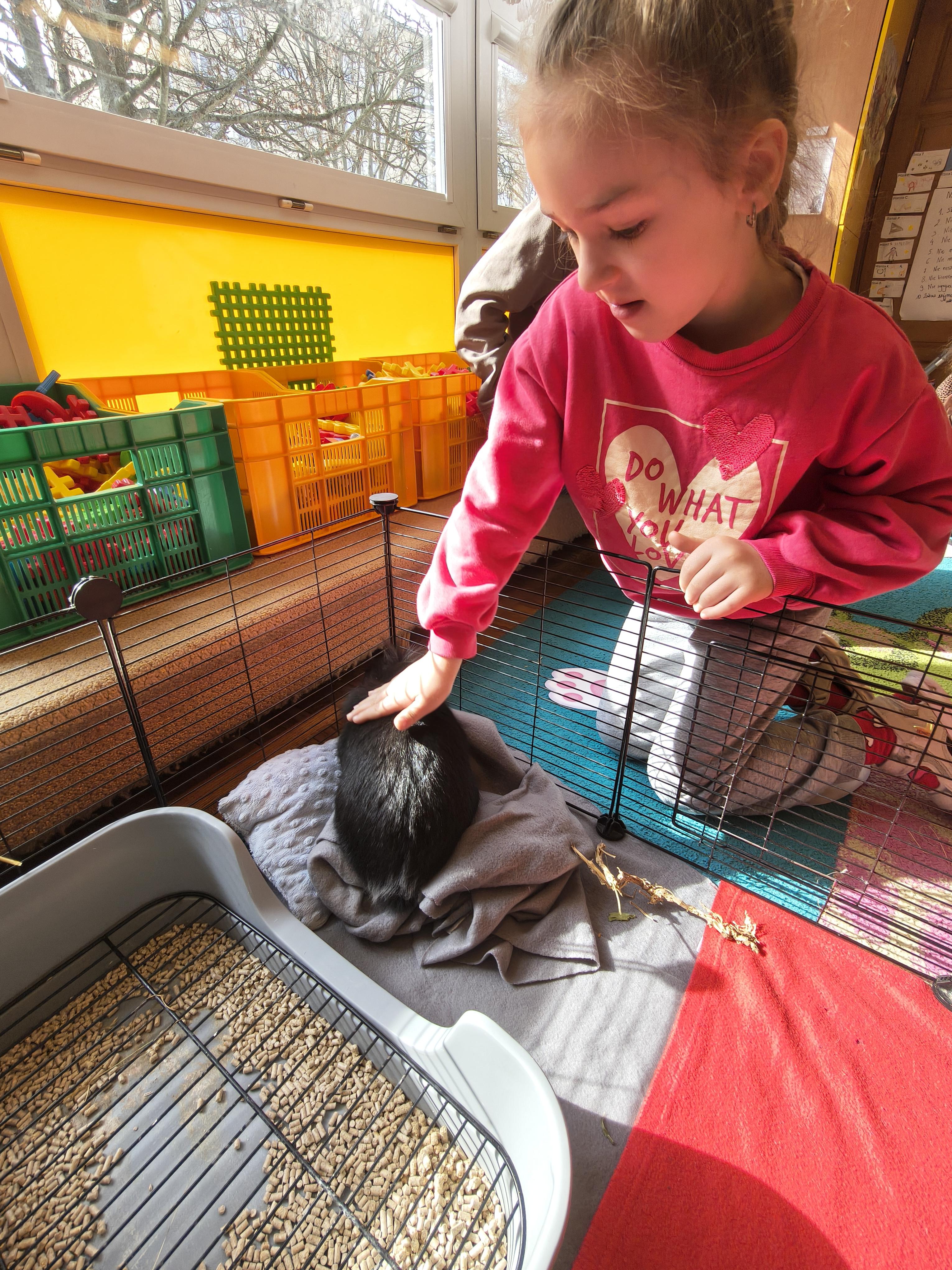 Dzieci spotkały się z niezwykłym gościem- króliczkiem i "jego rodziną". Mama i siostra Majki opowiedziały o hodowli zwierzaka, przytoczyły ciekawostki i opowiedziały o rasach i zwyczajach tych ssaków. Dzieci mogły samodzielnie skomponować jedzenie dla gościa i pogłaskać jego miękkie futerko. Spotkenie było ciekawą lekcją uczącą odpowiedzialności za żywe istoty.