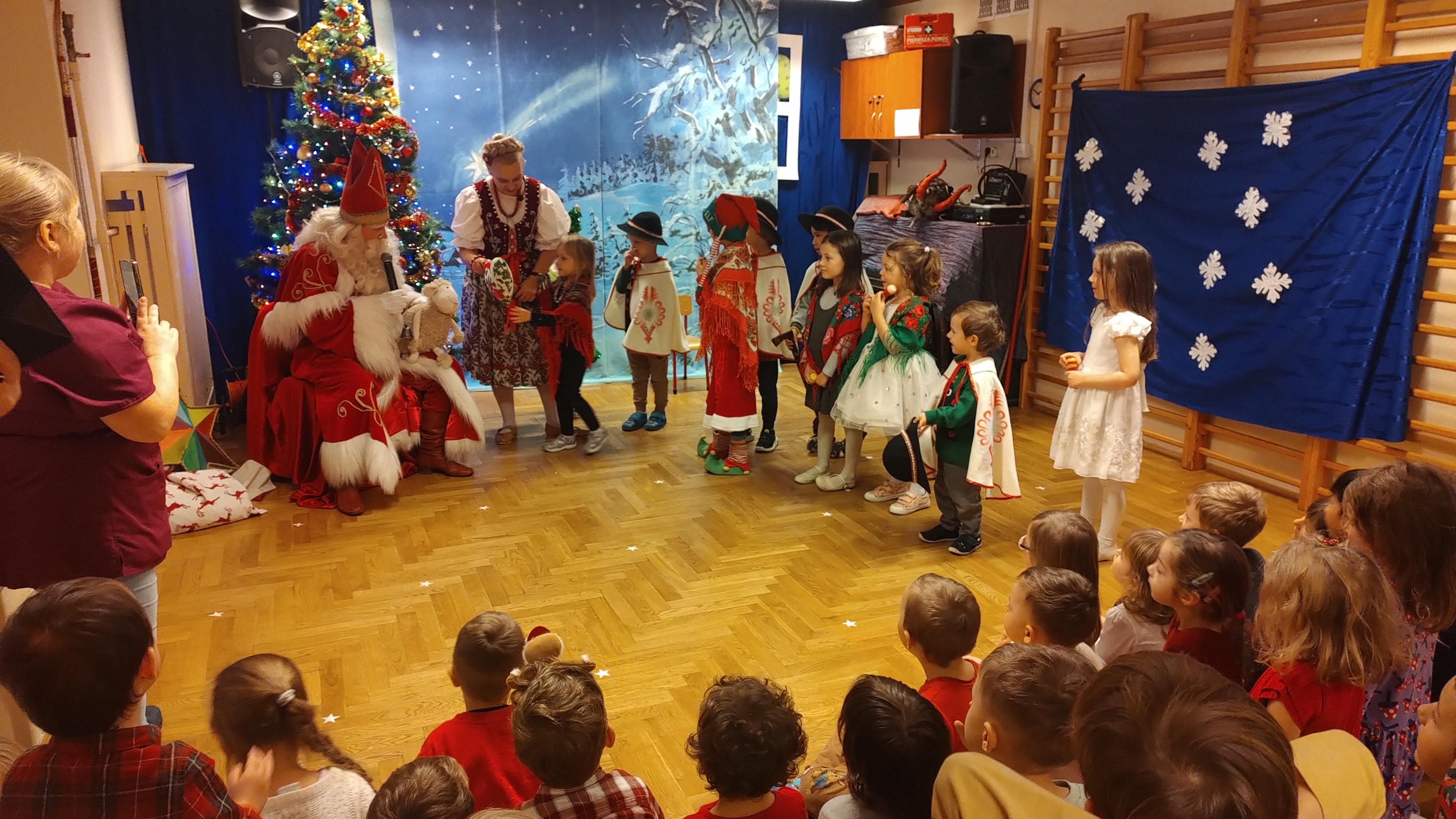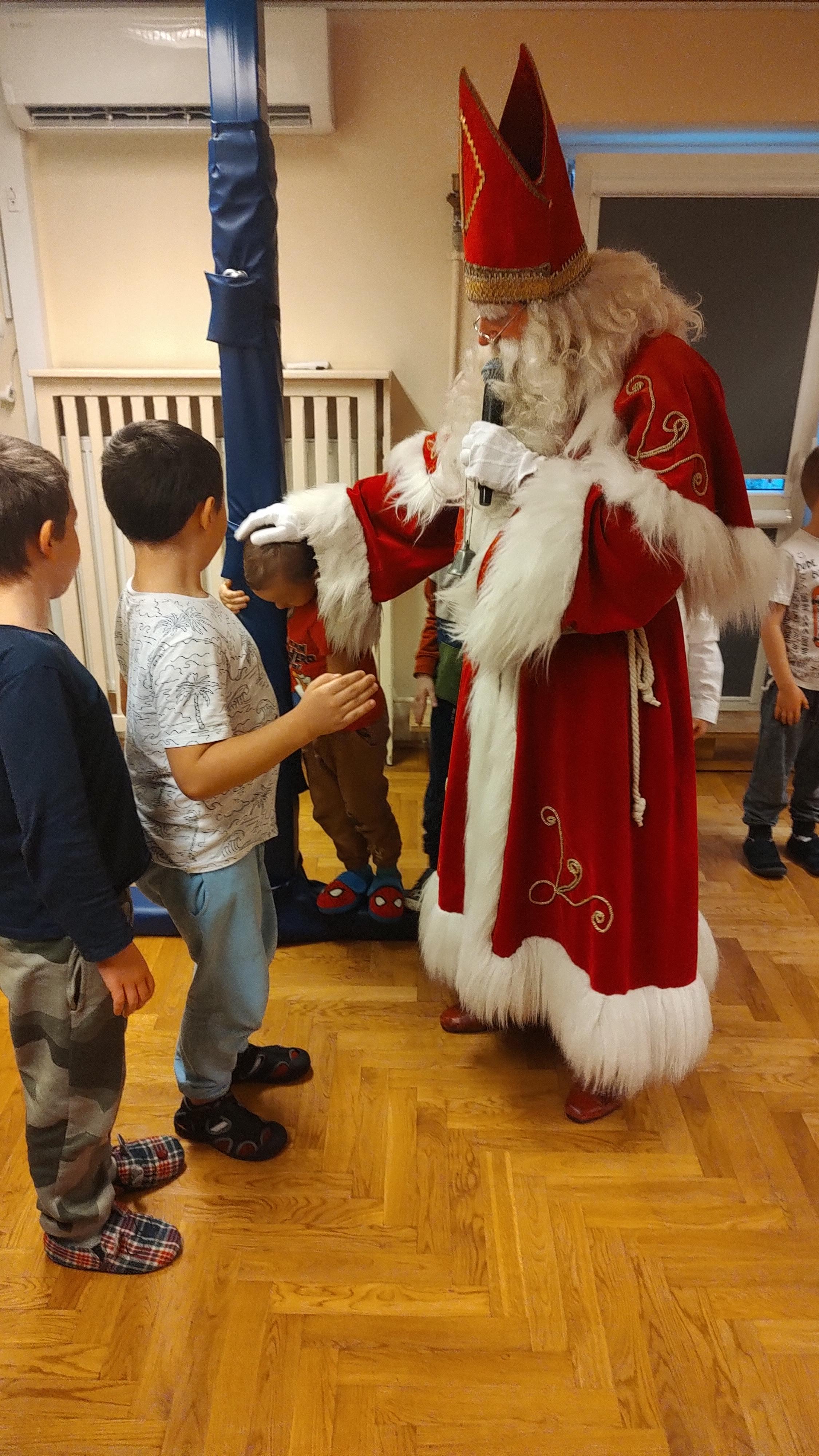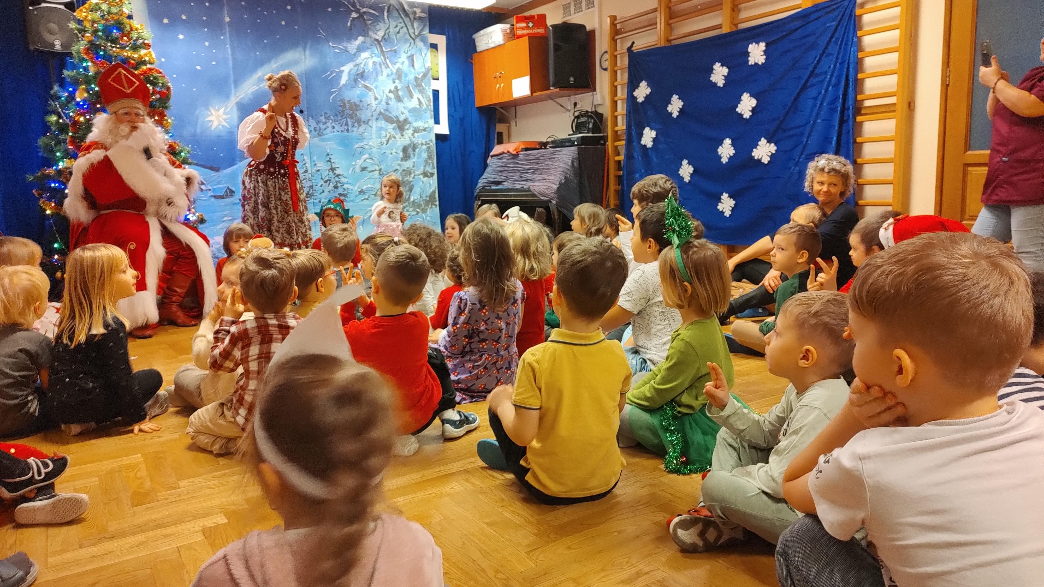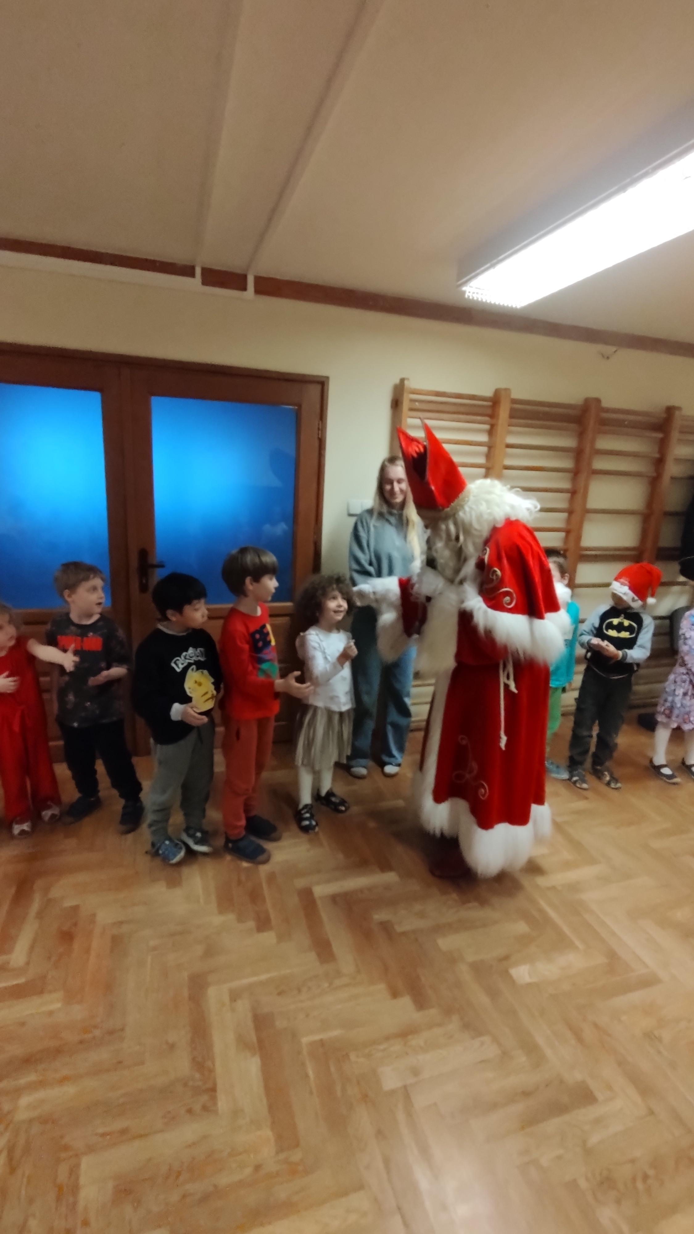 "Cały dzień - 11 grudnia w przedszkolu panowała radosna atmosfera. Wszyscy z niecierpliwością czekali na Świętego Mikołaja, który przybył po obiedzie, z workiem prezentów. Powitaliśmy Go piosenkami i muzyką. Mikołaj wysłuchał naszych występów, porozmawiał z nami, a potem, ku naszej radości, wręczył wszystkim piękne paczki. Na pamiątkę zrobiliśmy wspólne zdjęcia. Spotkanie było pełne śmiechu i radości, a Mikołaj obiecał wrócić za rok!".