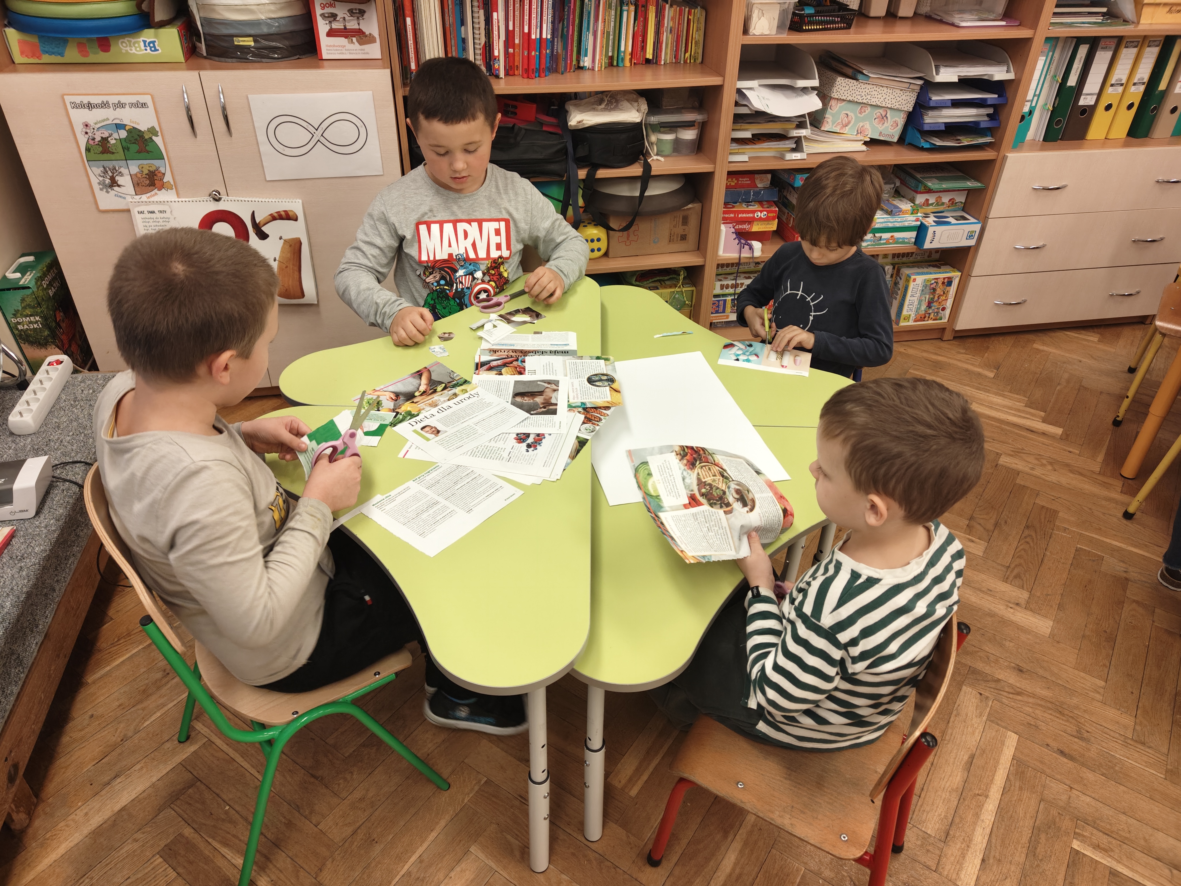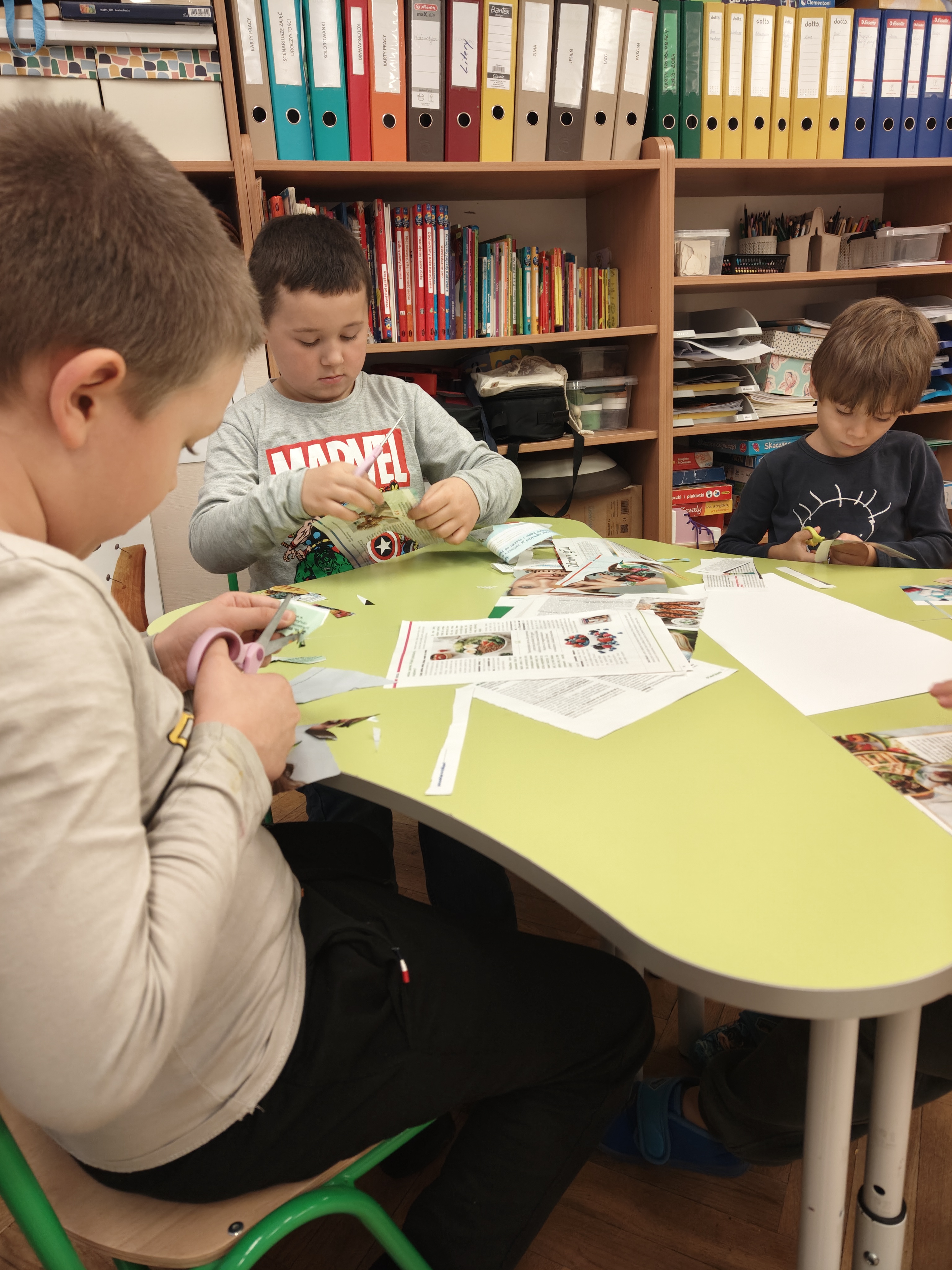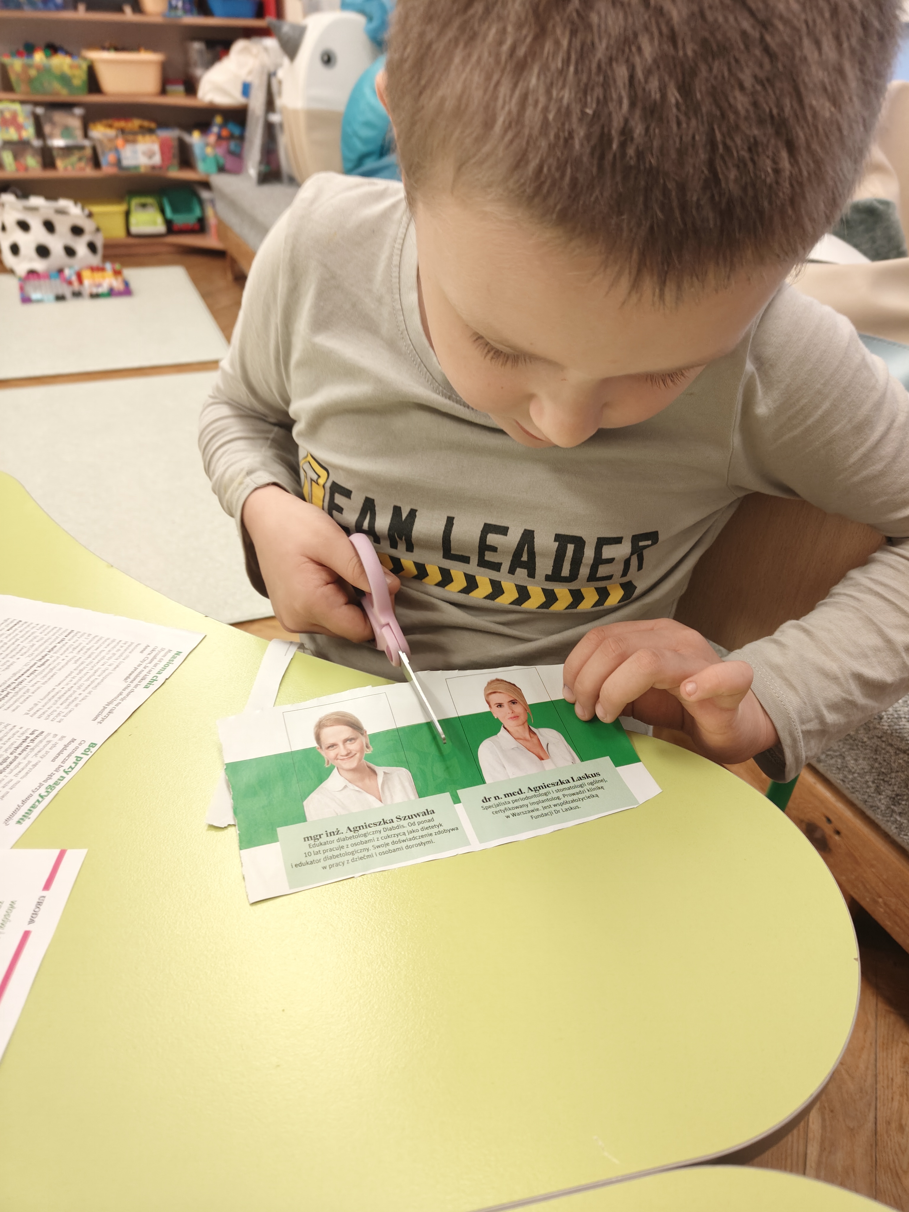 „Małe nożyczki mamy,równo wycinamy.Tniemy ciach, ciachu ciach,mocno dociskamy”.