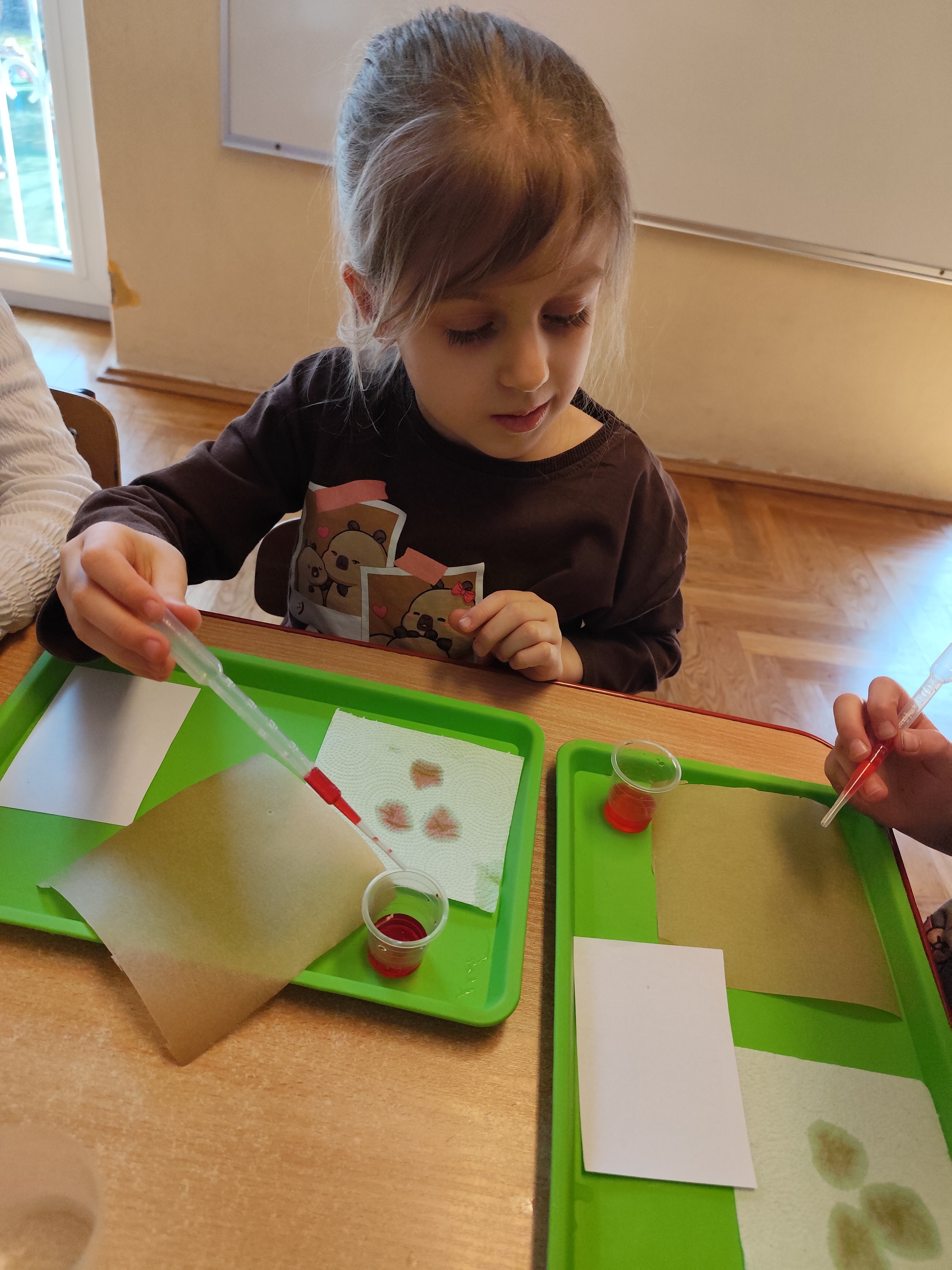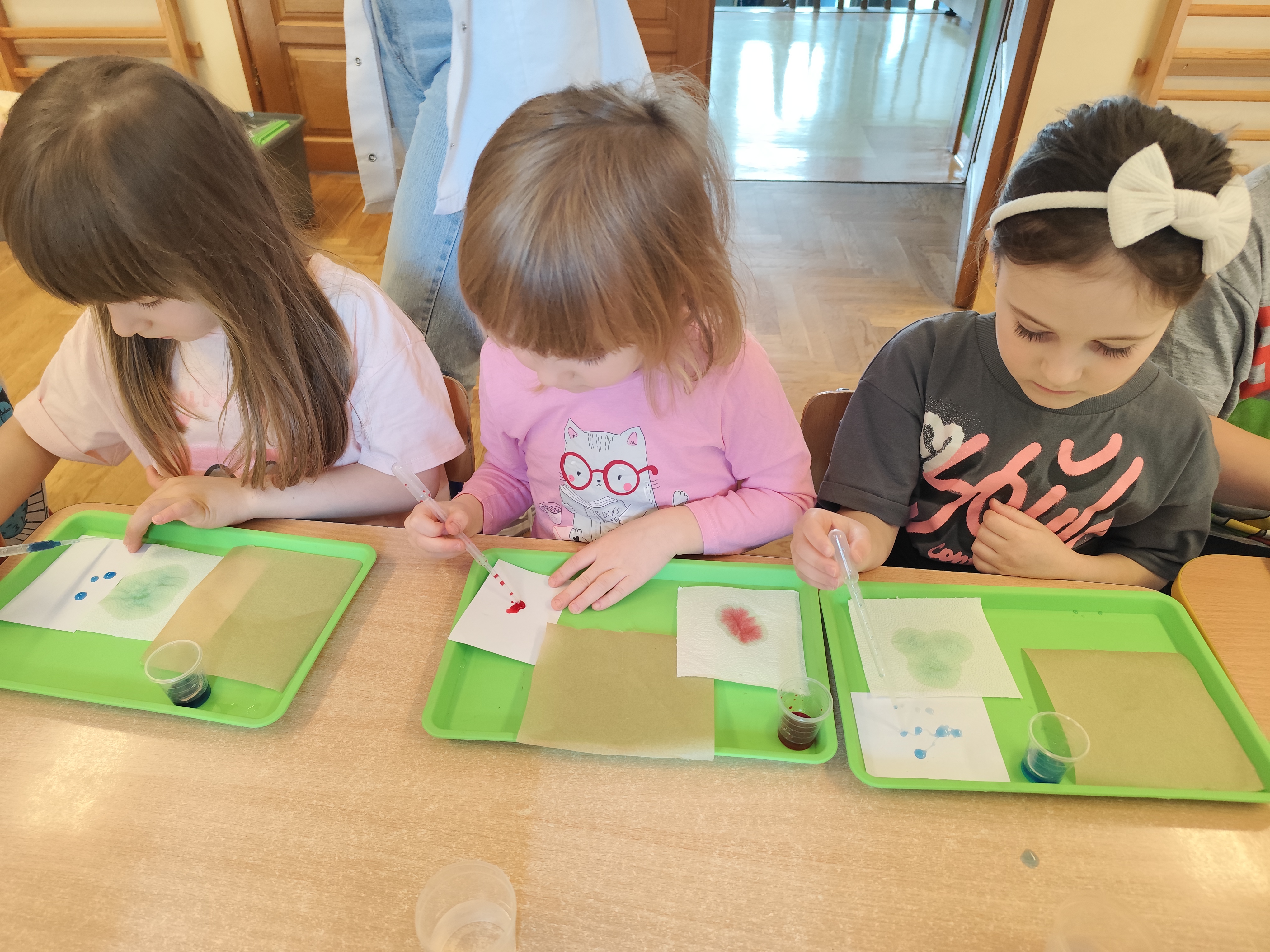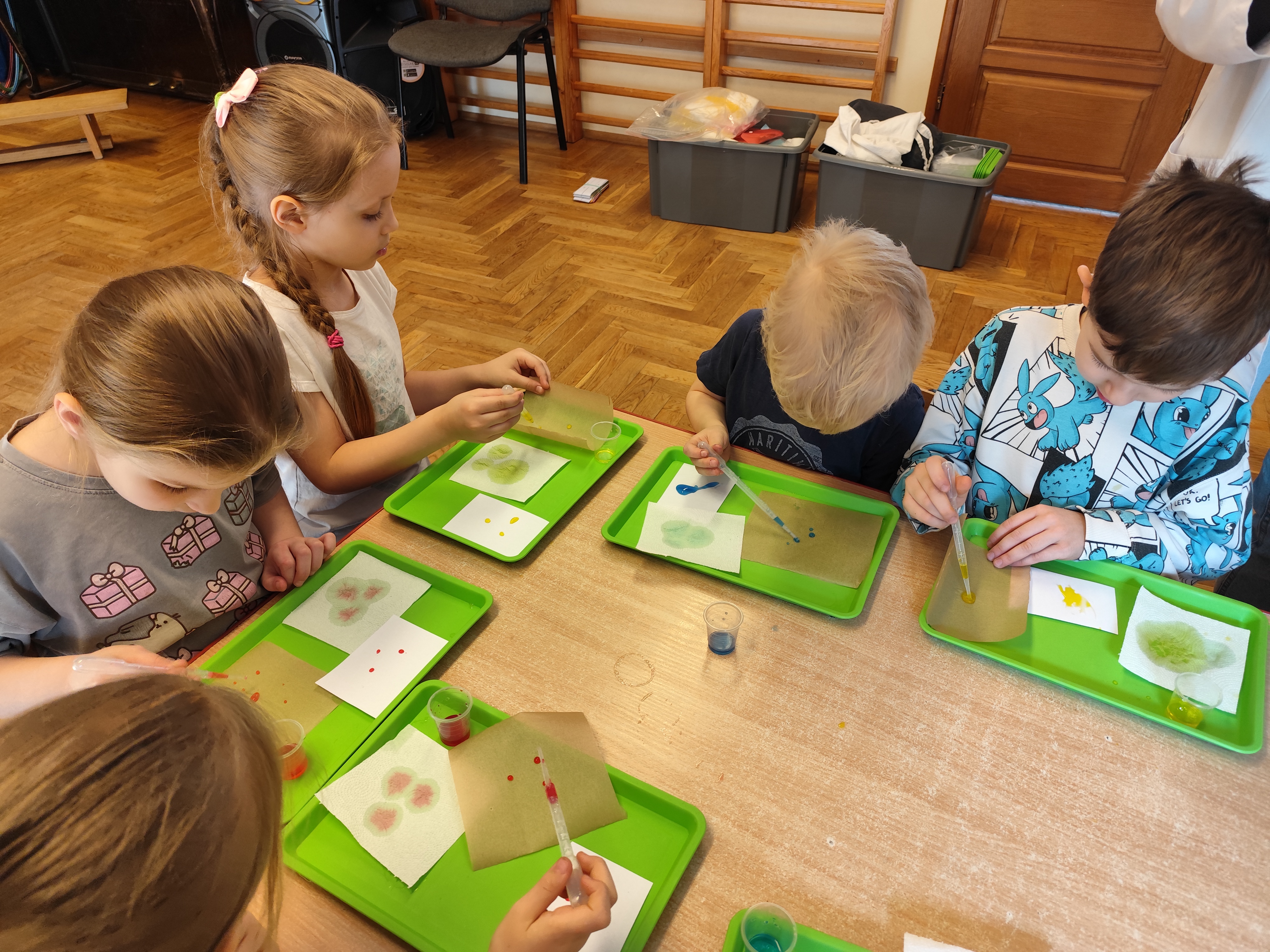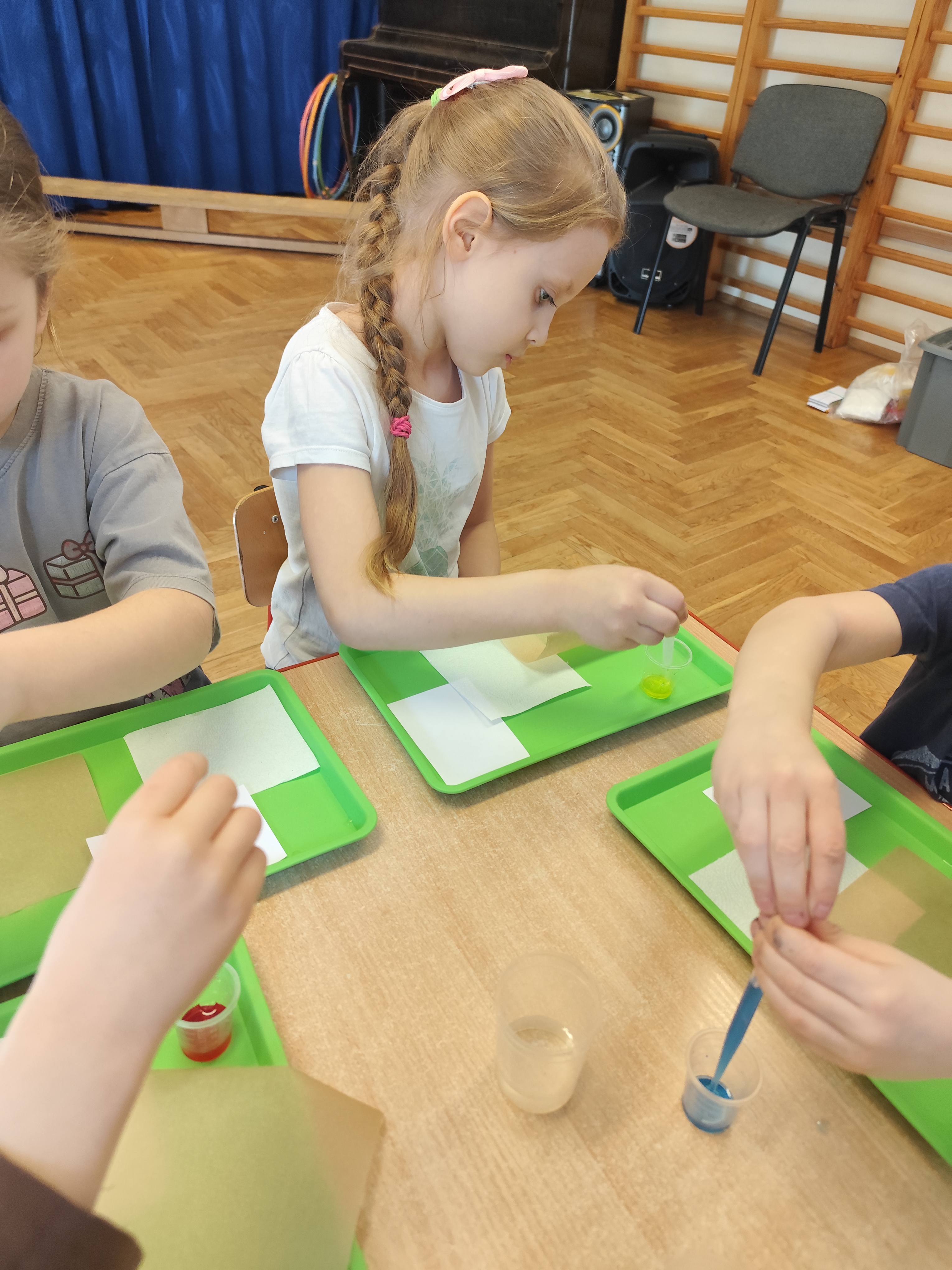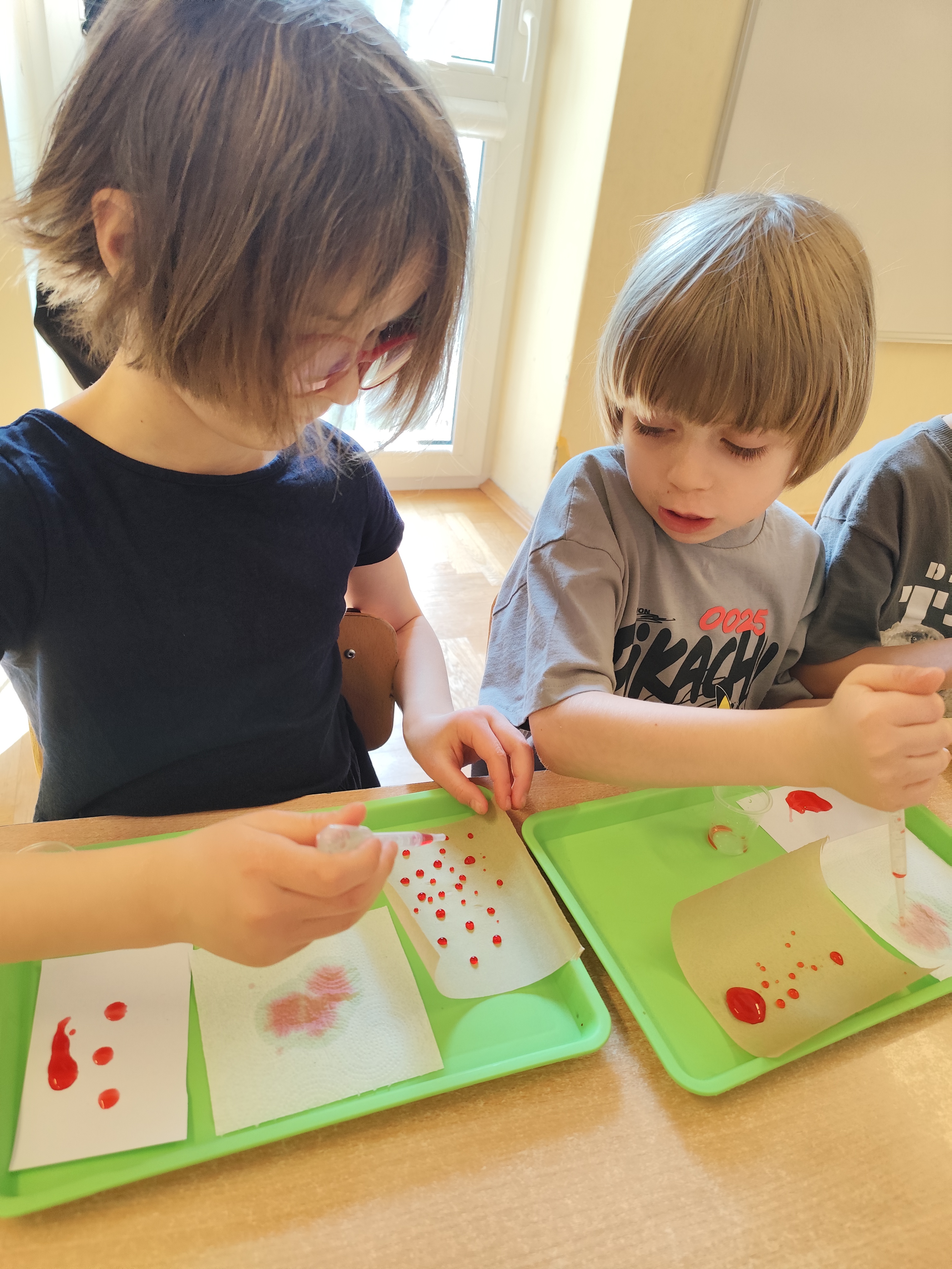 Podczas ostatnich zajęć dzieci miały okazję wcielić się w małych naukowców dzięki warsztatom prowadzonym przez Krainę Eksperymentów. Tym razem papier nie był tylko zwykłą kartką do rysowania, lecz stał się fascynującym materiałem do doświadczeń. Dzieci badały, jak różne rodzaje papieru – papier pieczeniowy, kuchenny i zwykły – reagują na barwnik. Nakładały kolor na każdy z nich i uważnie obserwowały zmiany.