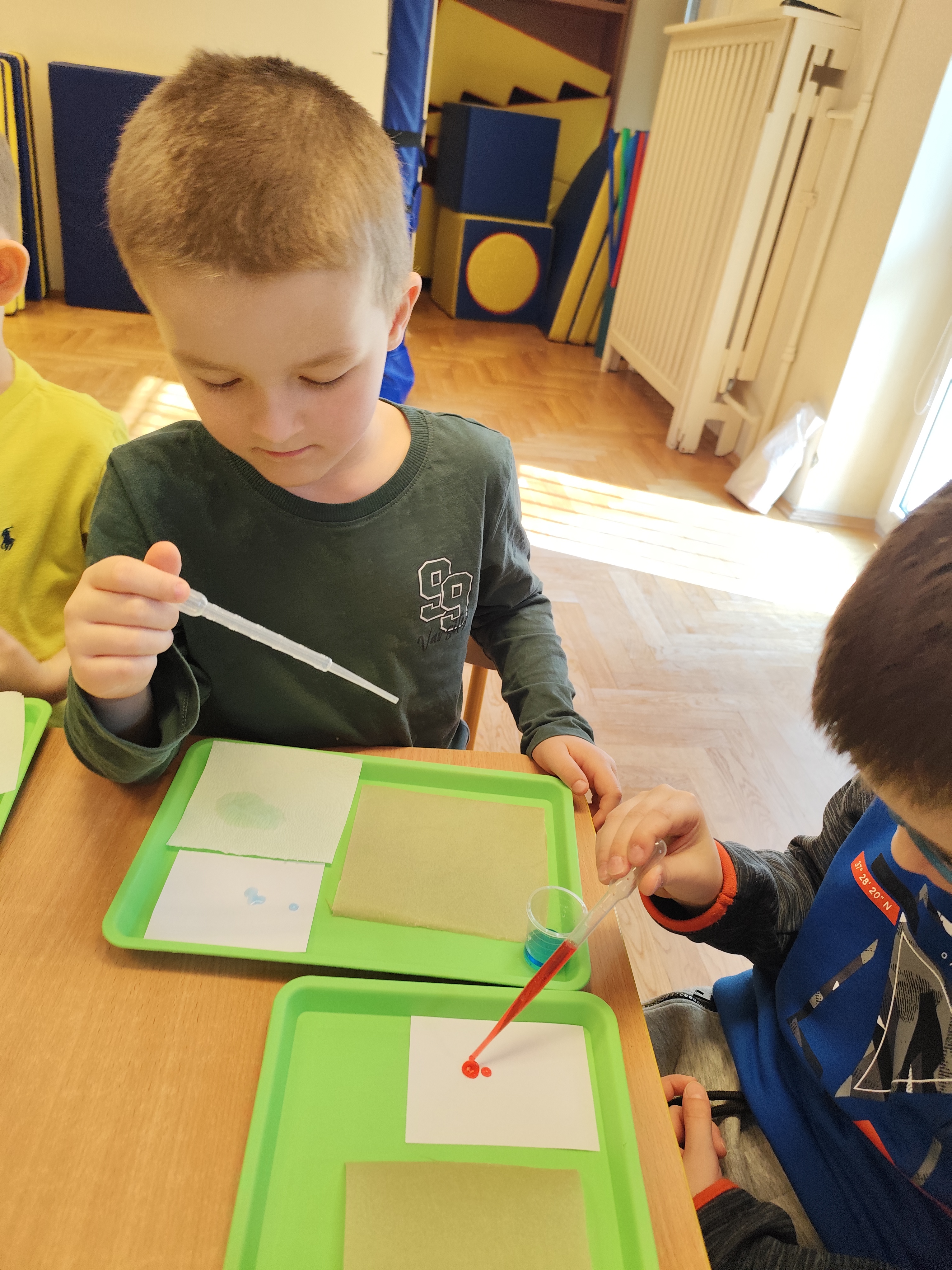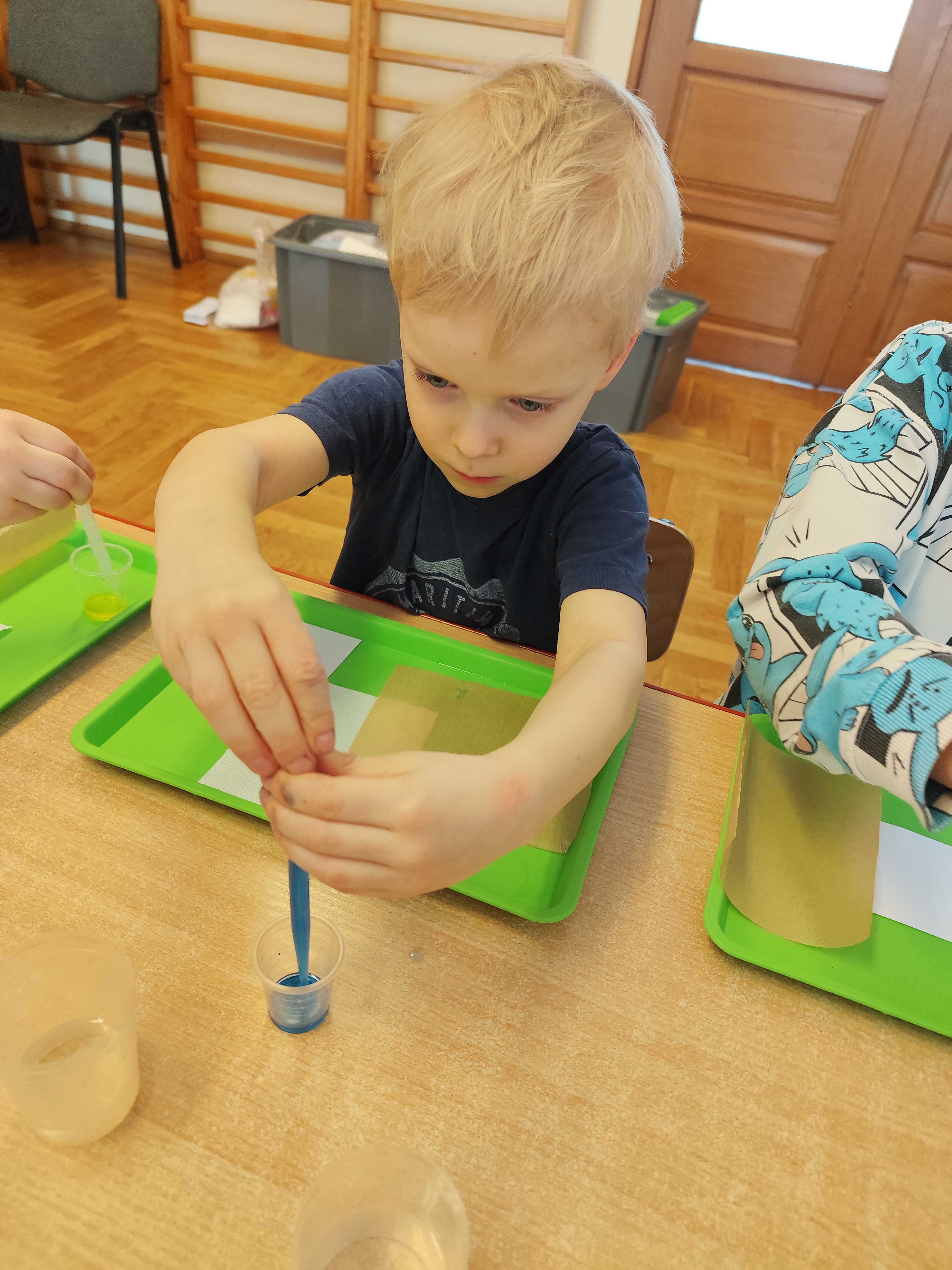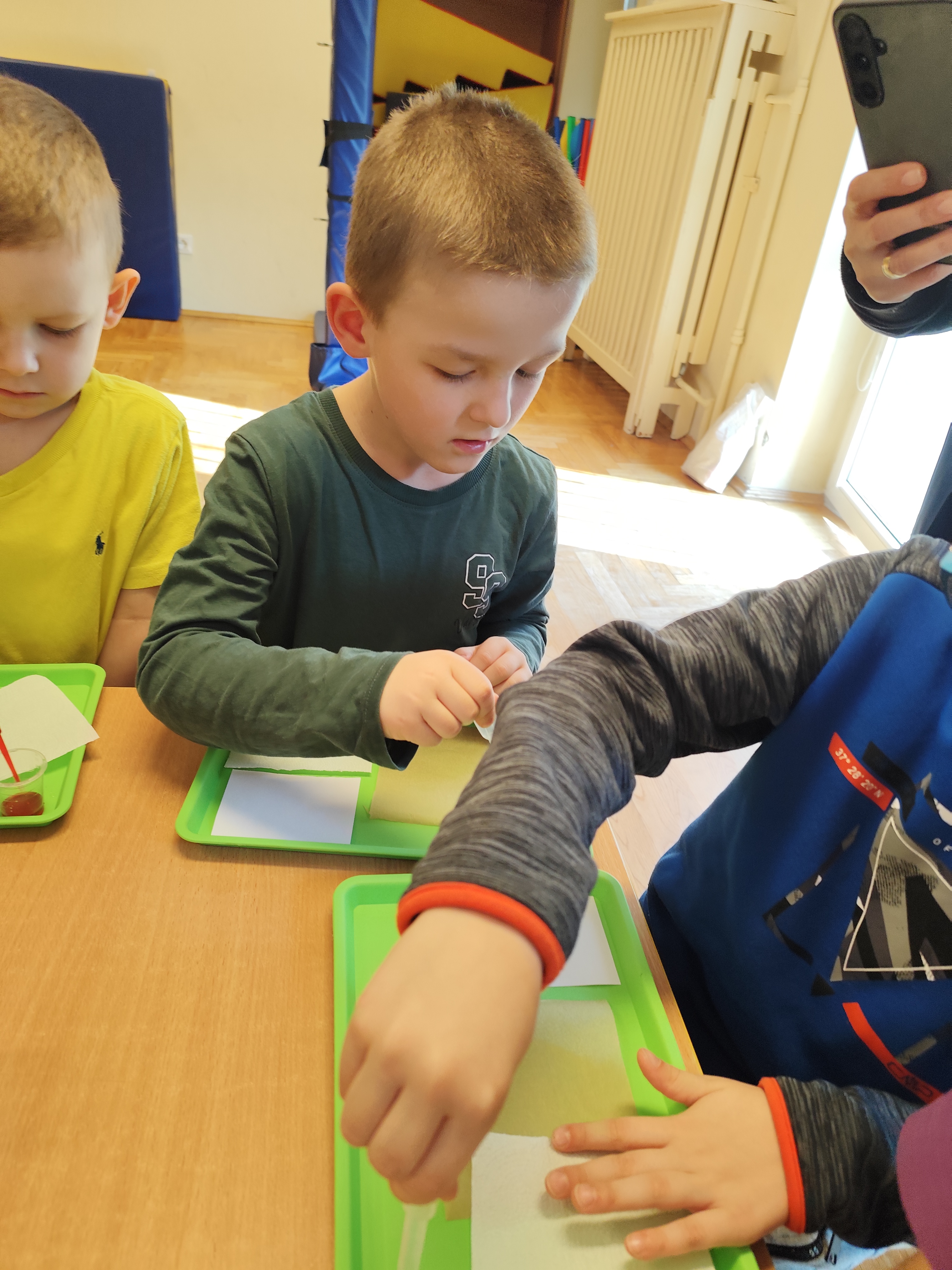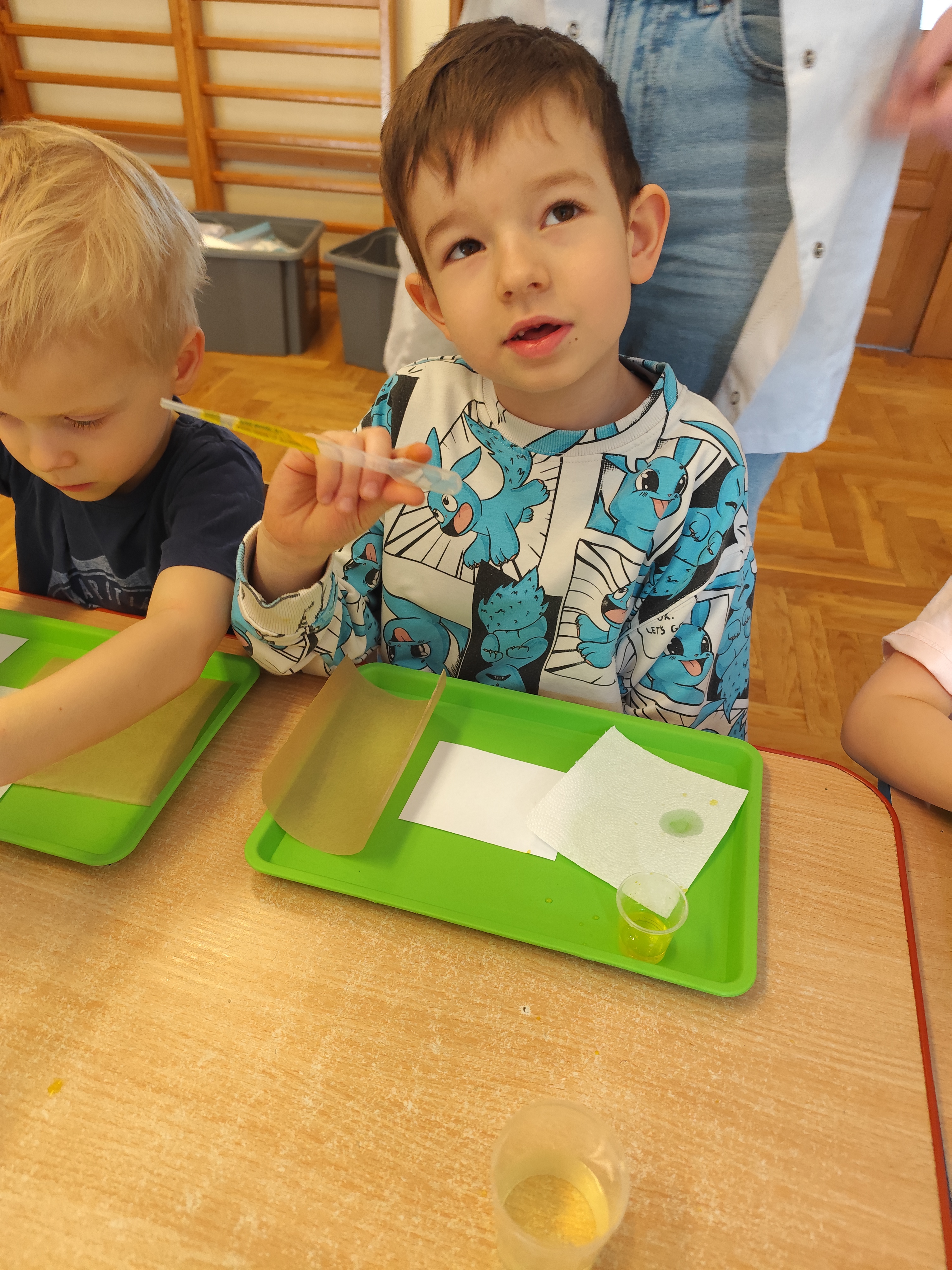 Podczas ostatnich zajęć dzieci miały okazję wcielić się w małych naukowców dzięki warsztatom prowadzonym przez Krainę Eksperymentów. Tym razem papier nie był tylko zwykłą kartką do rysowania, lecz stał się fascynującym materiałem do doświadczeń. Dzieci badały, jak różne rodzaje papieru – papier pieczeniowy, kuchenny i zwykły – reagują na barwnik. Nakładały kolor na każdy z nich i uważnie obserwowały zmiany.