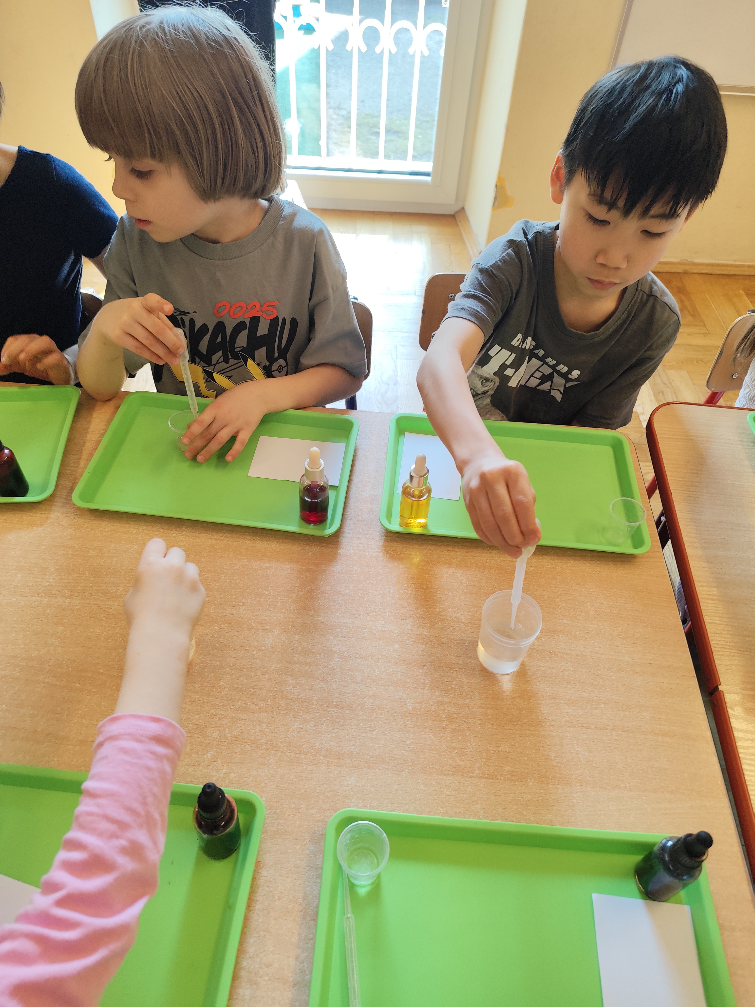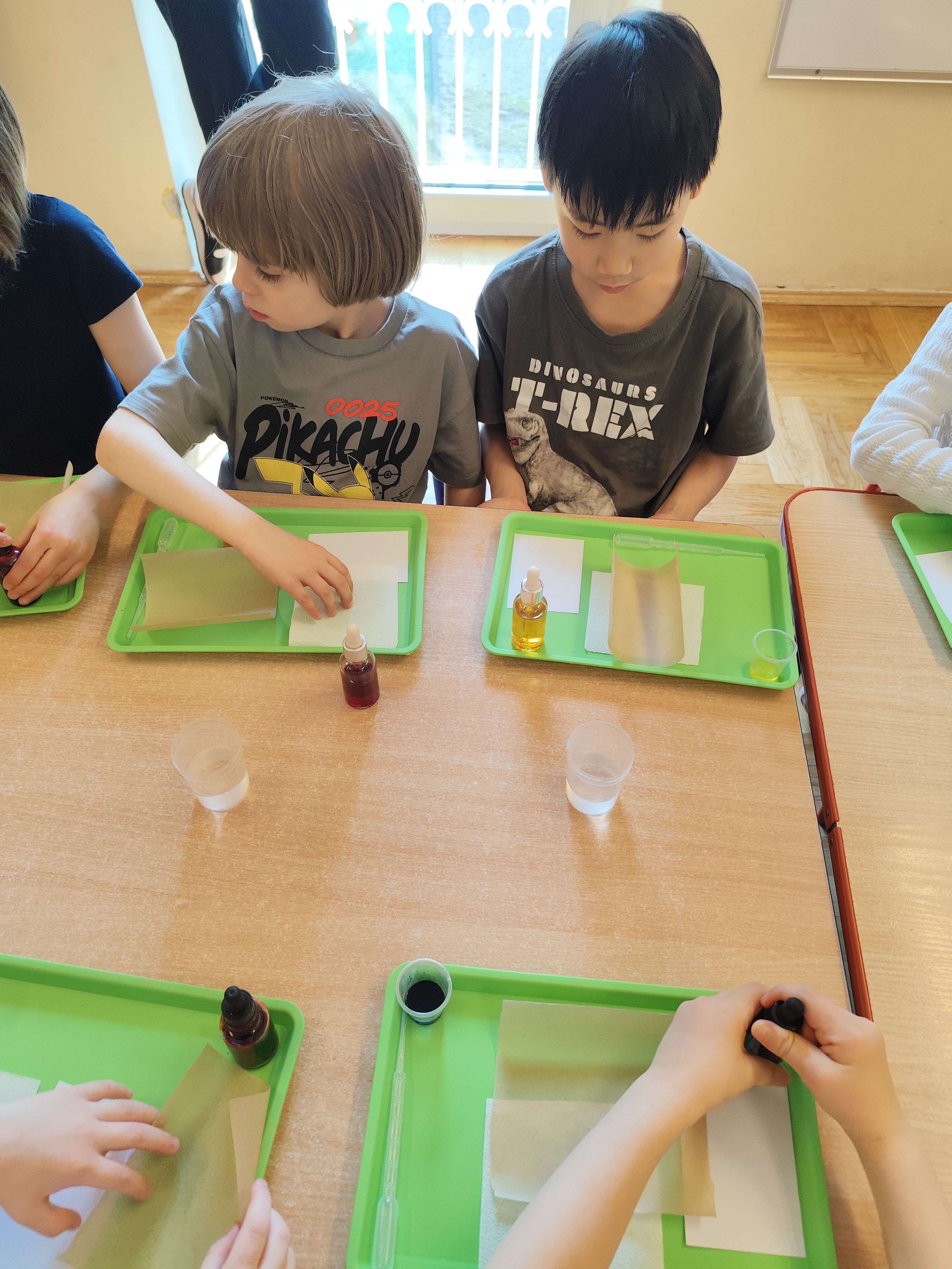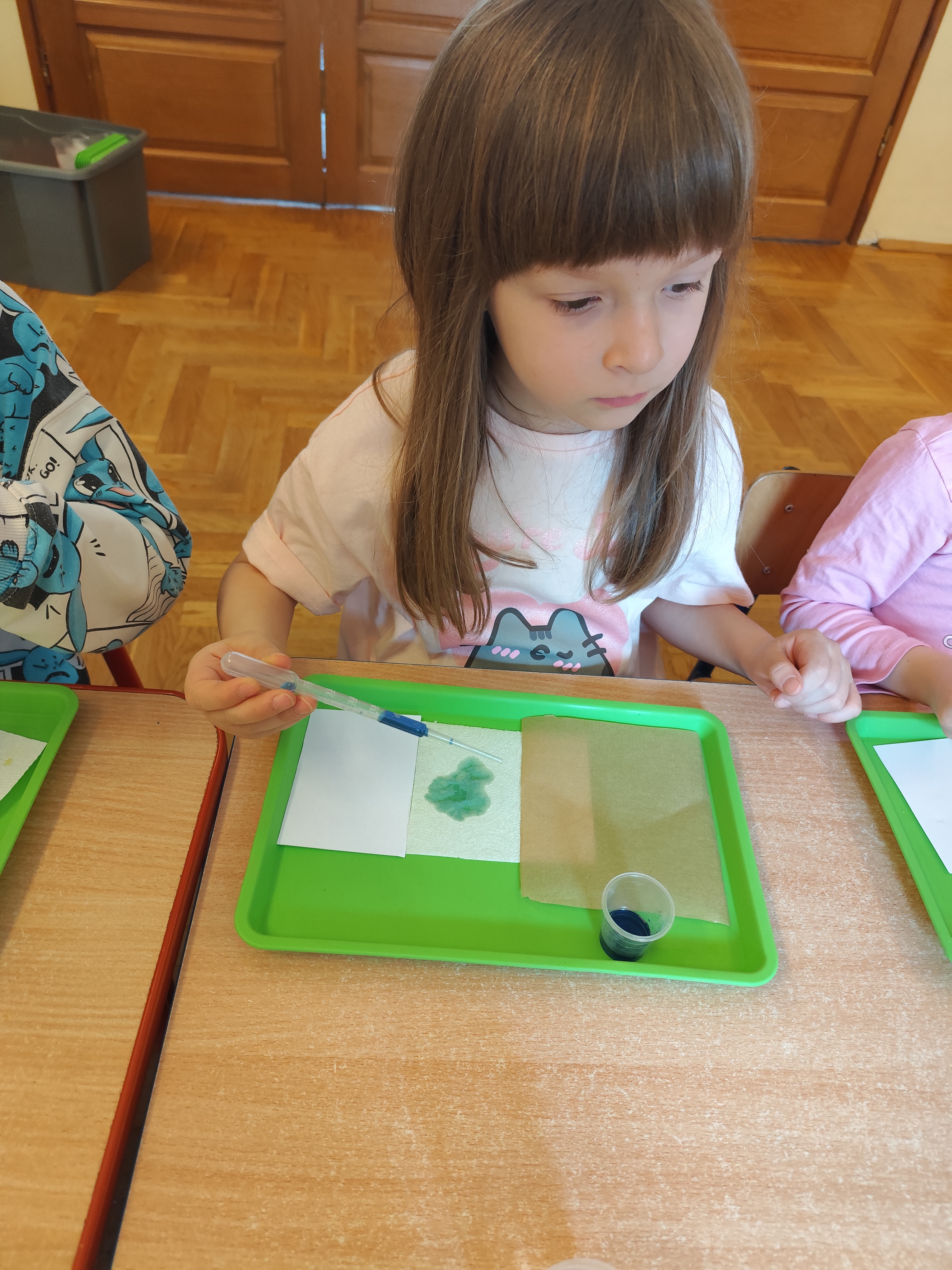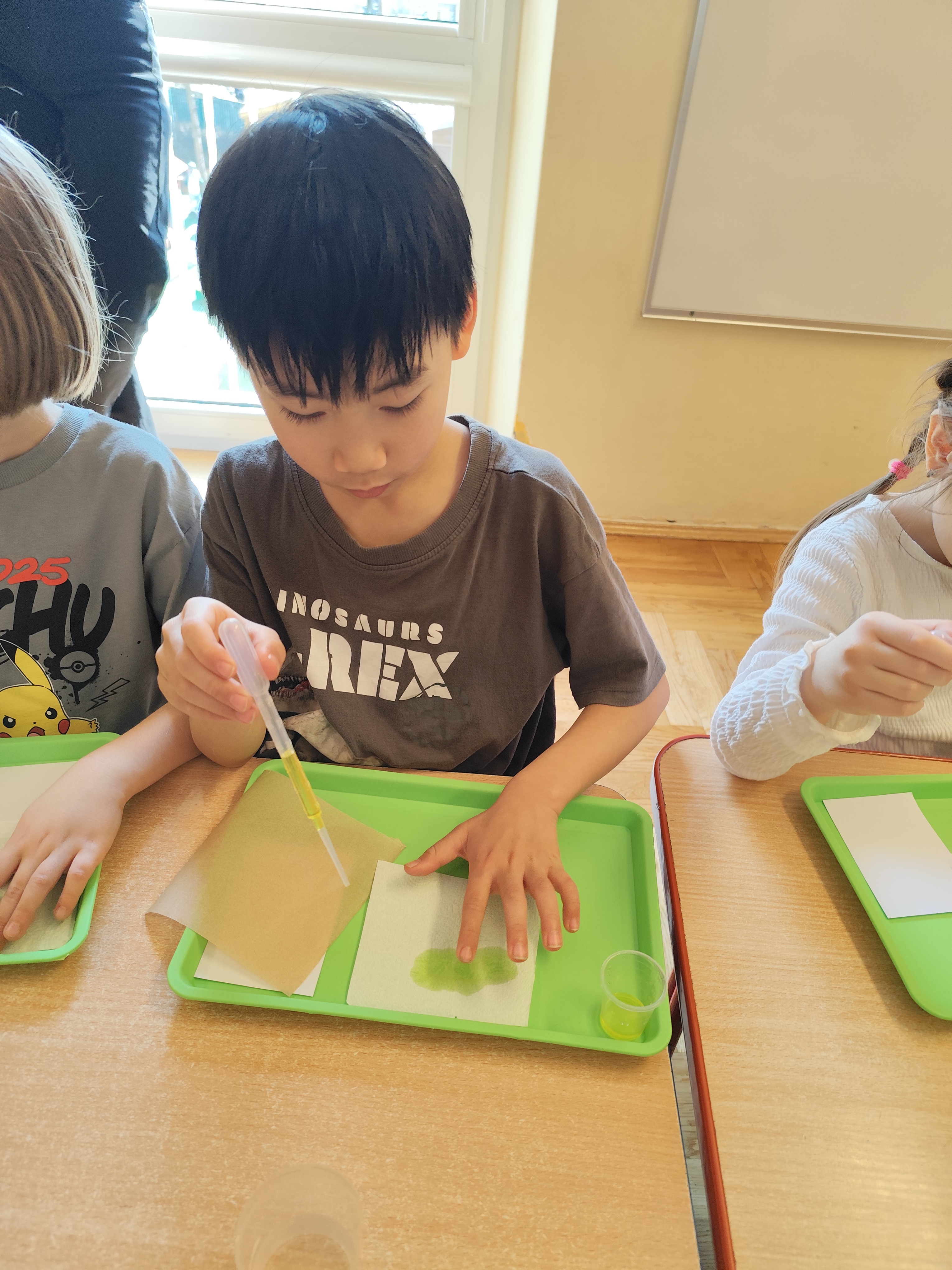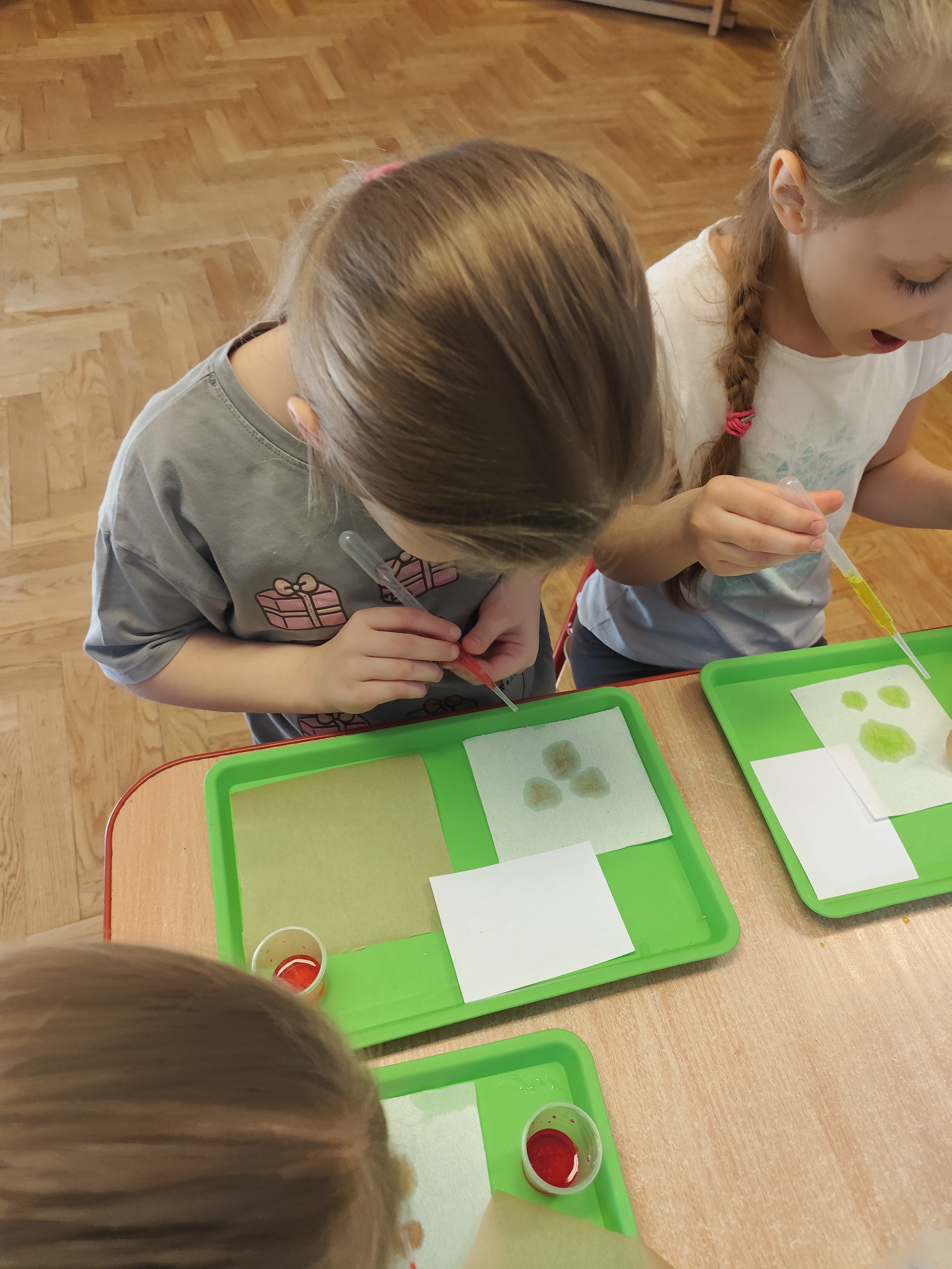 Podczas ostatnich zajęć dzieci miały okazję wcielić się w małych naukowców dzięki warsztatom prowadzonym przez Krainę Eksperymentów. Tym razem papier nie był tylko zwykłą kartką do rysowania, lecz stał się fascynującym materiałem do doświadczeń. Dzieci badały, jak różne rodzaje papieru – papier pieczeniowy, kuchenny i zwykły – reagują na barwnik. Nakładały kolor na każdy z nich i uważnie obserwowały zmiany.