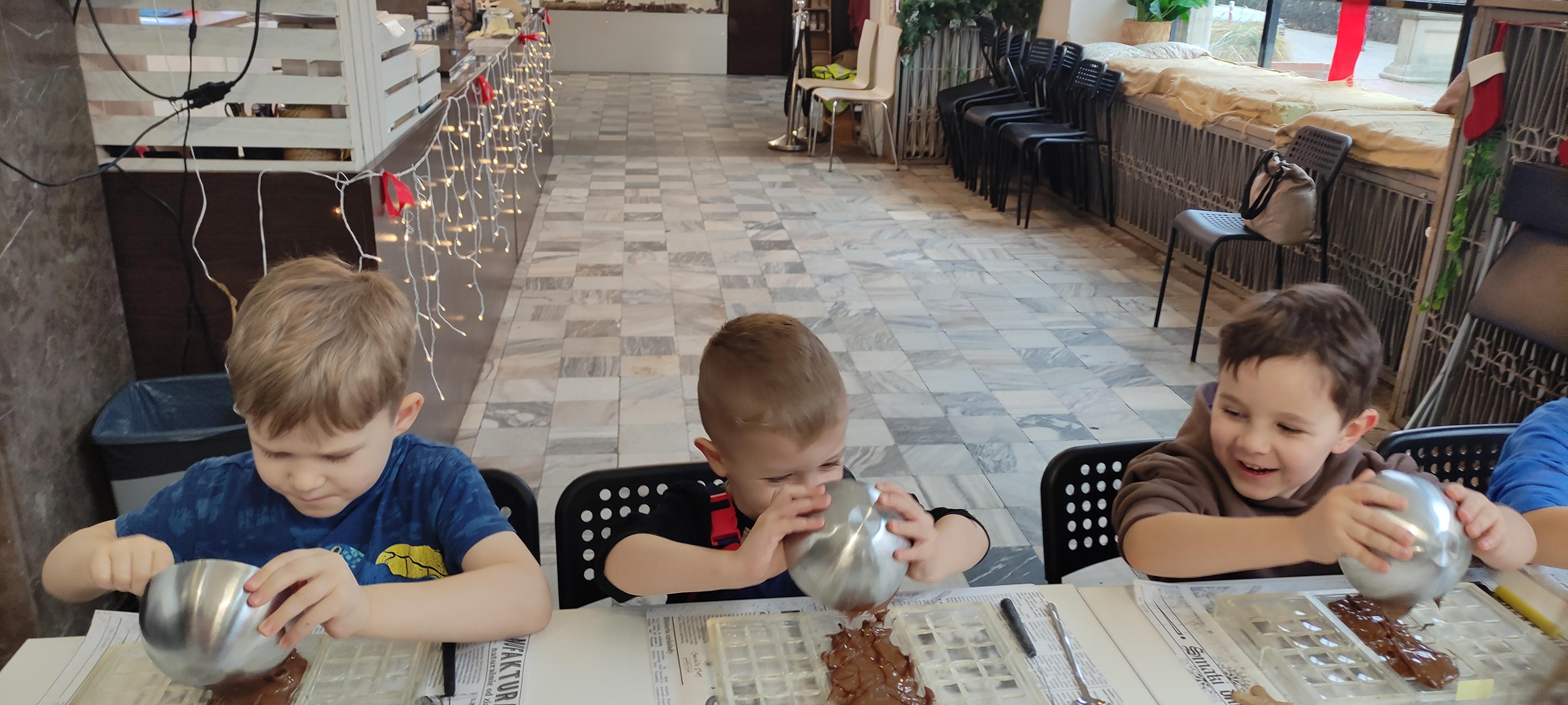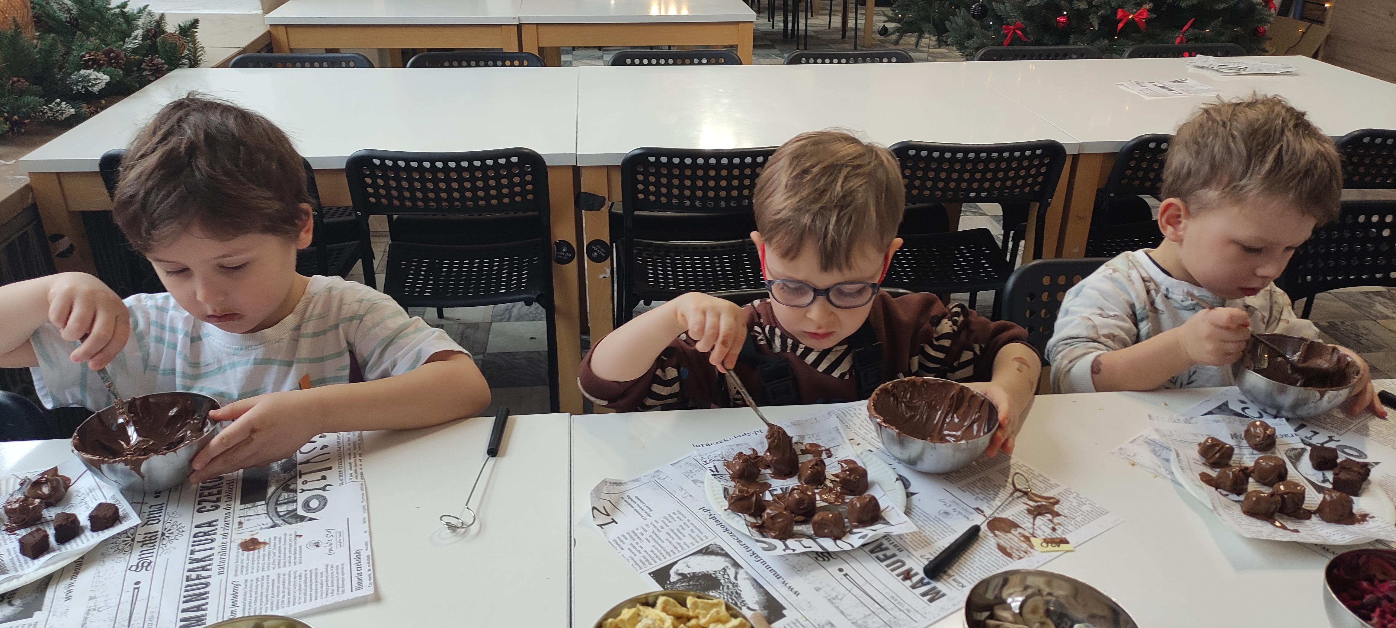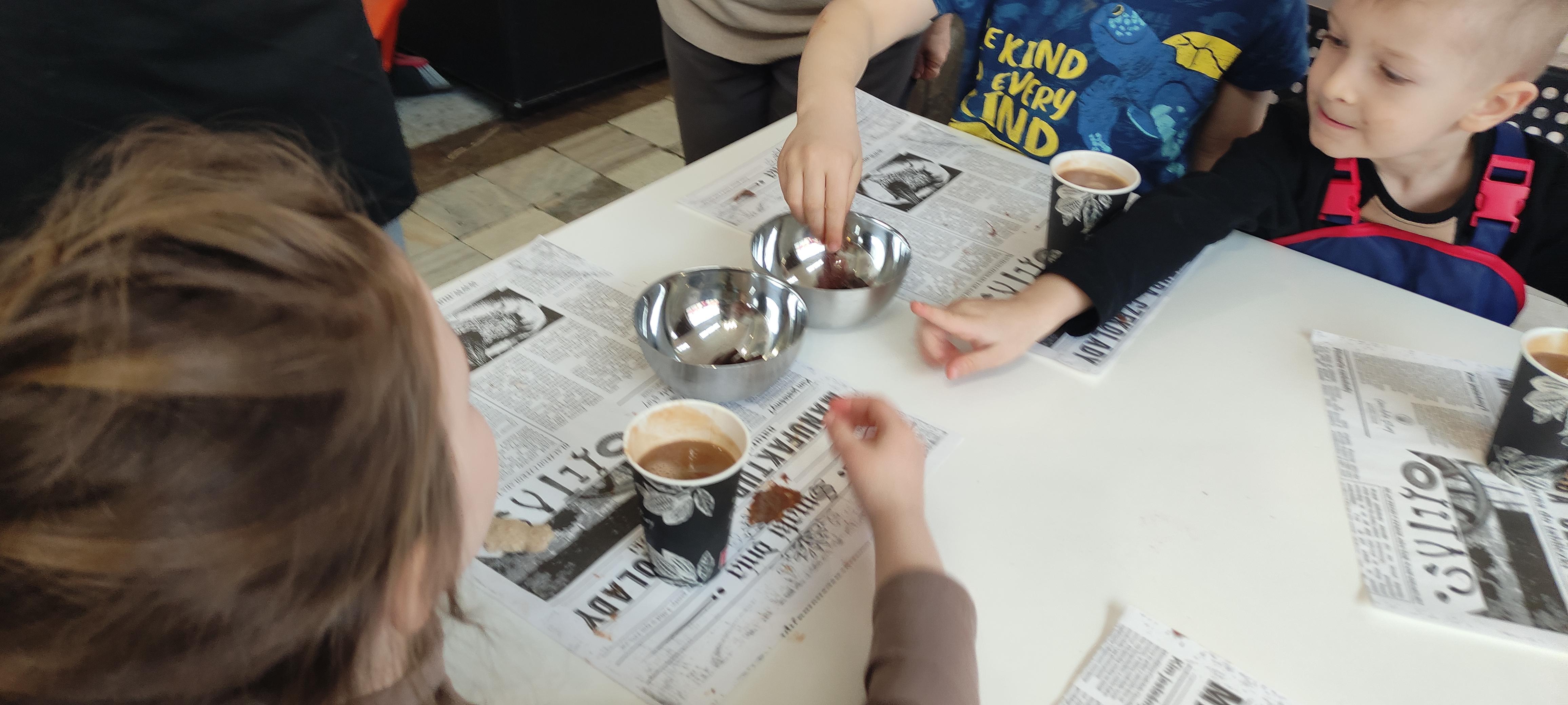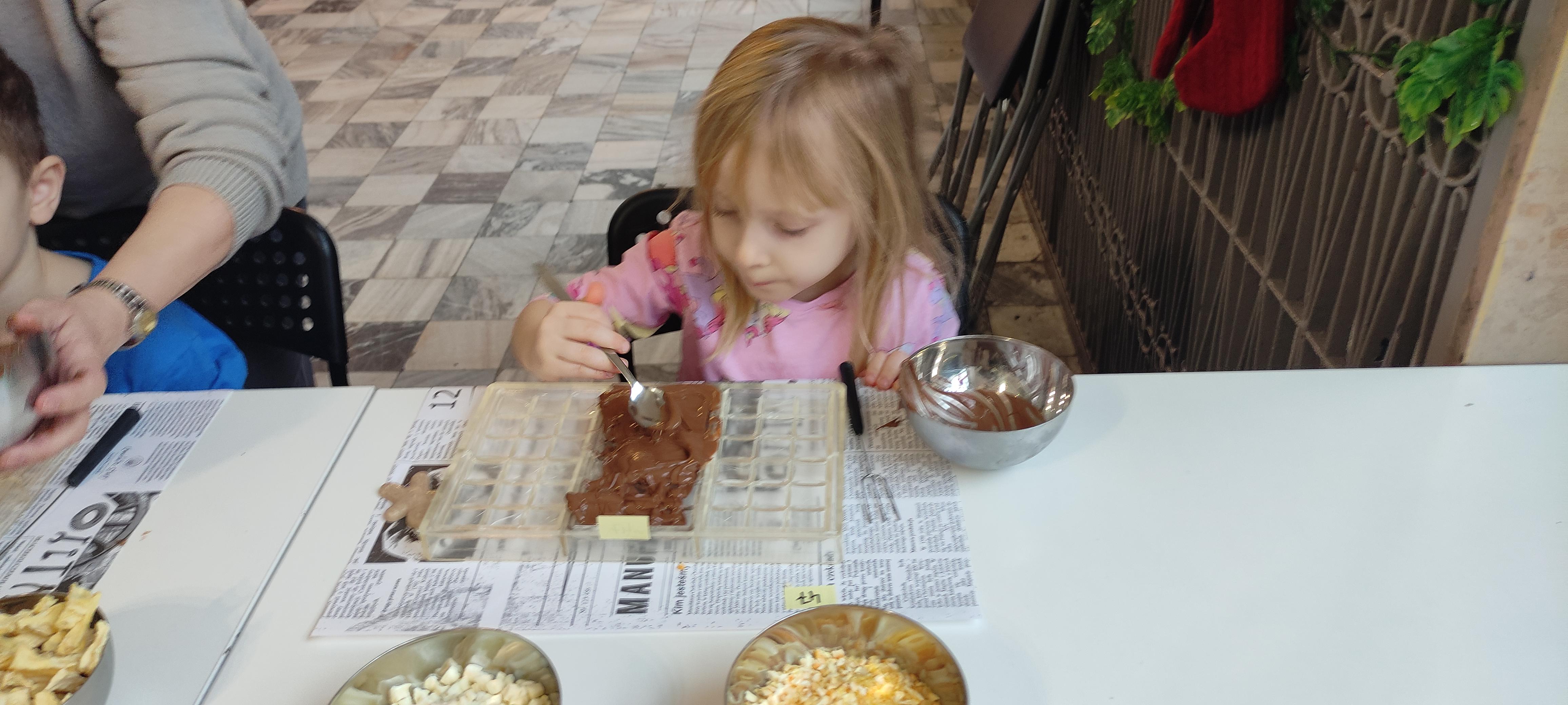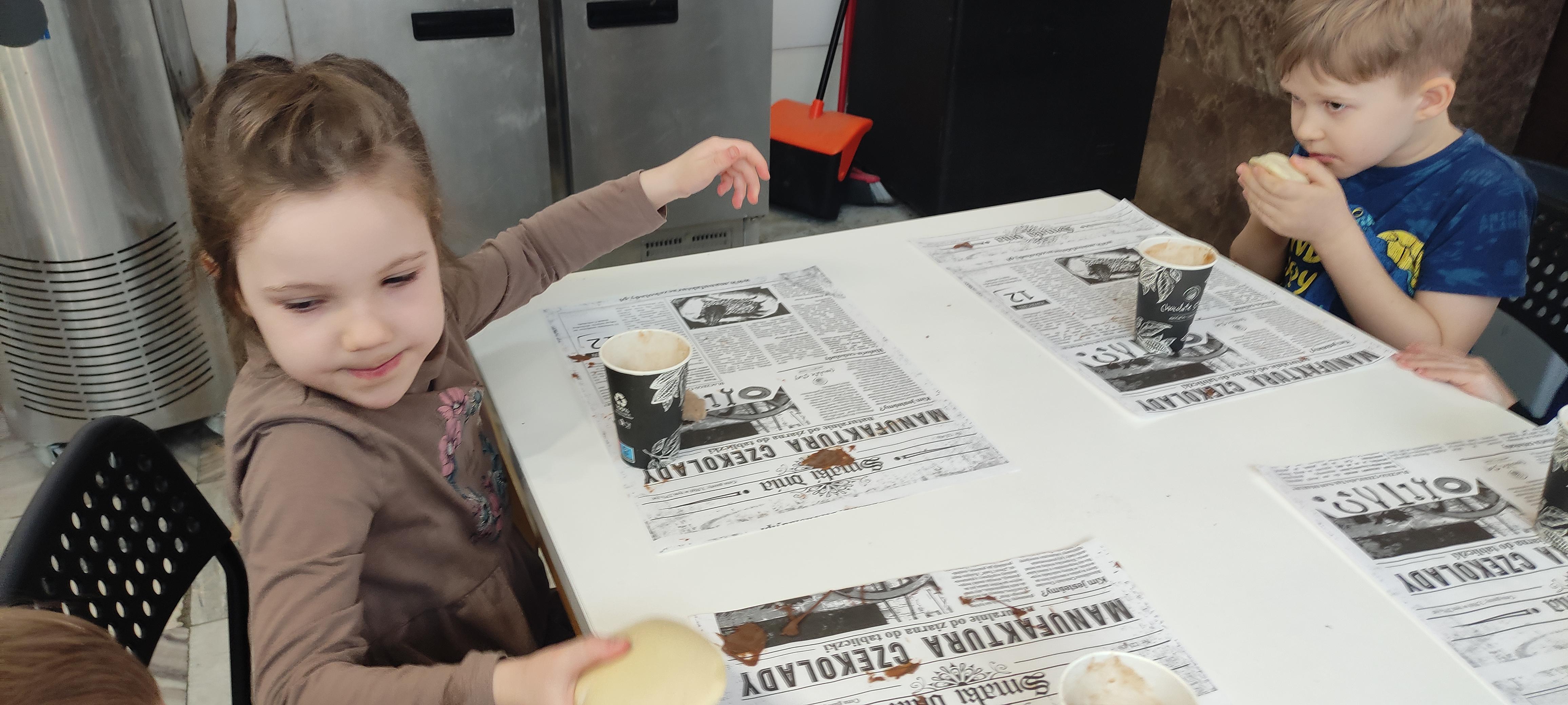 w pobliskiej Manufakturze Czekolady. Tak sie spieszyły, że przybyły tam przed czasem, dzięki czemu miały okazję pobawić się przez chwilę na pobliskim placu zabaw. Potem czekała ich już tylko "ciężka praca", czyli samodzielne wykonanie tabliczki czekolady oraz czekoladowych pralinek. W przerwie degustacja pierniczków i gorącej czekolady oraz poznanie tajemnic uprawy ziaren kakaowca, kluczowego surowca do produkcji czekolady. Jak to wszystko wyglądało zobaczcie sami ...