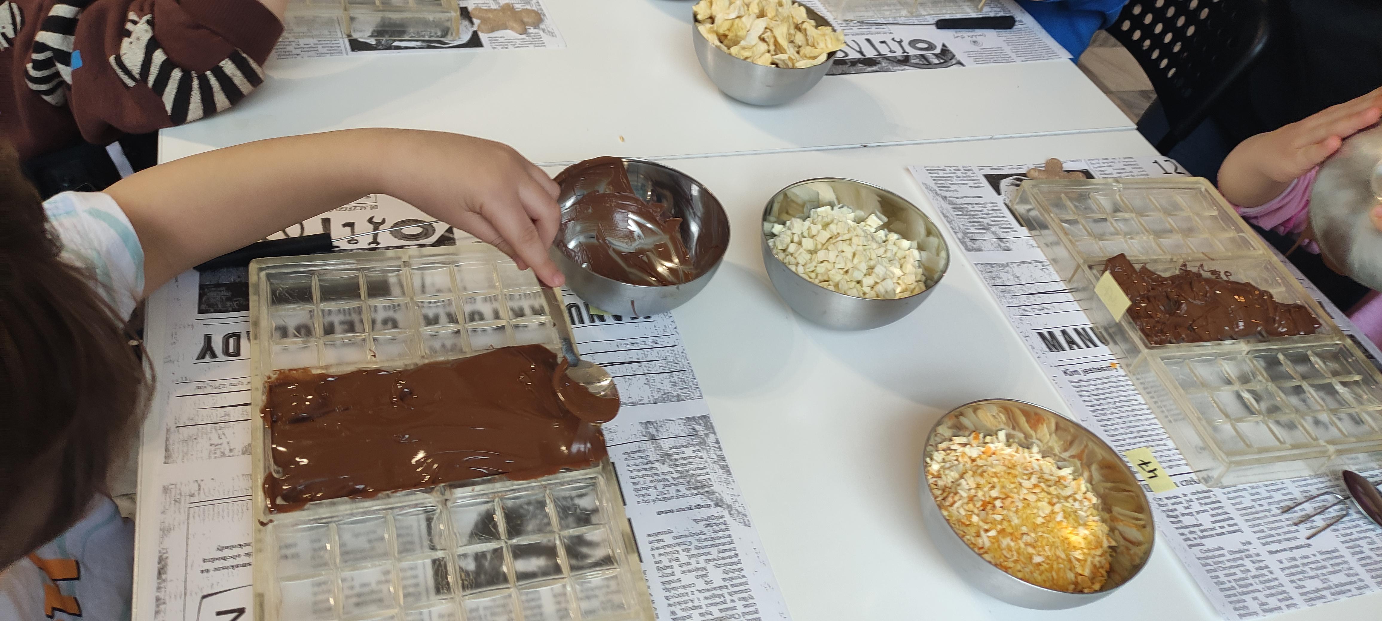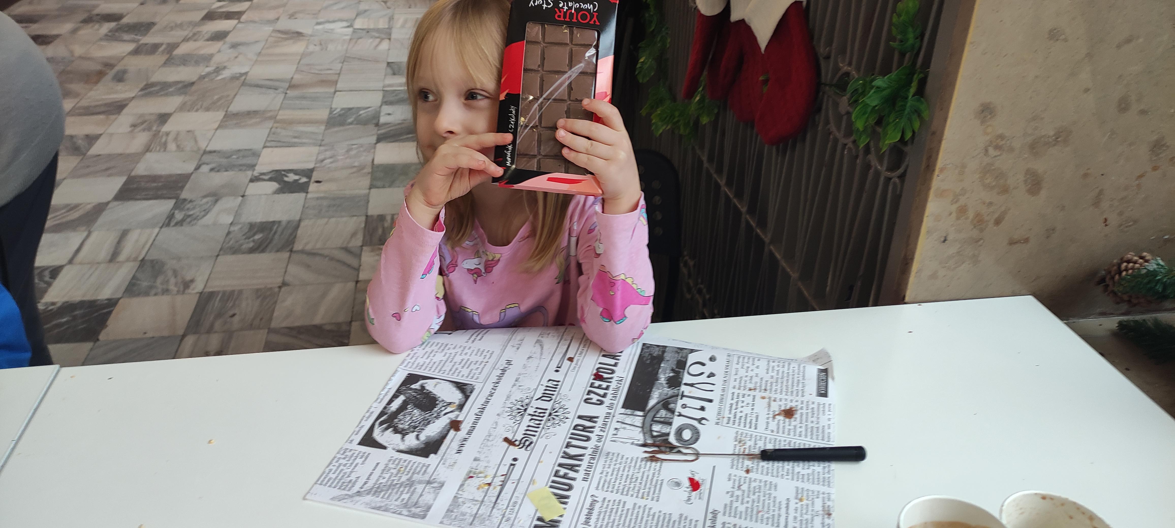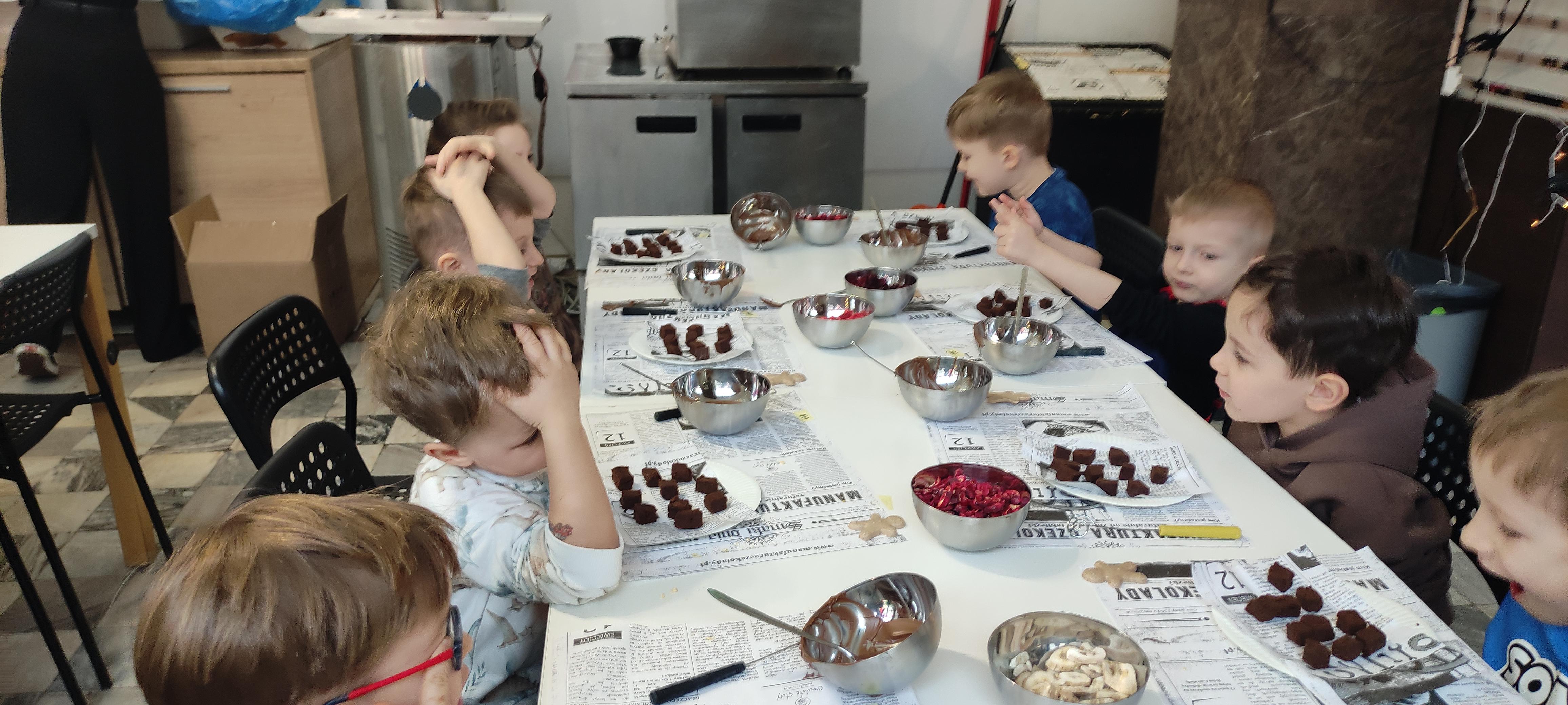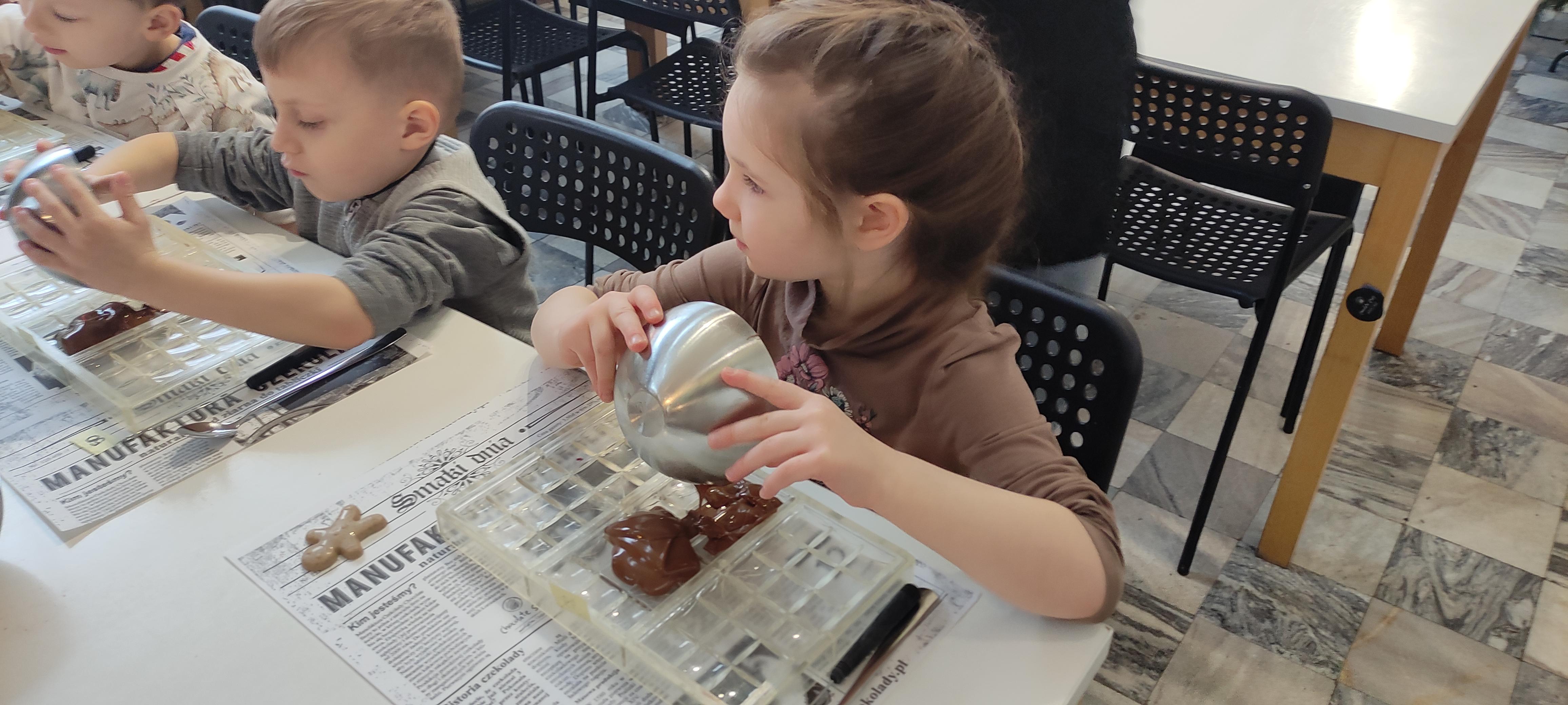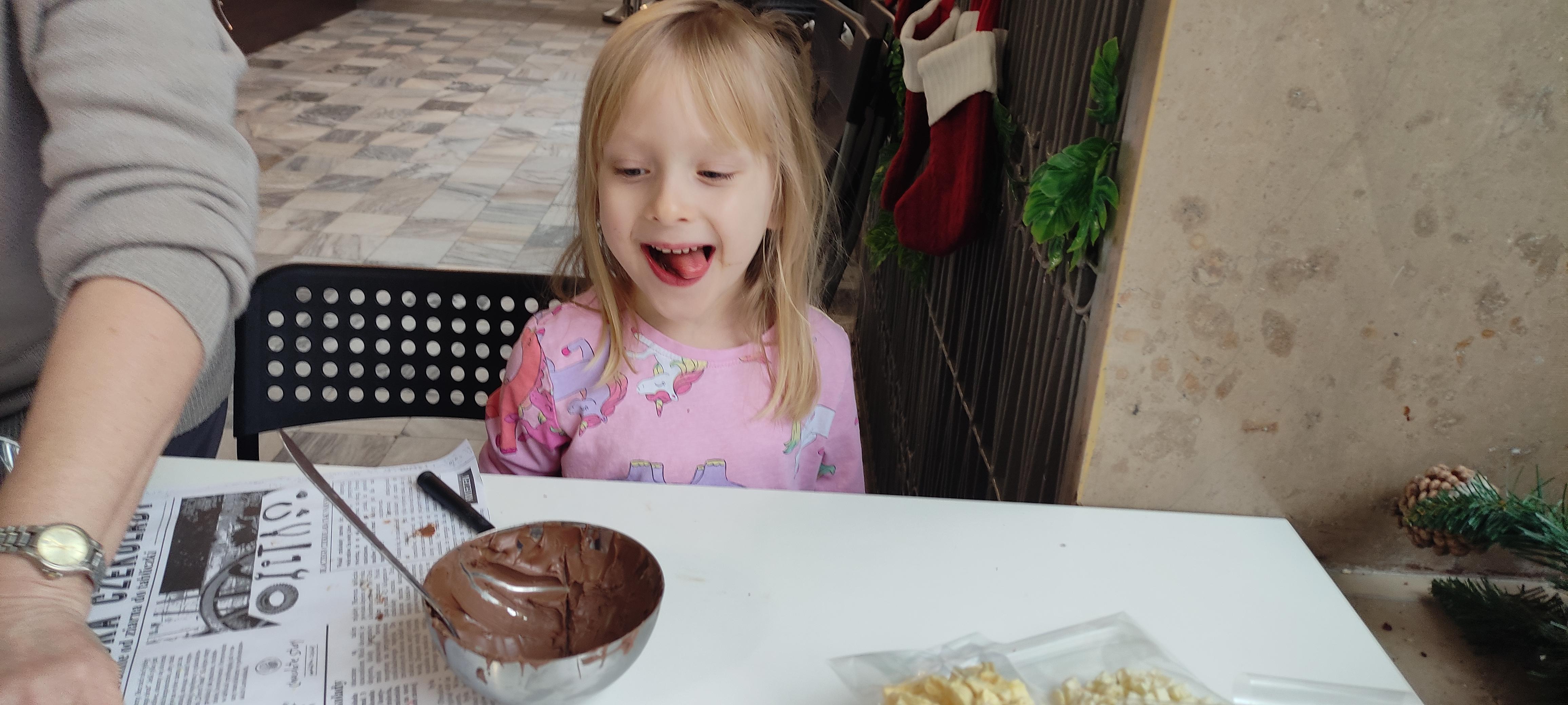 w pobliskiej Manufakturze Czekolady. Tak sie spieszyły, że przybyły tam przed czasem, dzięki czemu miały okazję pobawić się przez chwilę na pobliskim placu zabaw. Potem czekała ich już tylko "ciężka praca", czyli samodzielne wykonanie tabliczki czekolady oraz czekoladowych pralinek. W przerwie degustacja pierniczków i gorącej czekolady oraz poznanie tajemnic uprawy ziaren kakaowca, kluczowego surowca do produkcji czekolady. Jak to wszystko wyglądało zobaczcie sami ...