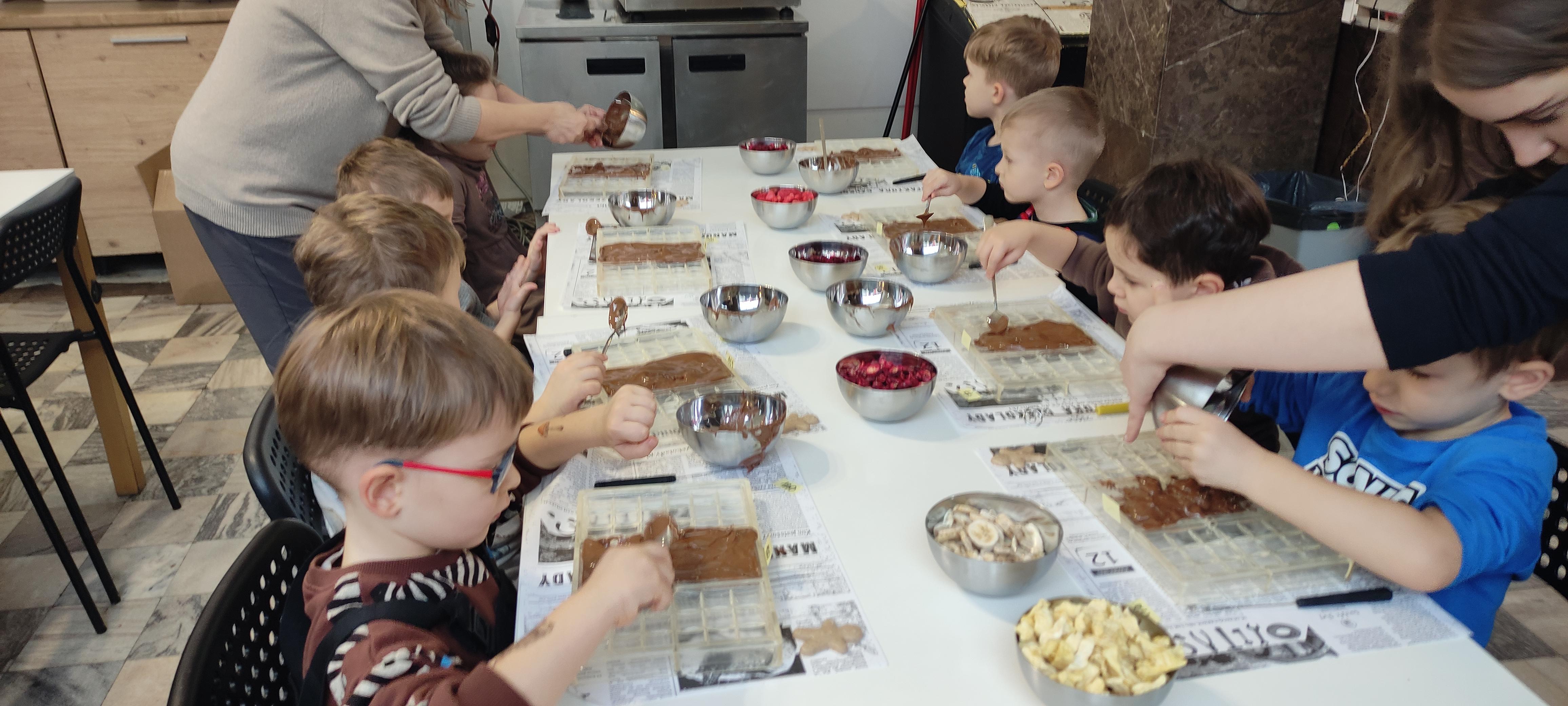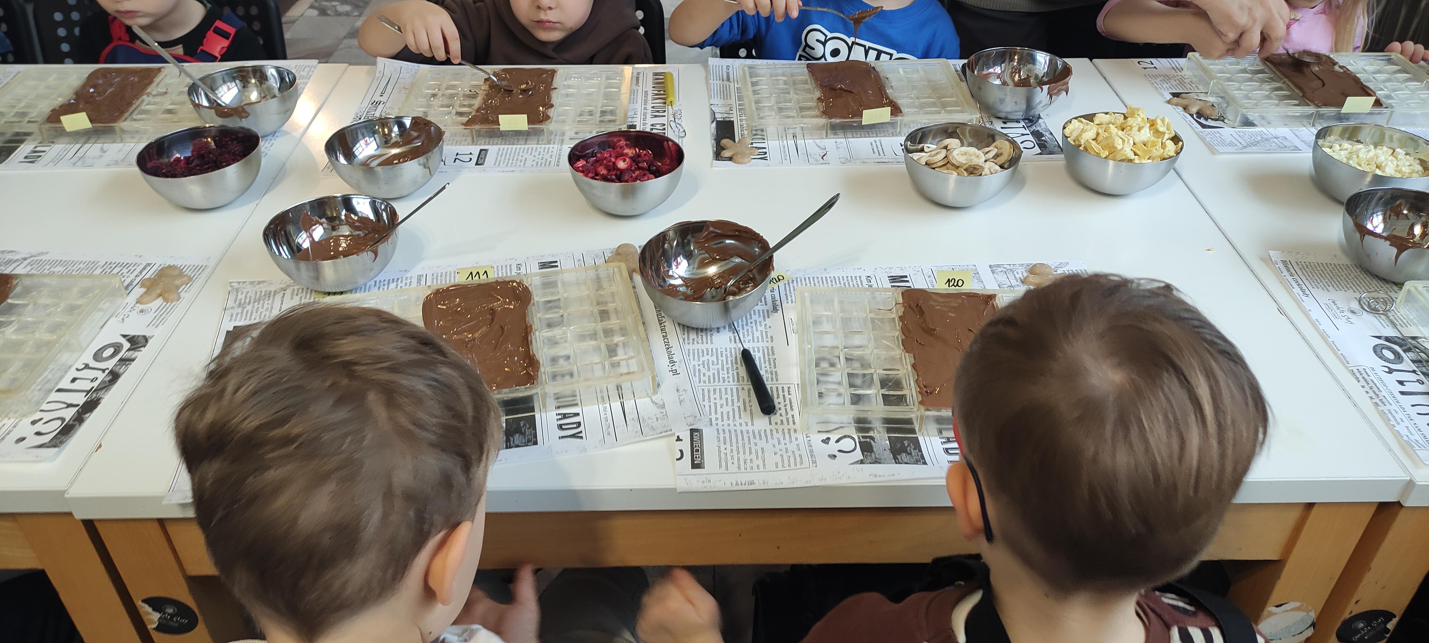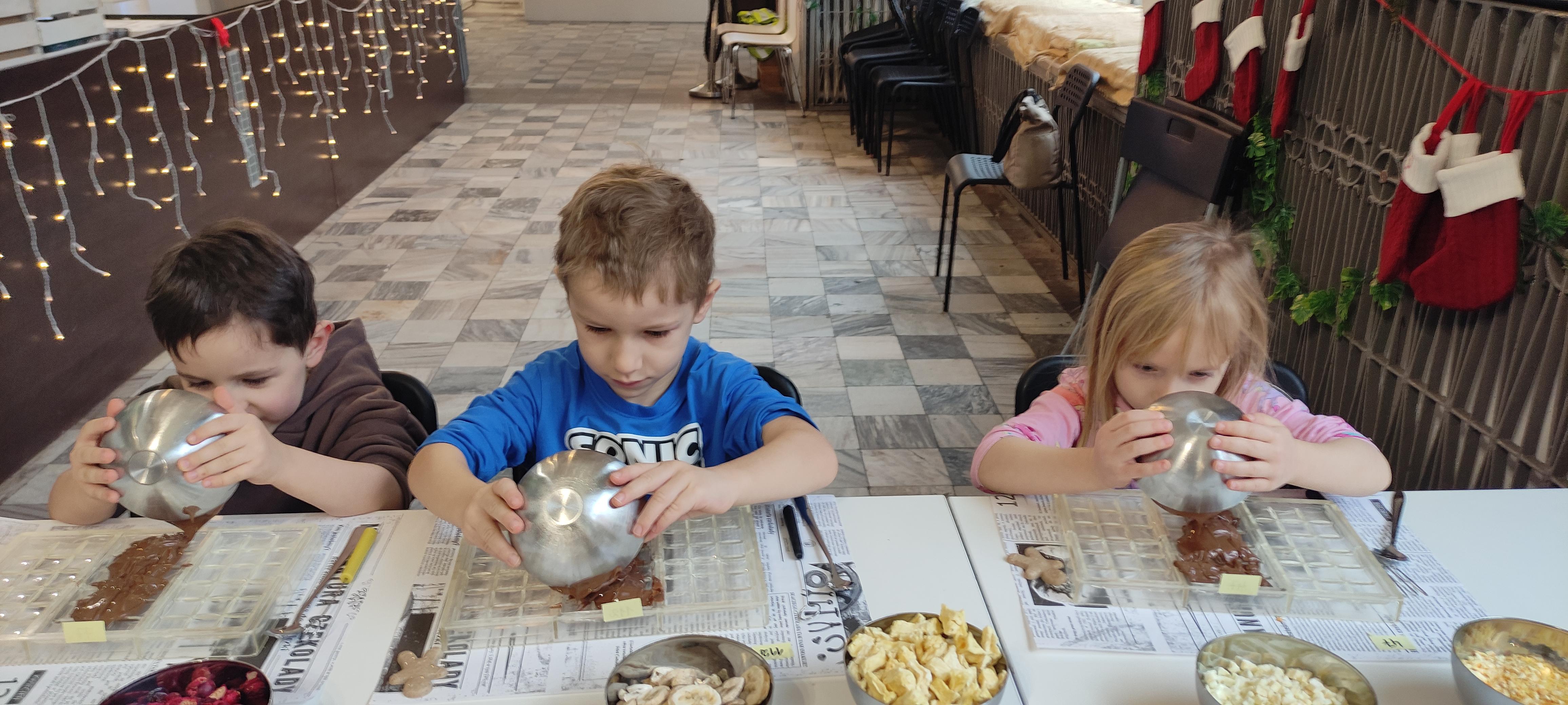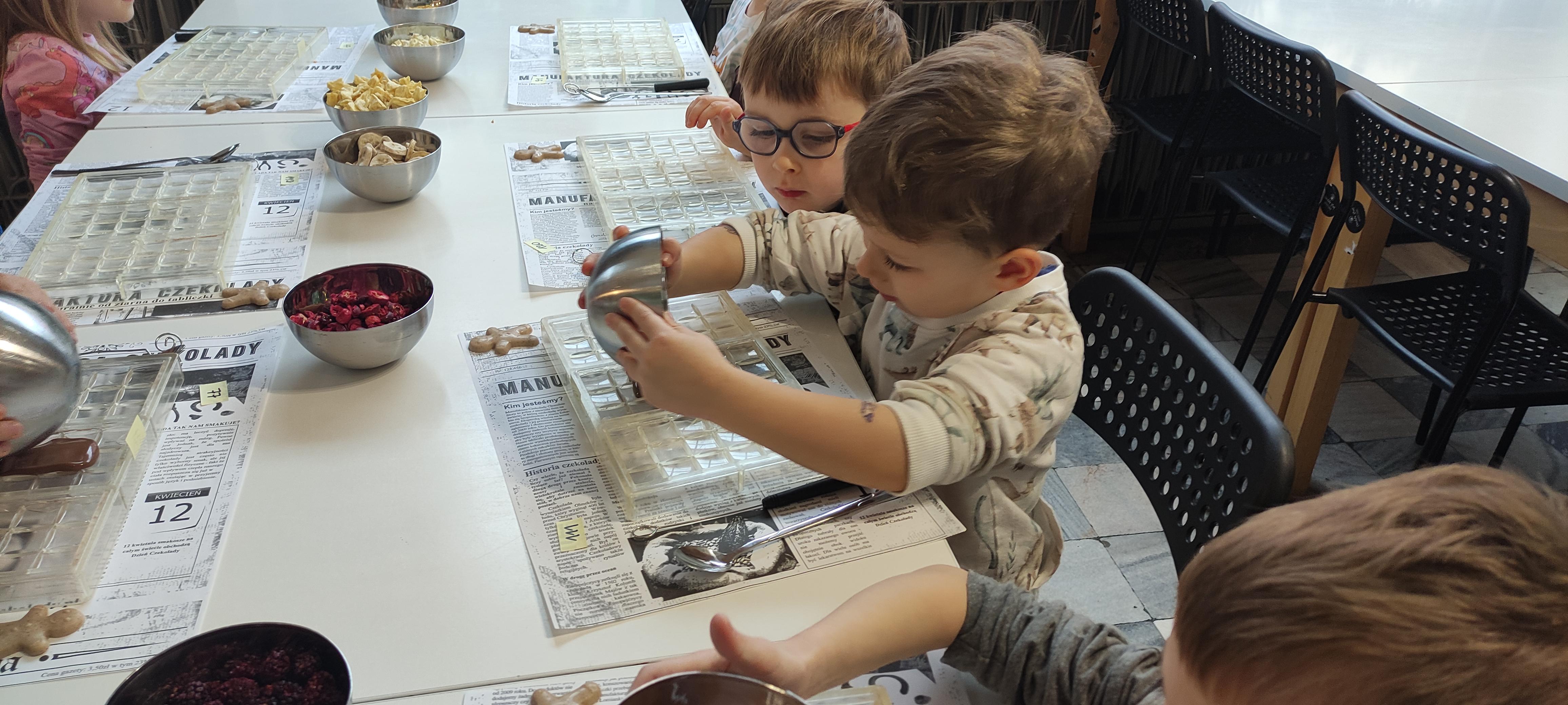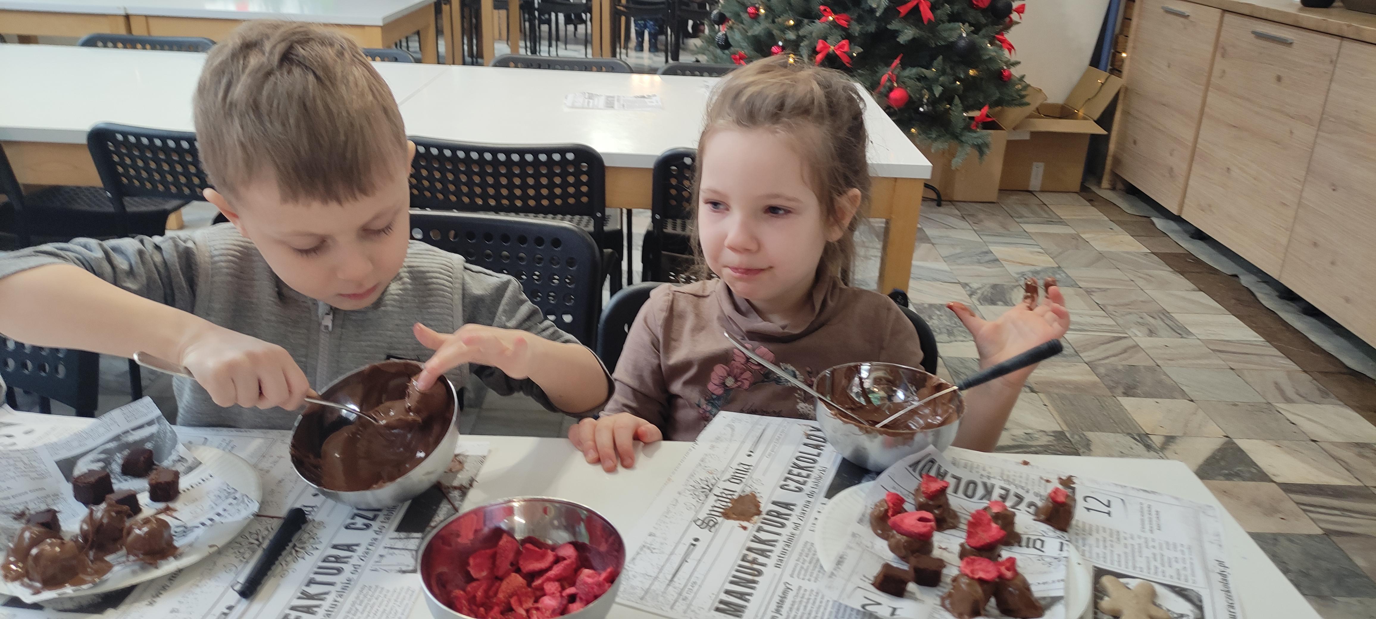w pobliskiej Manufakturze Czekolady. Tak sie spieszyły, że przybyły tam przed czasem, dzięki czemu miały okazję pobawić się przez chwilę na pobliskim placu zabaw. Potem czekała ich już tylko "ciężka praca", czyli samodzielne wykonanie tabliczki czekolady oraz czekoladowych pralinek. W przerwie degustacja pierniczków i gorącej czekolady oraz poznanie tajemnic uprawy ziaren kakaowca, kluczowego surowca do produkcji czekolady. Jak to wszystko wyglądało zobaczcie sami ...