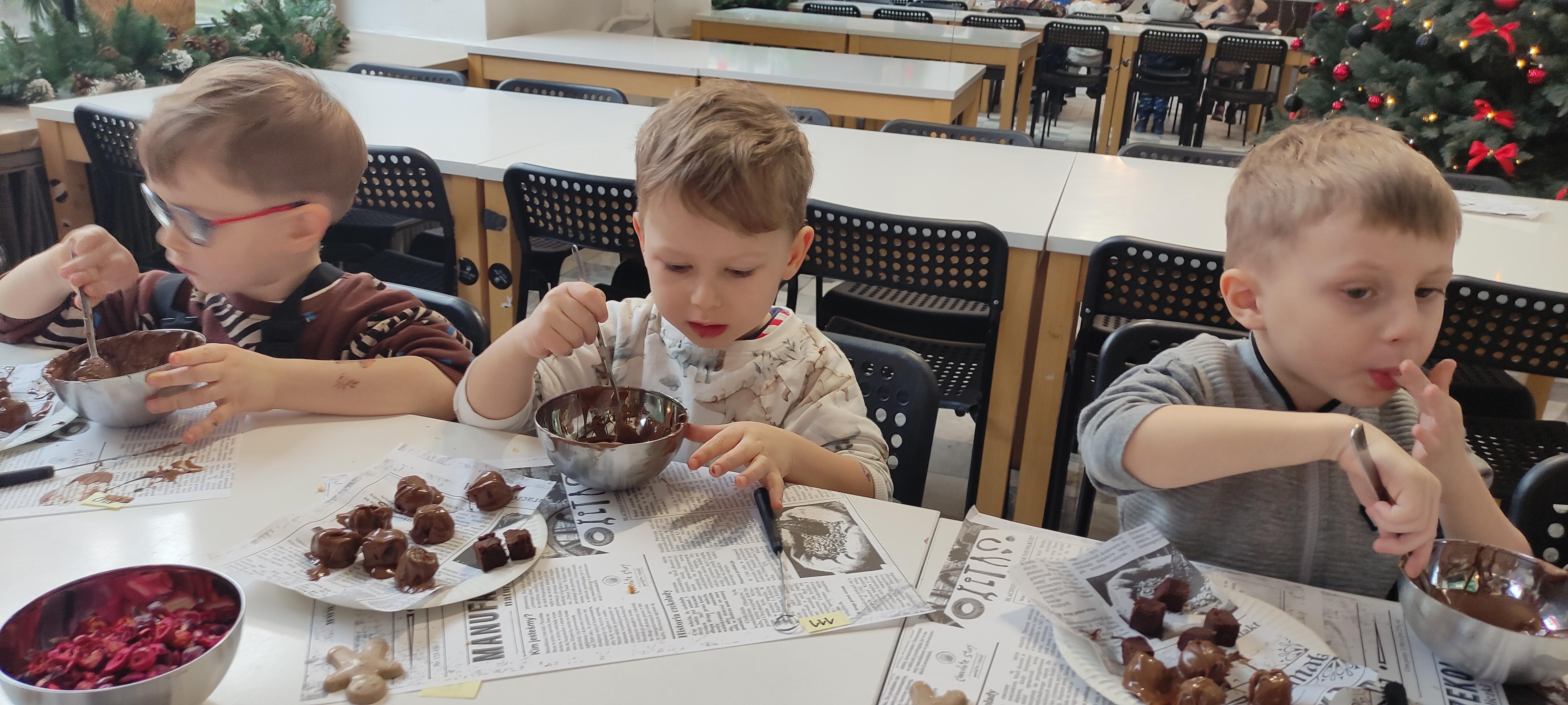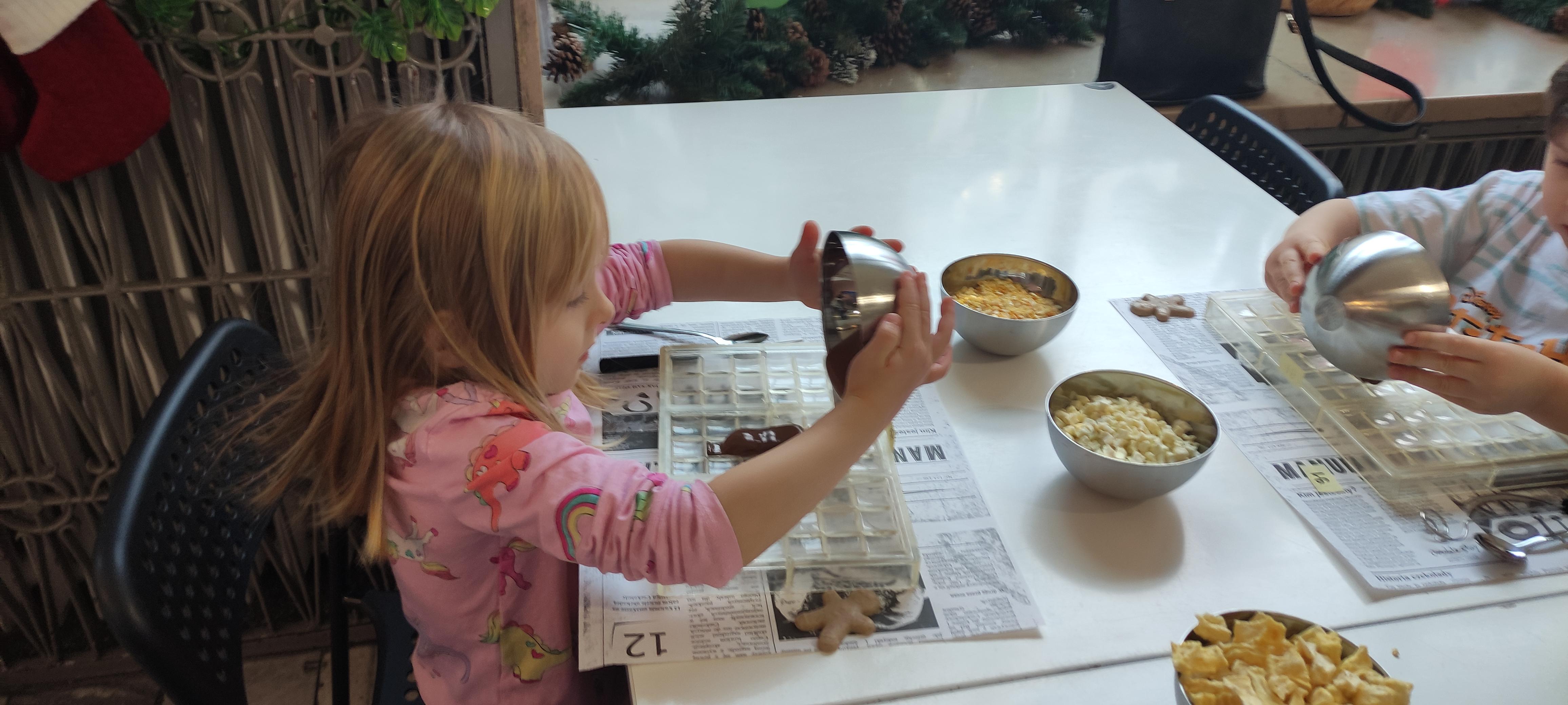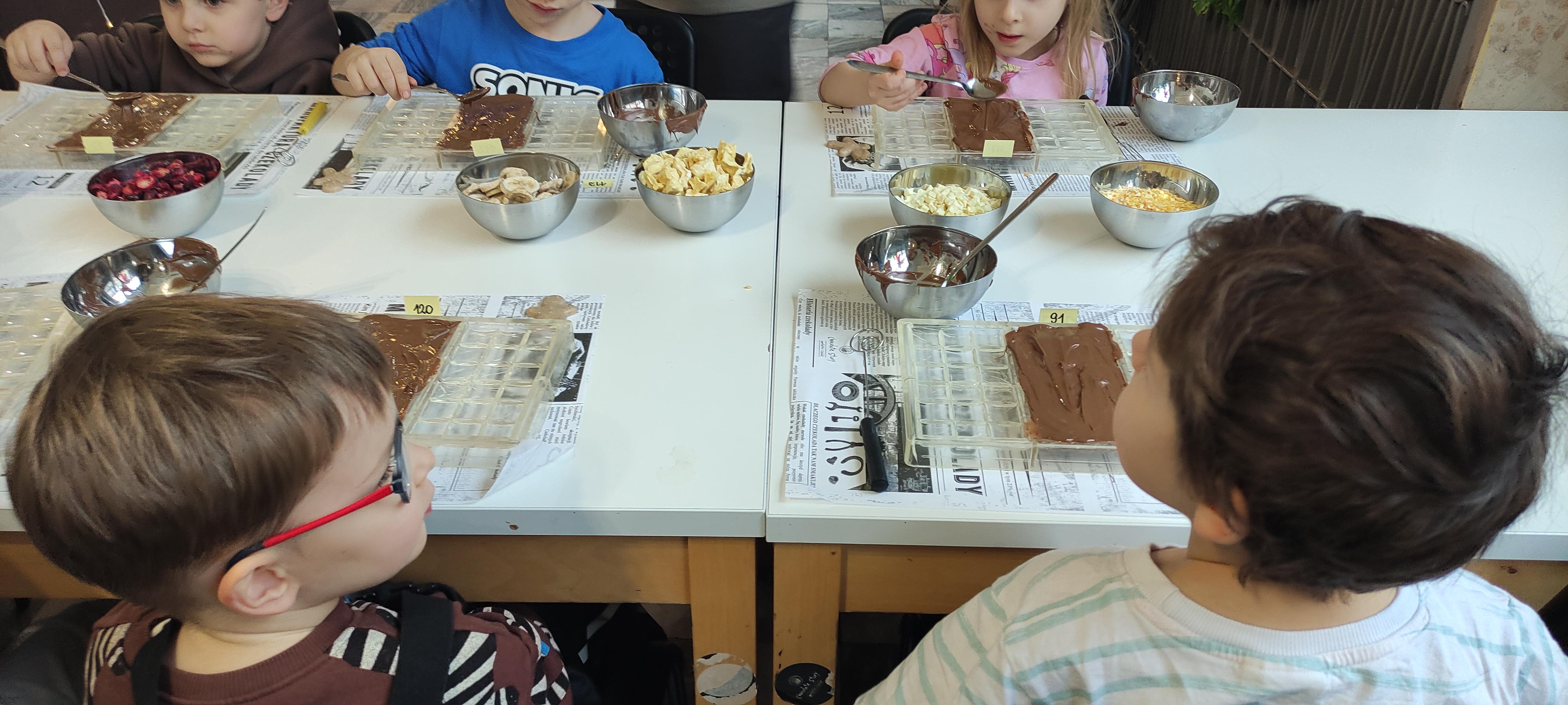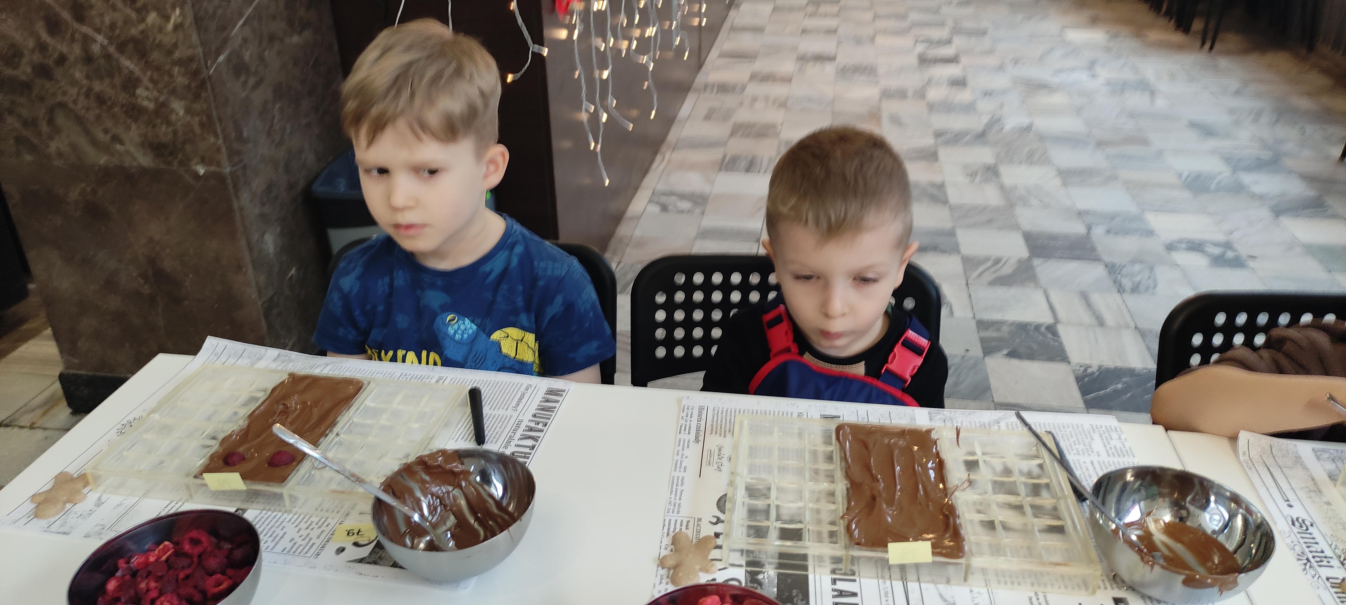 w pobliskiej Manufakturze Czekolady. Tak sie spieszyły, że przybyły tam przed czasem, dzięki czemu miały okazję pobawić się przez chwilę na pobliskim placu zabaw. Potem czekała ich już tylko "ciężka praca", czyli samodzielne wykonanie tabliczki czekolady oraz czekoladowych pralinek. W przerwie degustacja pierniczków i gorącej czekolady oraz poznanie tajemnic uprawy ziaren kakaowca, kluczowego surowca do produkcji czekolady. Jak to wszystko wyglądało zobaczcie sami ...