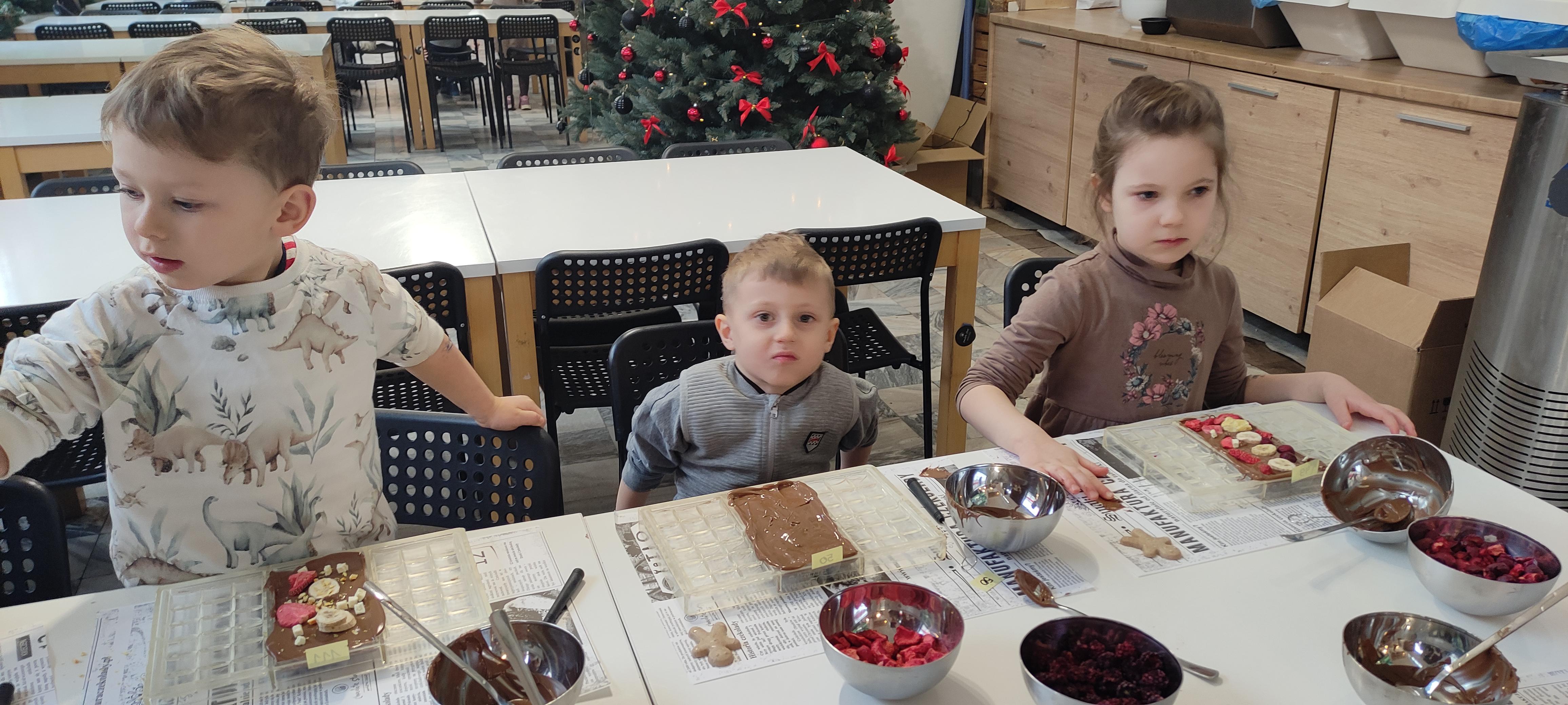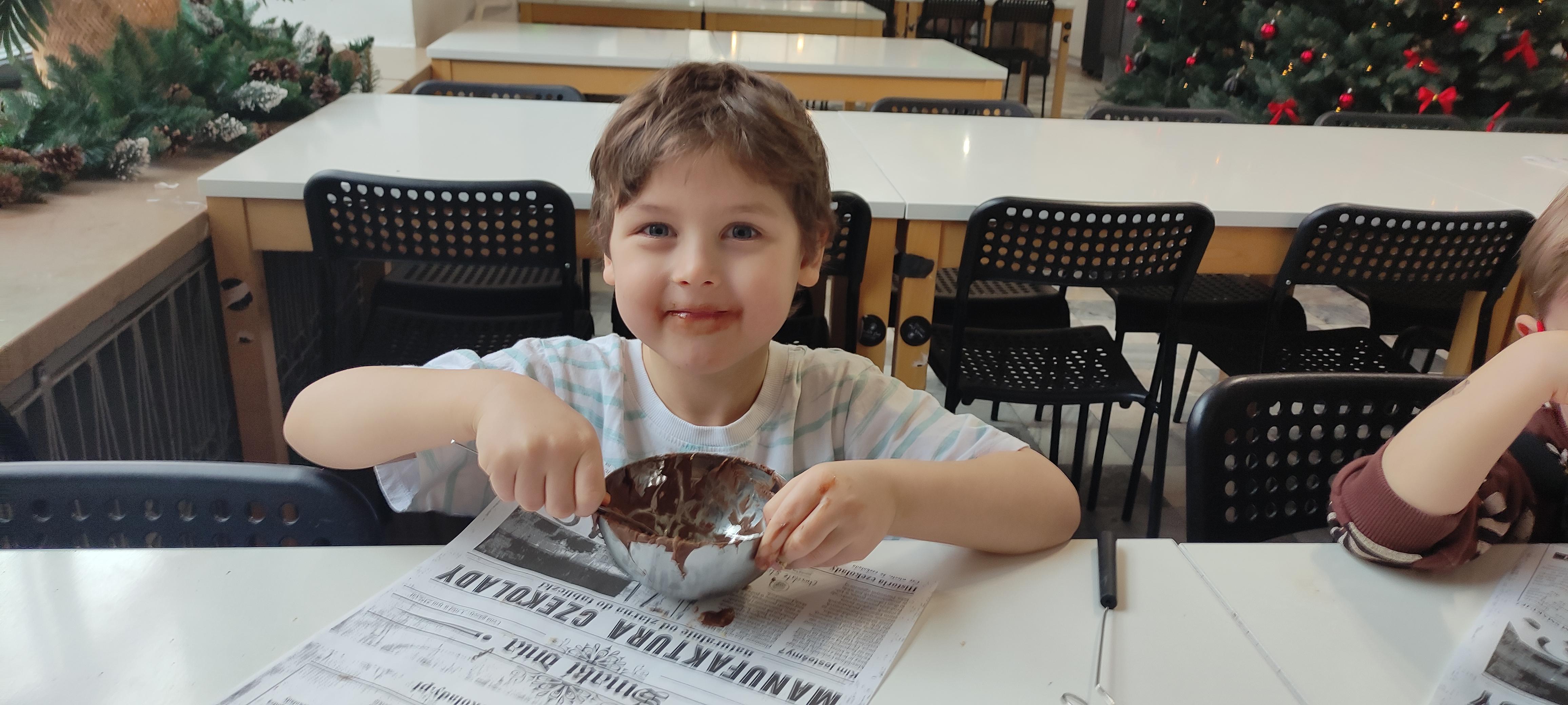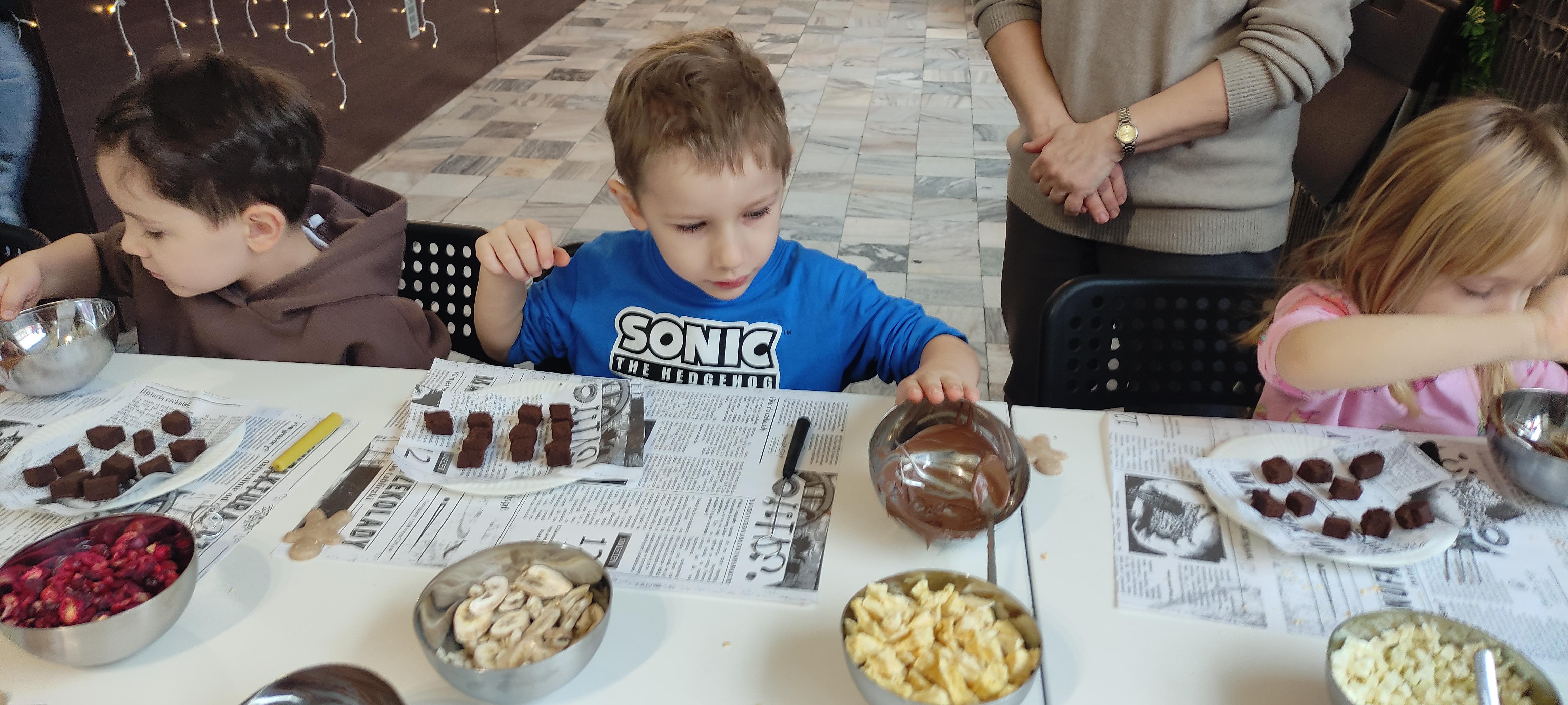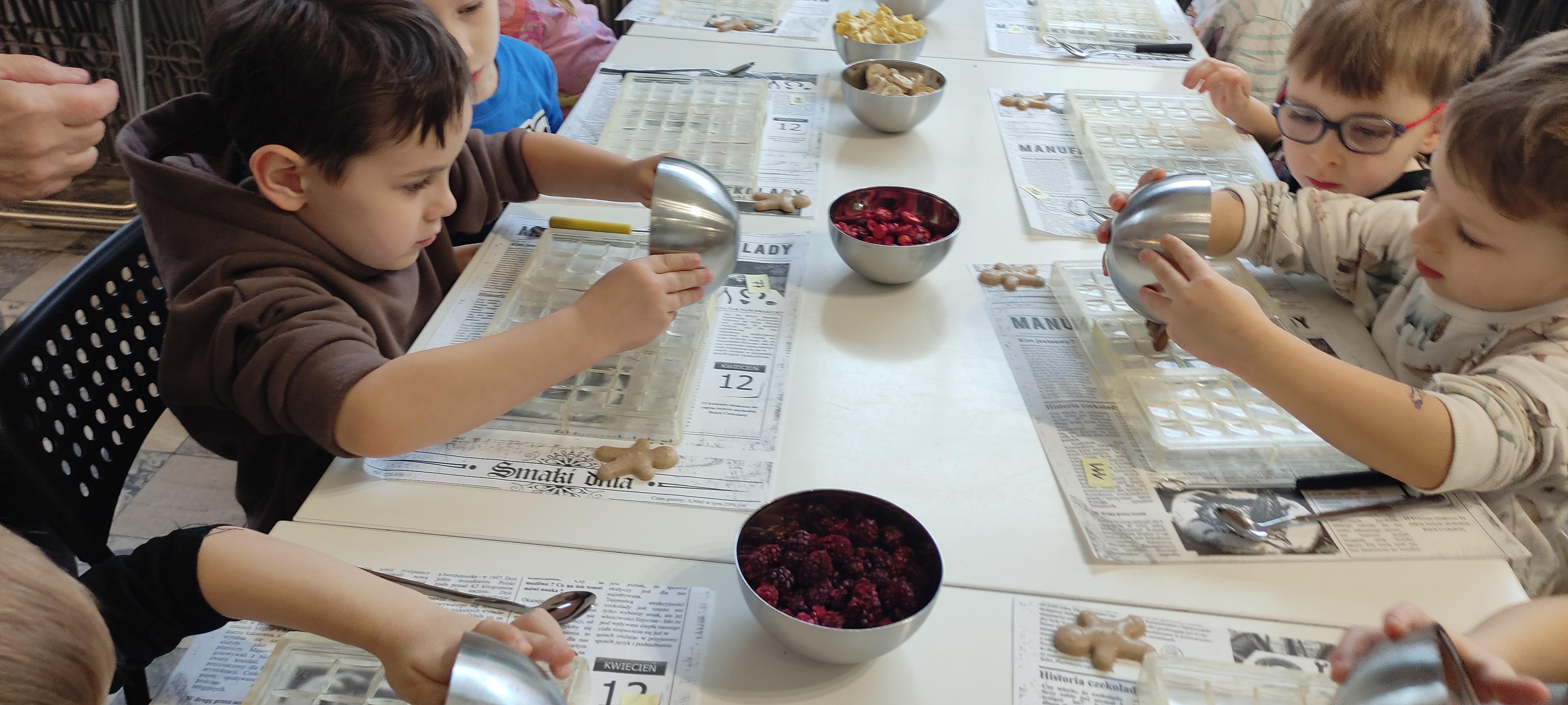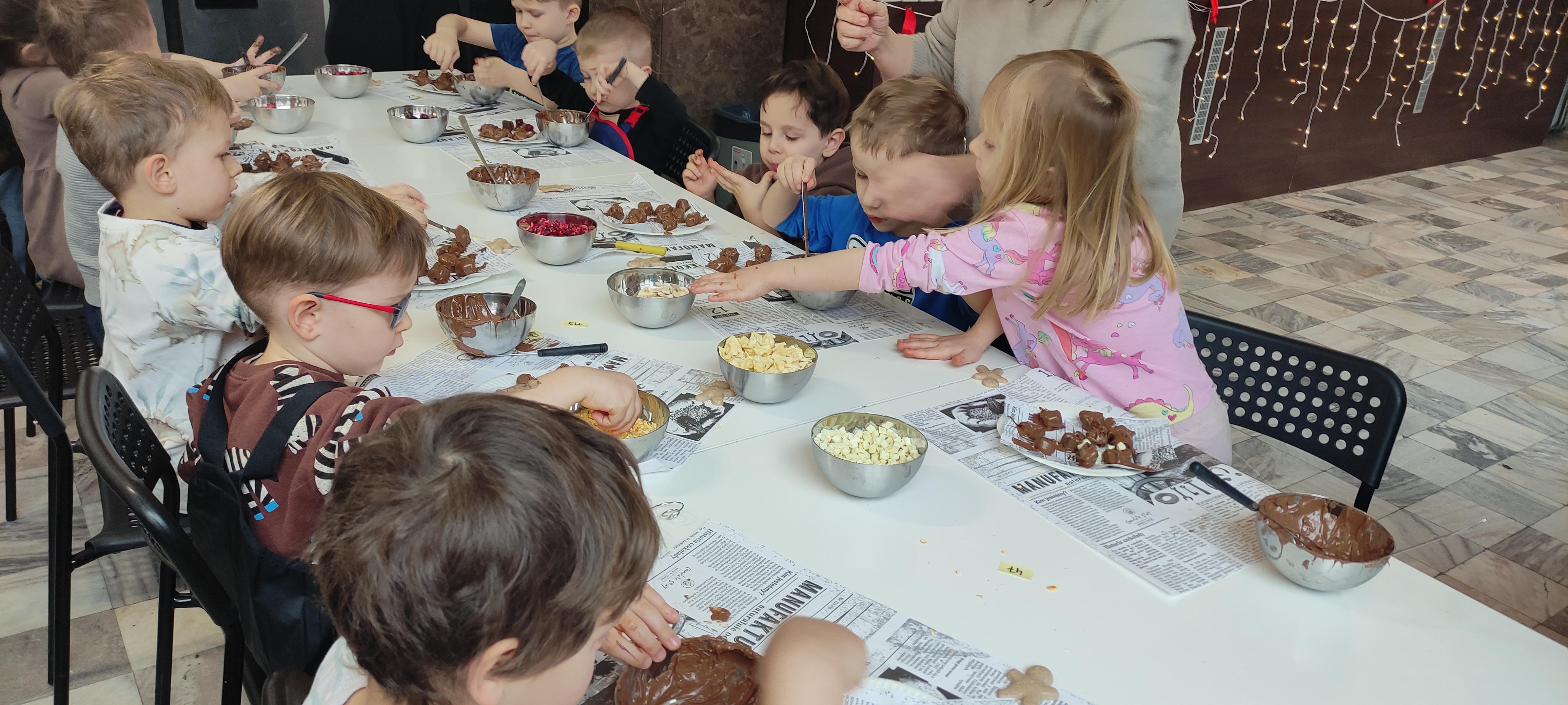 w pobliskiej Manufakturze Czekolady. Tak sie spieszyły, że przybyły tam przed czasem, dzięki czemu miały okazję pobawić się przez chwilę na pobliskim placu zabaw. Potem czekała ich już tylko "ciężka praca", czyli samodzielne wykonanie tabliczki czekolady oraz czekoladowych pralinek. W przerwie degustacja pierniczków i gorącej czekolady oraz poznanie tajemnic uprawy ziaren kakaowca, kluczowego surowca do produkcji czekolady. Jak to wszystko wyglądało zobaczcie sami ...