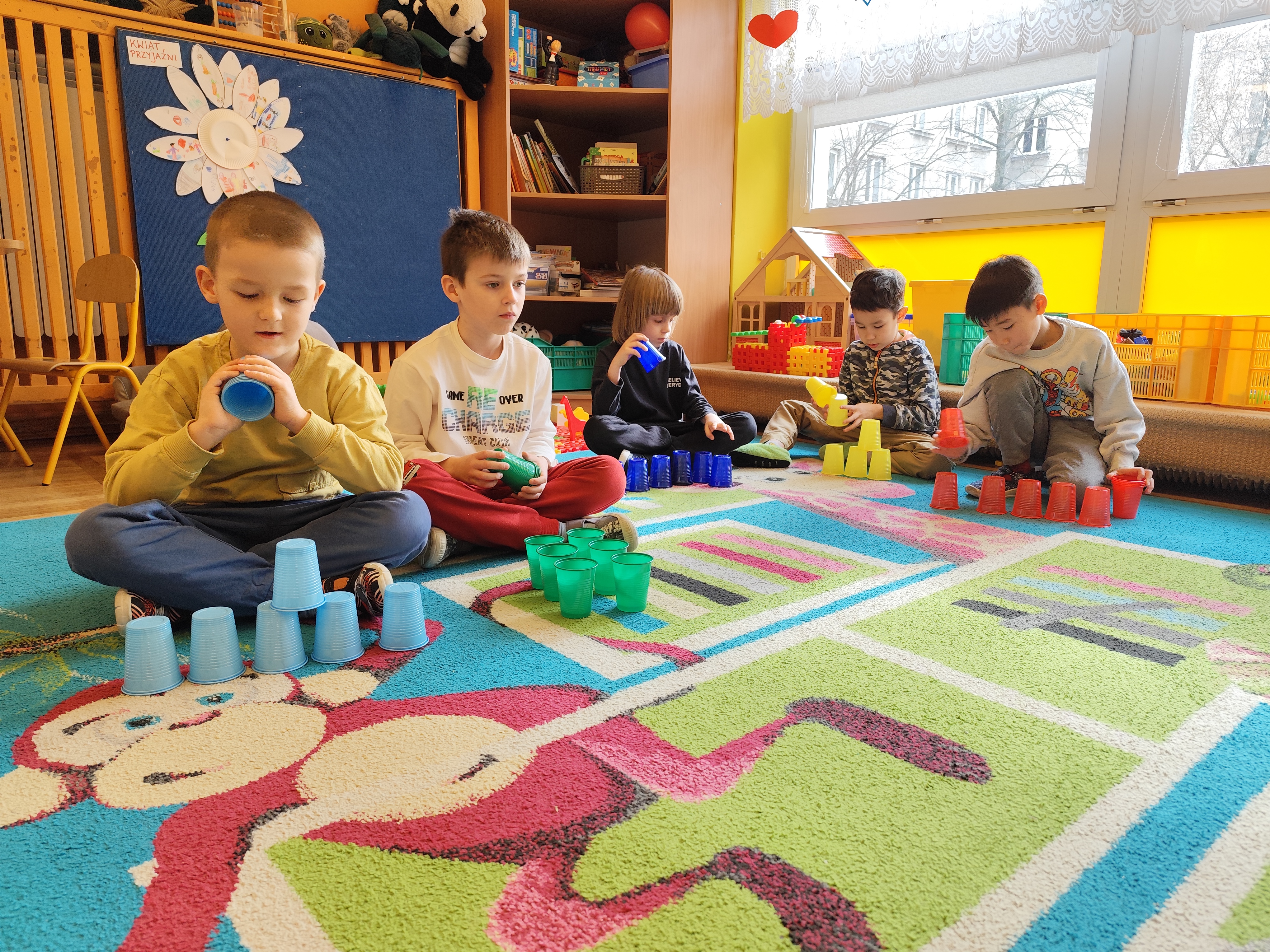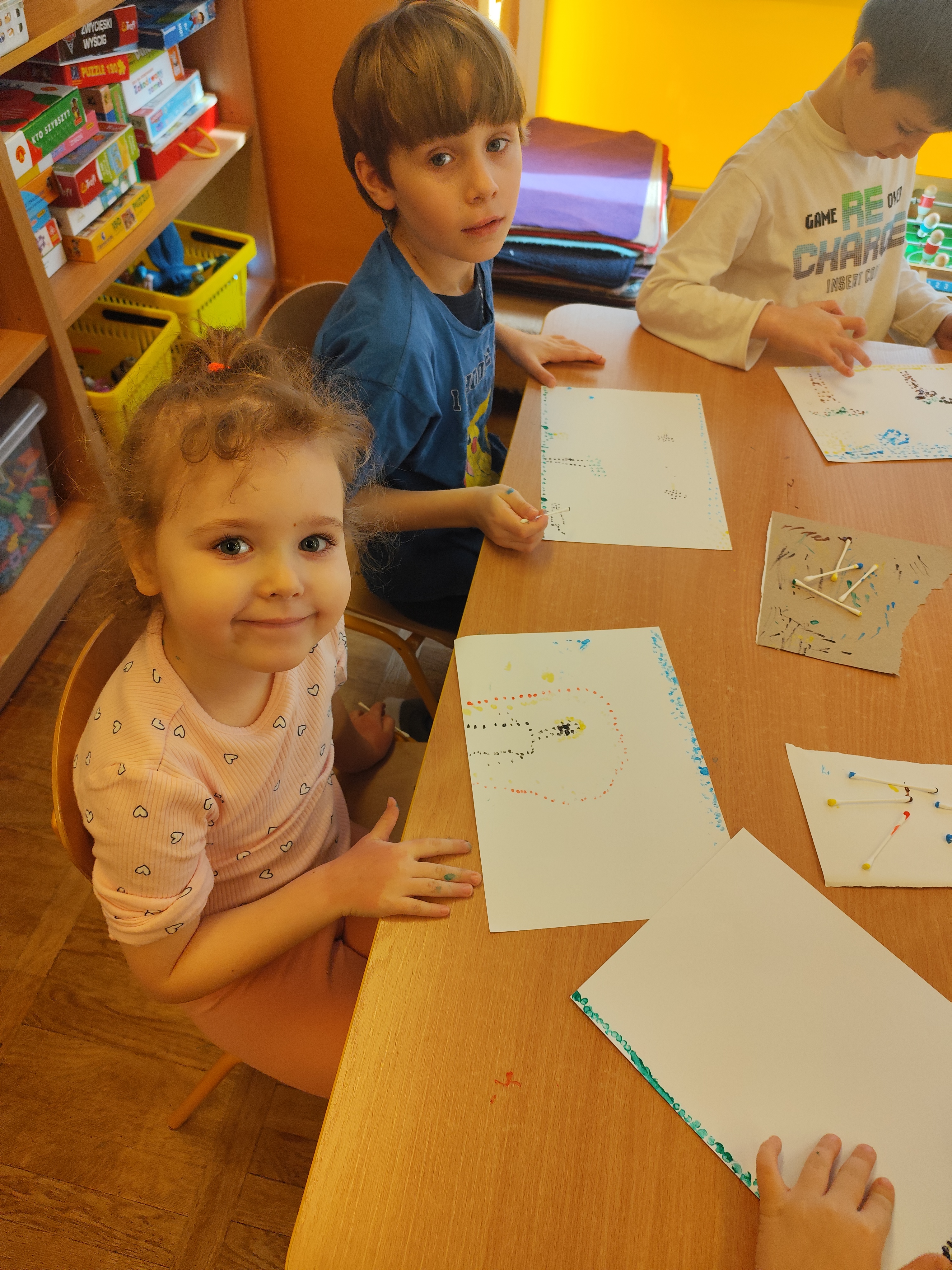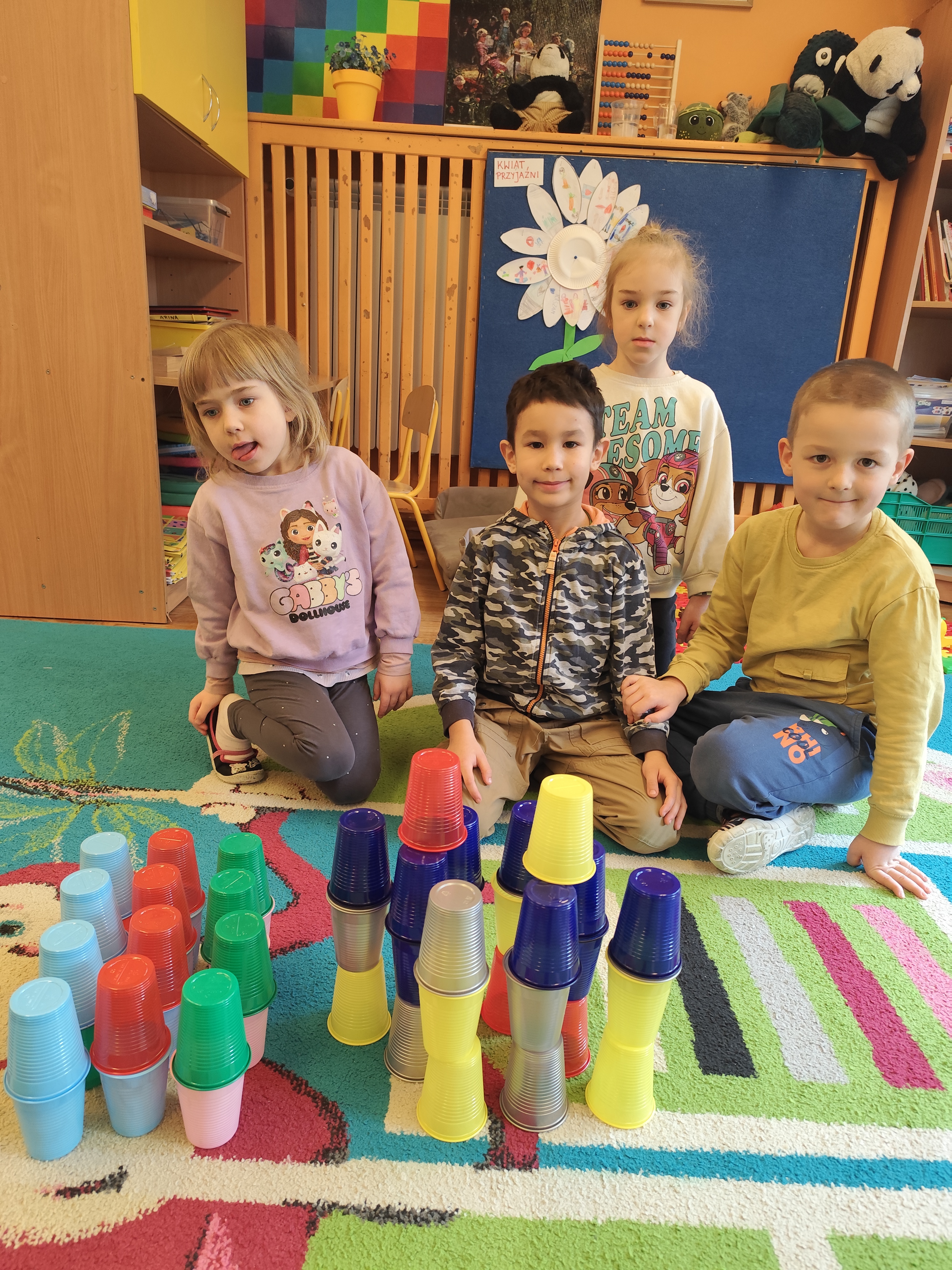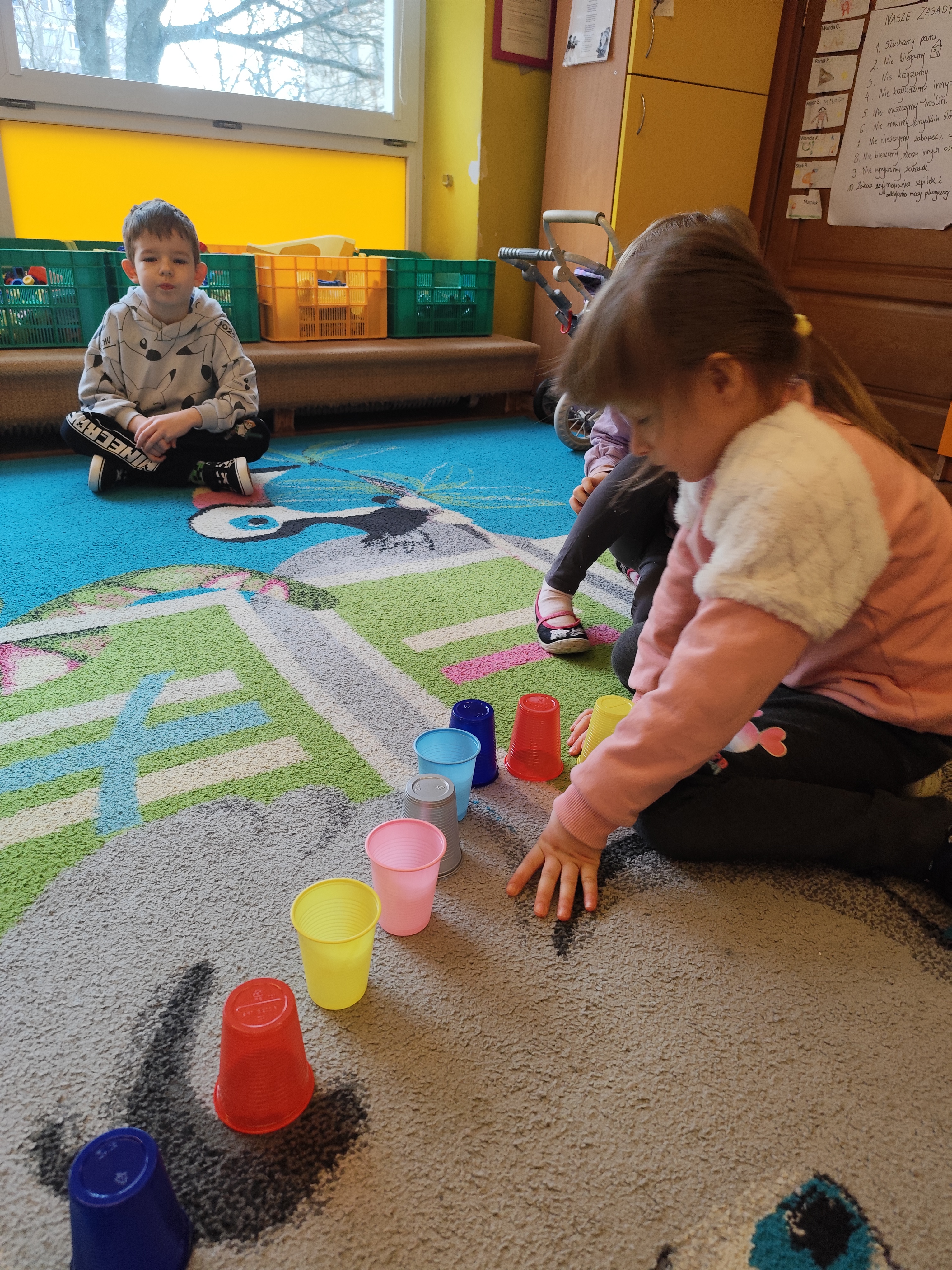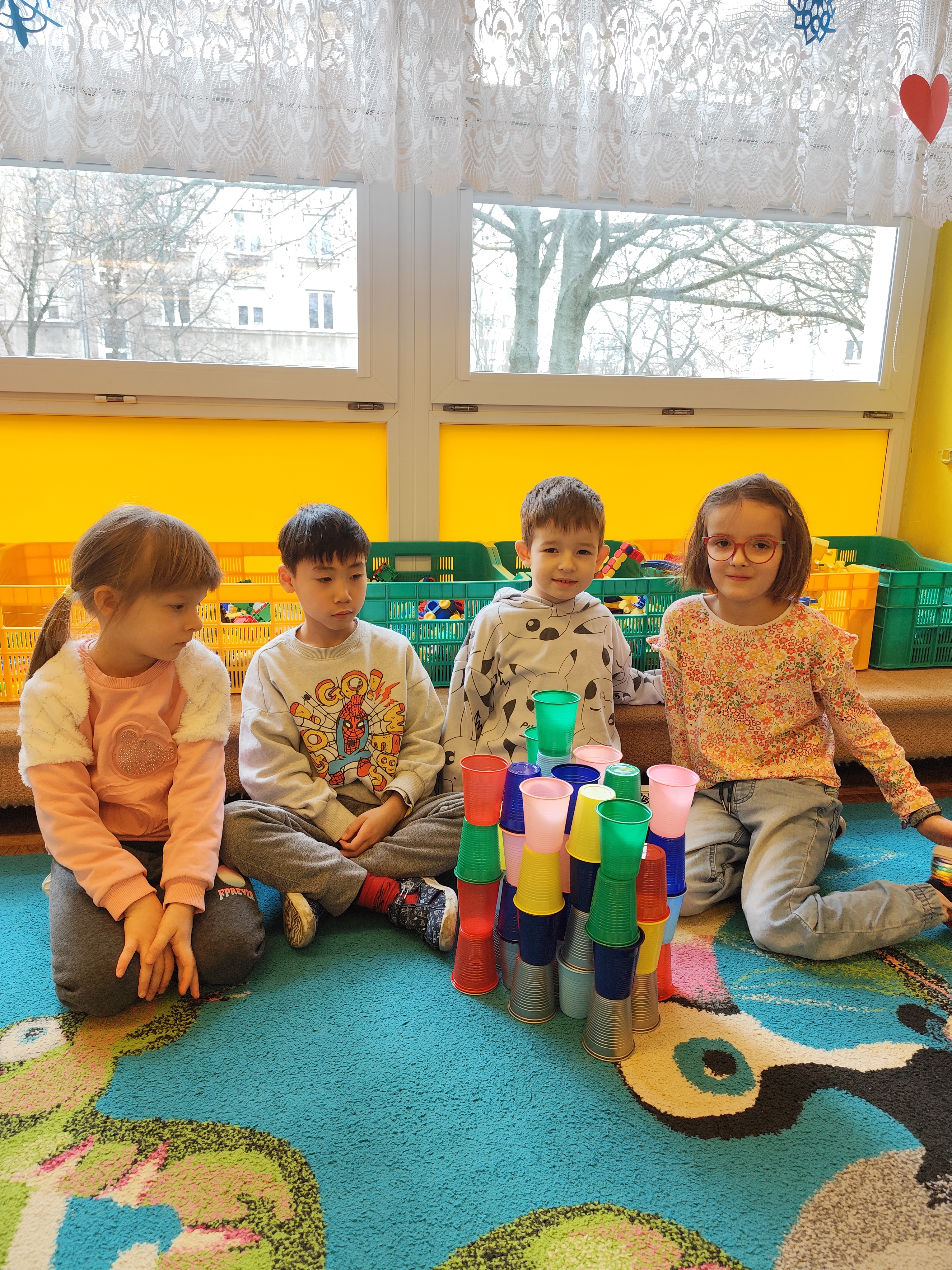 W styczniu obchodziliśmy Dzień Babci i Dziadka, mieliśmy też duuużo zabawy, w lutym układaliśmy rytmy i liczyliśmy używając kolorowych kubeczków. Tworzylismy także prace do projektu "Wyruszamy w świat sztuki" oraz budowaliśmy i malowaliśmy rakietę.