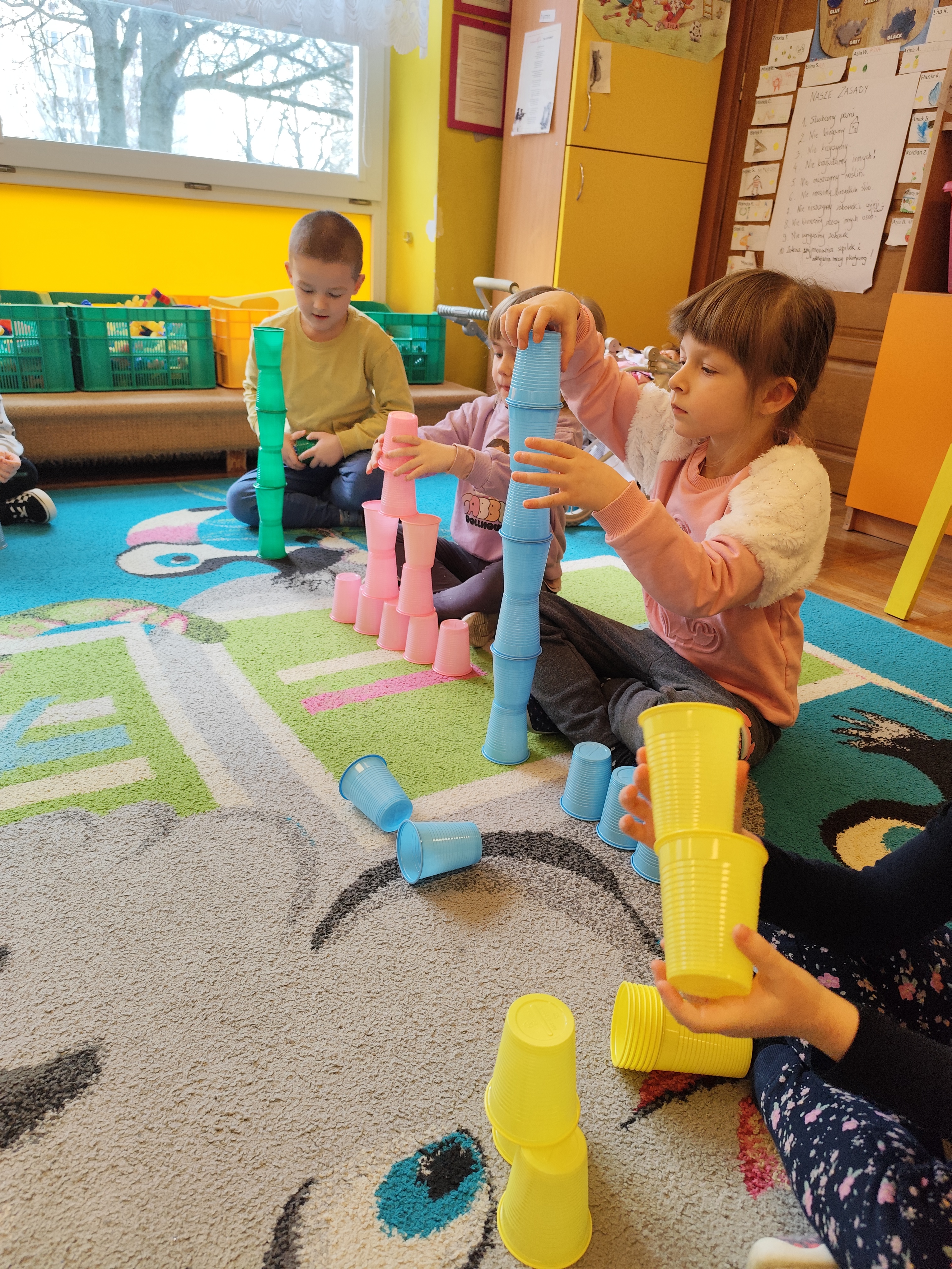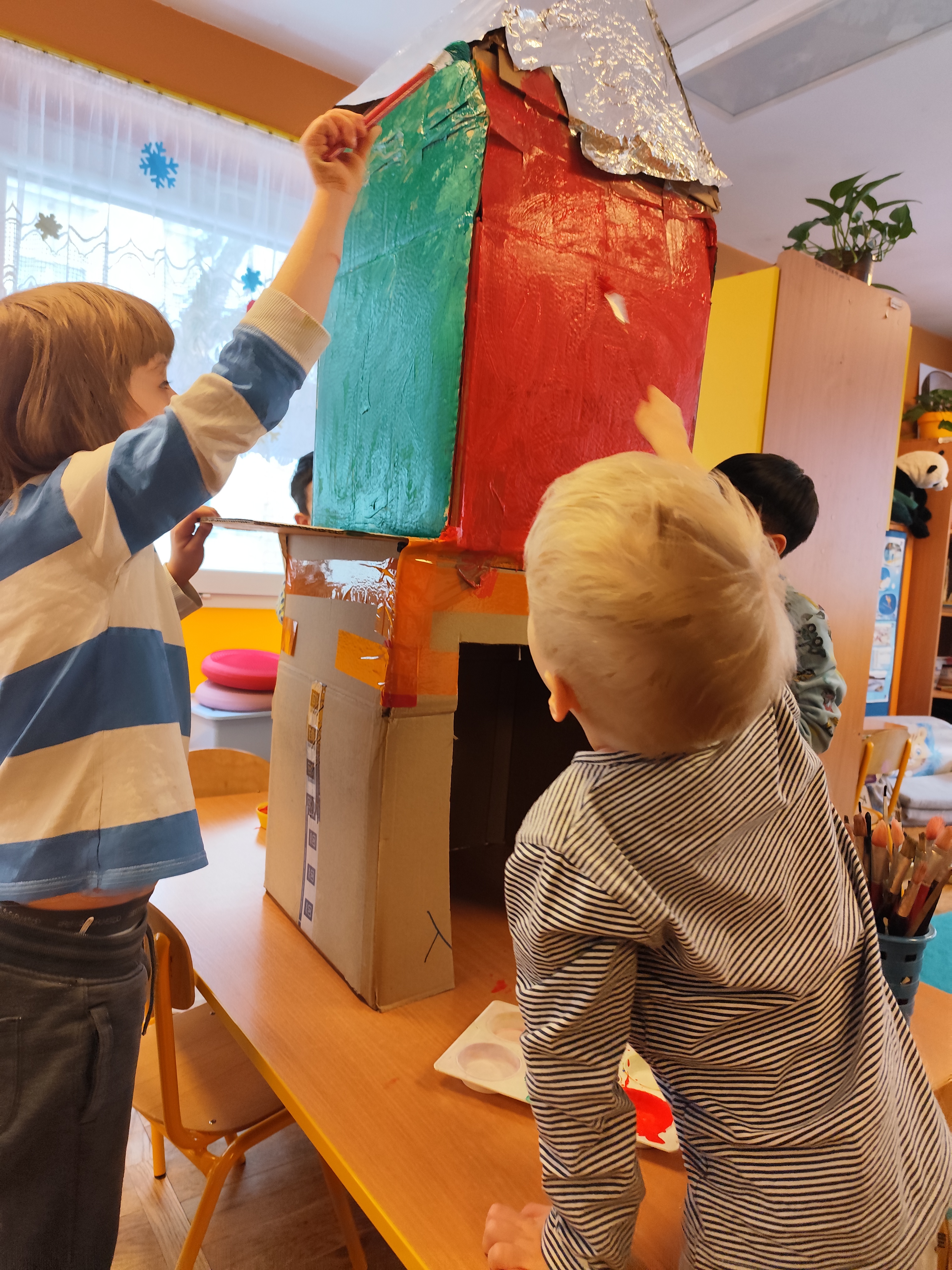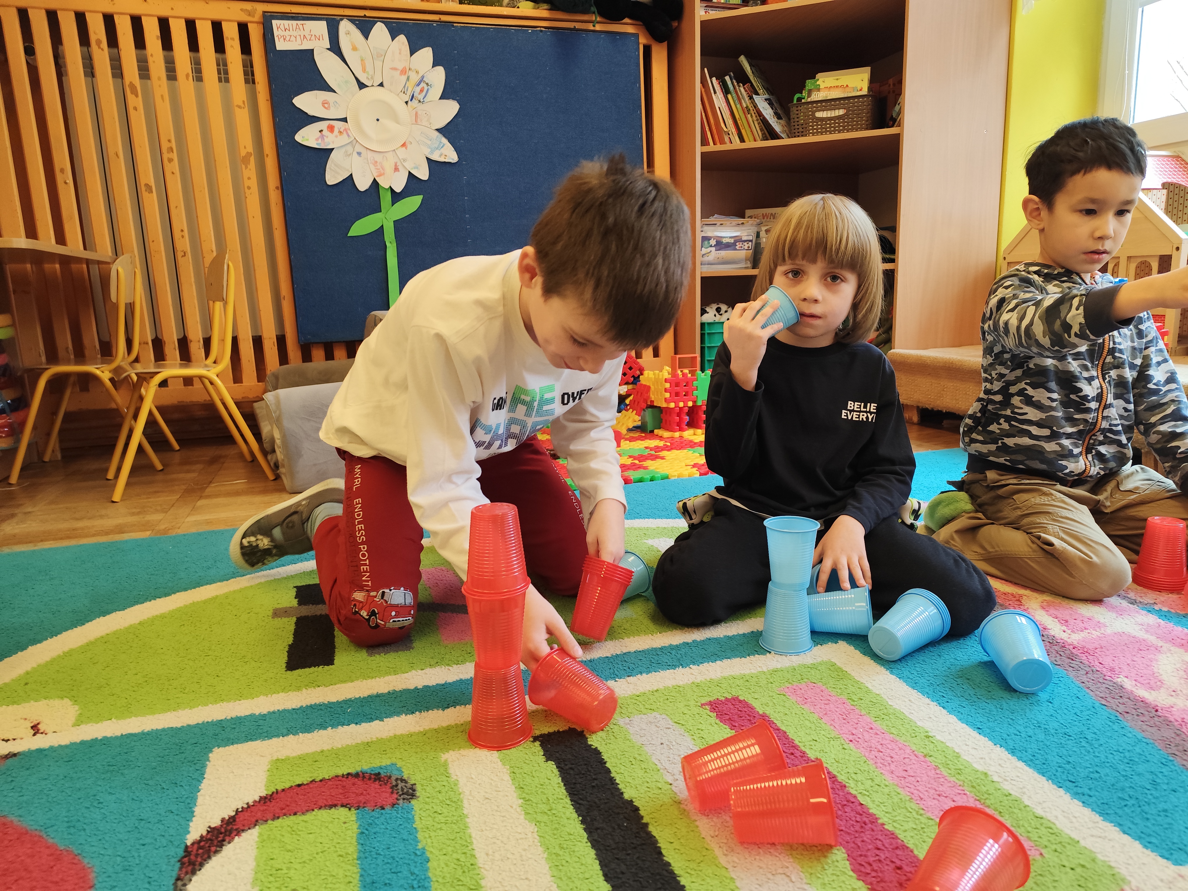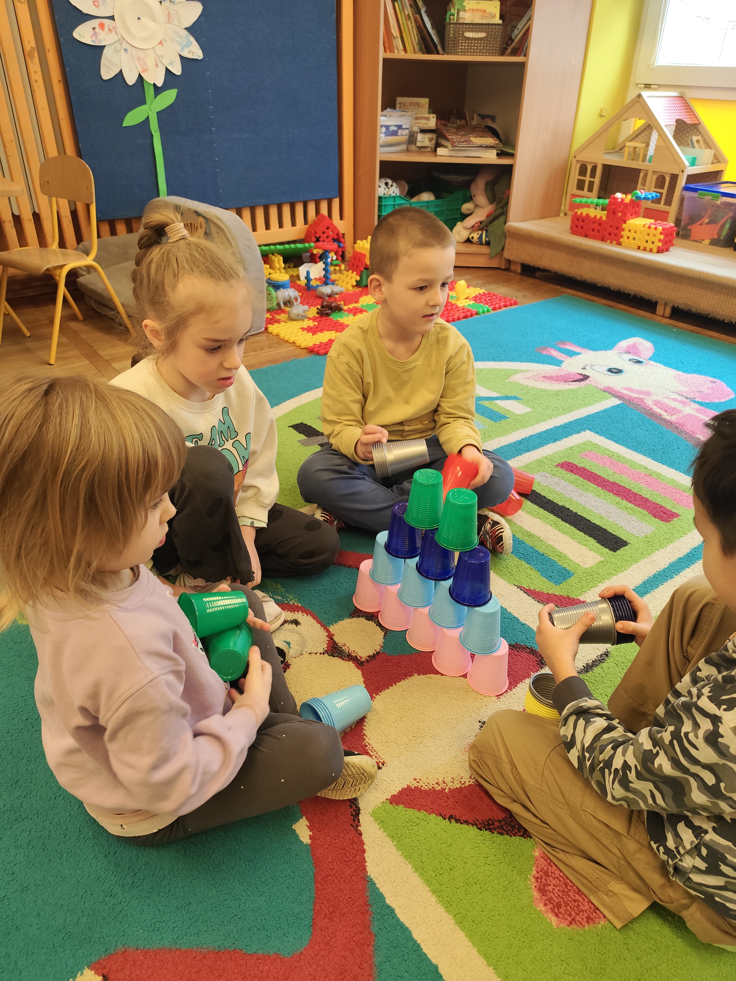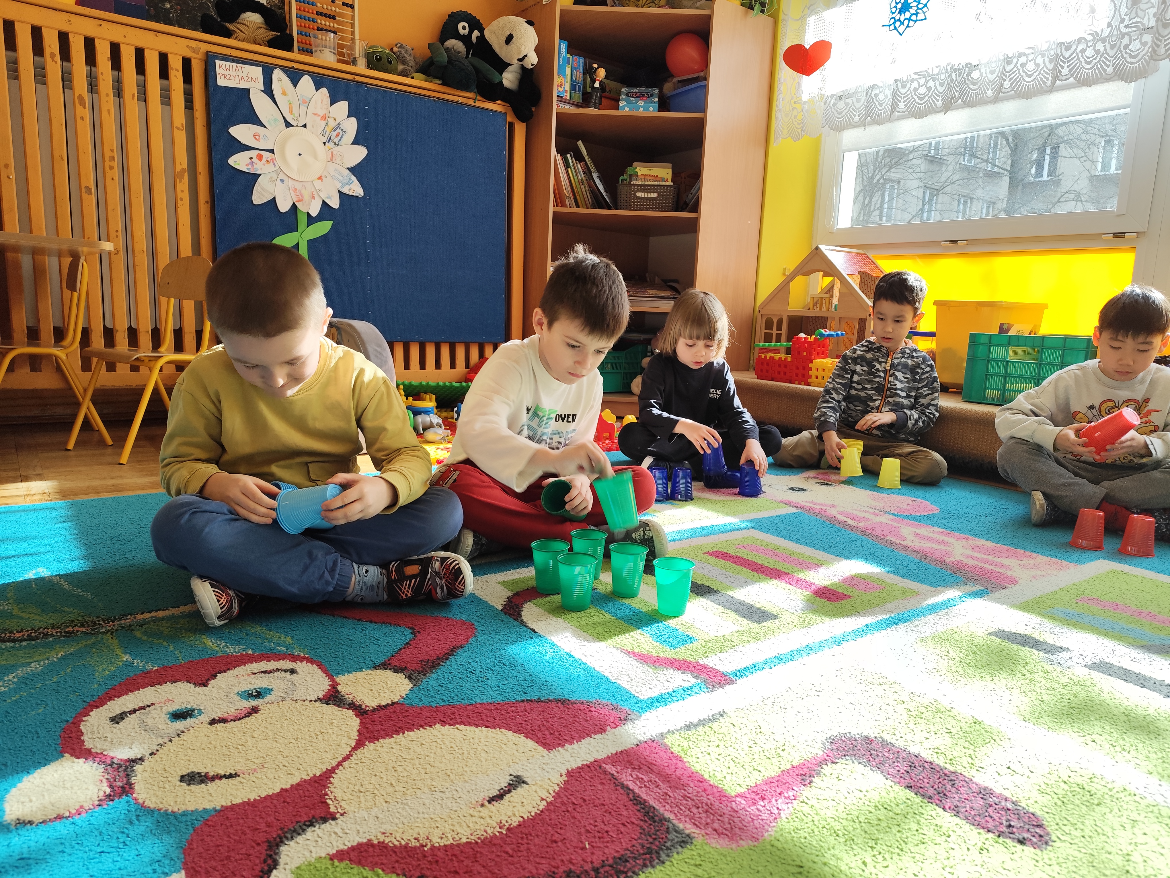 W styczniu obchodziliśmy Dzień Babci i Dziadka, mieliśmy też duuużo zabawy, w lutym układaliśmy rytmy i liczyliśmy używając kolorowych kubeczków. Tworzylismy także prace do projektu "Wyruszamy w świat sztuki" oraz budowaliśmy i malowaliśmy rakietę.