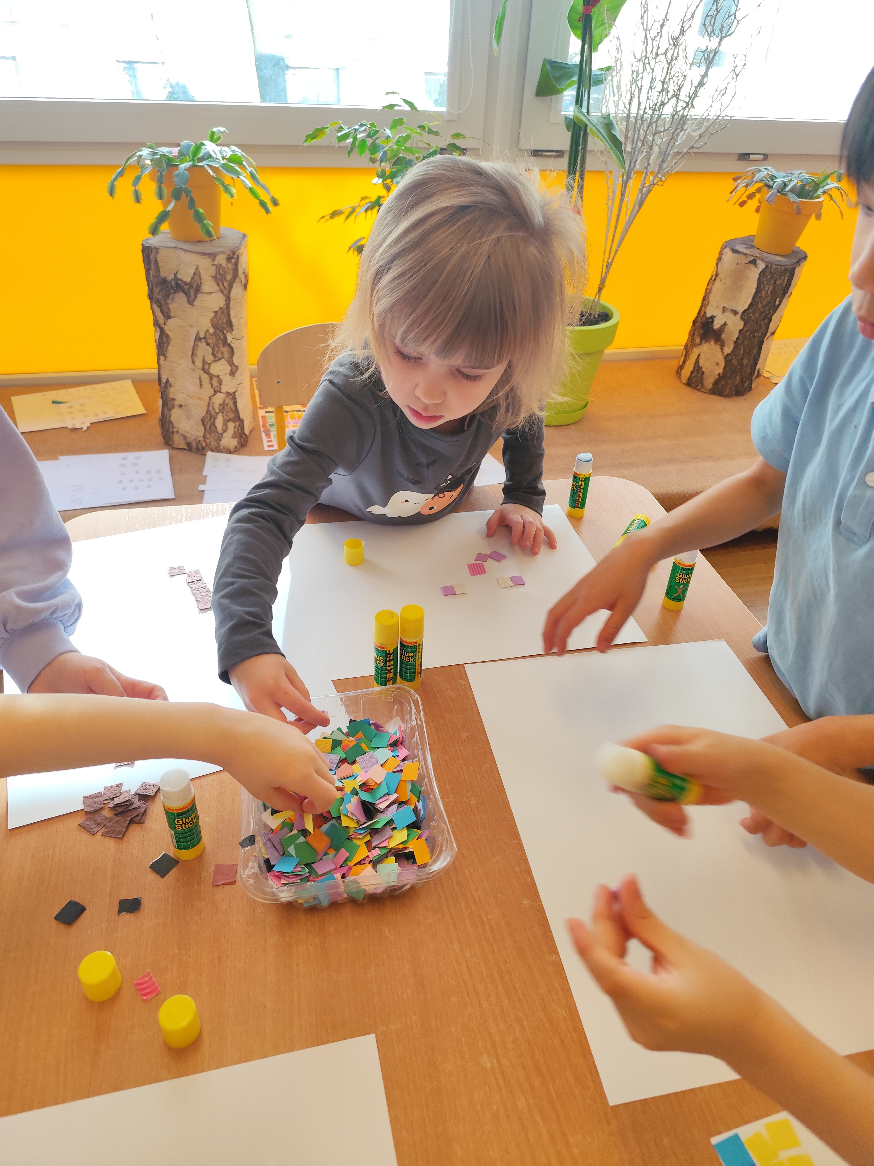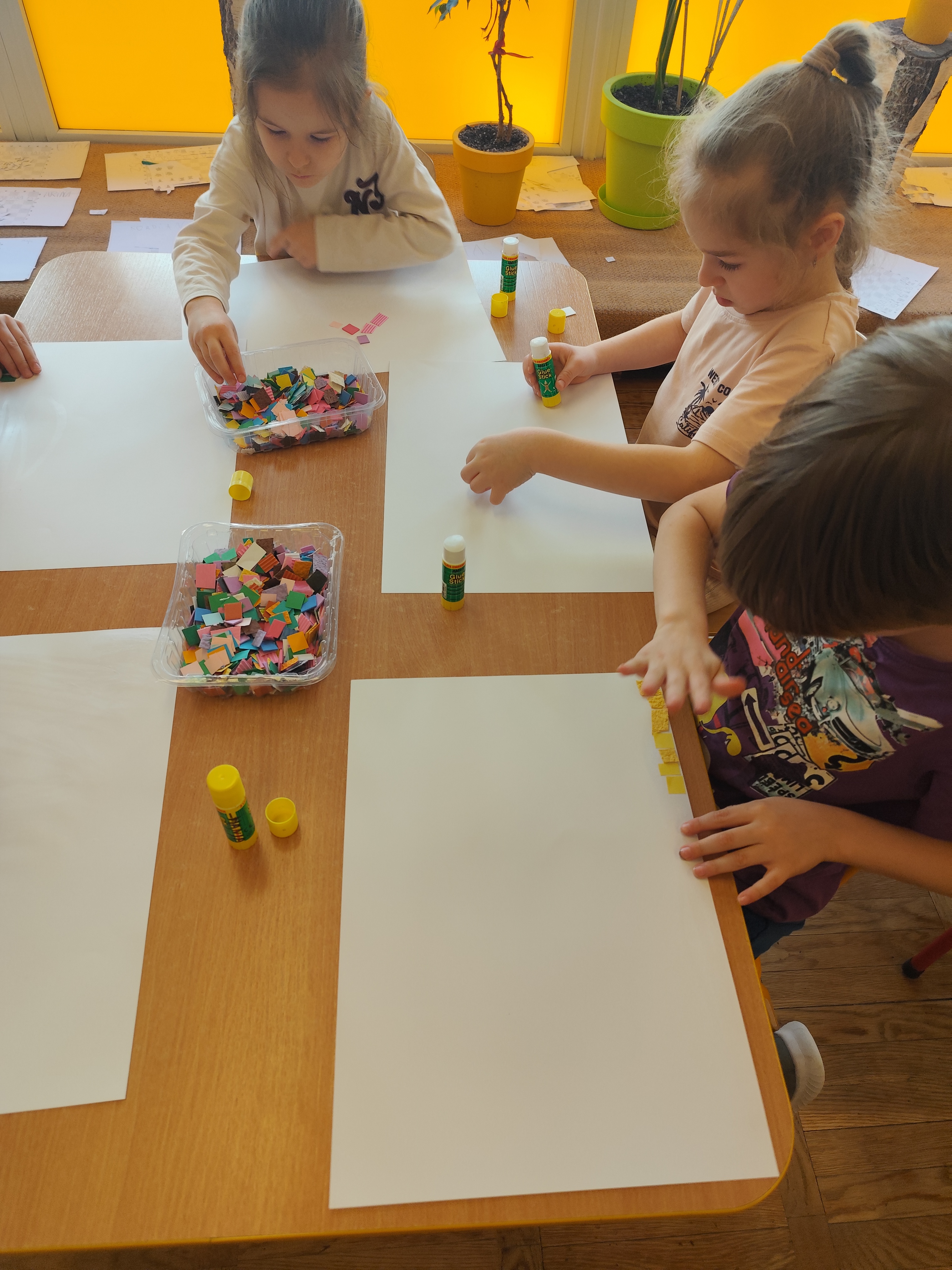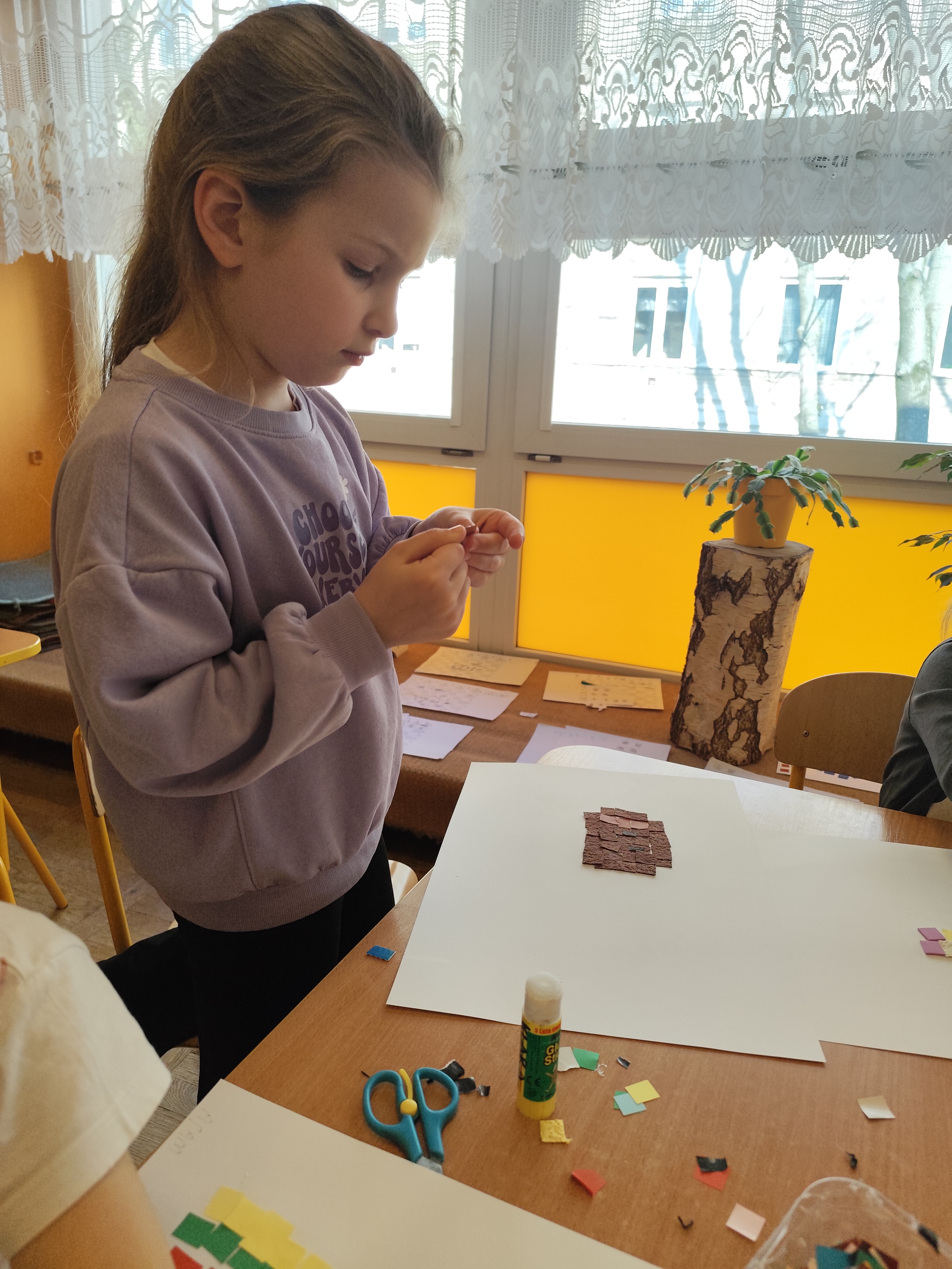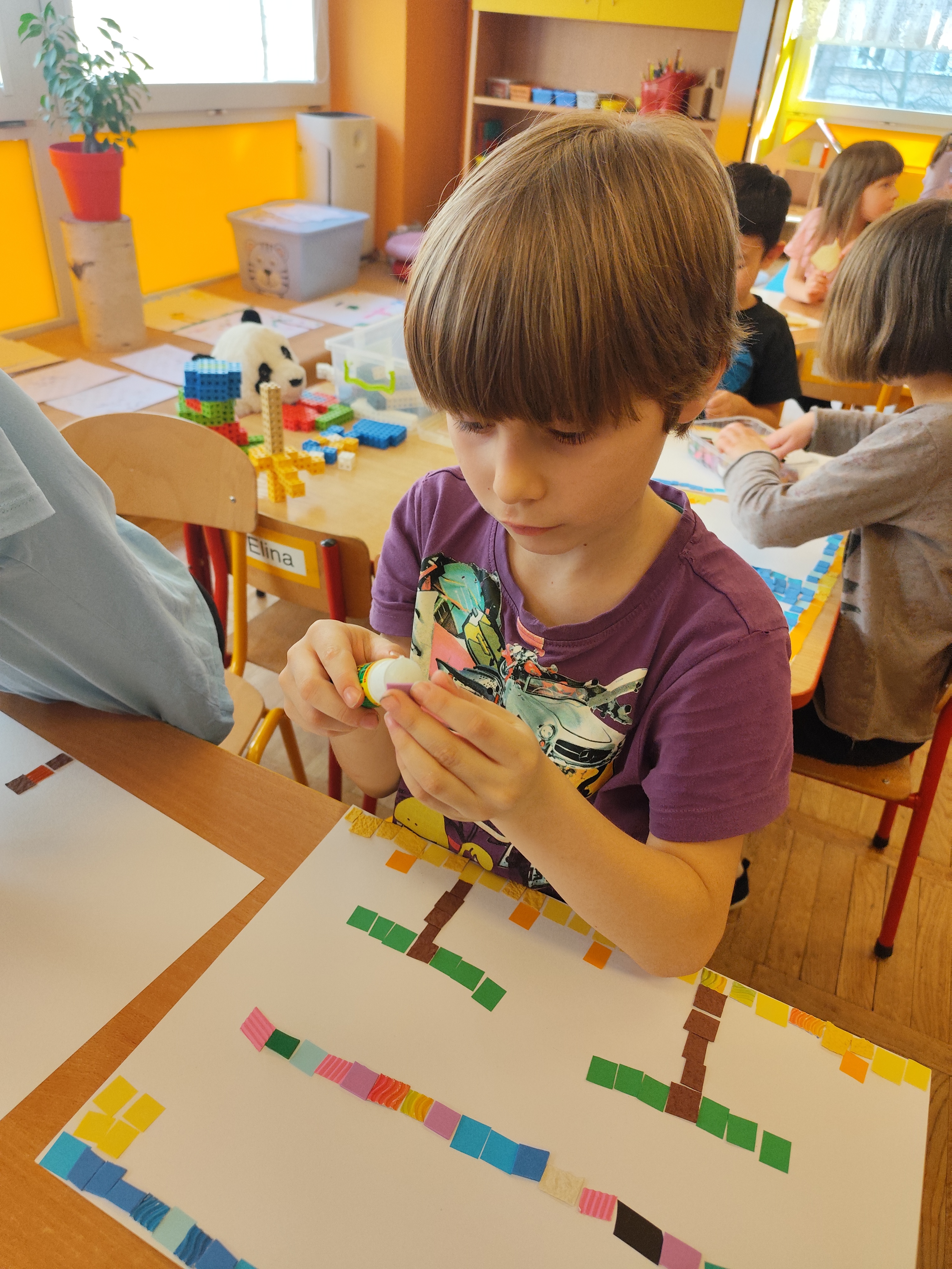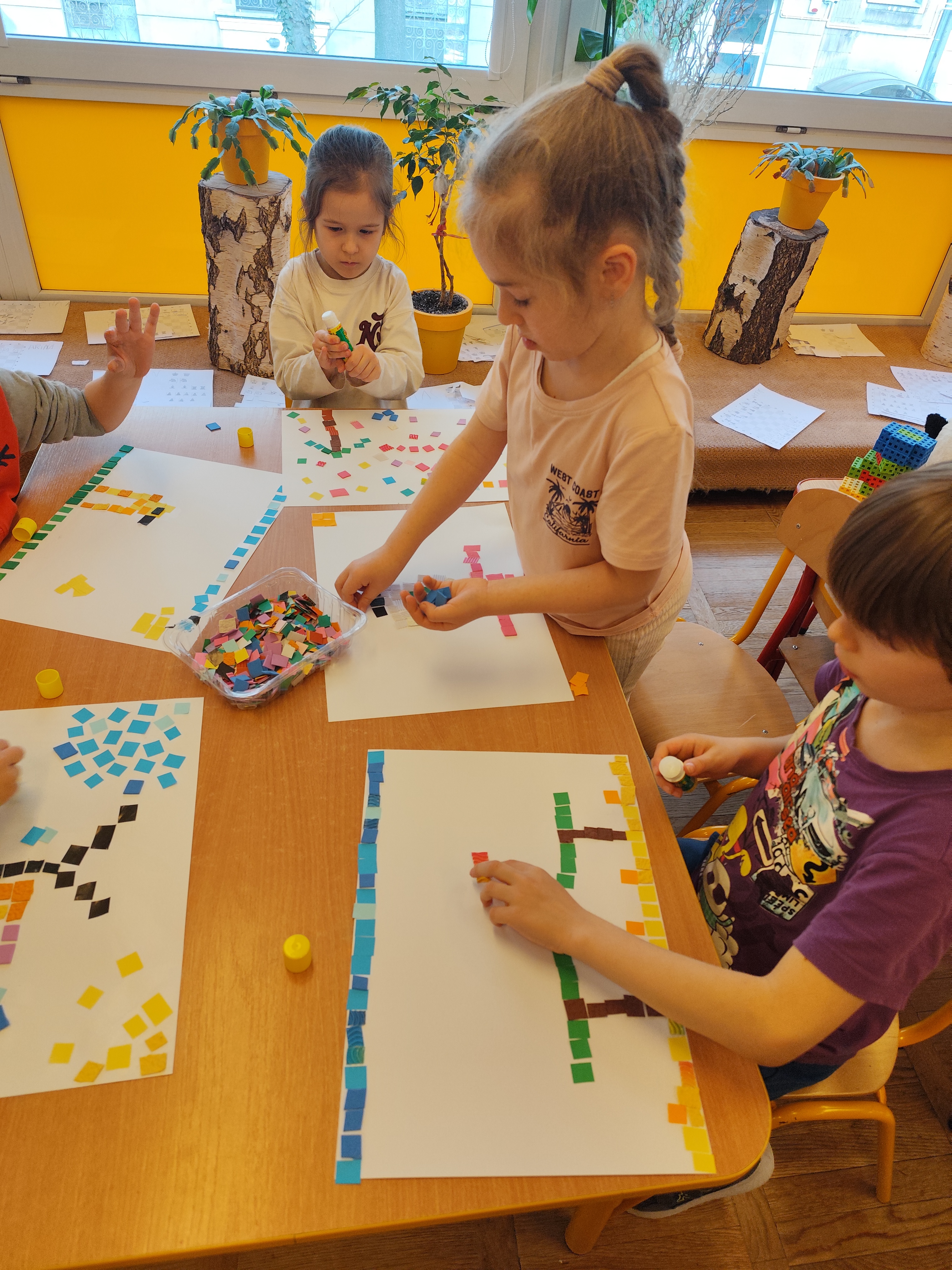 W ramach naszego projektu dzieci miały okazję stworzyć wyjątkowe, kolorowe mozaiki. Praca polegała na wyklejaniu obrazów z małych, papierowych elementów o różnych fakturach, co rozwijało kreatywność, wyobraźnię oraz zdolności manualne.