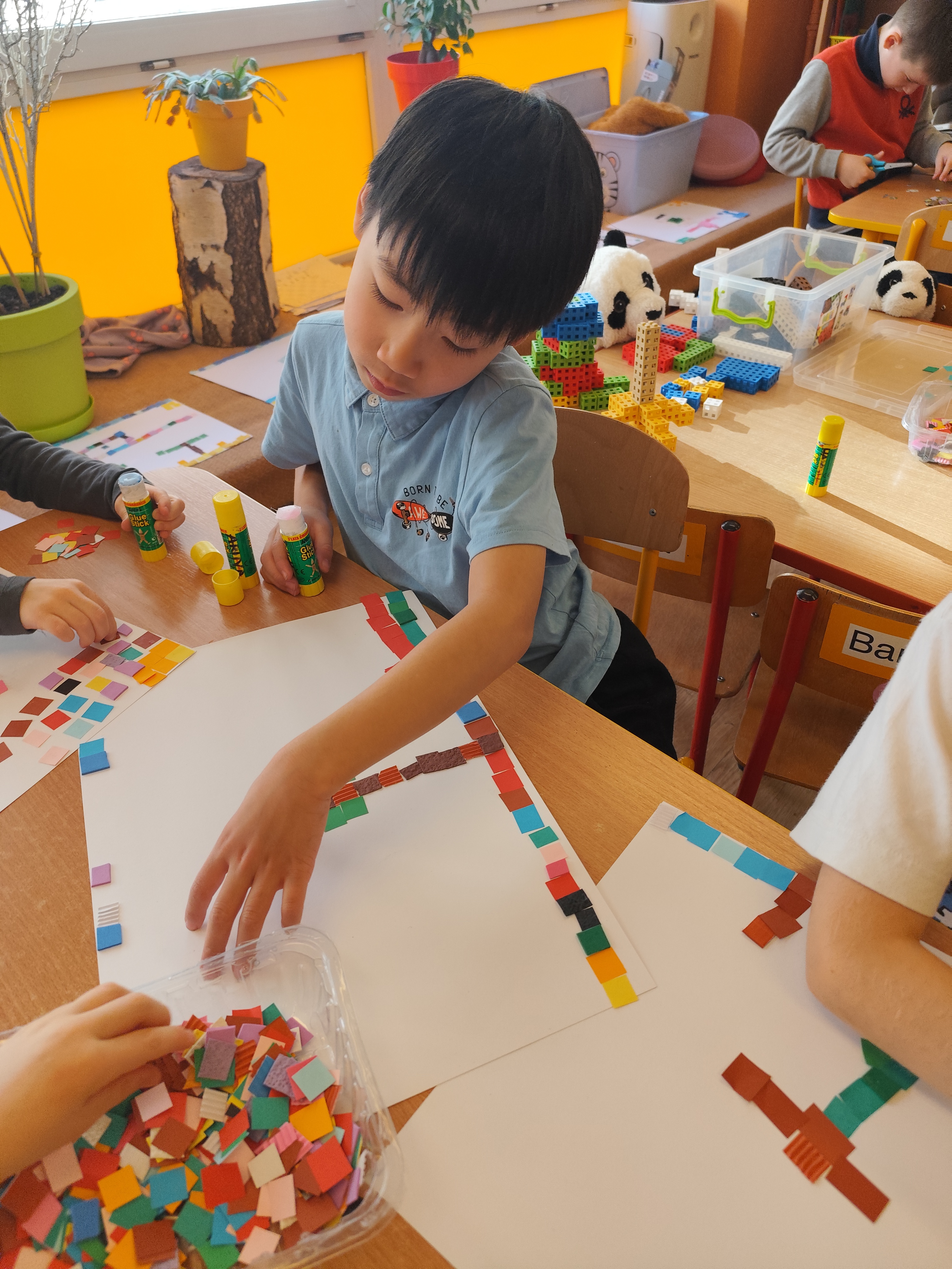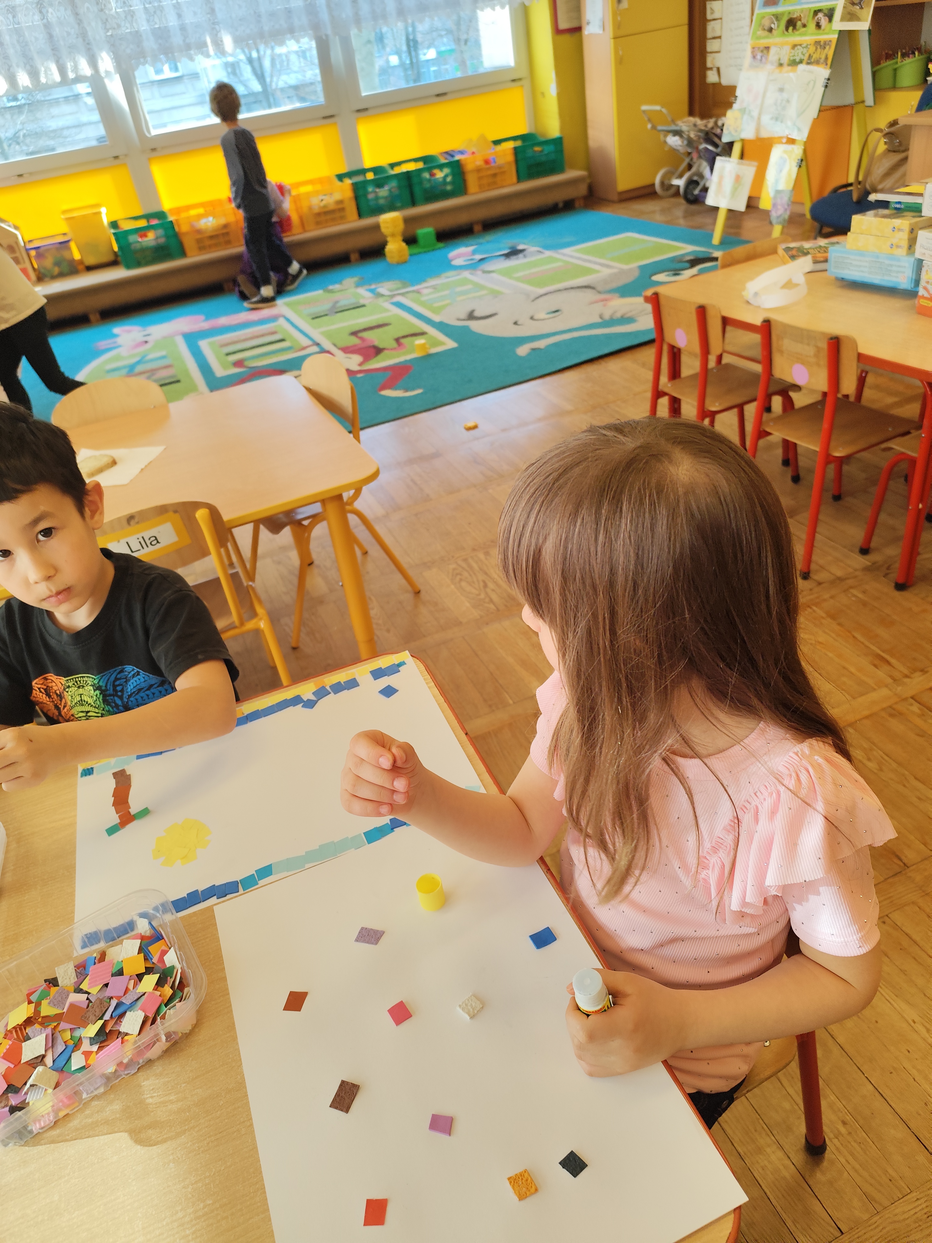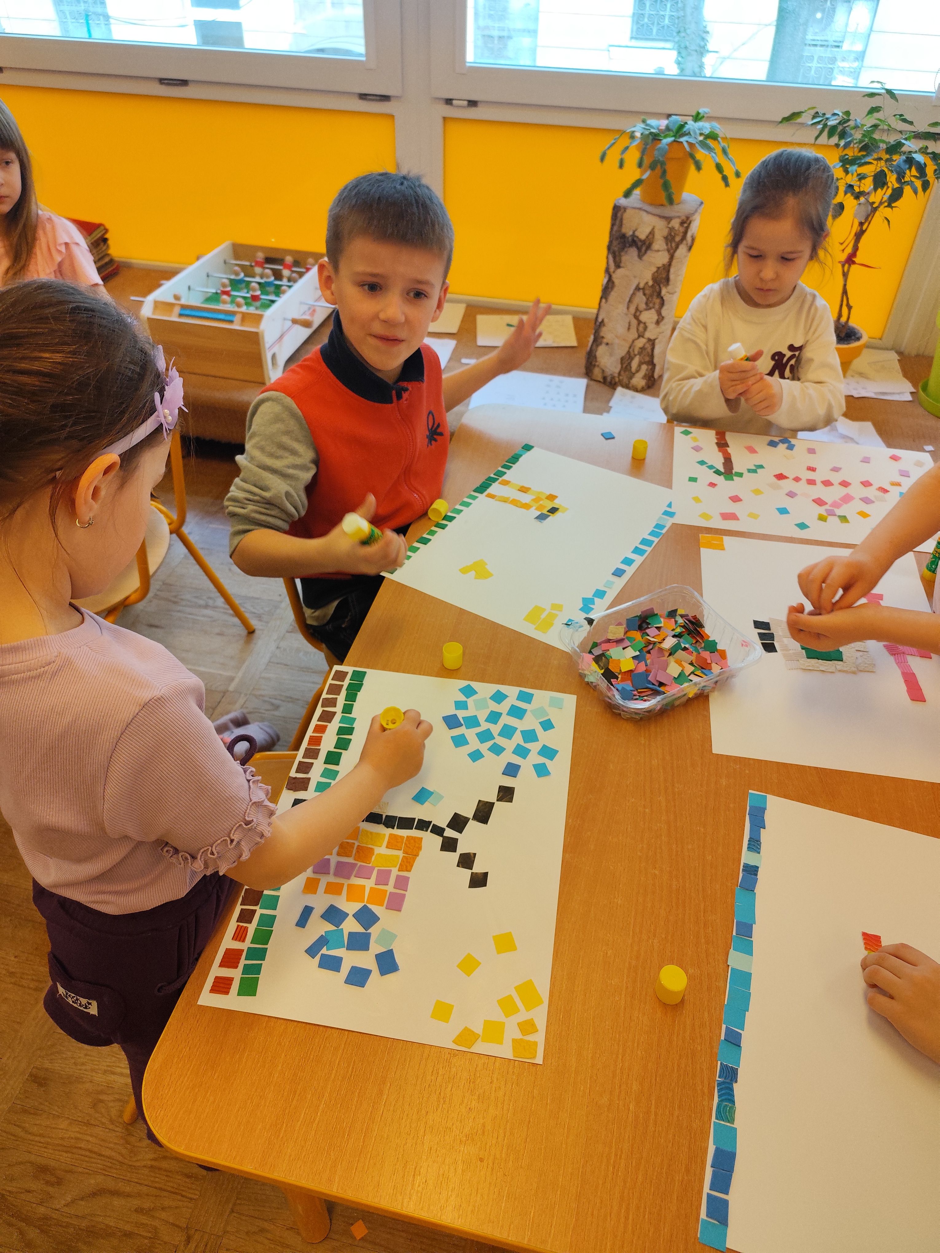 Podczas zajęć dzieci samodzielnie komponowały swoje prace. Każda mozaika jest niepowtarzalna i odzwierciedla indywidualne pomysły oraz wrażliwość małych artystów.