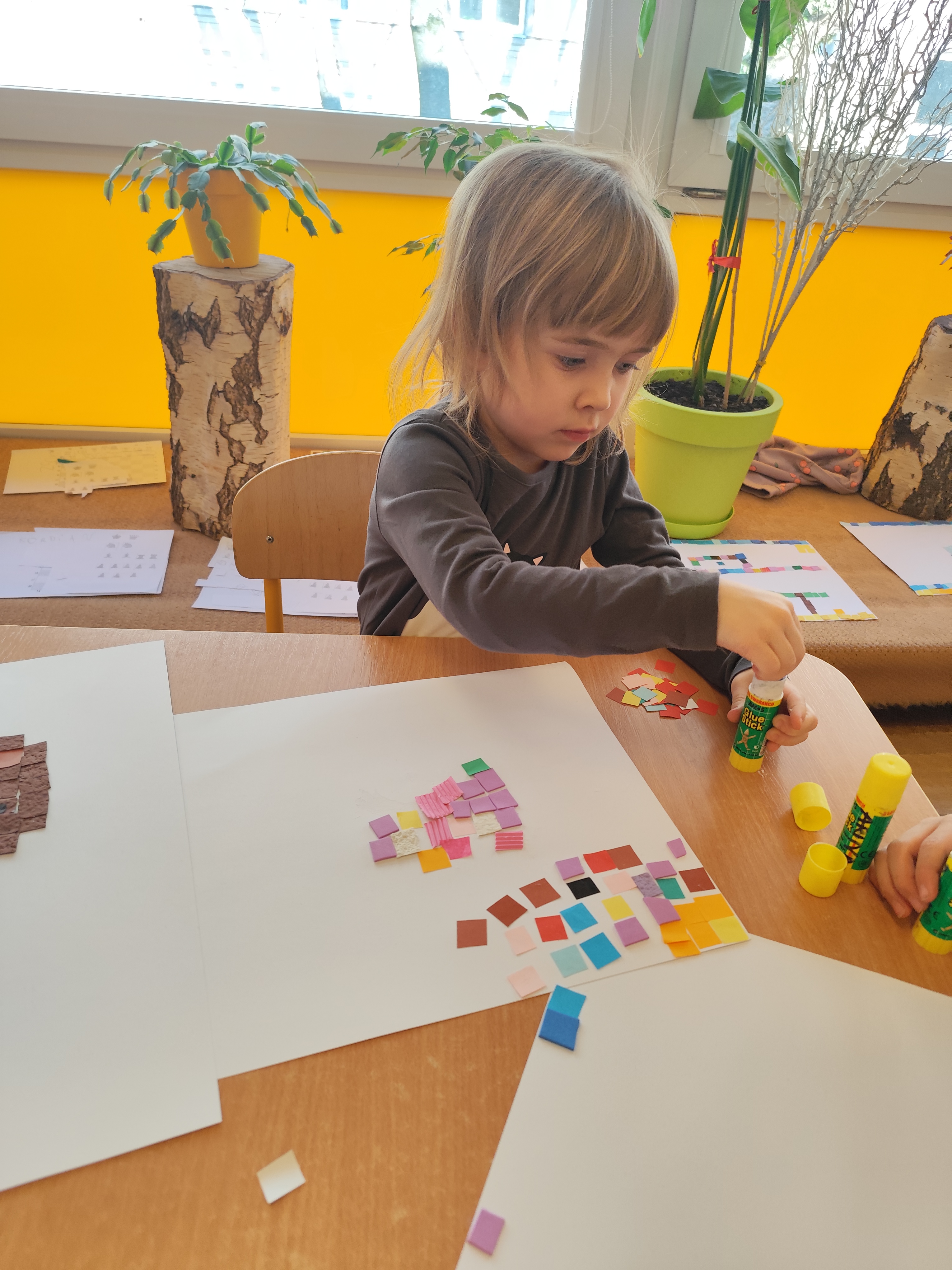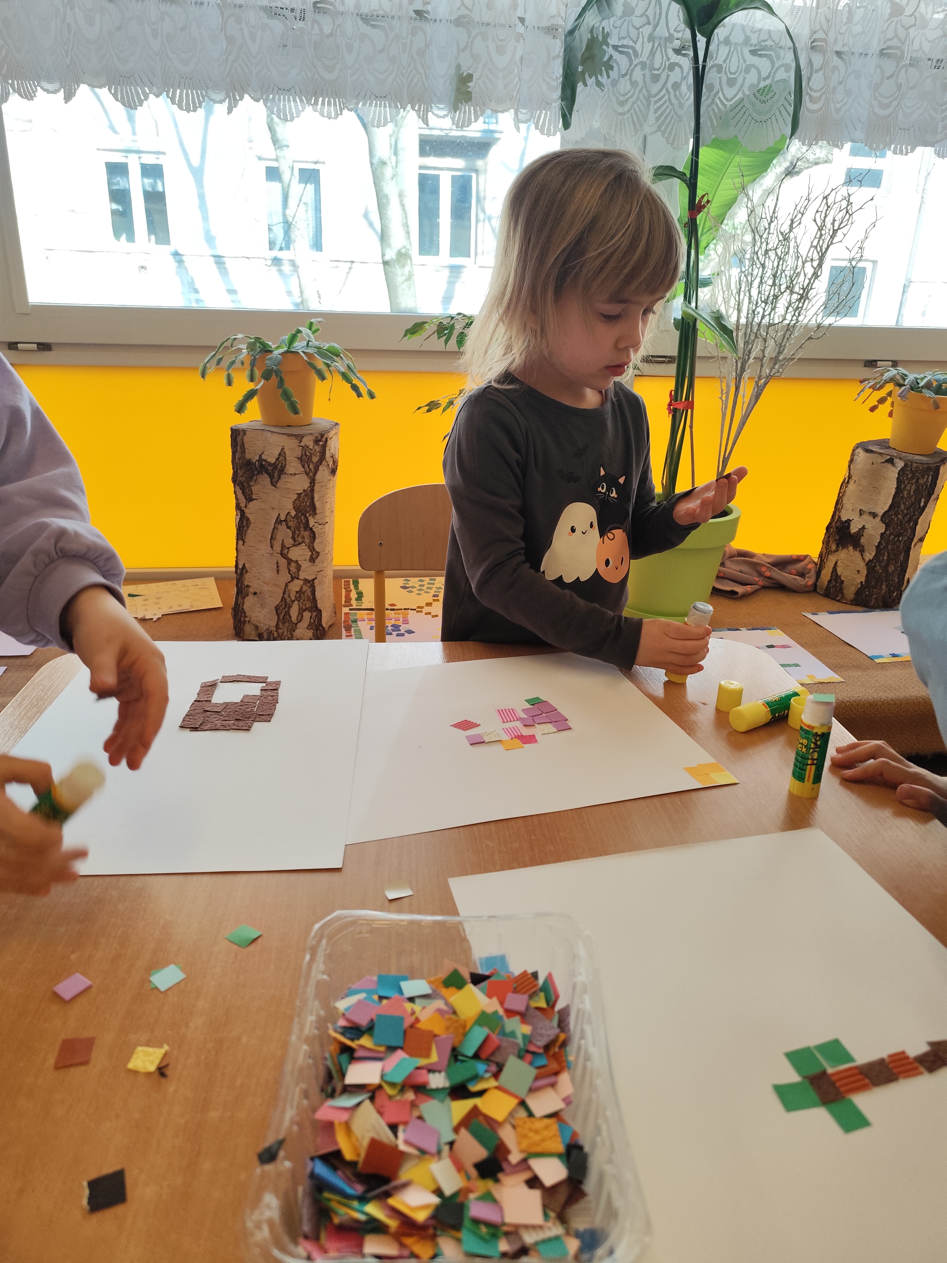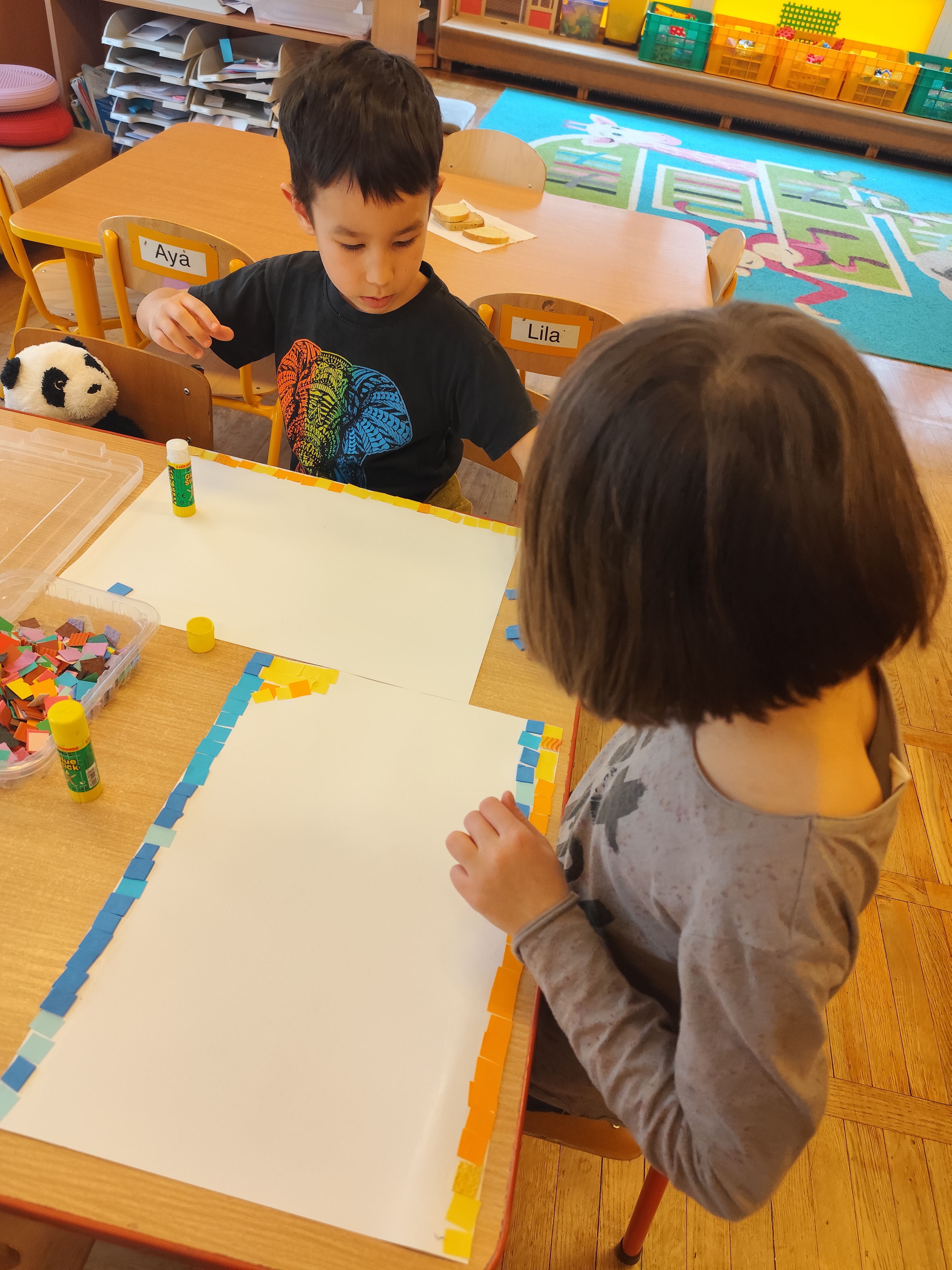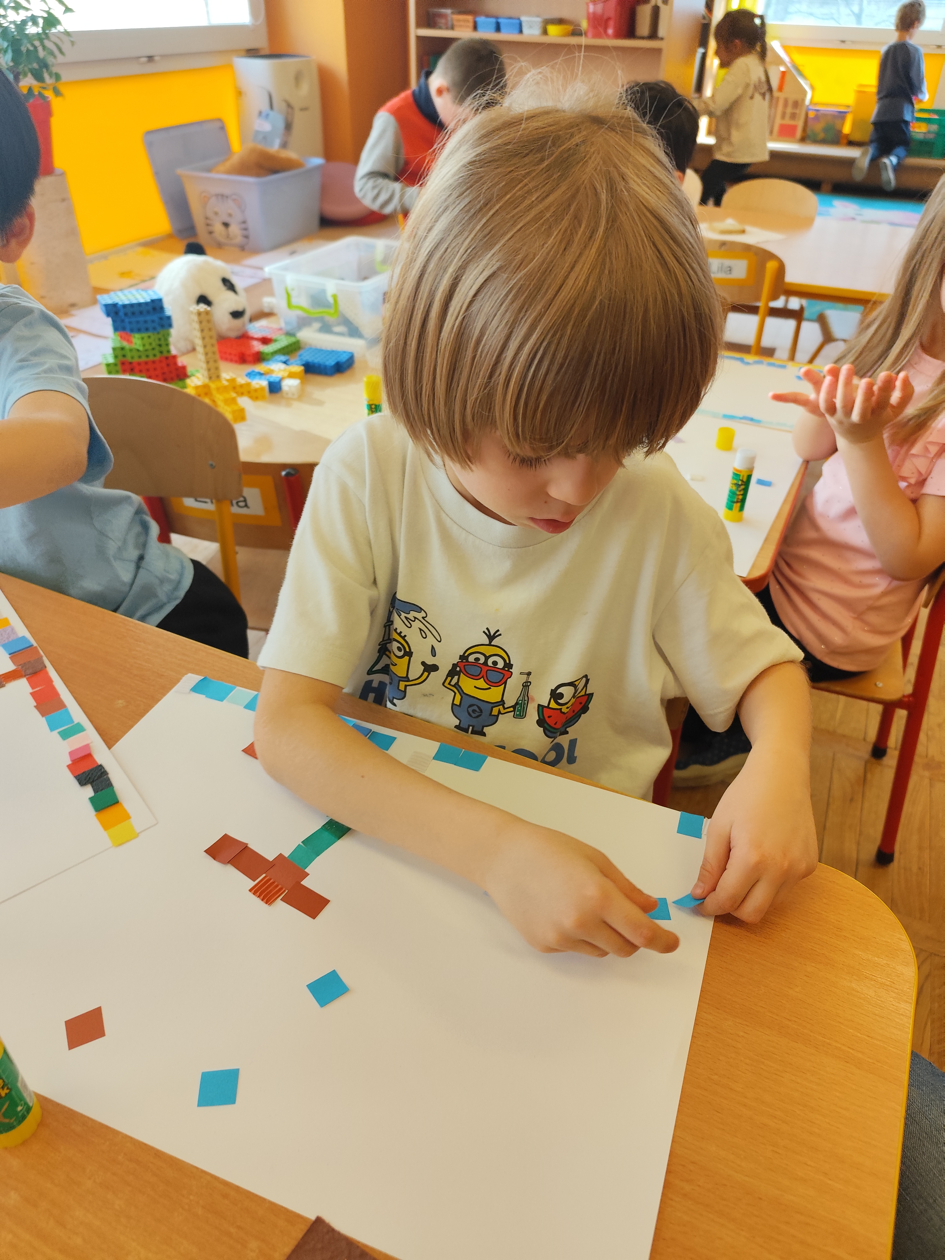 Podczas zajęć dzieci samodzielnie komponowały swoje prace. Każda mozaika jest niepowtarzalna i odzwierciedla indywidualne pomysły oraz wrażliwość małych artystów.