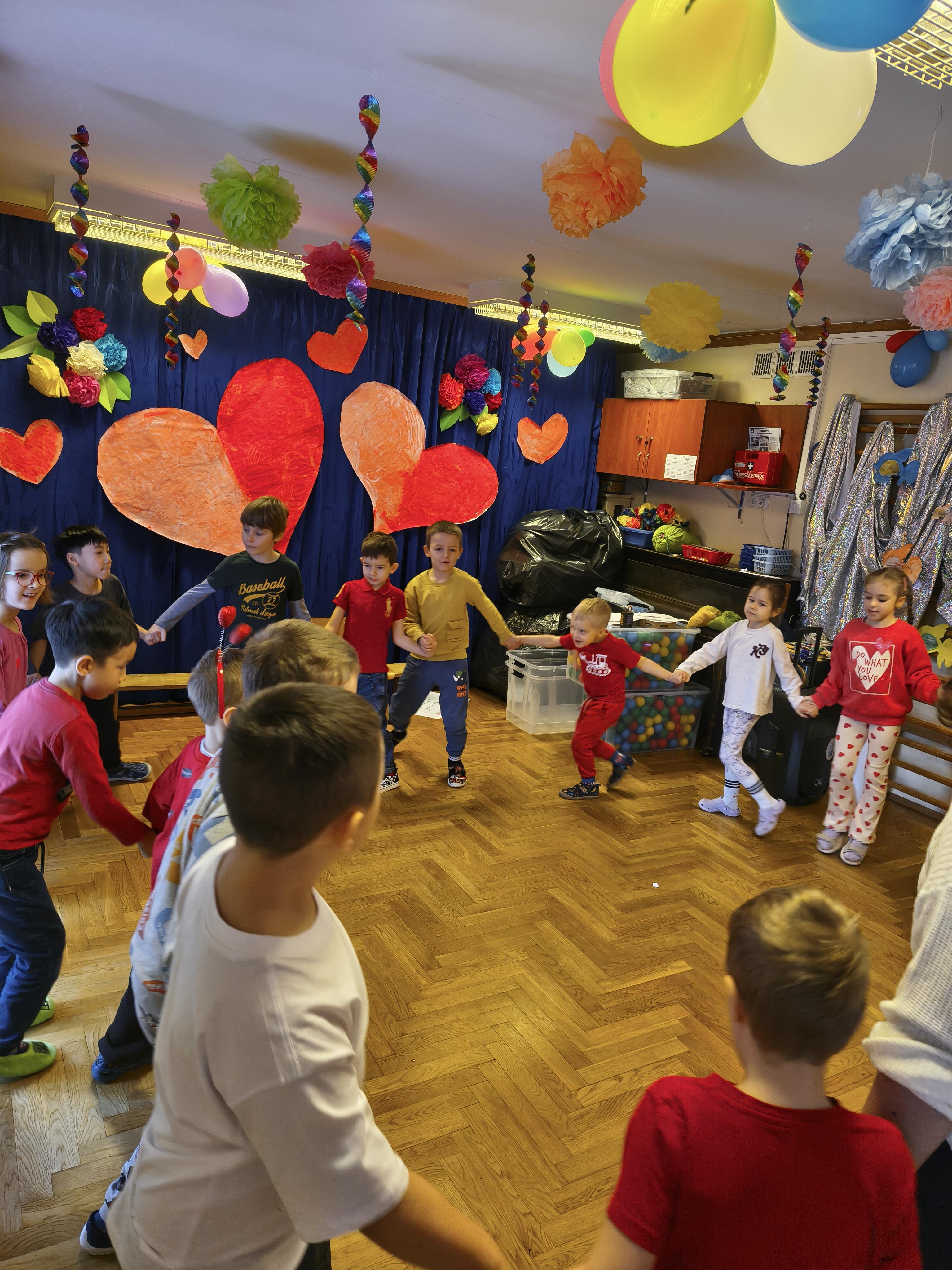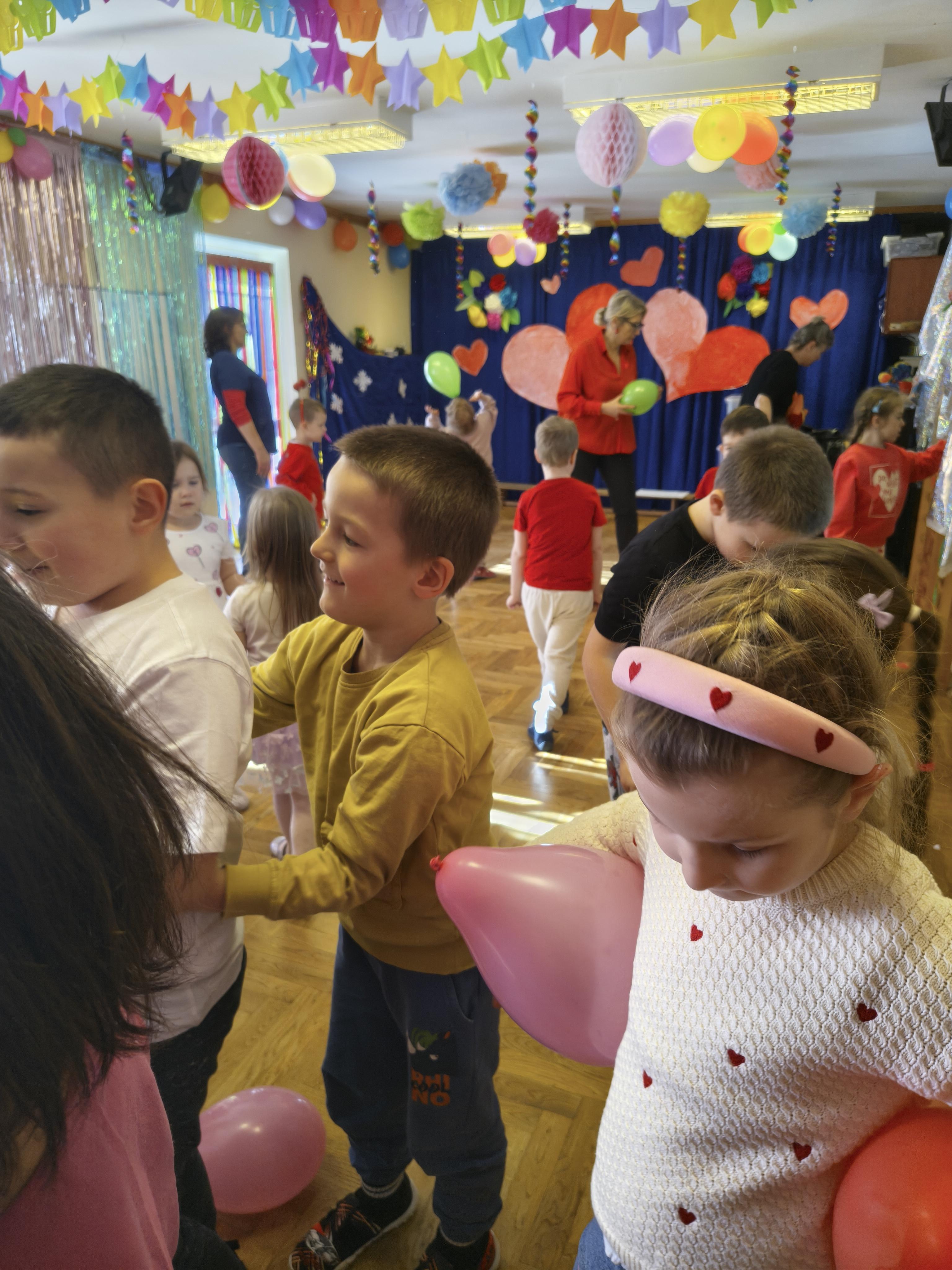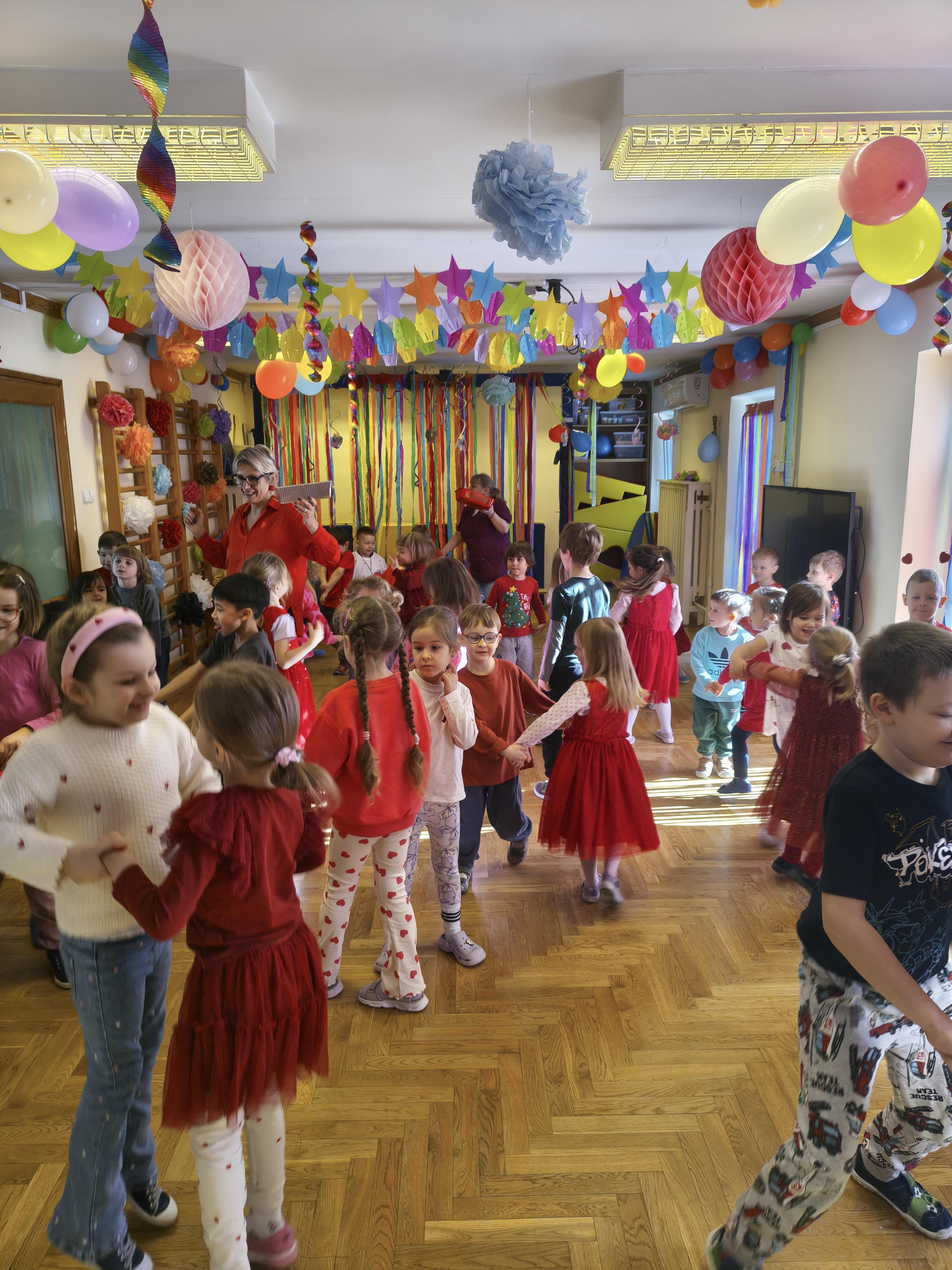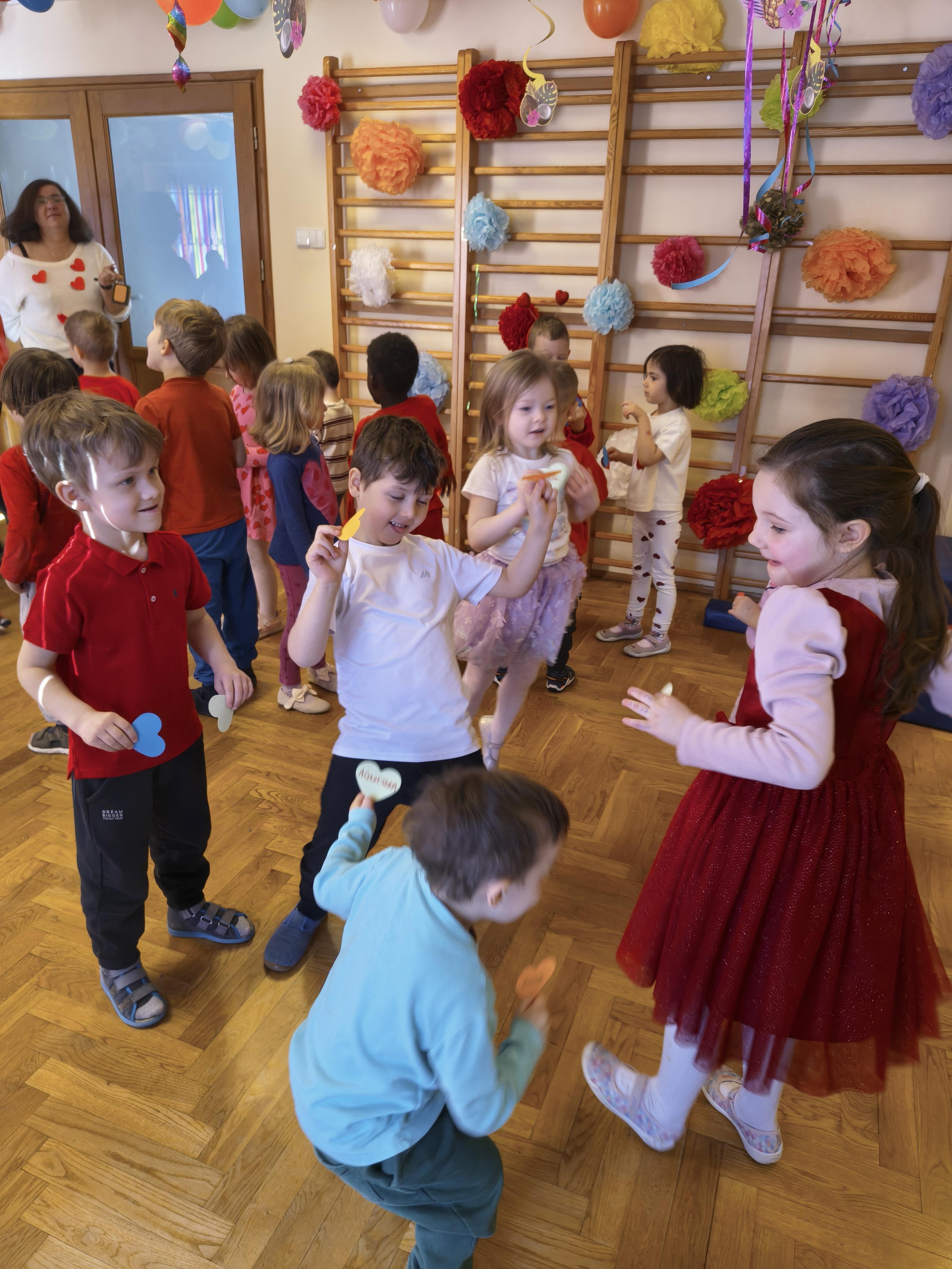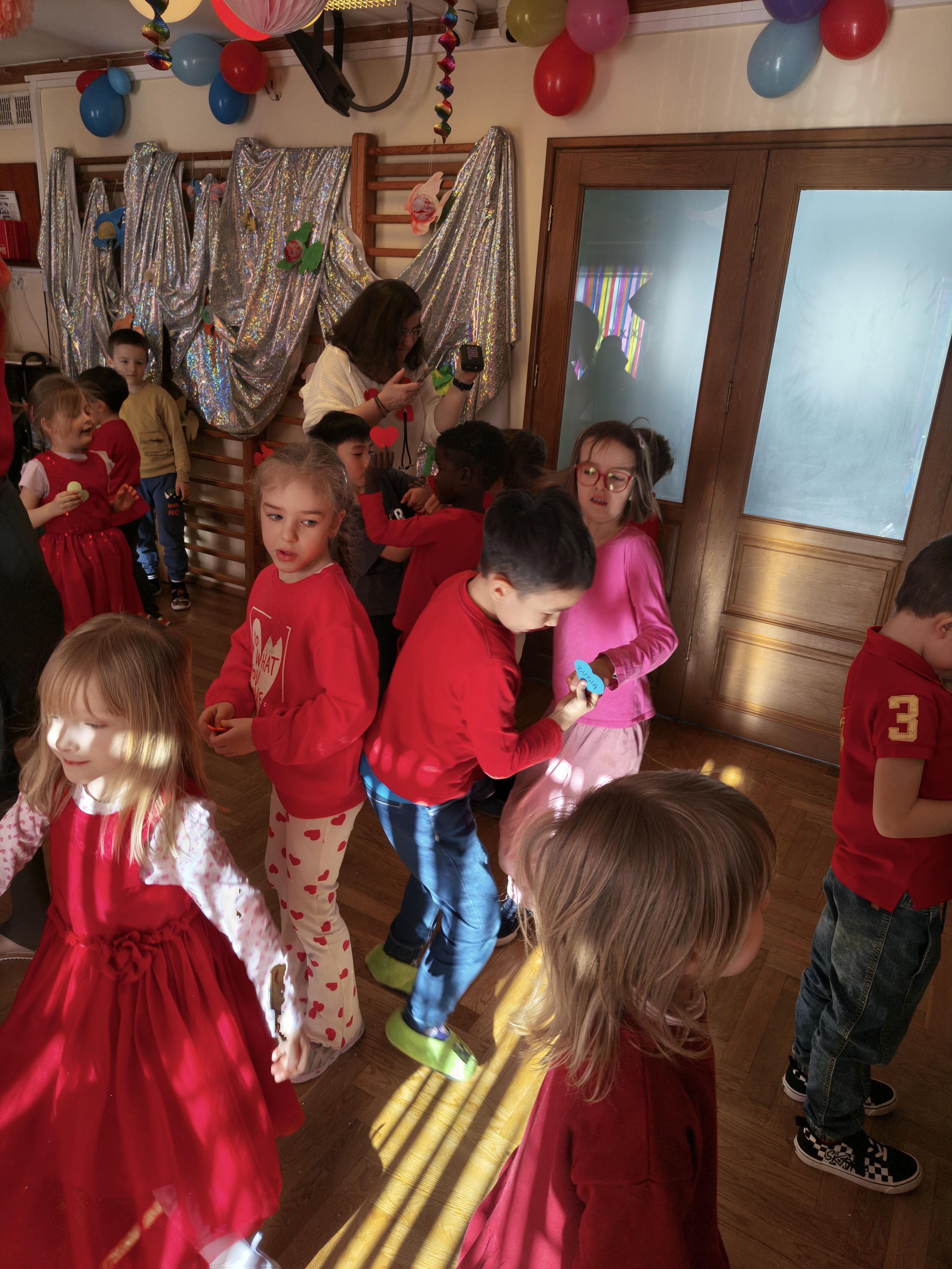 W poniedziałek 16 lutego dzieci spotkały się pięknie ubrane, w sali gimnastycznej, by wspólnie świętować. Walentynkowa zabawa była doskonałą okazją do budowania relacji, empatii i radości. Było wręczanie kartek z poczty walentynkowej, poszukiwanie przyjaciół, tańce z balonami, kolorowanie dywanu miłości, chusta animacyjna, Belgijka i losowanie imion przyszłych sympatii. Nie brakowało dobrej muzyki i uśmiechniętych buziaków!