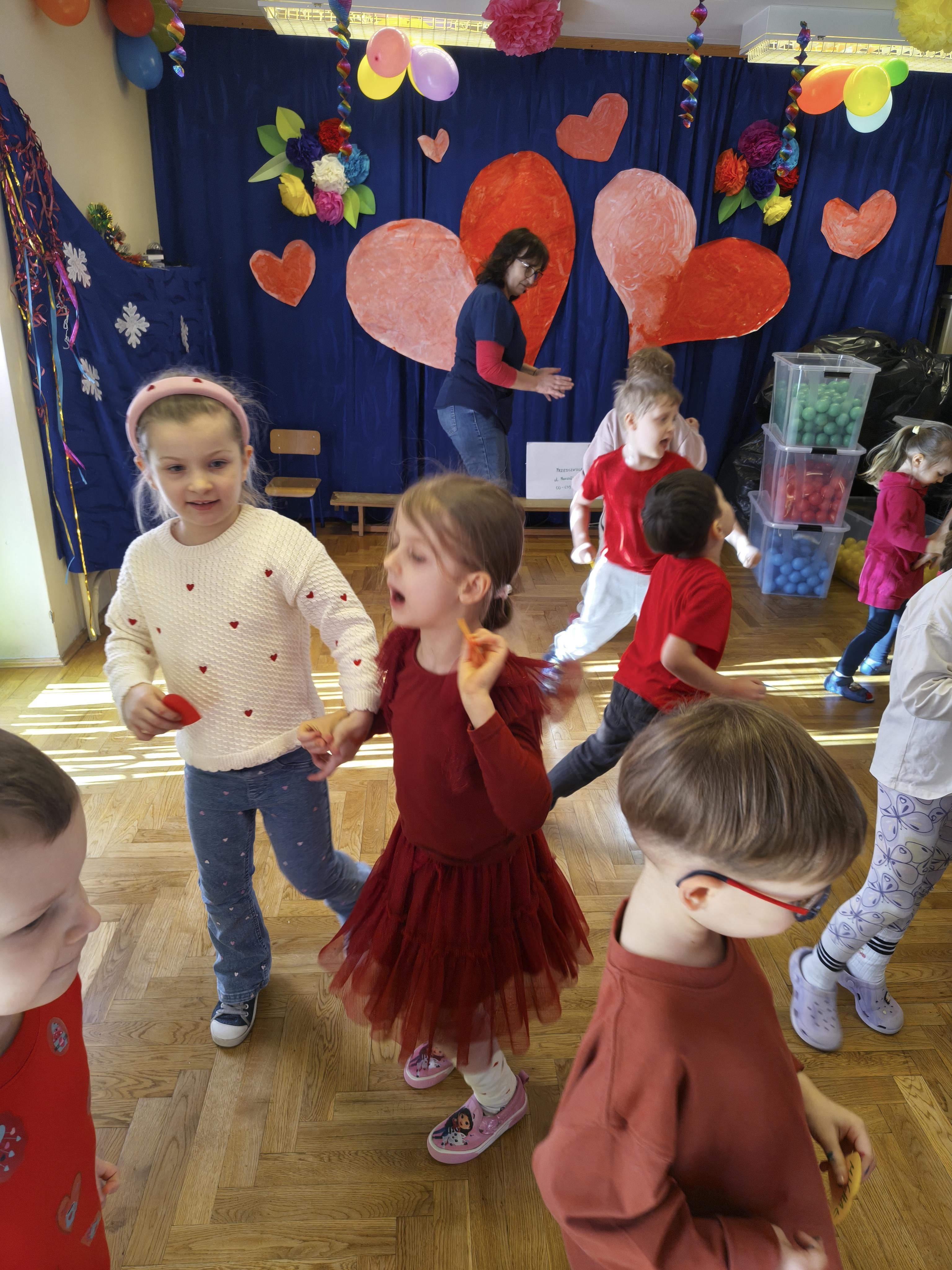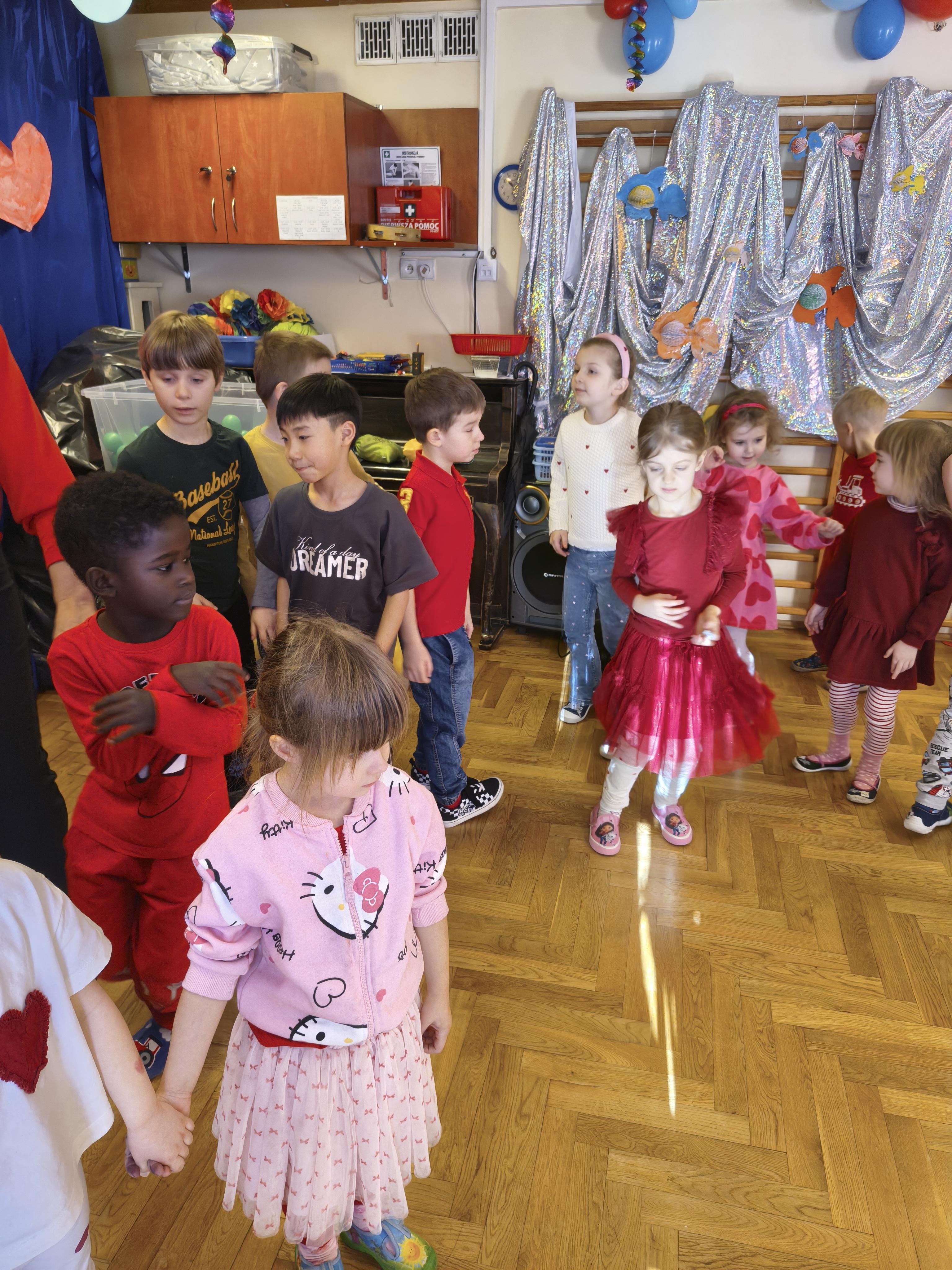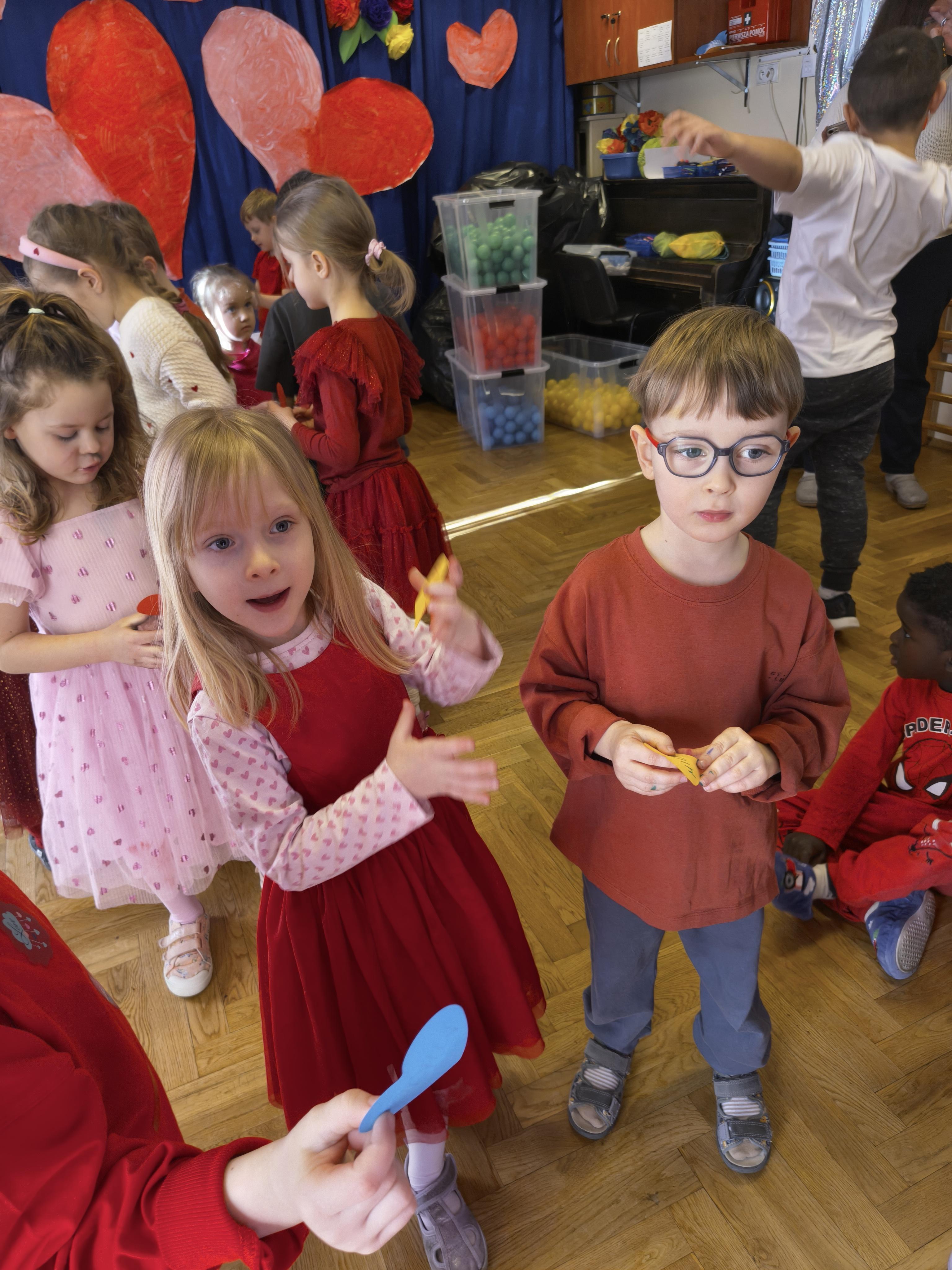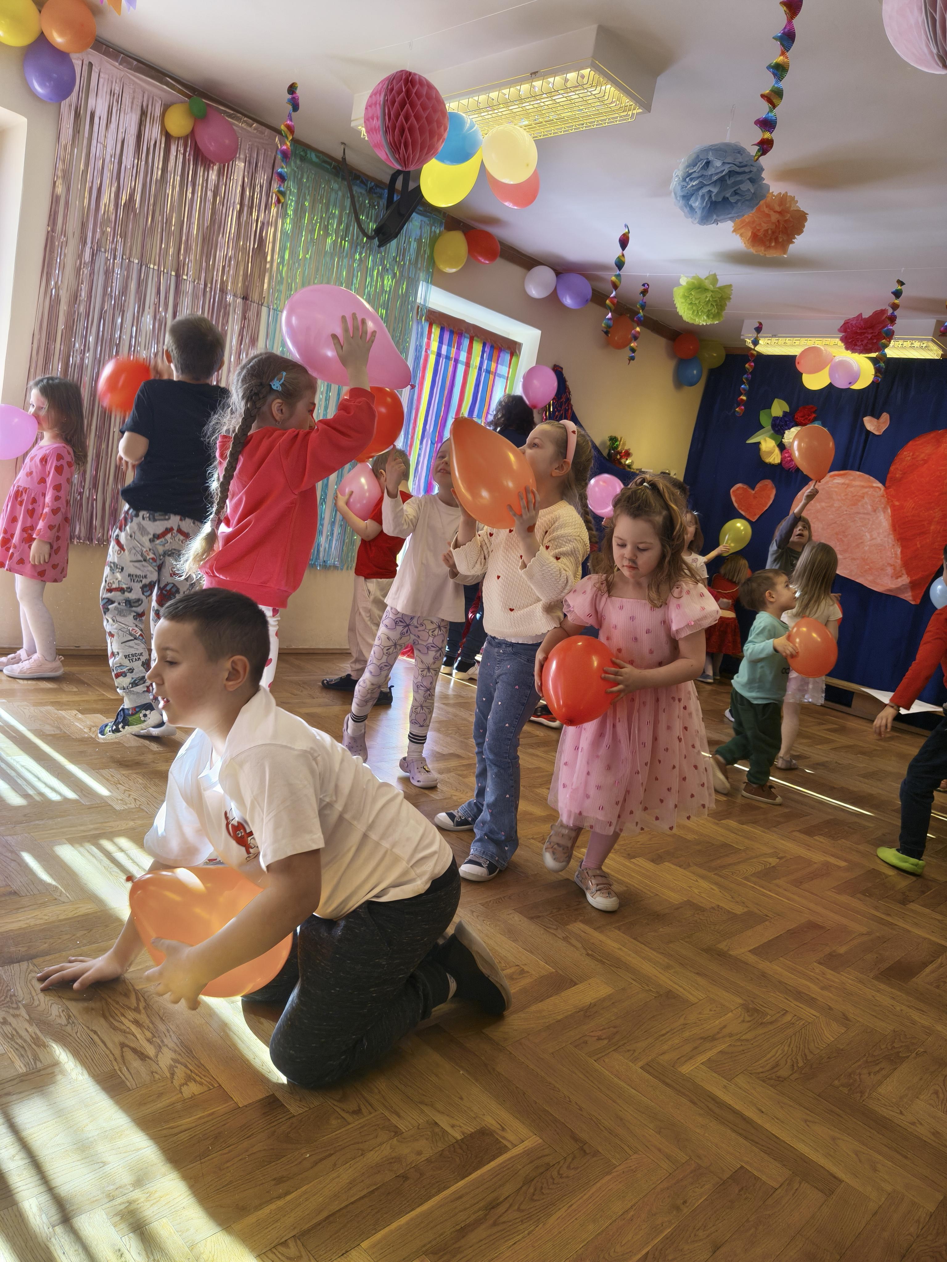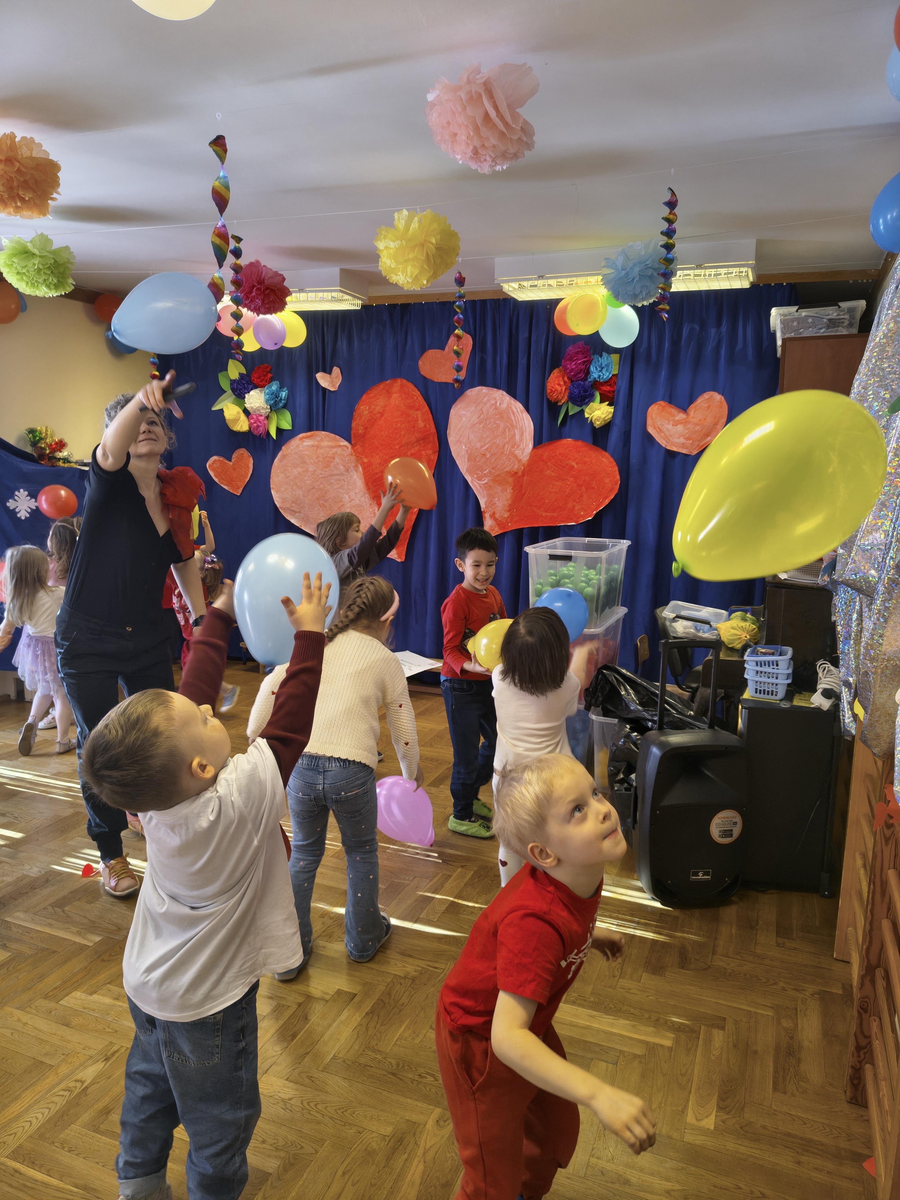 W poniedziałek 16 lutego dzieci spotkały się pięknie ubrane, w sali gimnastycznej, by wspólnie świętować. Walentynkowa zabawa była doskonałą okazją do budowania relacji, empatii i radości. Było wręczanie kartek z poczty walentynkowej, poszukiwanie przyjaciół, tańce z balonami, kolorowanie dywanu miłości, chusta animacyjna, Belgijka i losowanie imion przyszłych sympatii. Nie brakowało dobrej muzyki i uśmiechniętych buziaków!