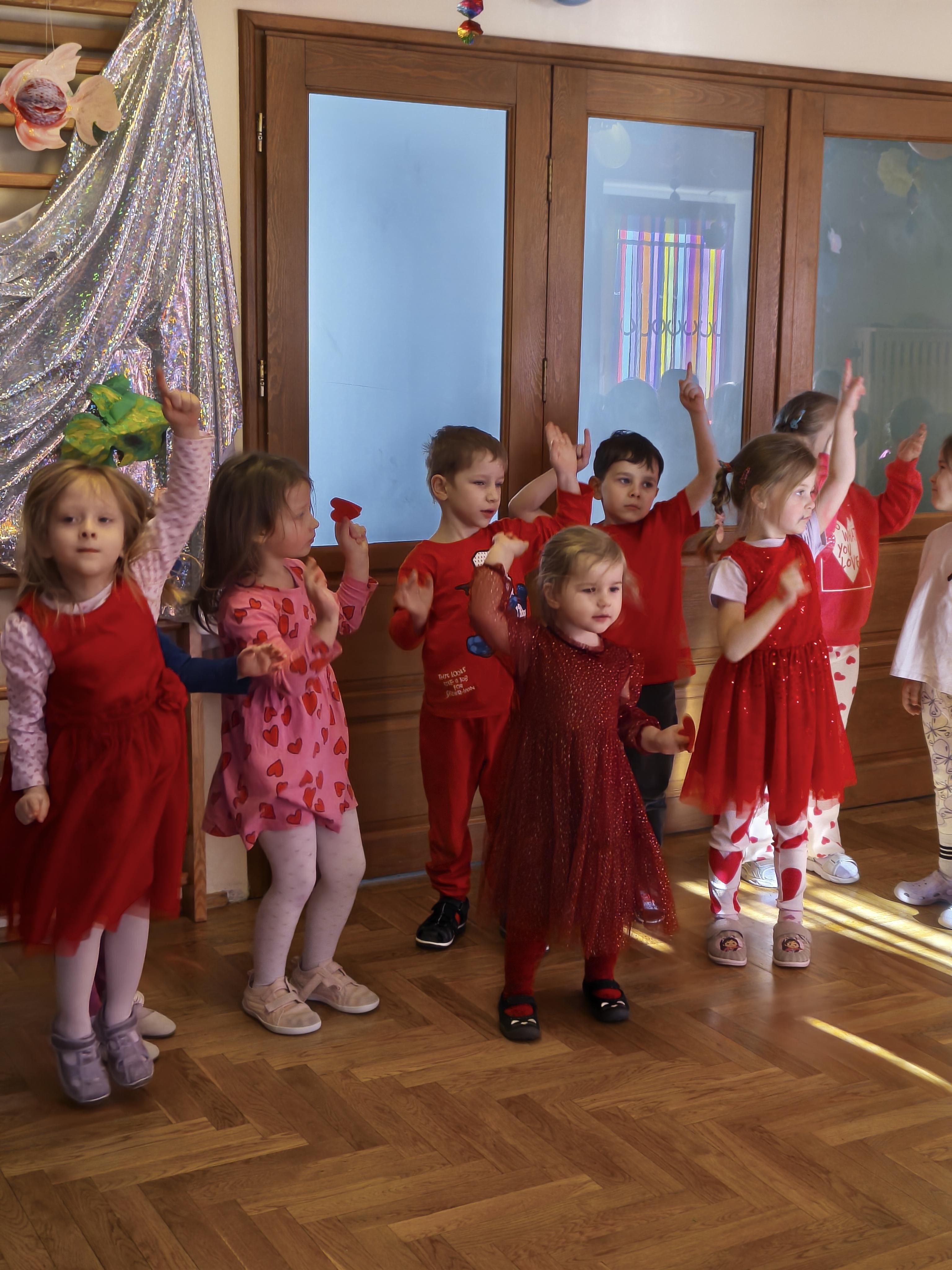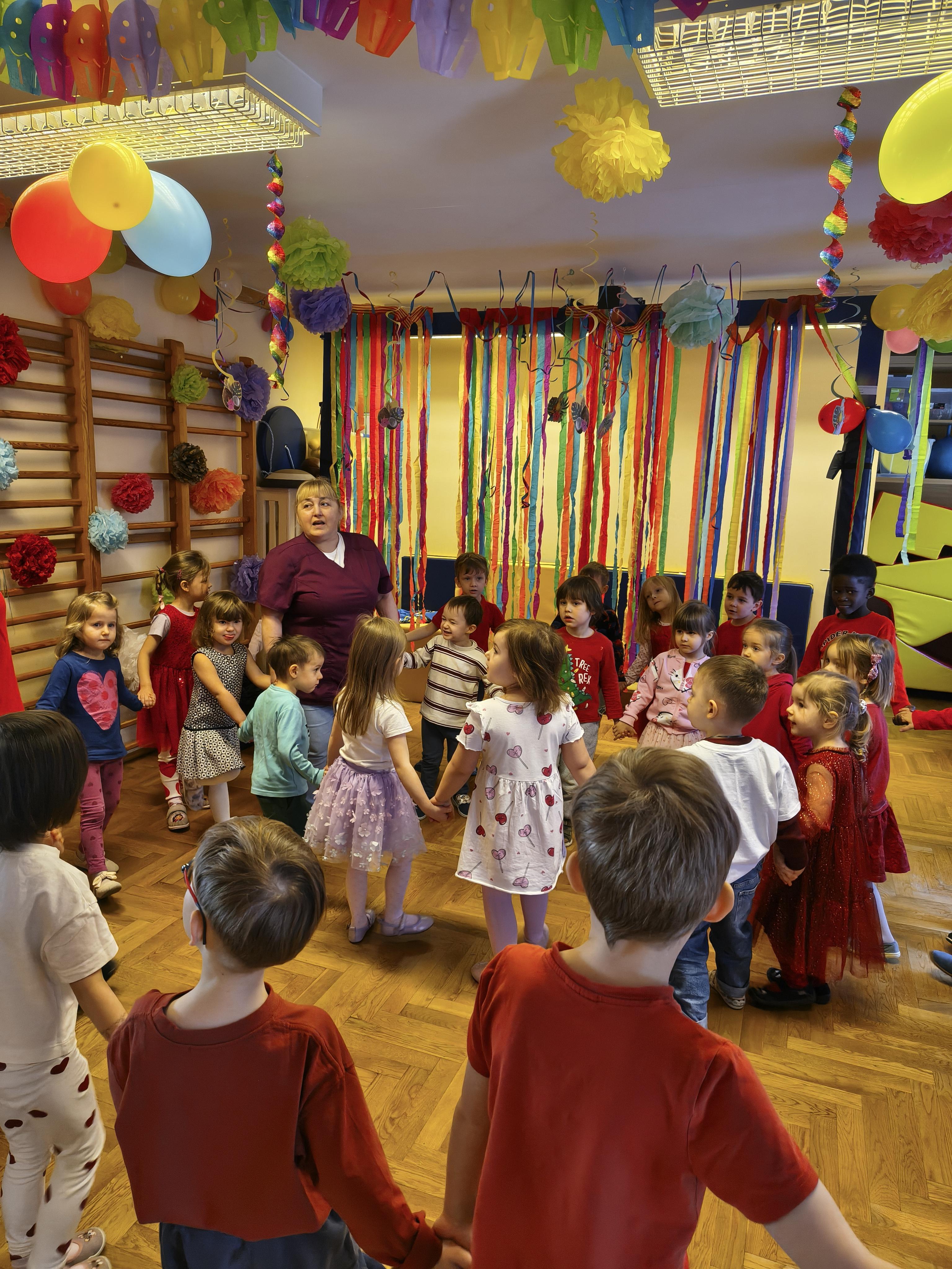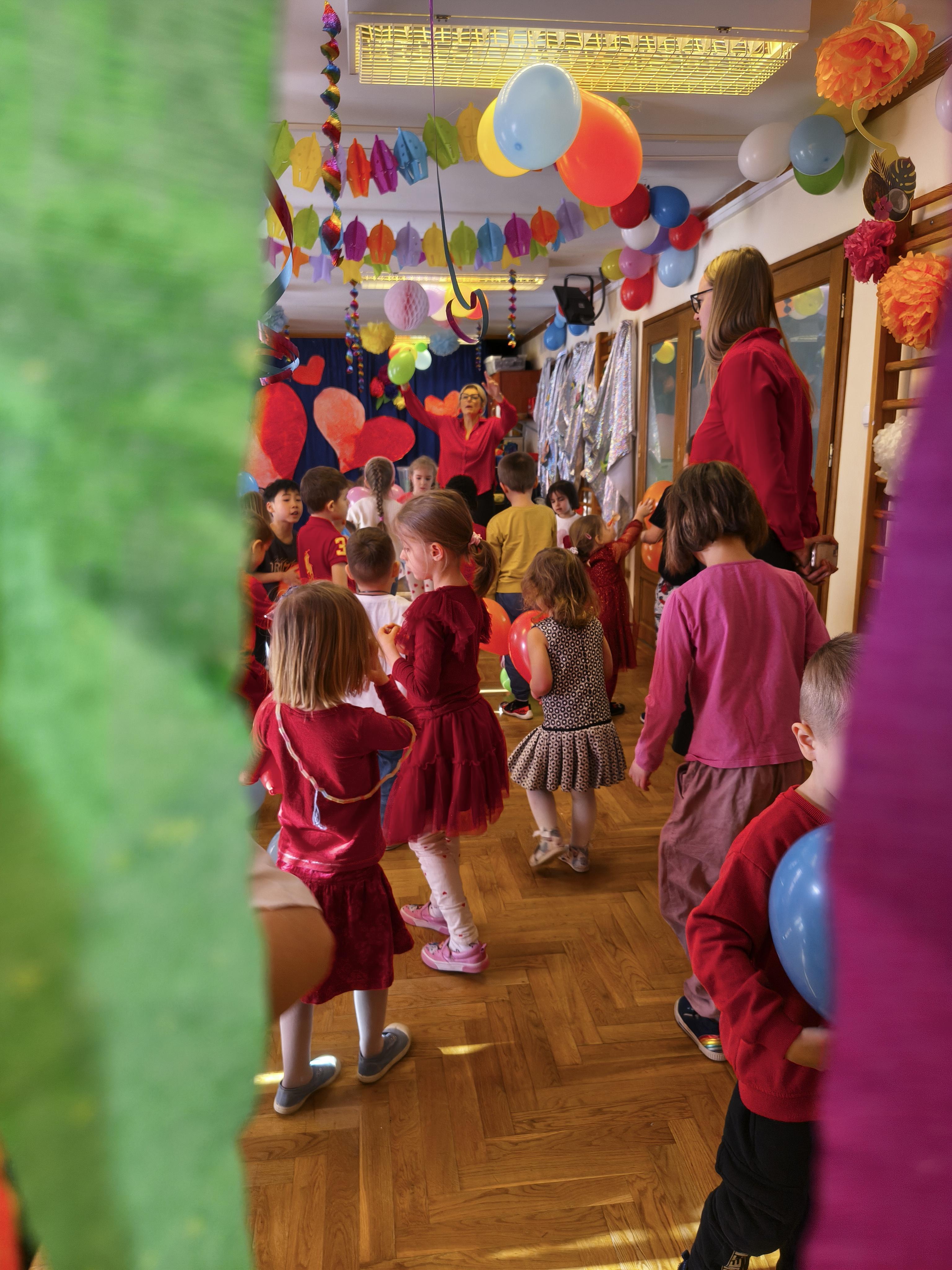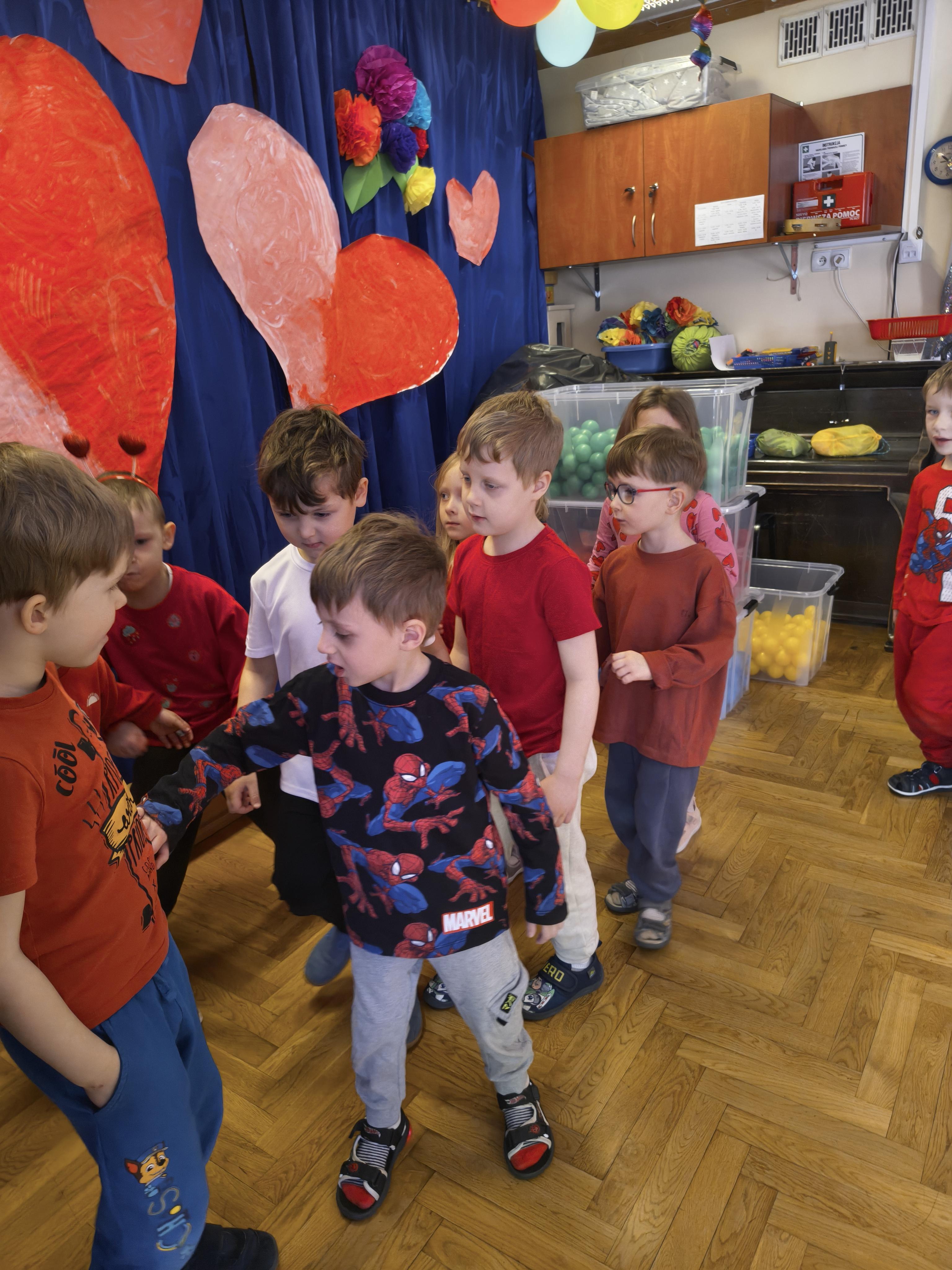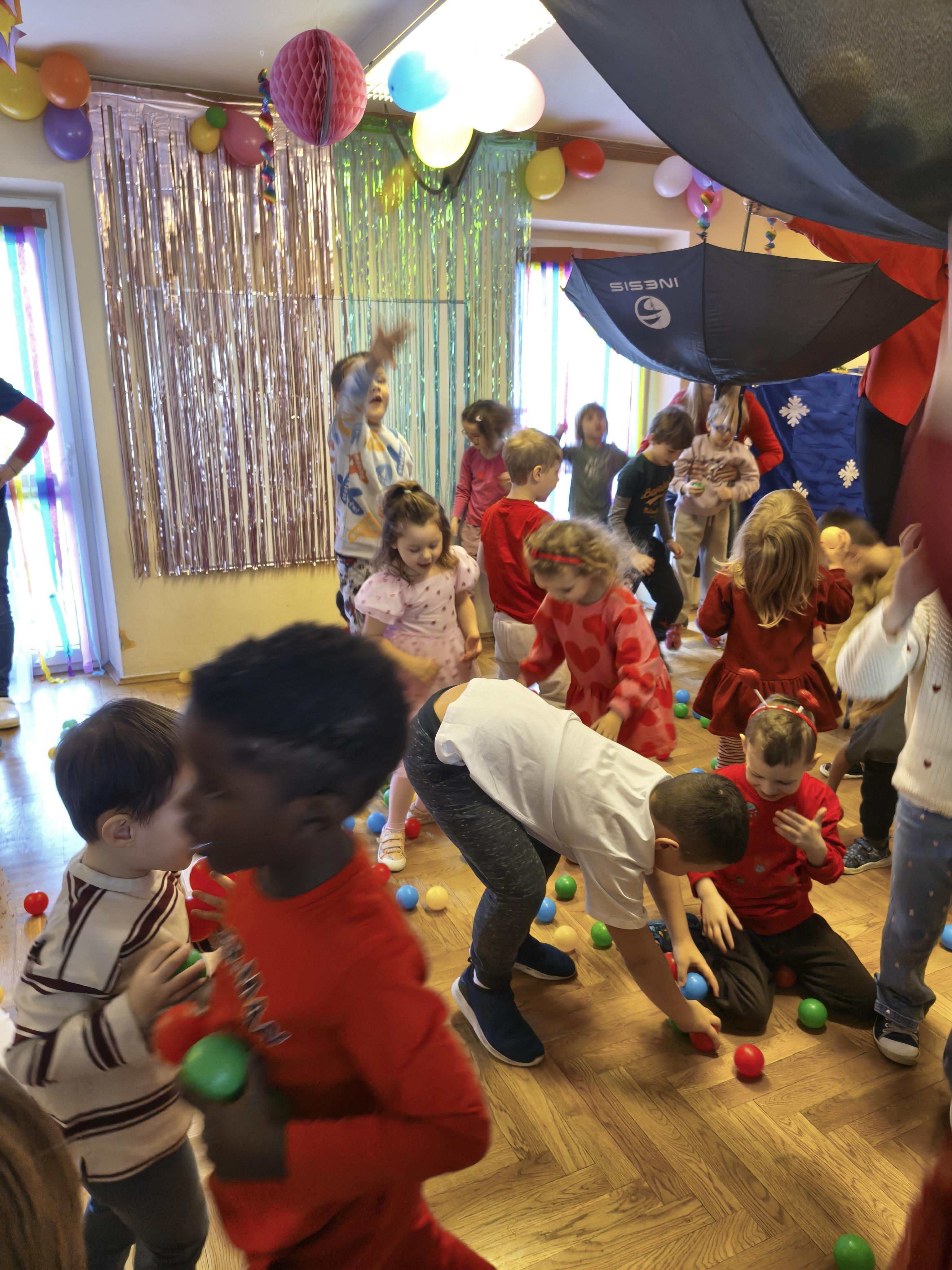 W poniedziałek 16 lutego dzieci spotkały się pięknie ubrane, w sali gimnastycznej, by wspólnie świętować. Walentynkowa zabawa była doskonałą okazją do budowania relacji, empatii i radości. Było wręczanie kartek z poczty walentynkowej, poszukiwanie przyjaciół, tańce z balonami, kolorowanie dywanu miłości, chusta animacyjna, Belgijka i losowanie imion przyszłych sympatii. Nie brakowało dobrej muzyki i uśmiechniętych buziaków!
