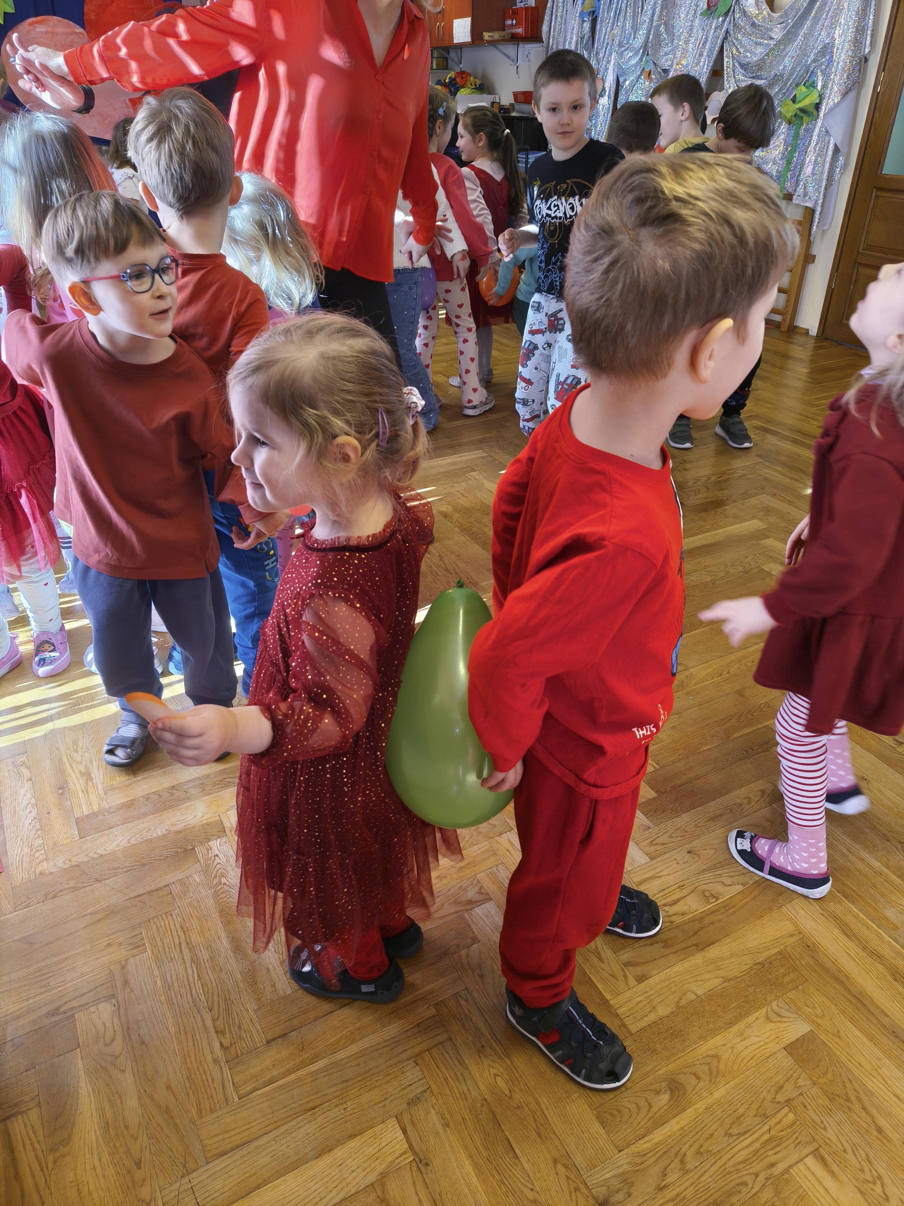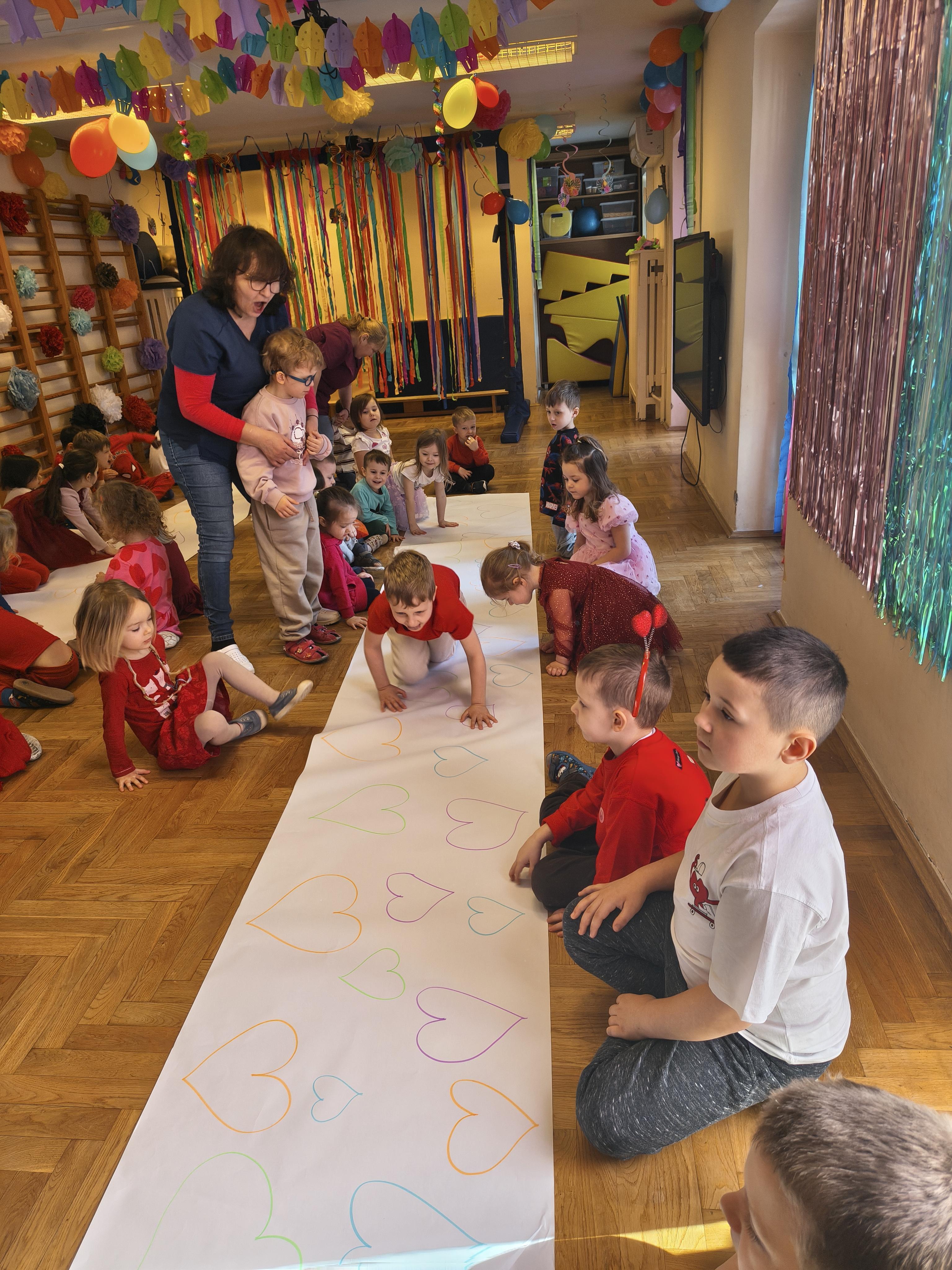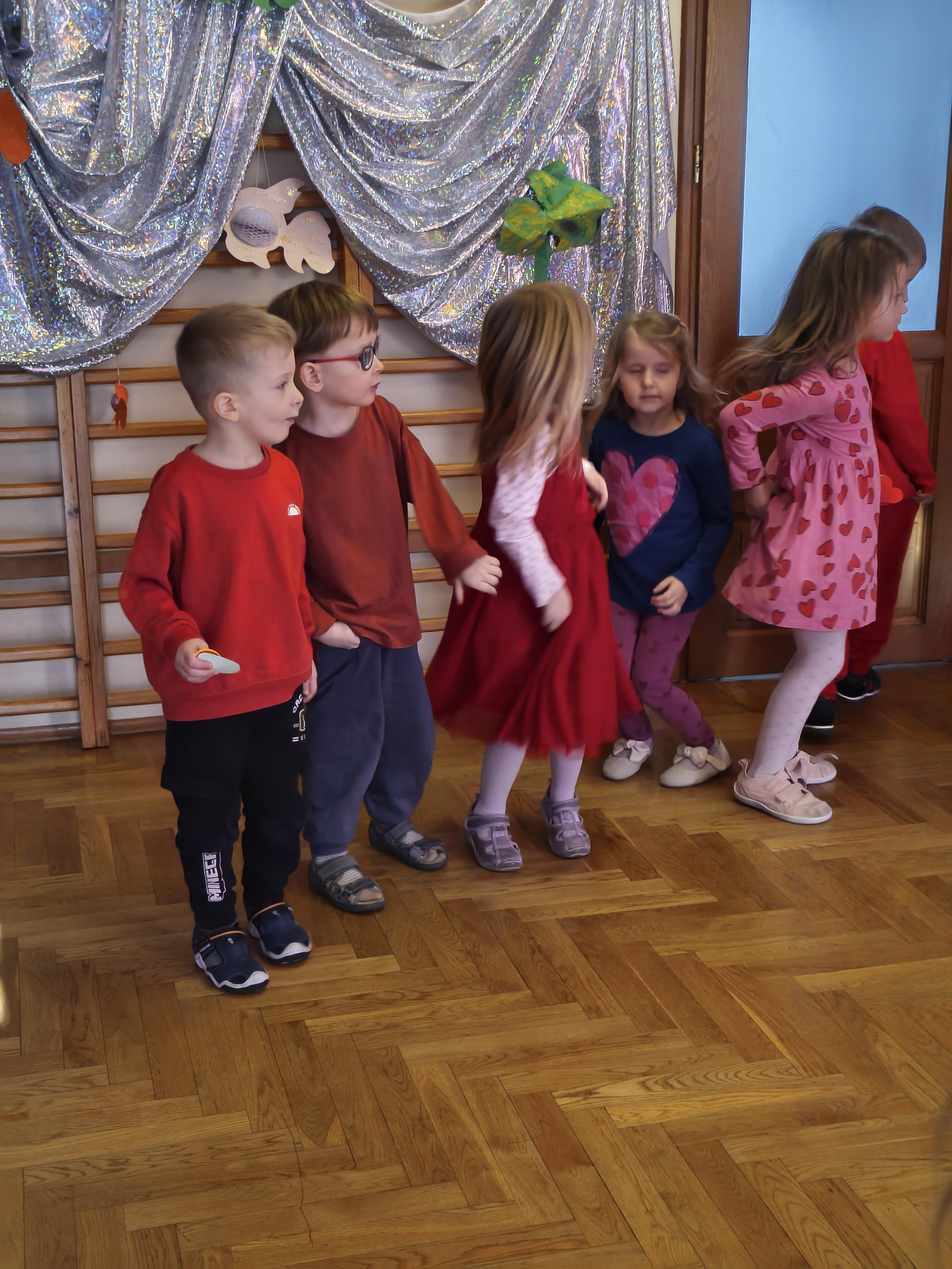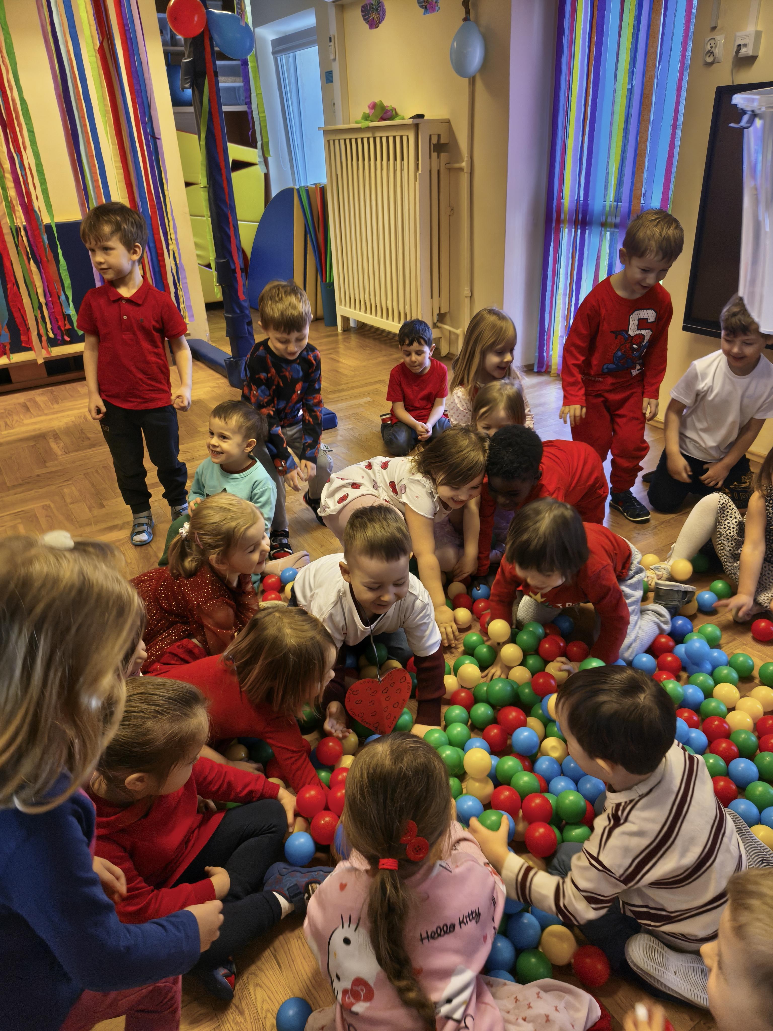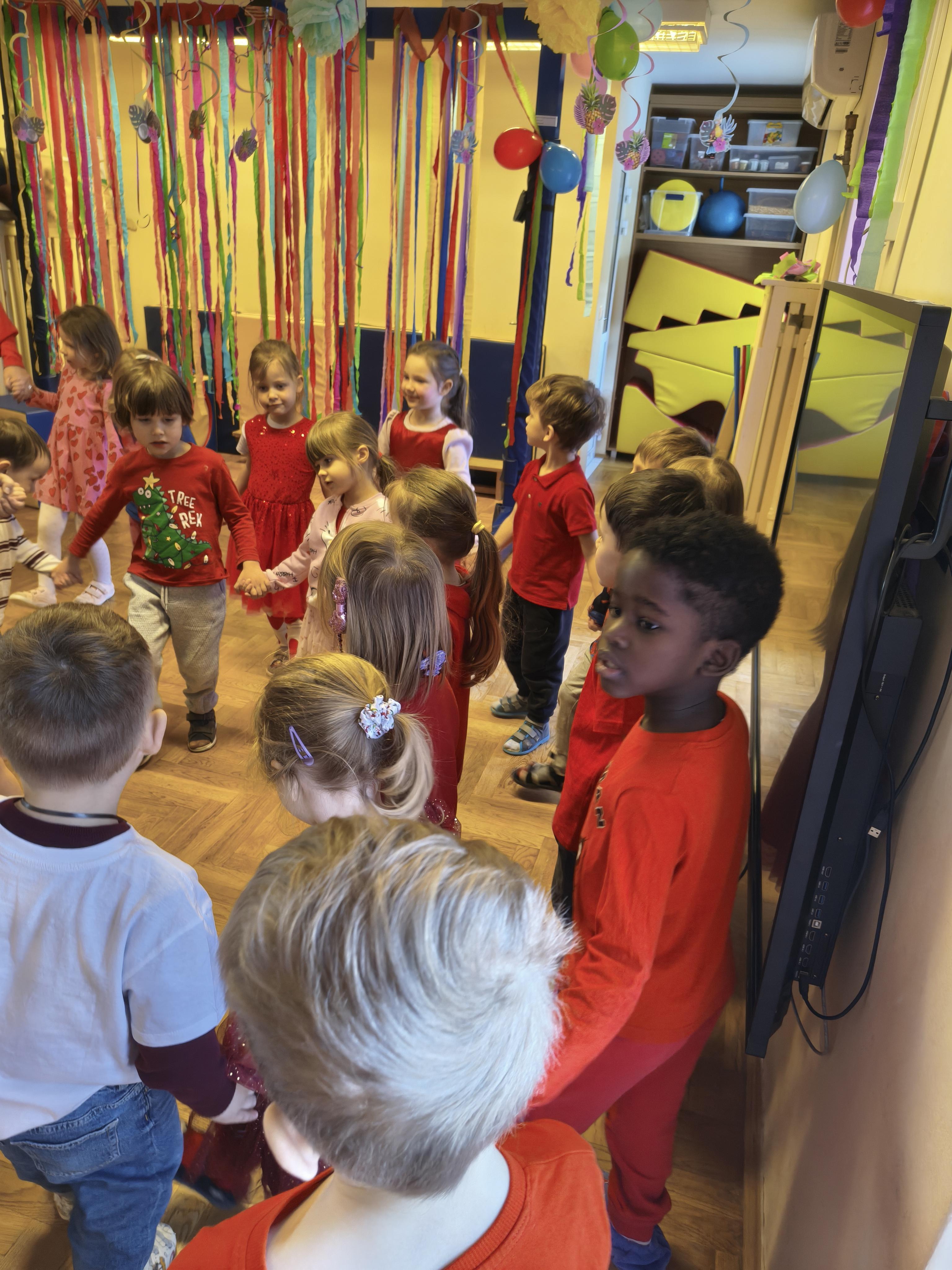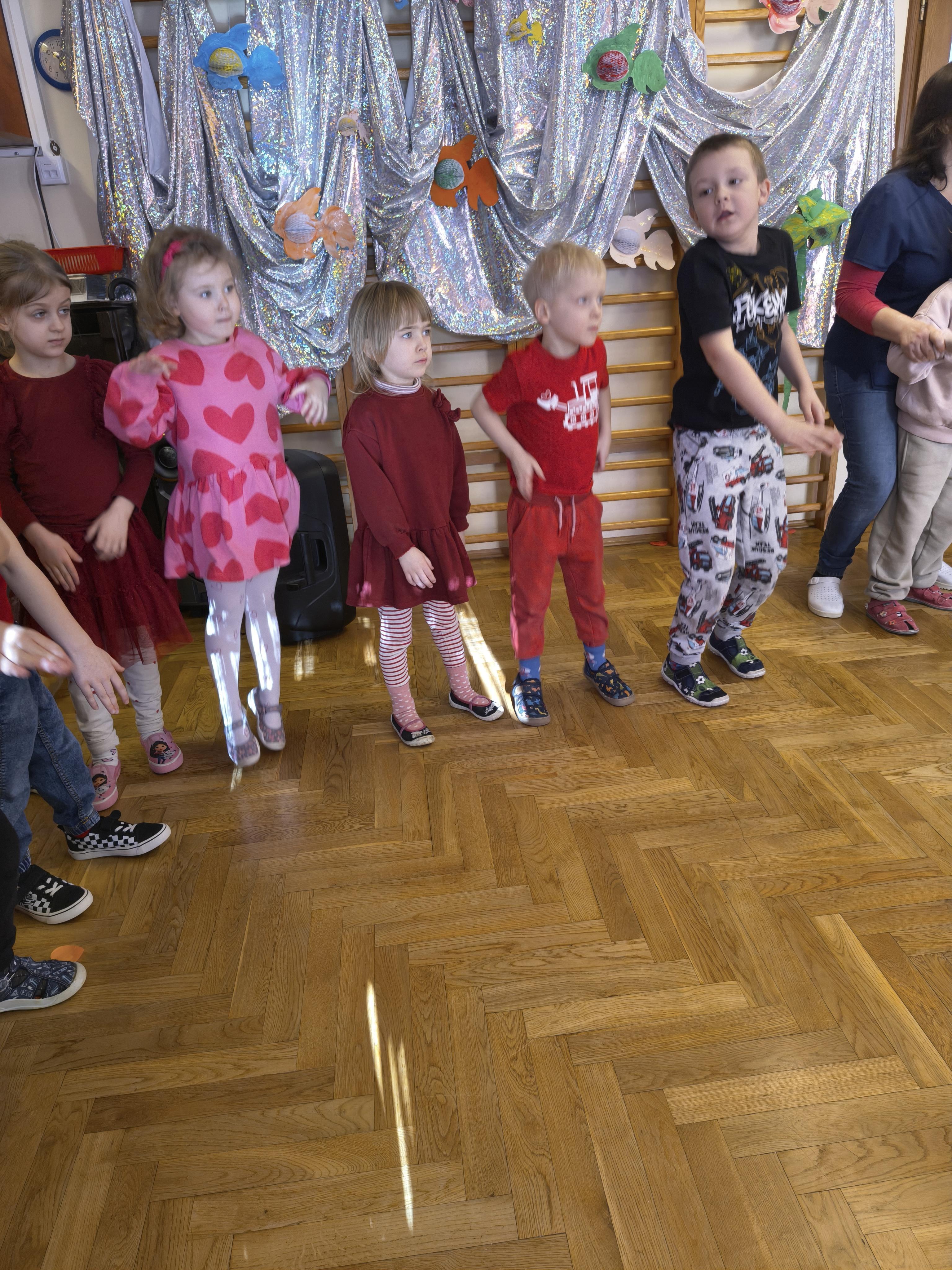 W poniedziałek 16 lutego dzieci spotkały się pięknie ubrane, w sali gimnastycznej, by wspólnie świętować. Walentynkowa zabawa była doskonałą okazją do budowania relacji, empatii i radości. Było wręczanie kartek z poczty walentynkowej, poszukiwanie przyjaciół, tańce z balonami, kolorowanie dywanu miłości, chusta animacyjna, Belgijka i losowanie imion przyszłych sympatii. Nie brakowało dobrej muzyki i uśmiechniętych buziaków!