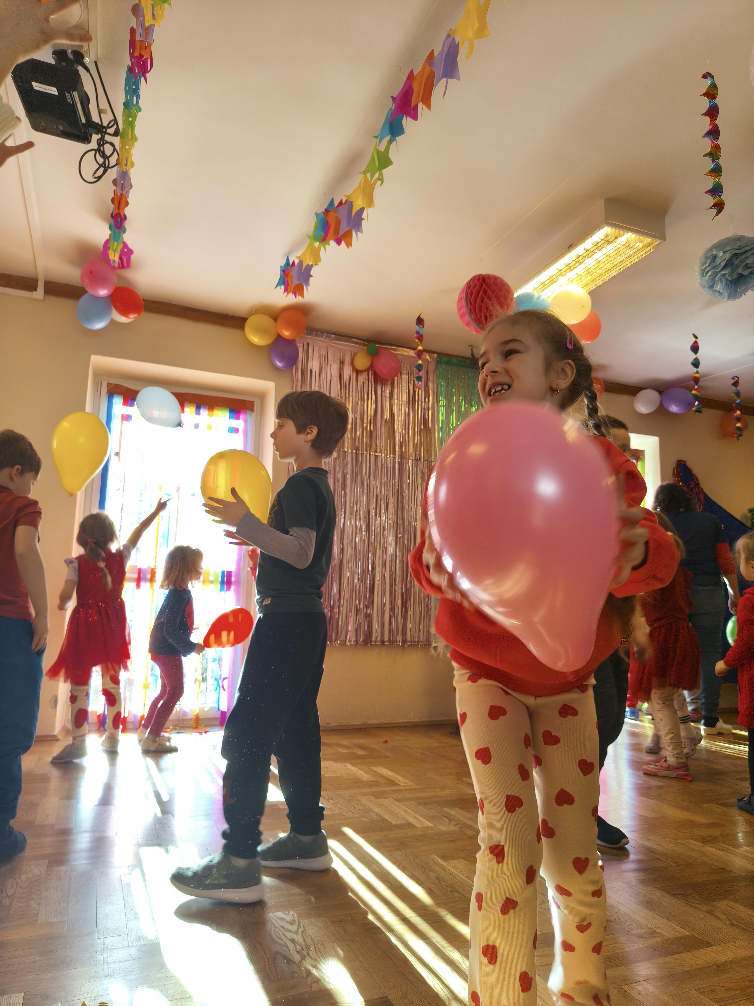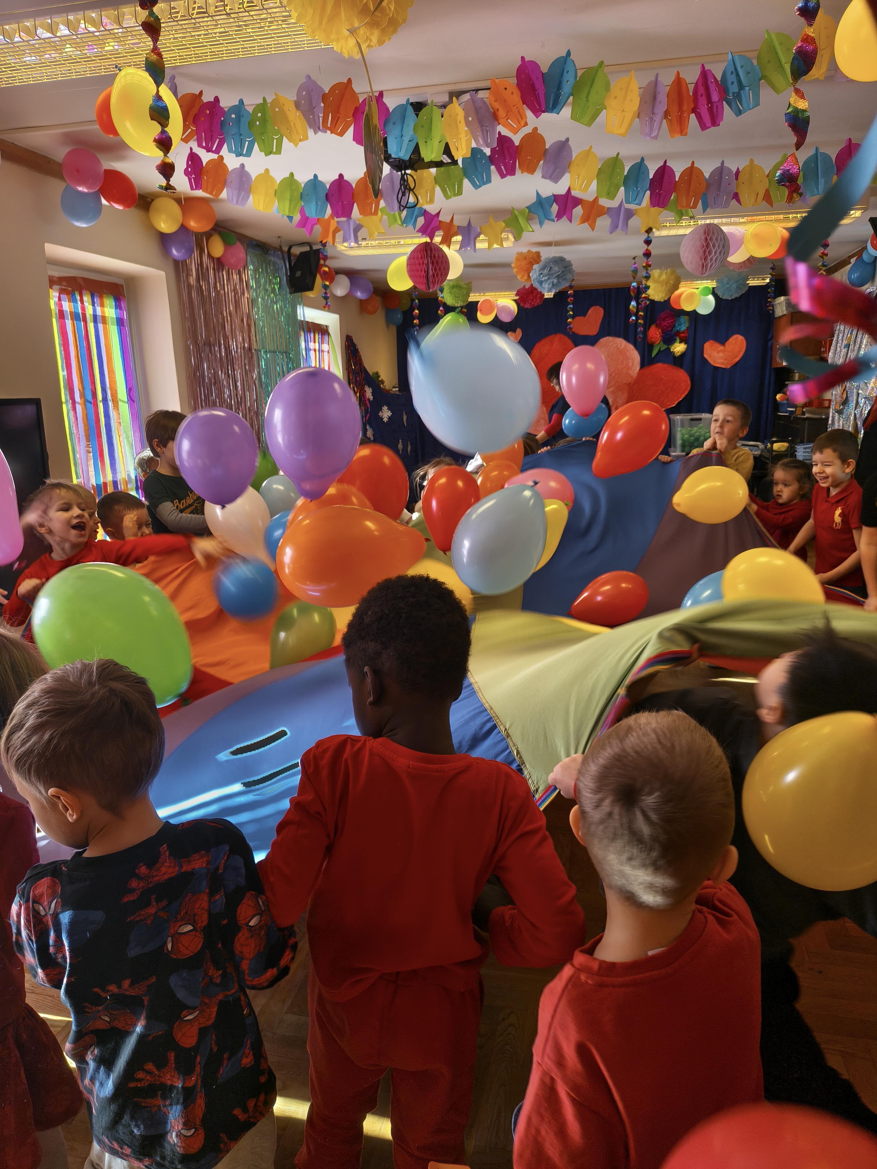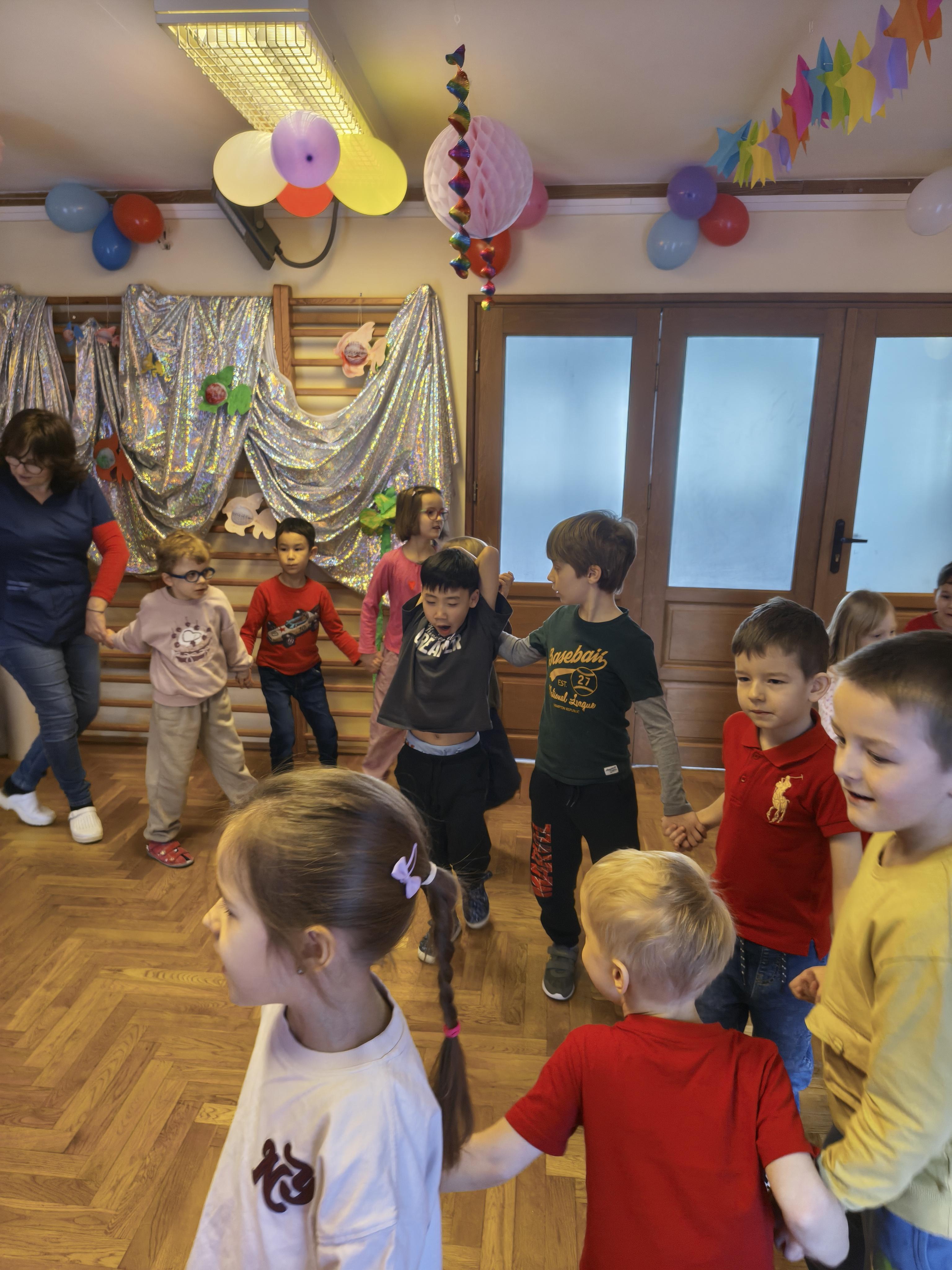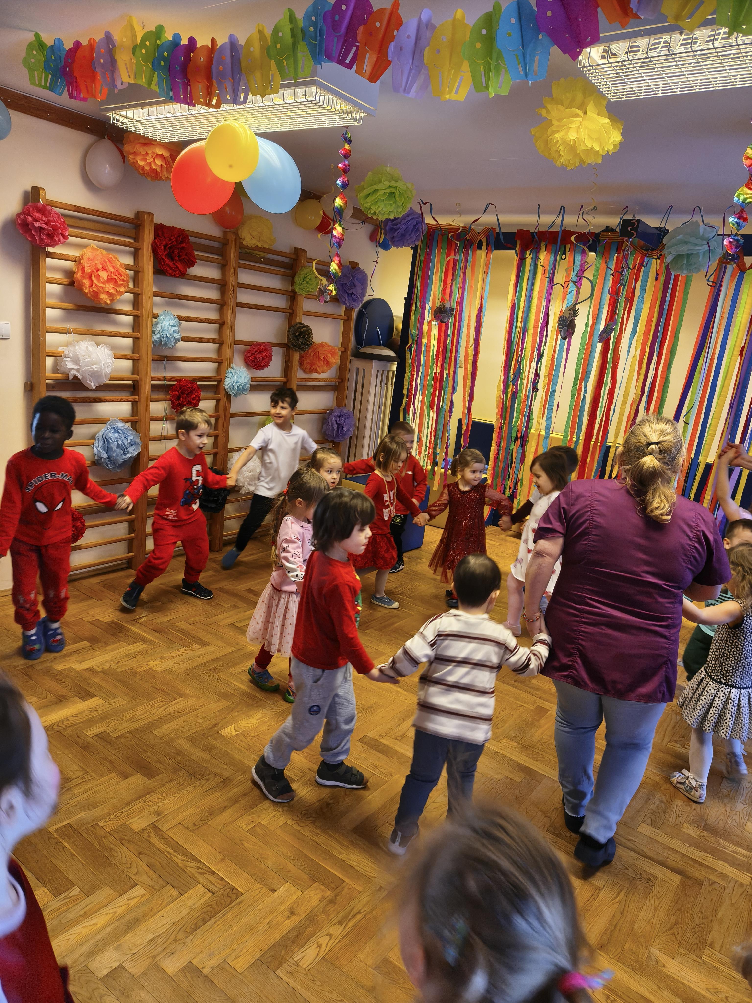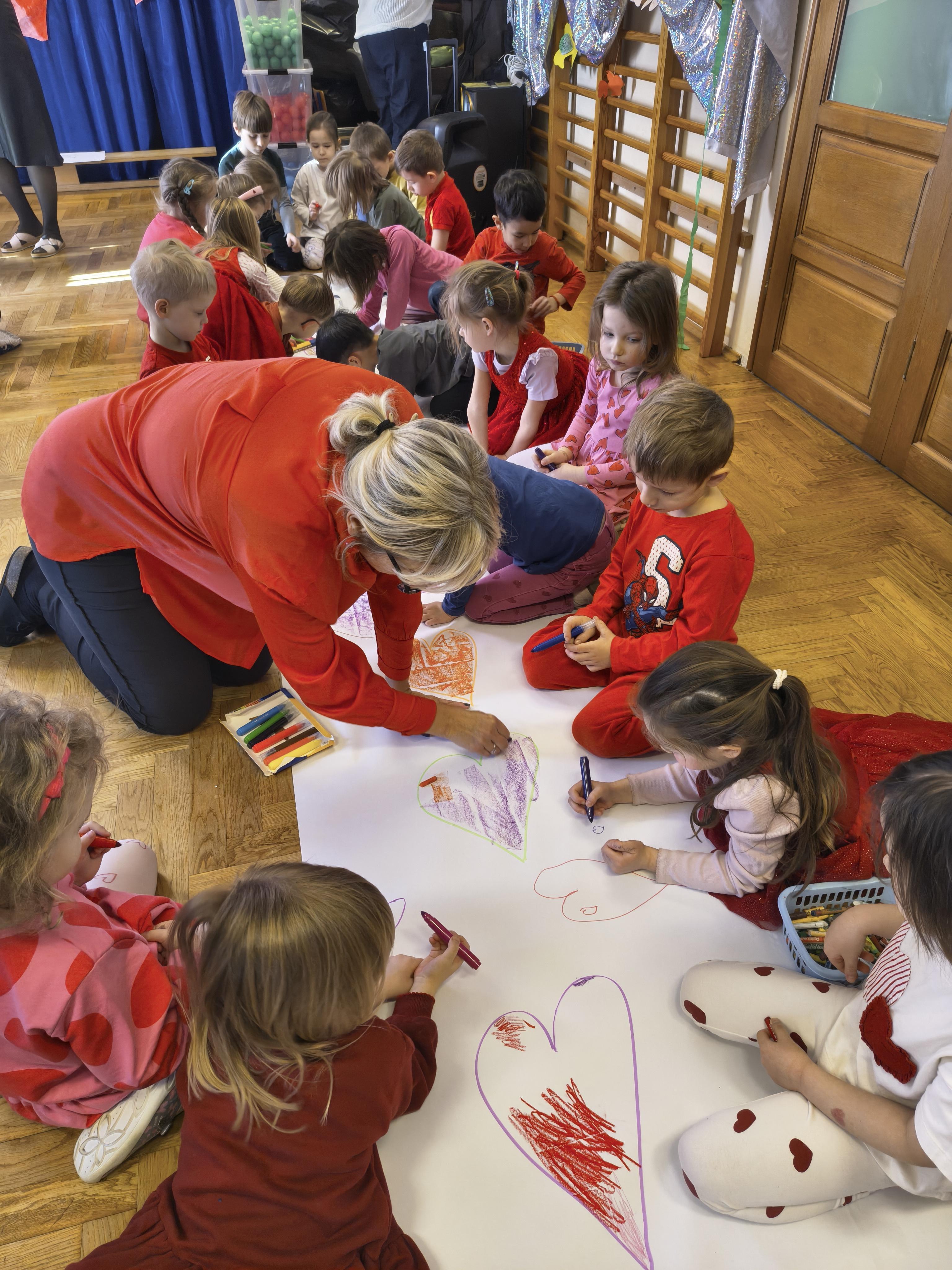 W poniedziałek 16 lutego dzieci spotkały się pięknie ubrane, w sali gimnastycznej, by wspólnie świętować. Walentynkowa zabawa była doskonałą okazją do budowania relacji, empatii i radości. Było wręczanie kartek z poczty walentynkowej, poszukiwanie przyjaciół, tańce z balonami, kolorowanie dywanu miłości, chusta animacyjna, Belgijka i losowanie imion przyszłych sympatii. Nie brakowało dobrej muzyki i uśmiechniętych buziaków!