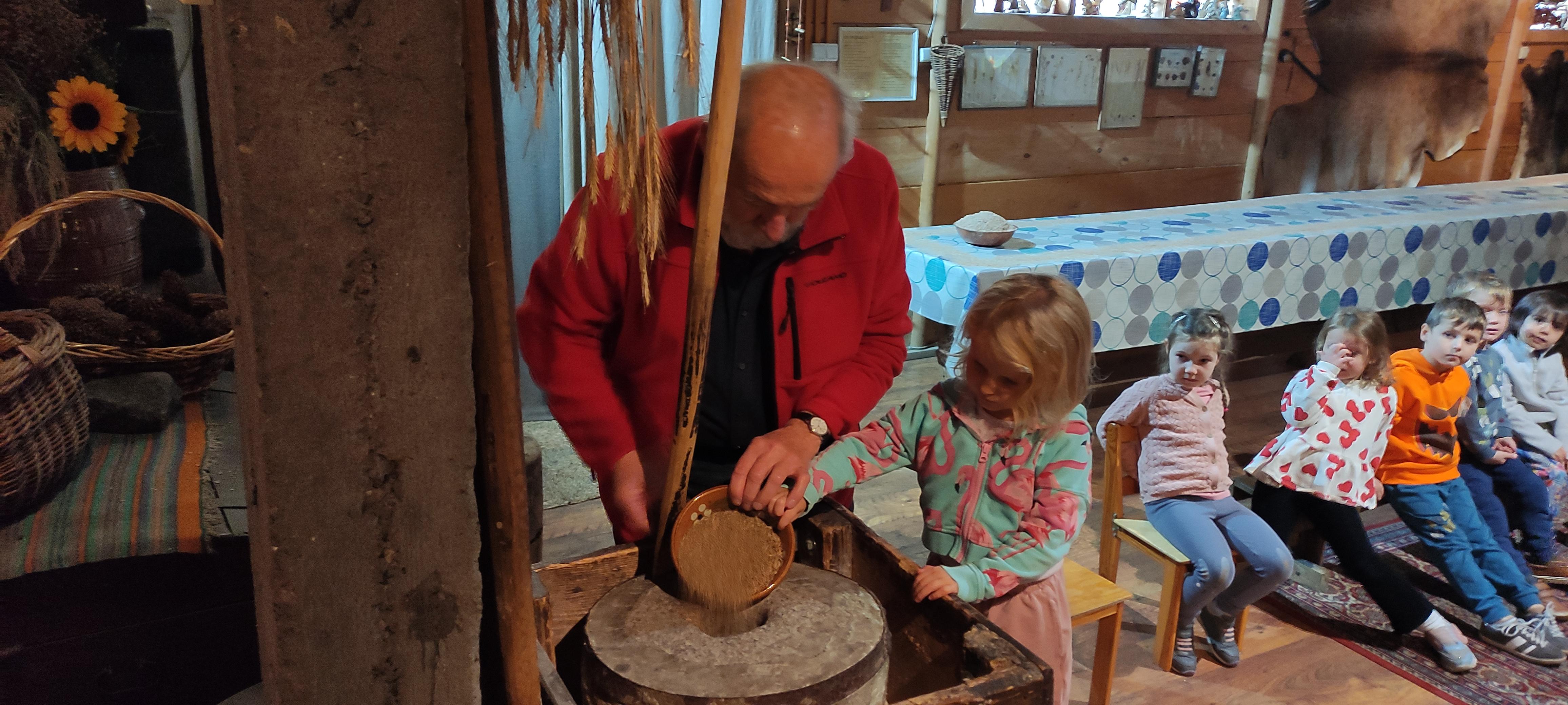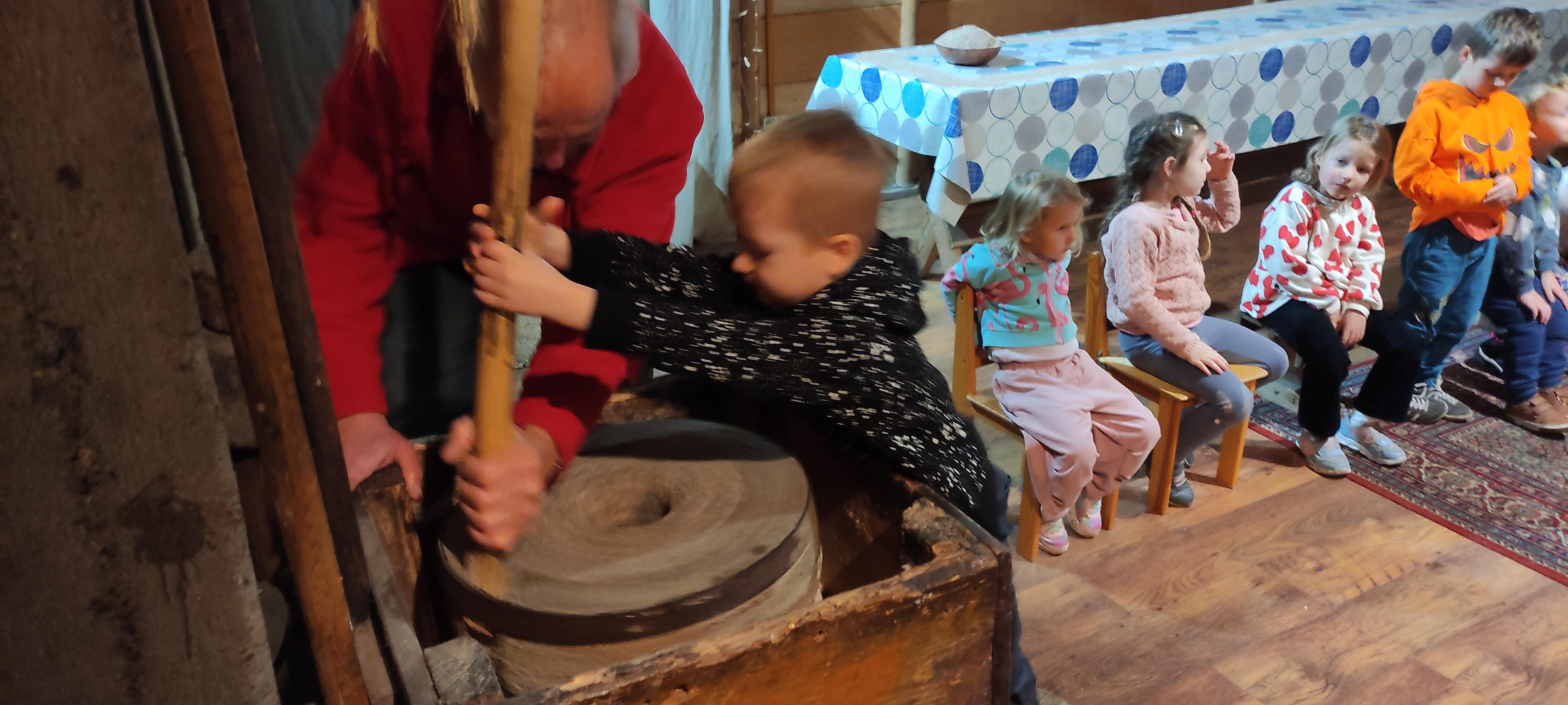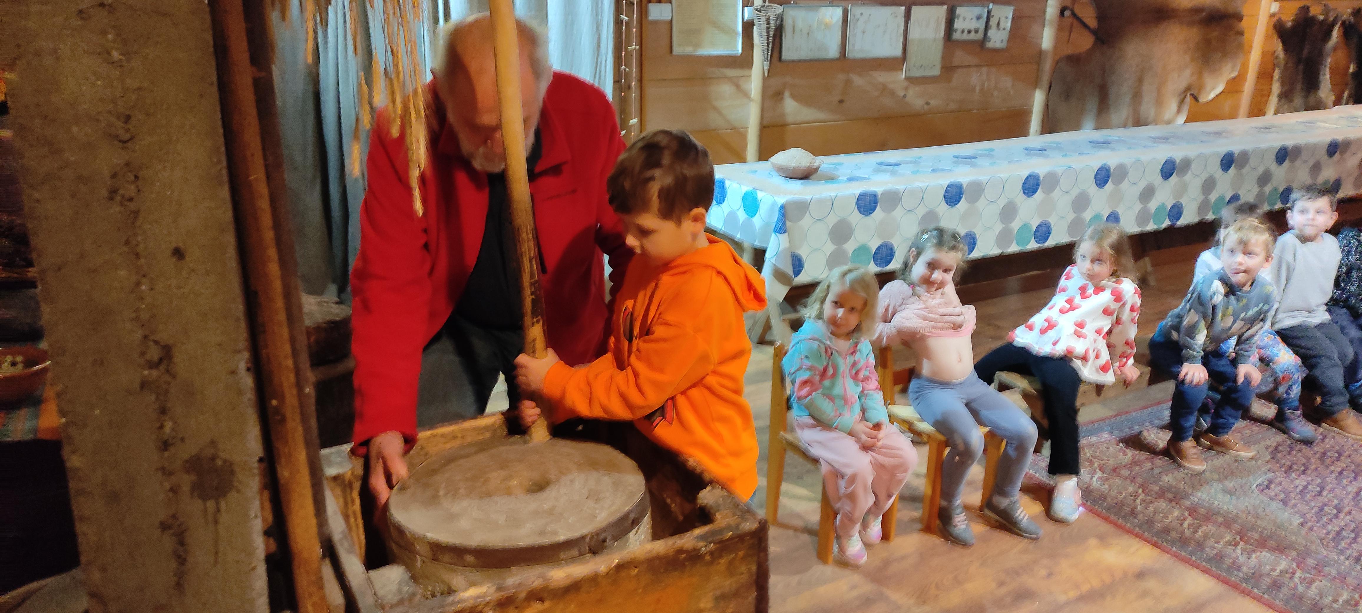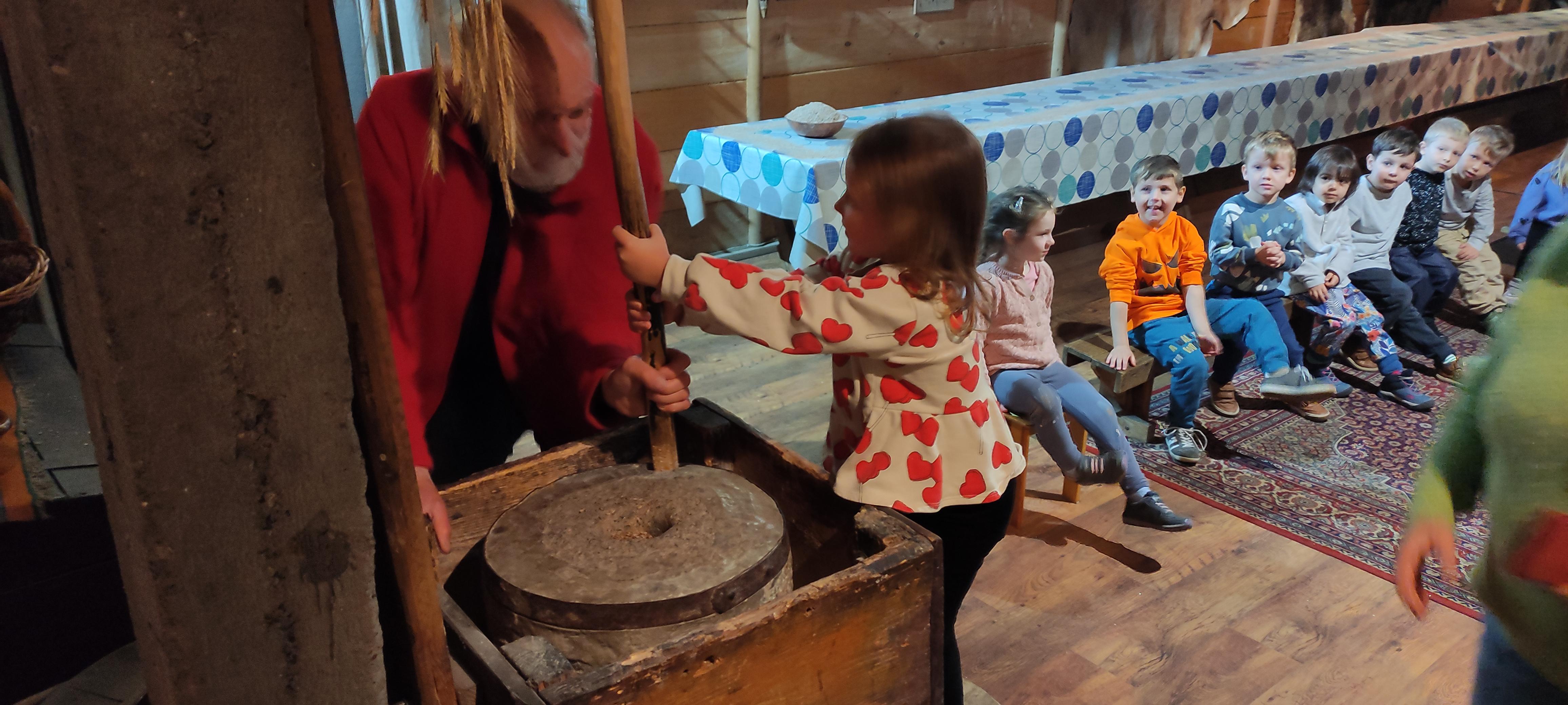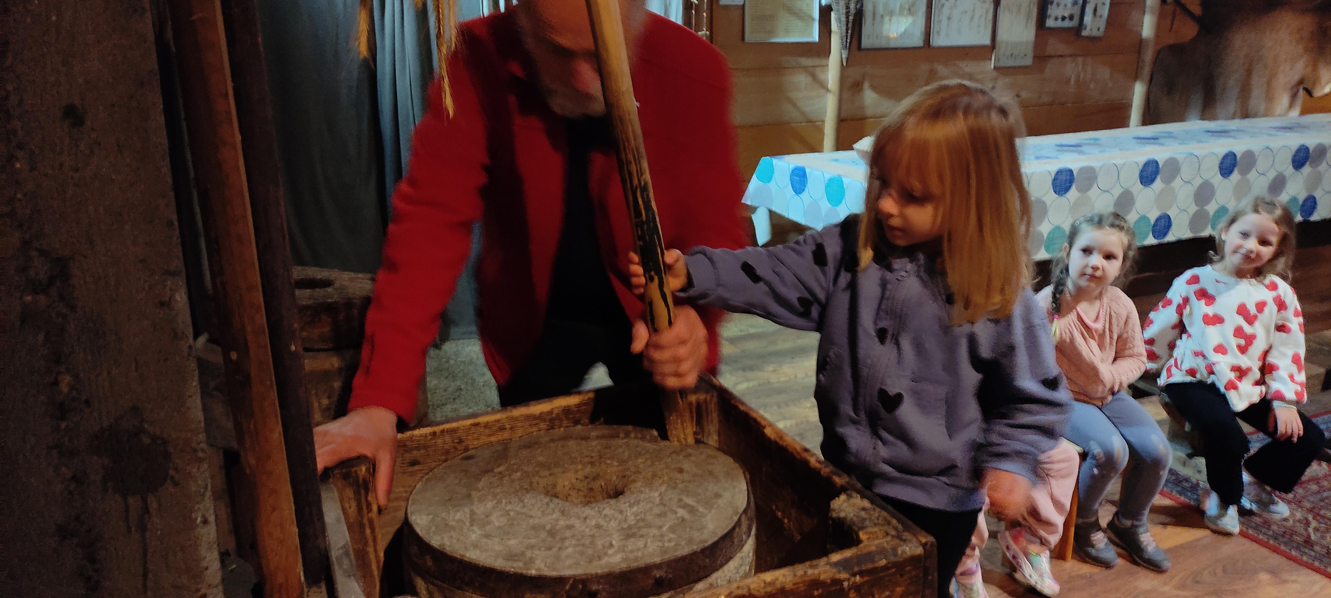 „Od kamienia do chleba” historia zbóż i chleba, mielenie ziarna na mąkę w żarnach, pokaz wyrabiania chleba, formowanie bochenków, wypiek chleba.