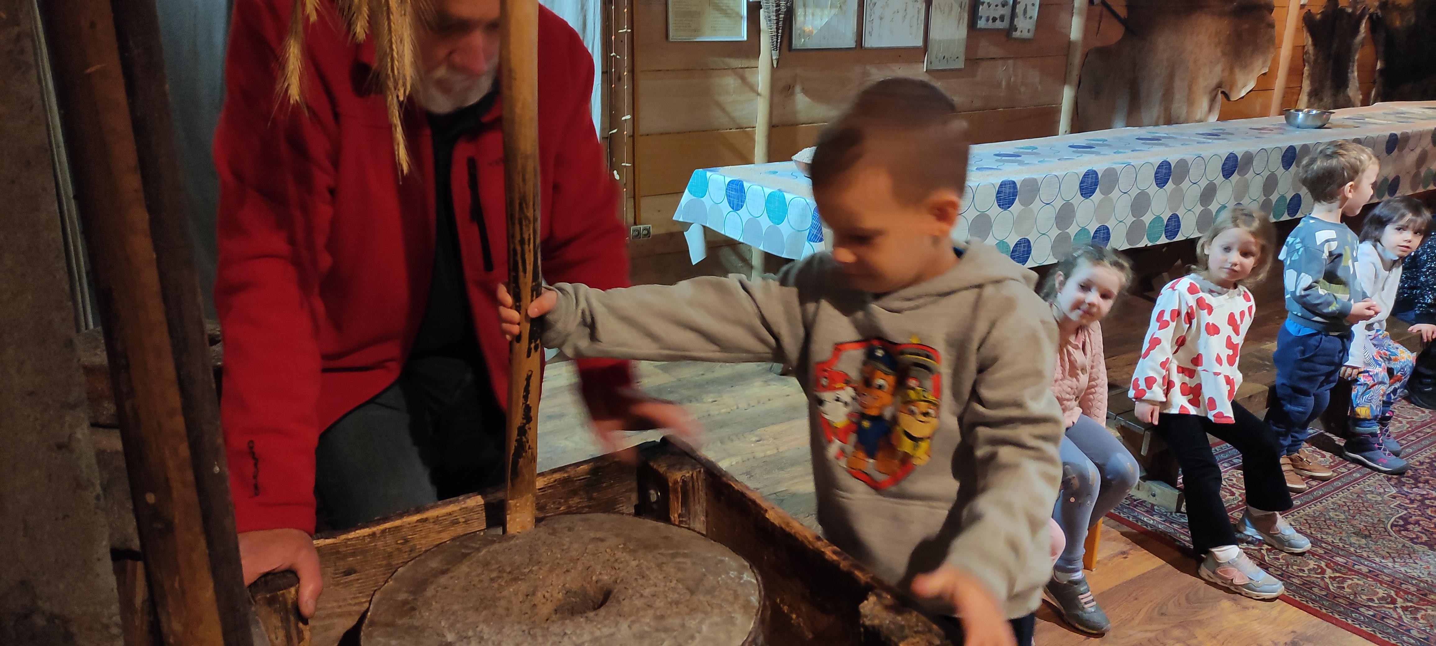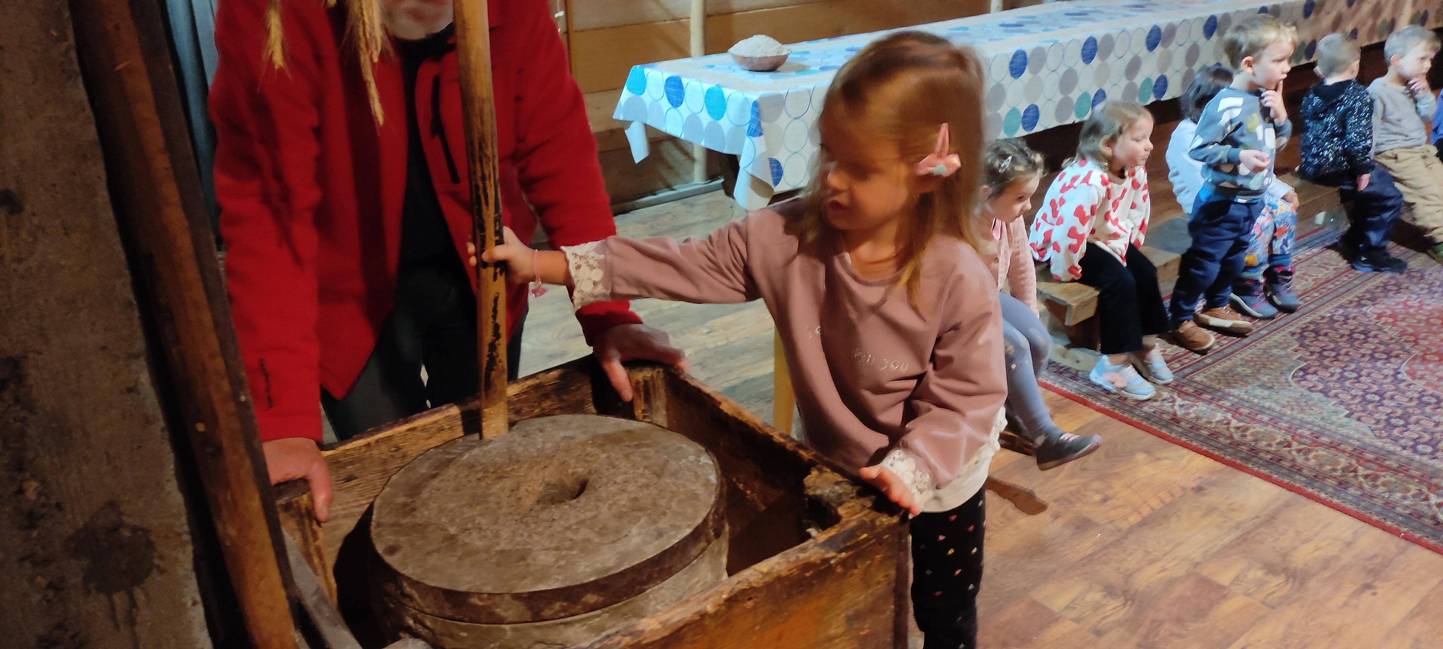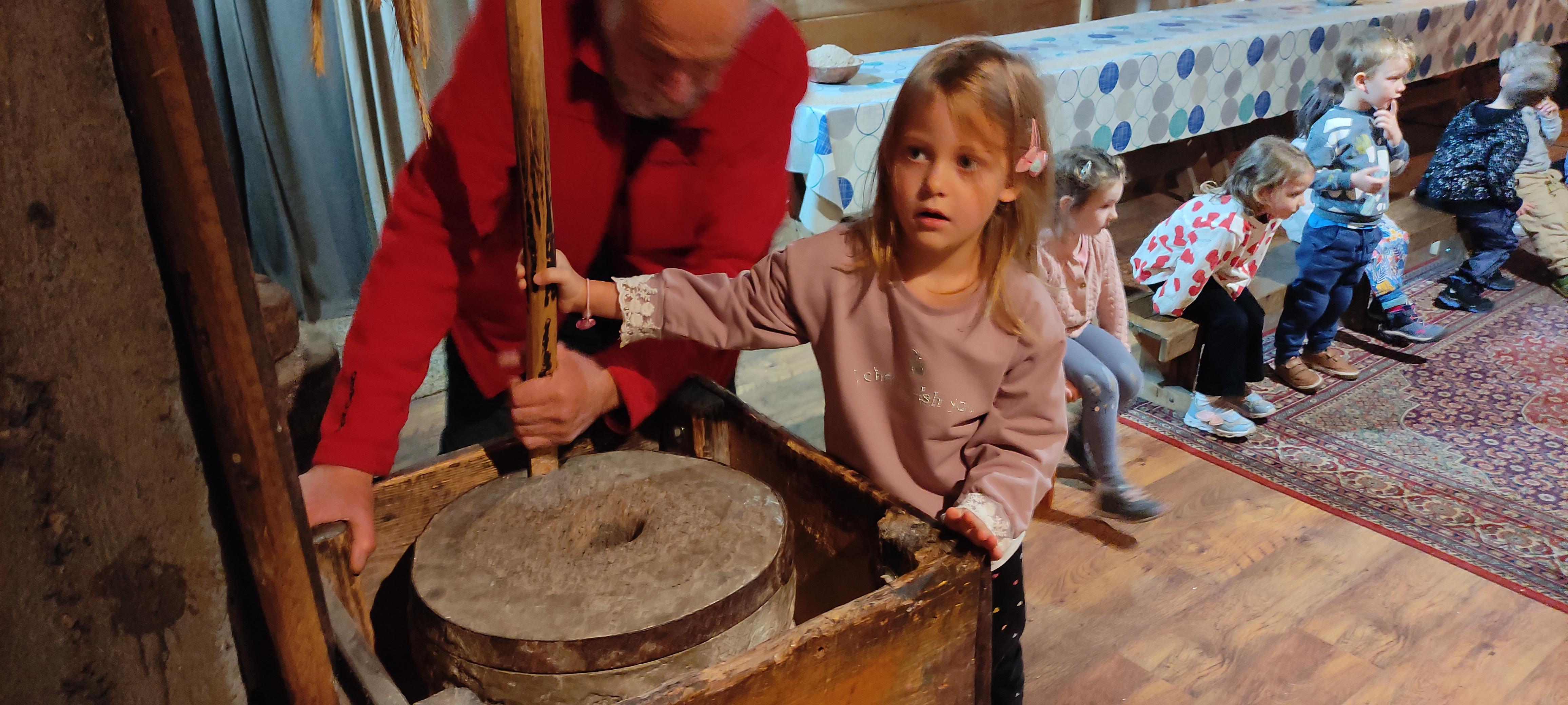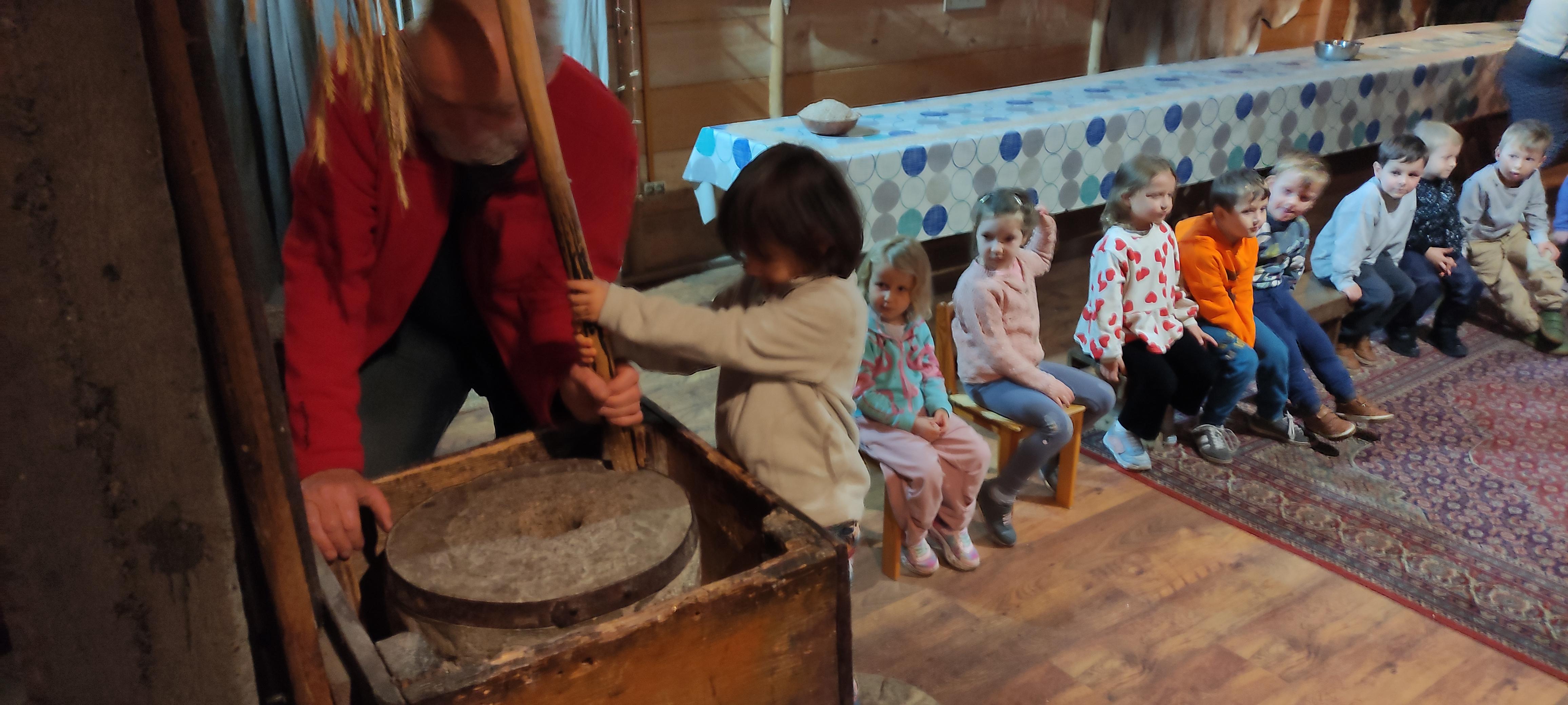 „Od kamienia do chleba” historia zbóż i chleba, mielenie ziarna na mąkę w żarnach, pokaz wyrabiania chleba, formowanie bochenków, wypiek chleba.