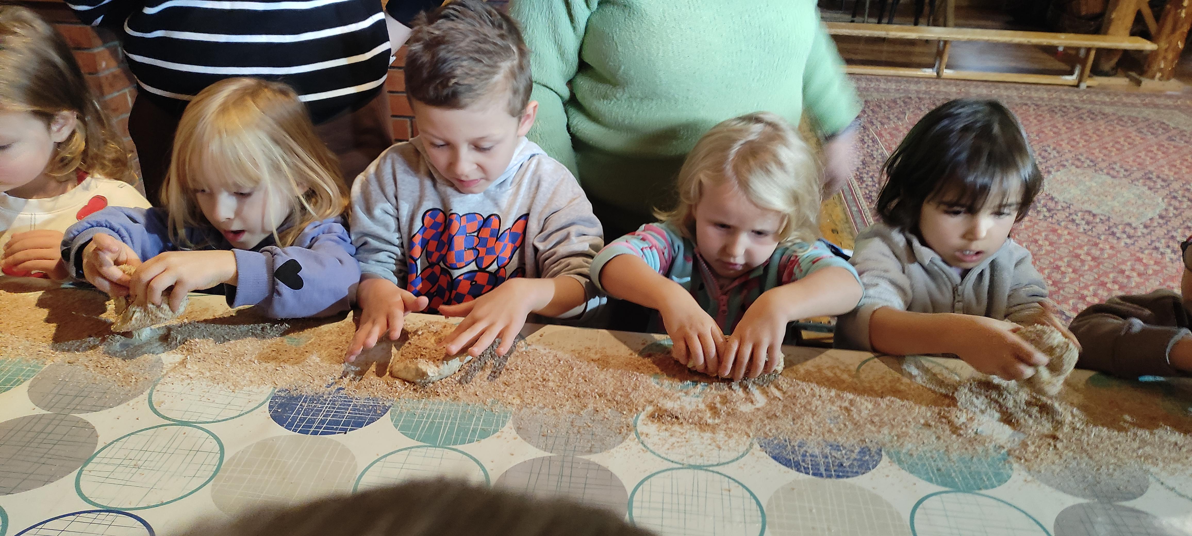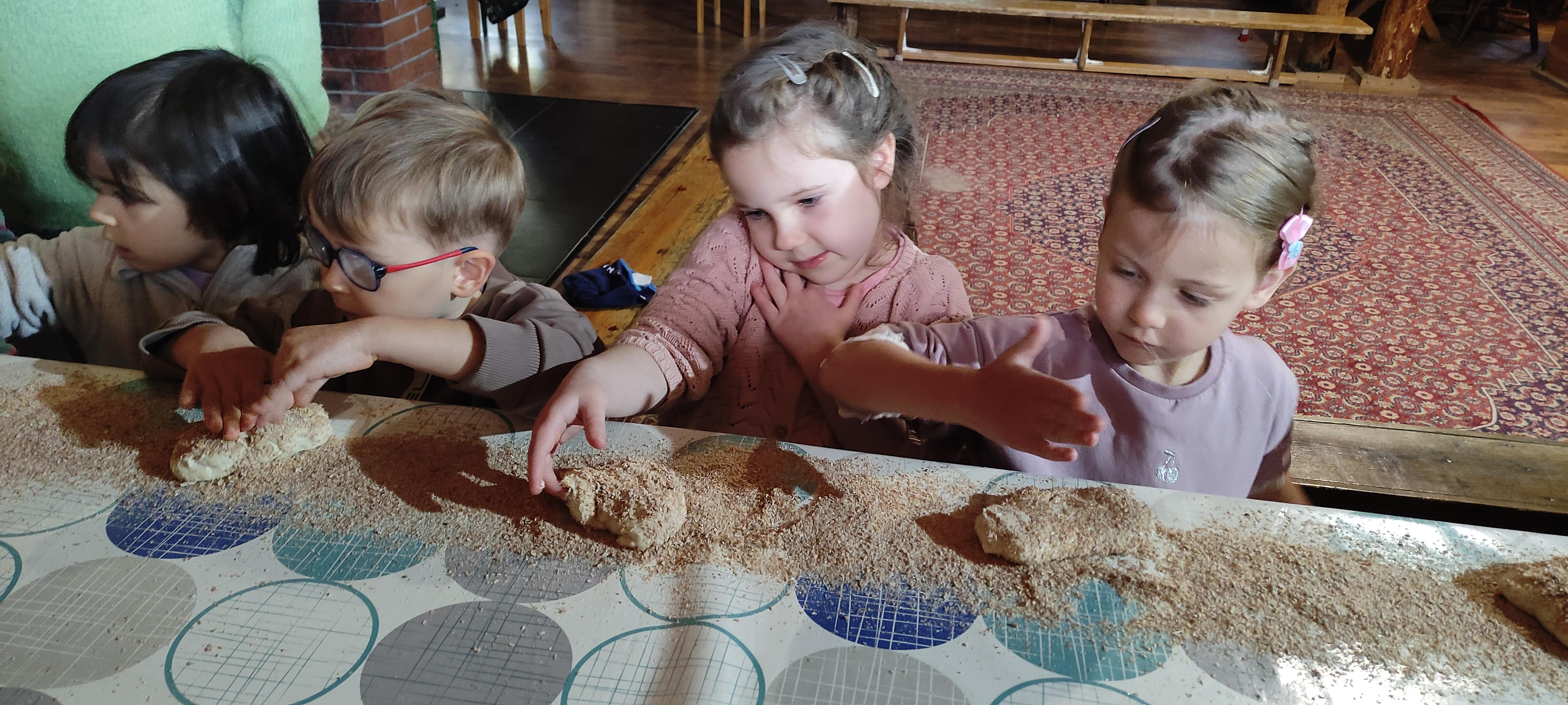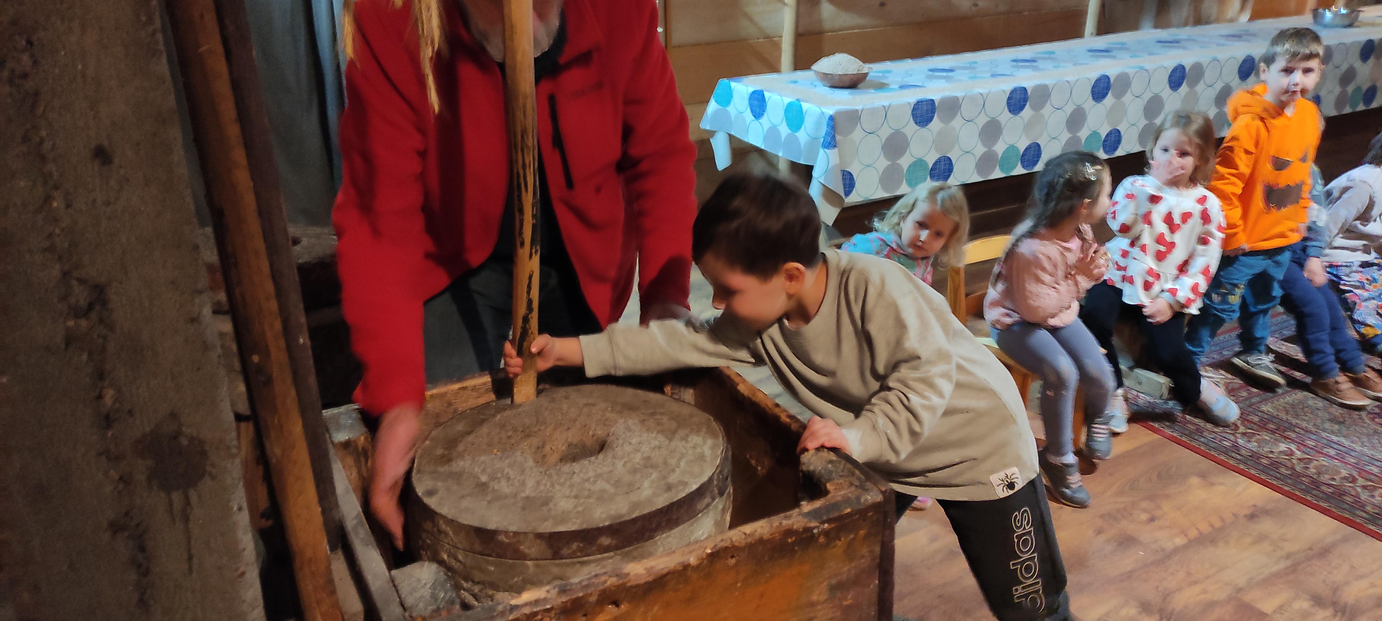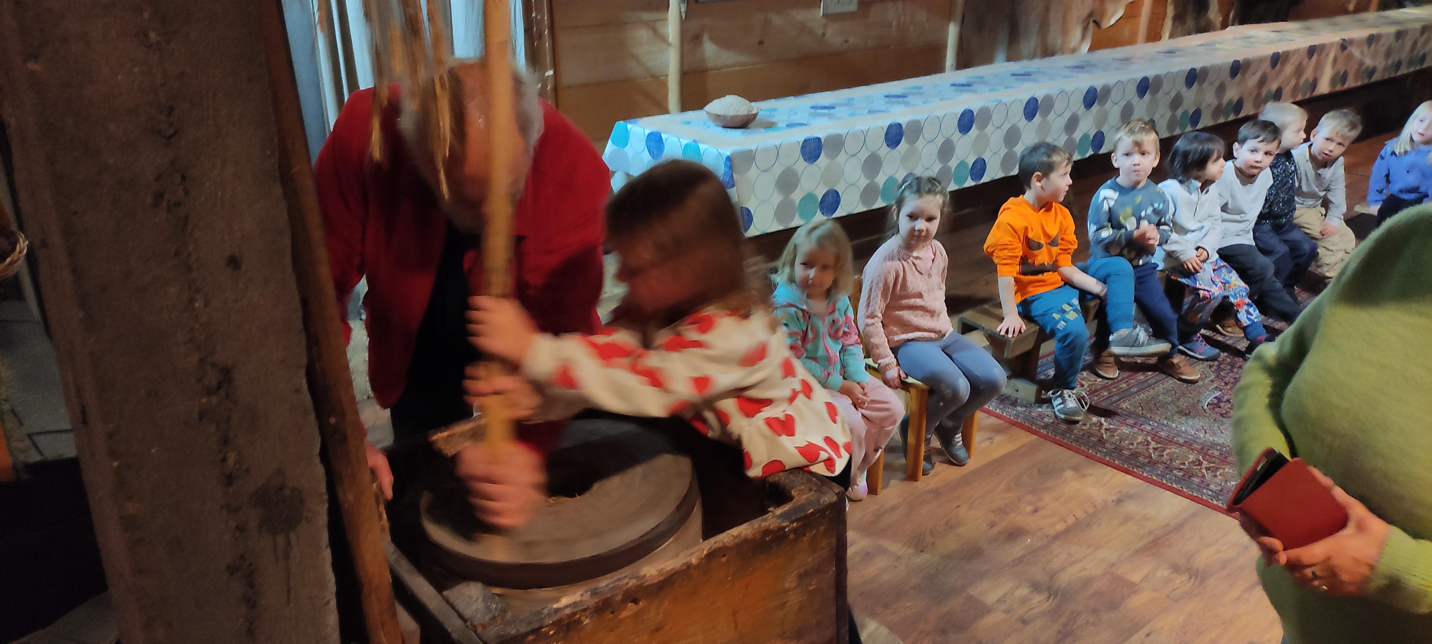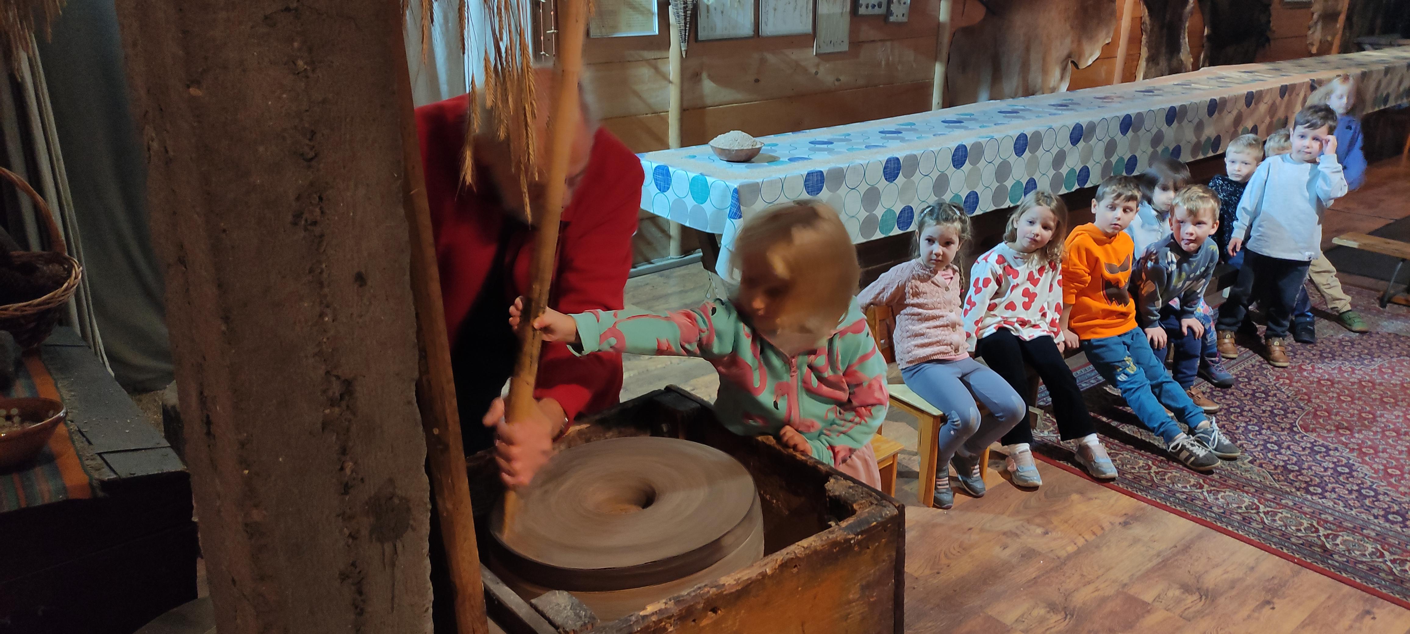 „Od kamienia do chleba” historia zbóż i chleba, mielenie ziarna na mąkę w żarnach, pokaz wyrabiania chleba, formowanie bochenków, wypiek chleba.