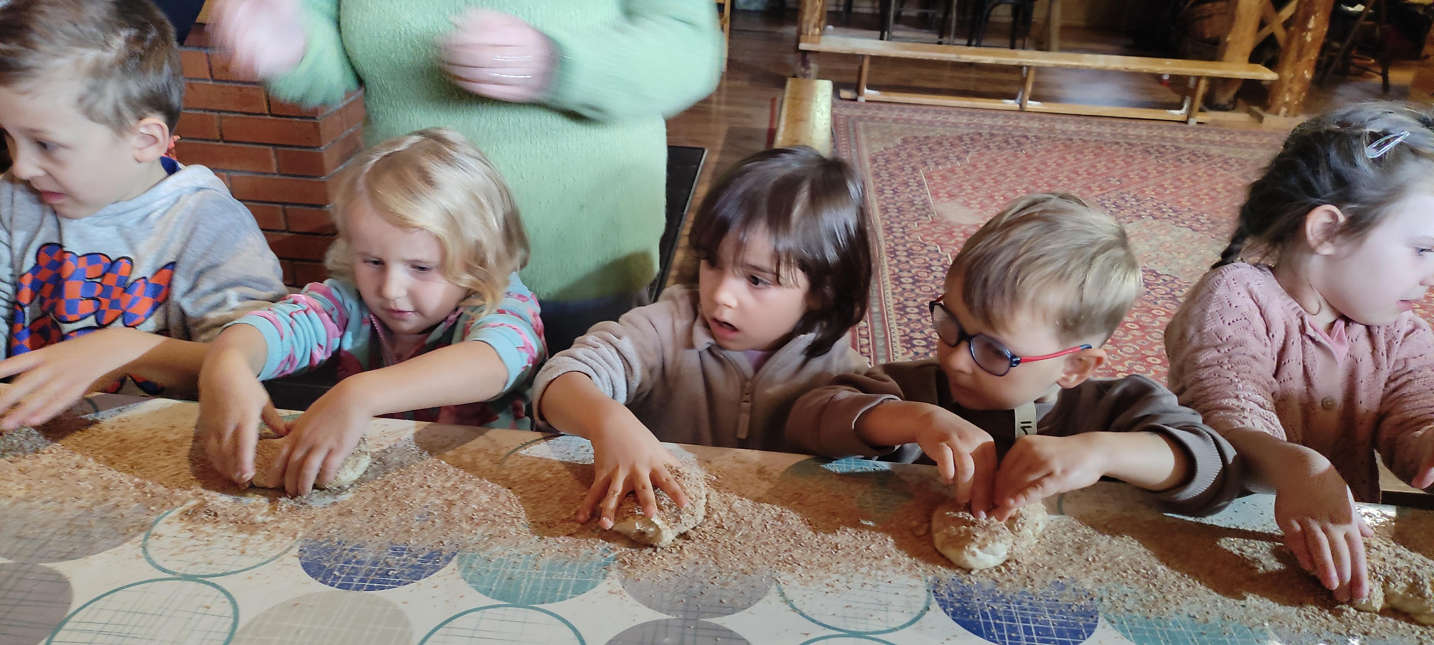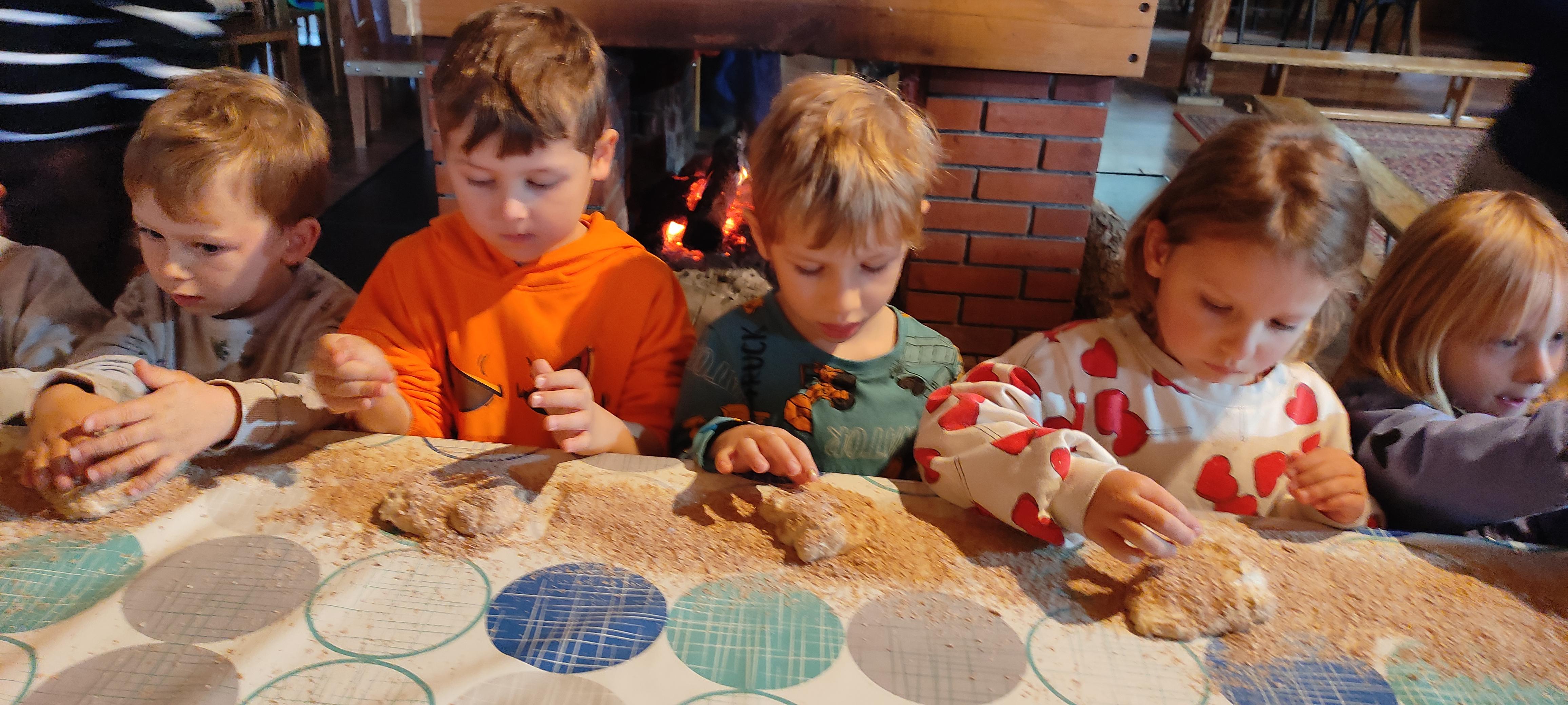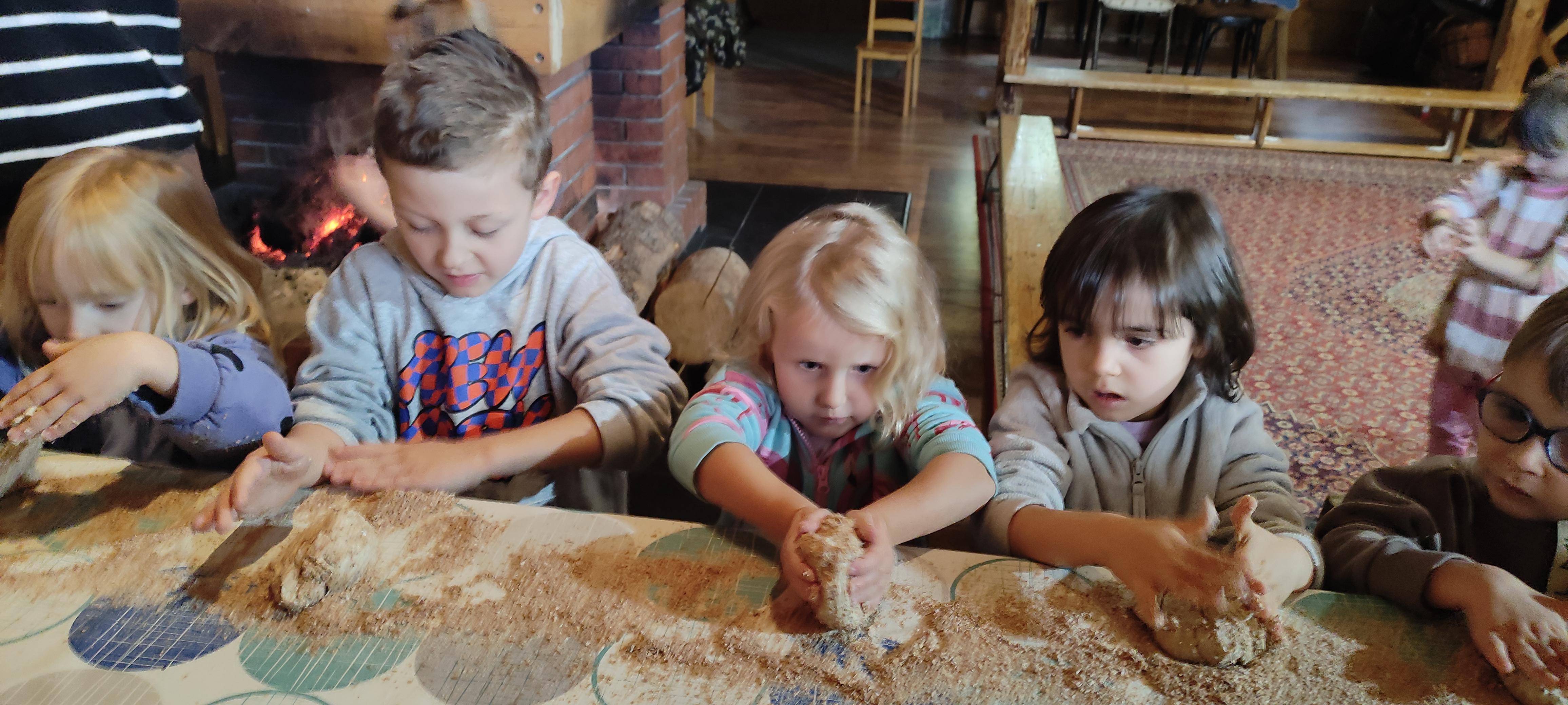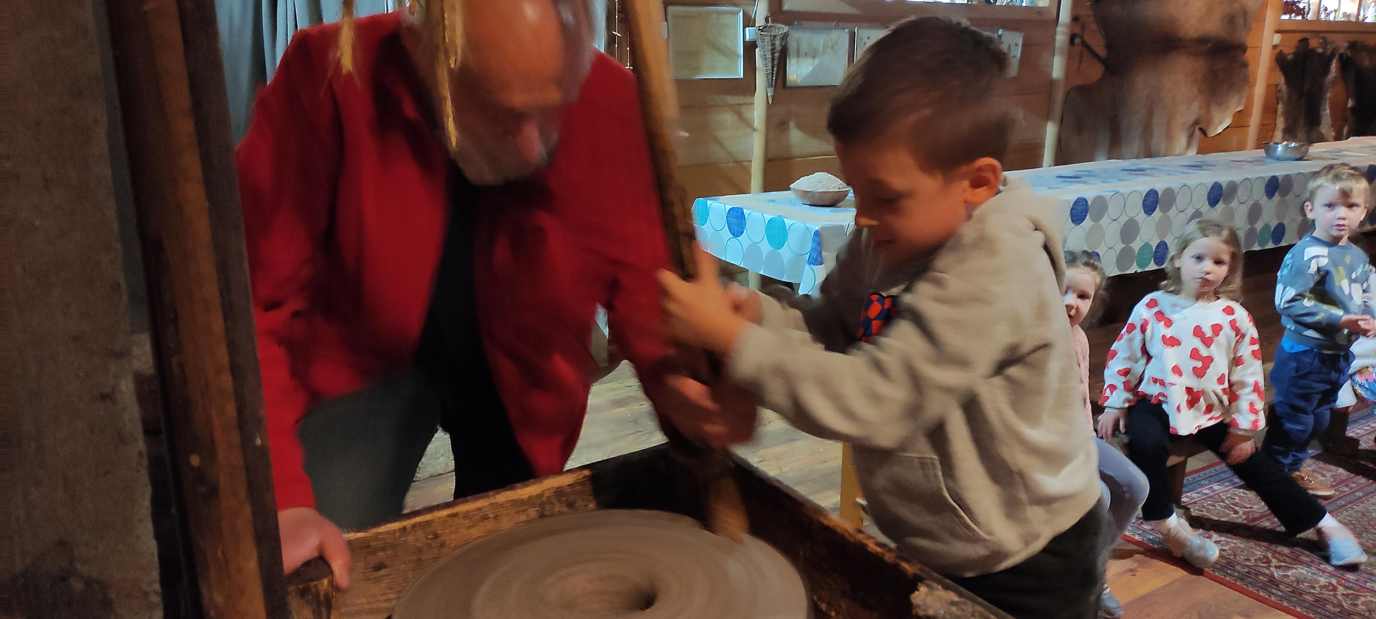 „Od kamienia do chleba” historia zbóż i chleba, mielenie ziarna na mąkę w żarnach, pokaz wyrabiania chleba, formowanie bochenków, wypiek chleba.