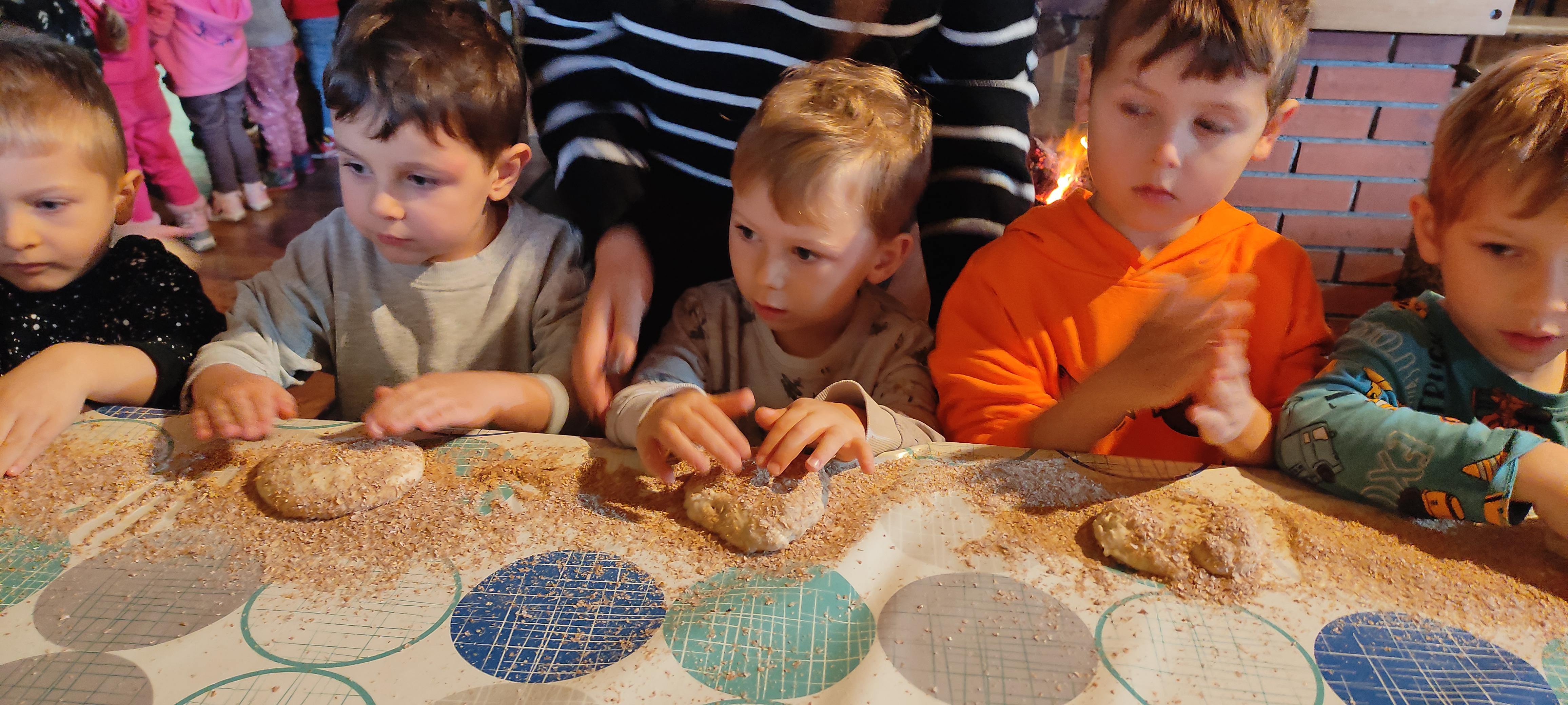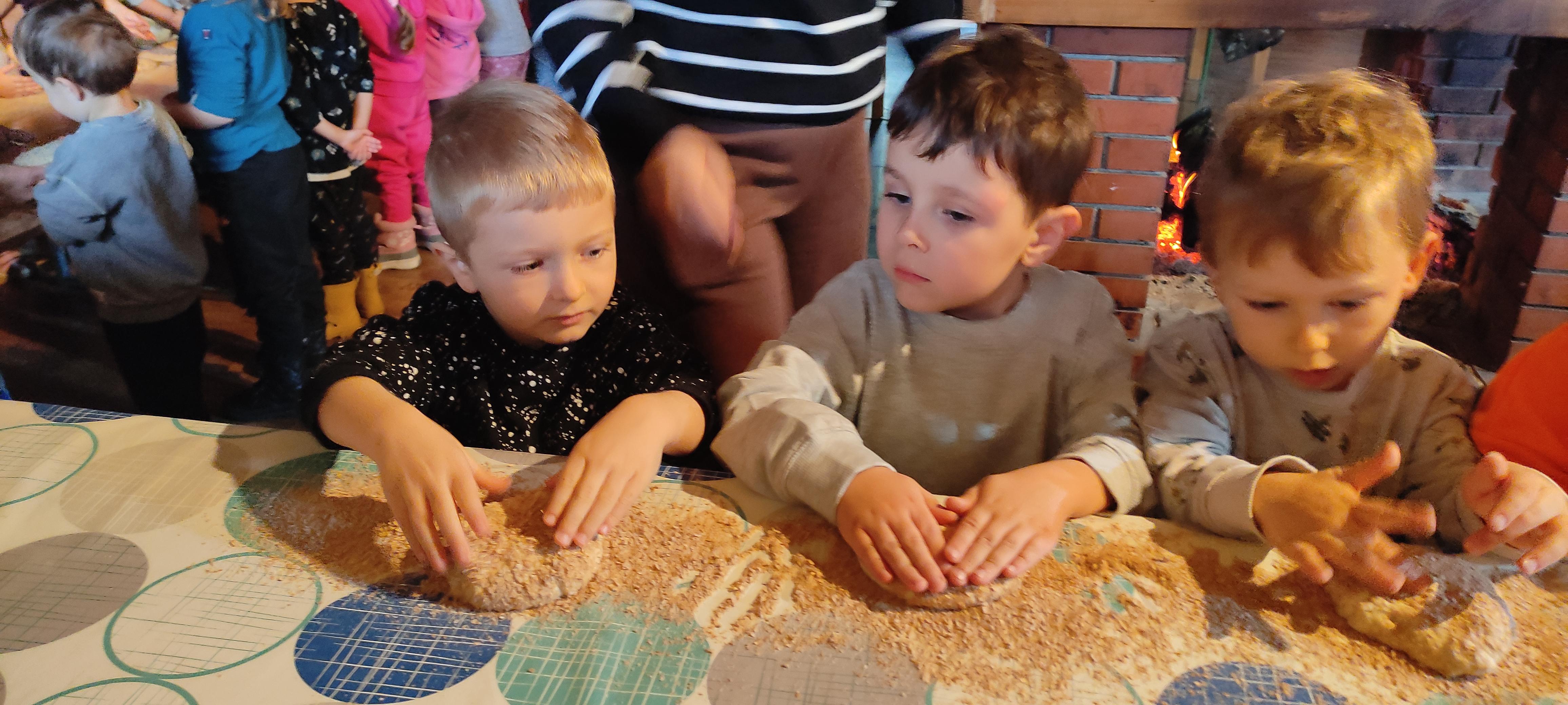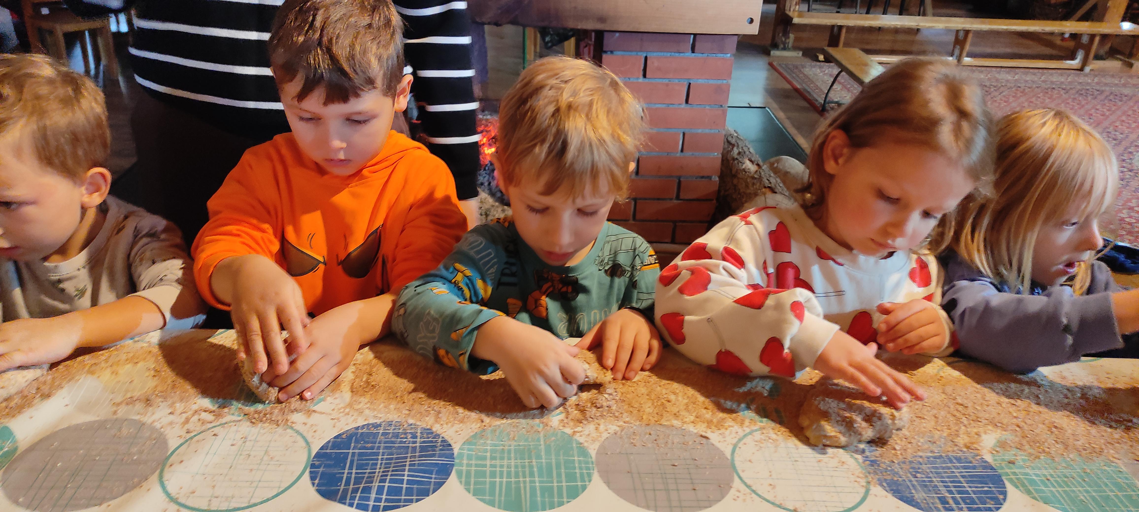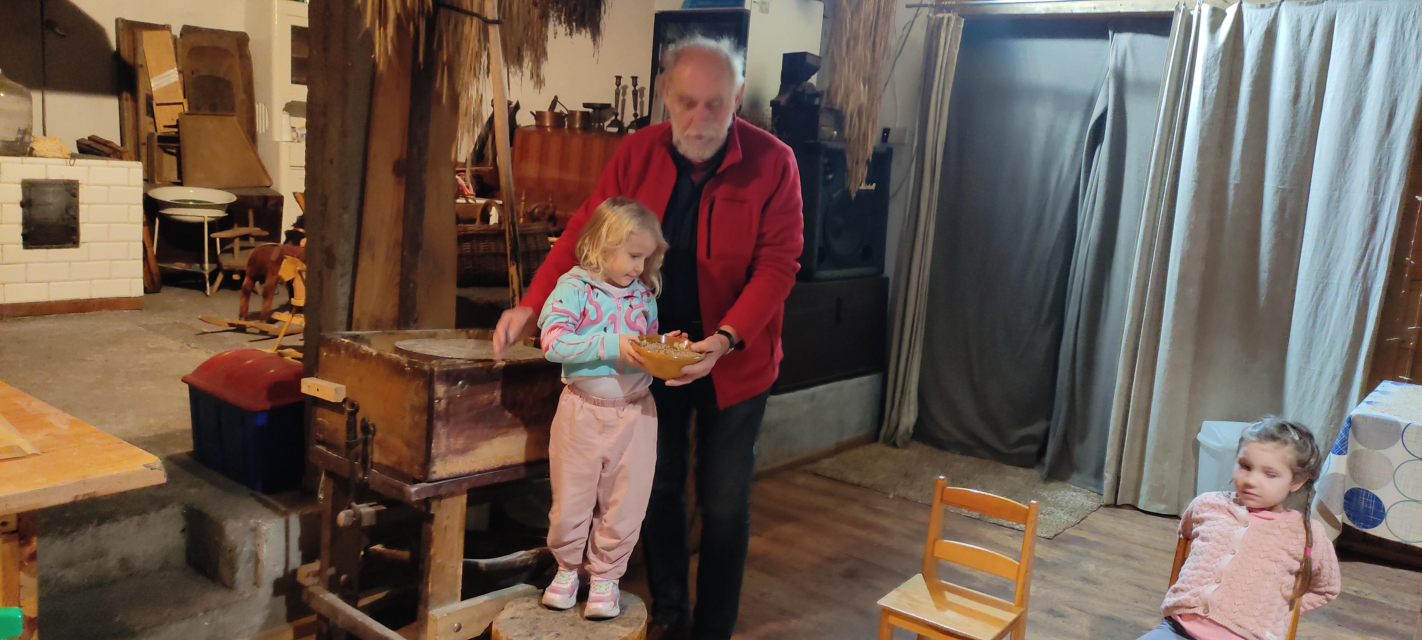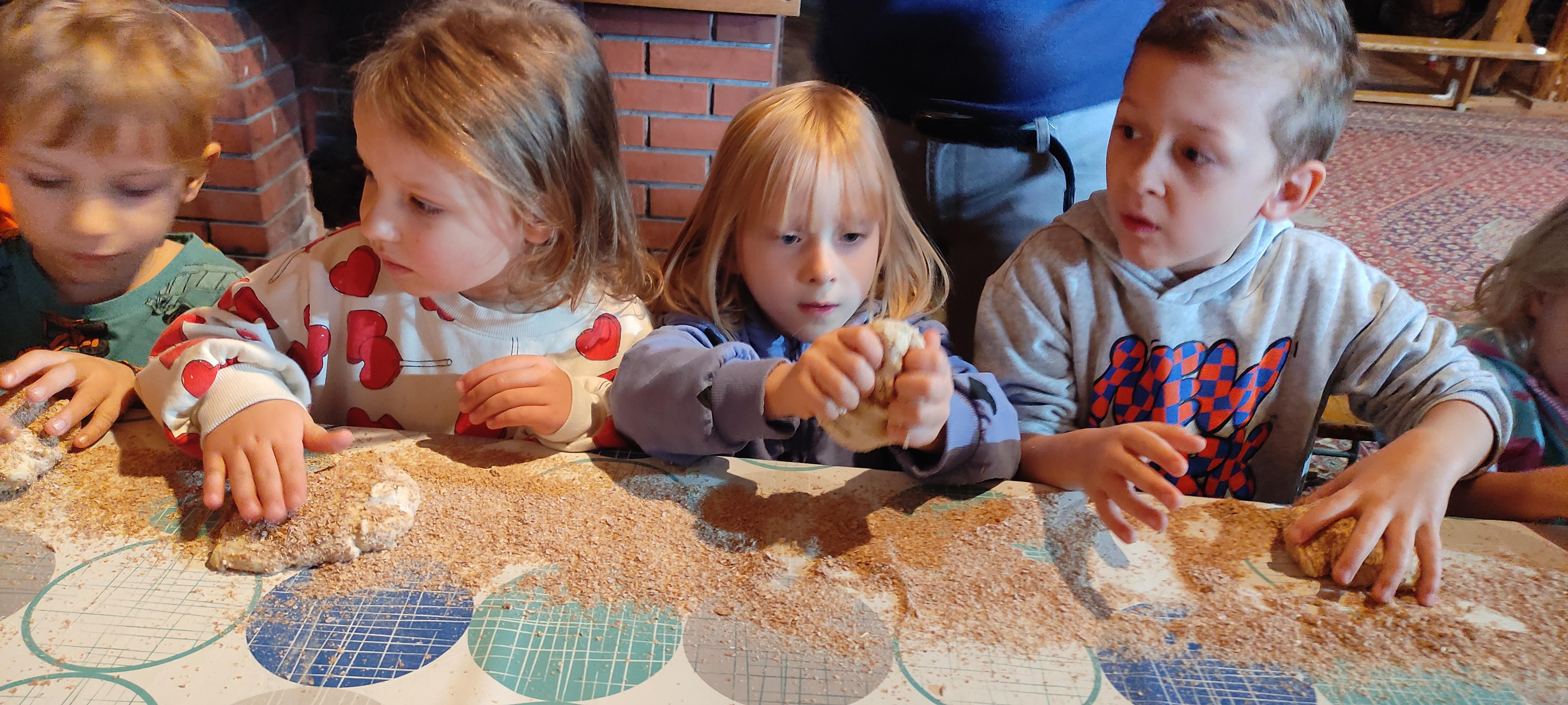 „Od kamienia do chleba” historia zbóż i chleba, mielenie ziarna na mąkę w żarnach, pokaz wyrabiania chleba, formowanie bochenków, wypiek chleba.