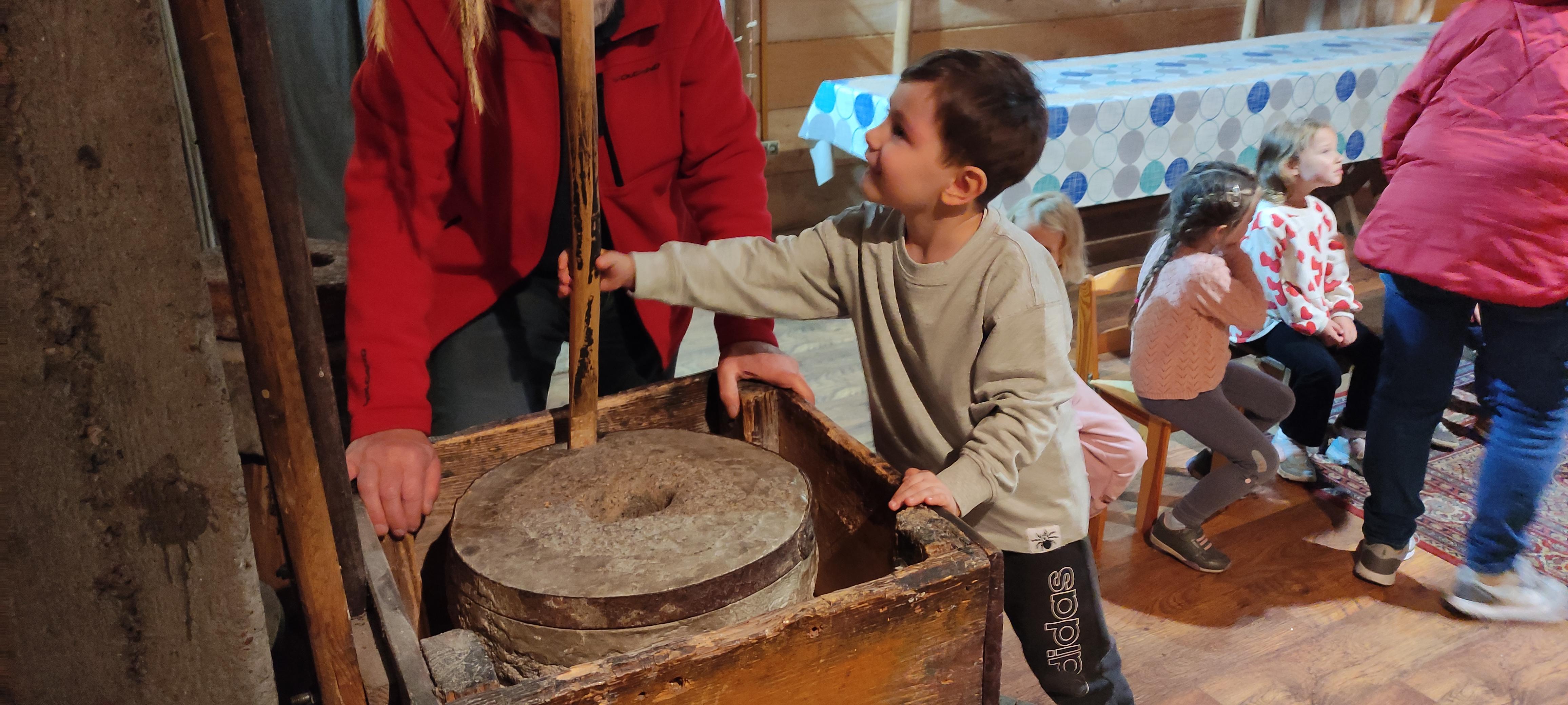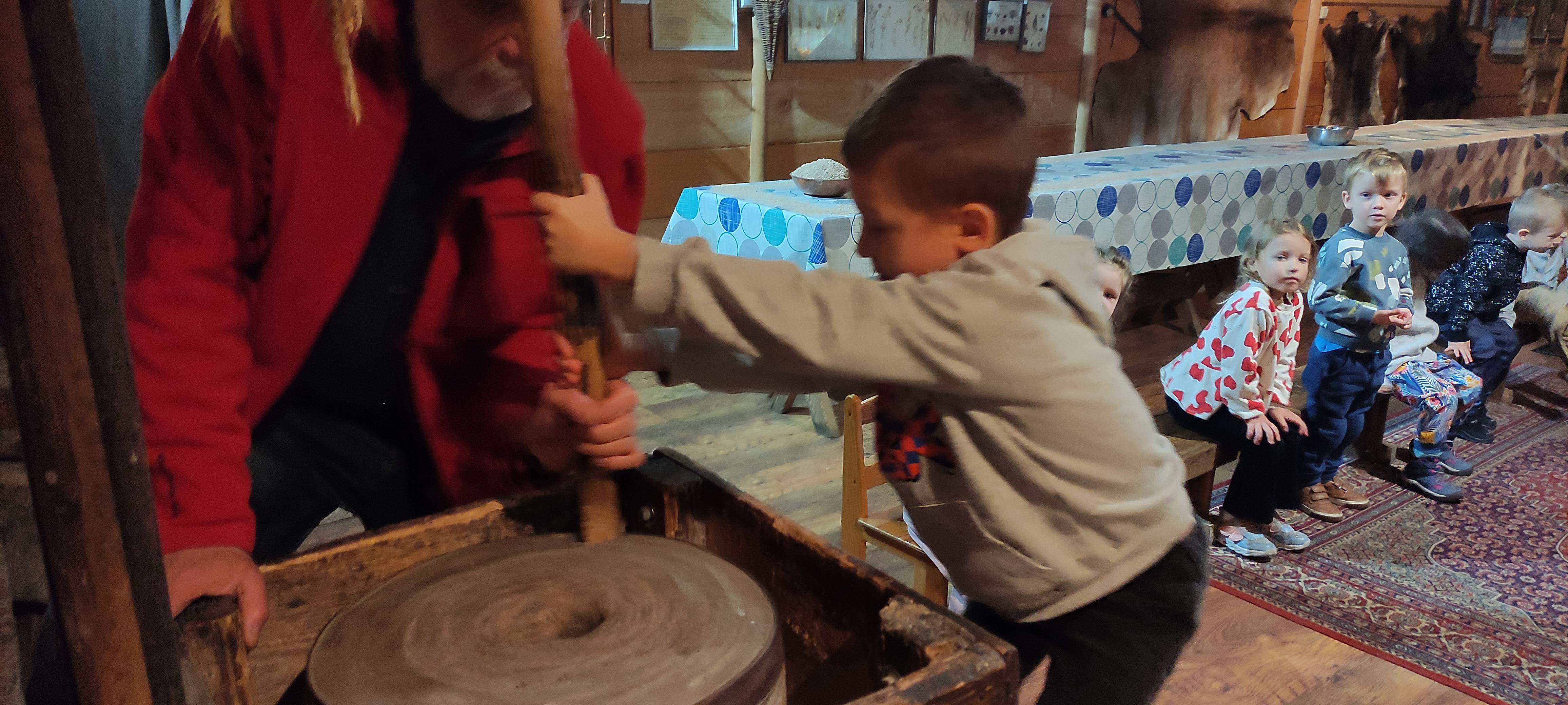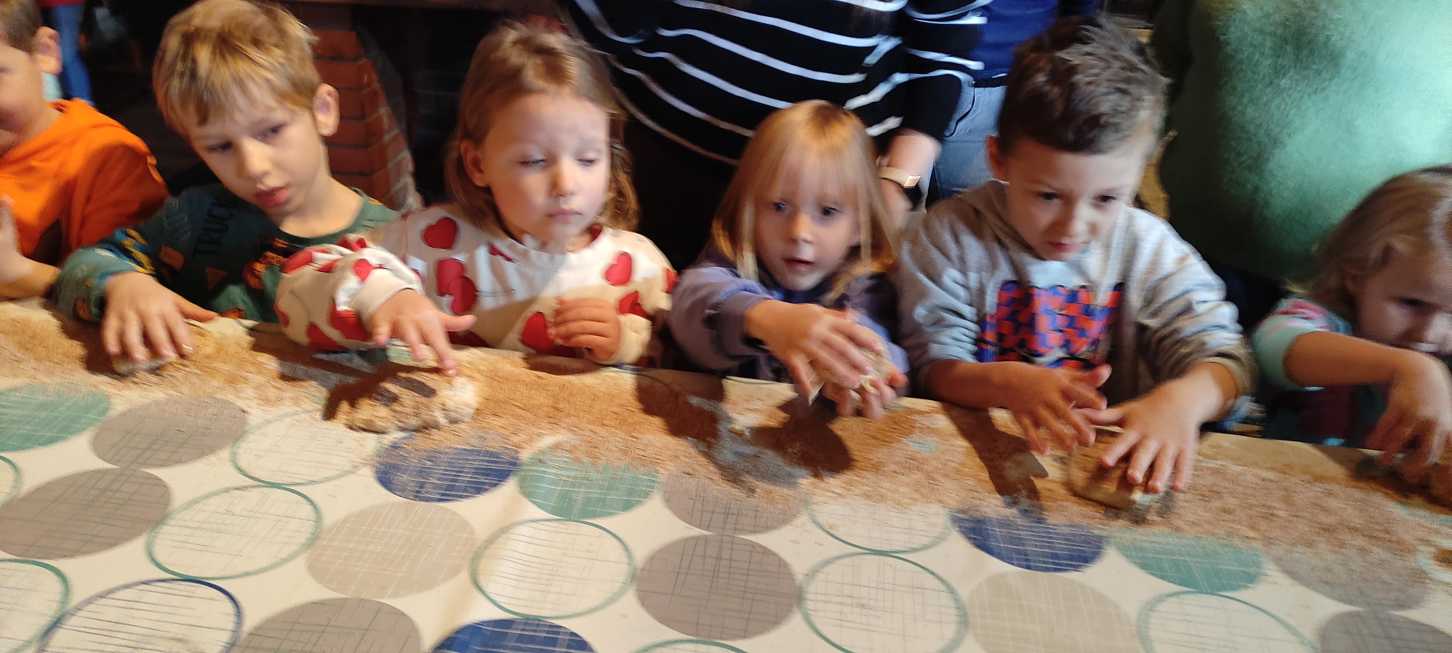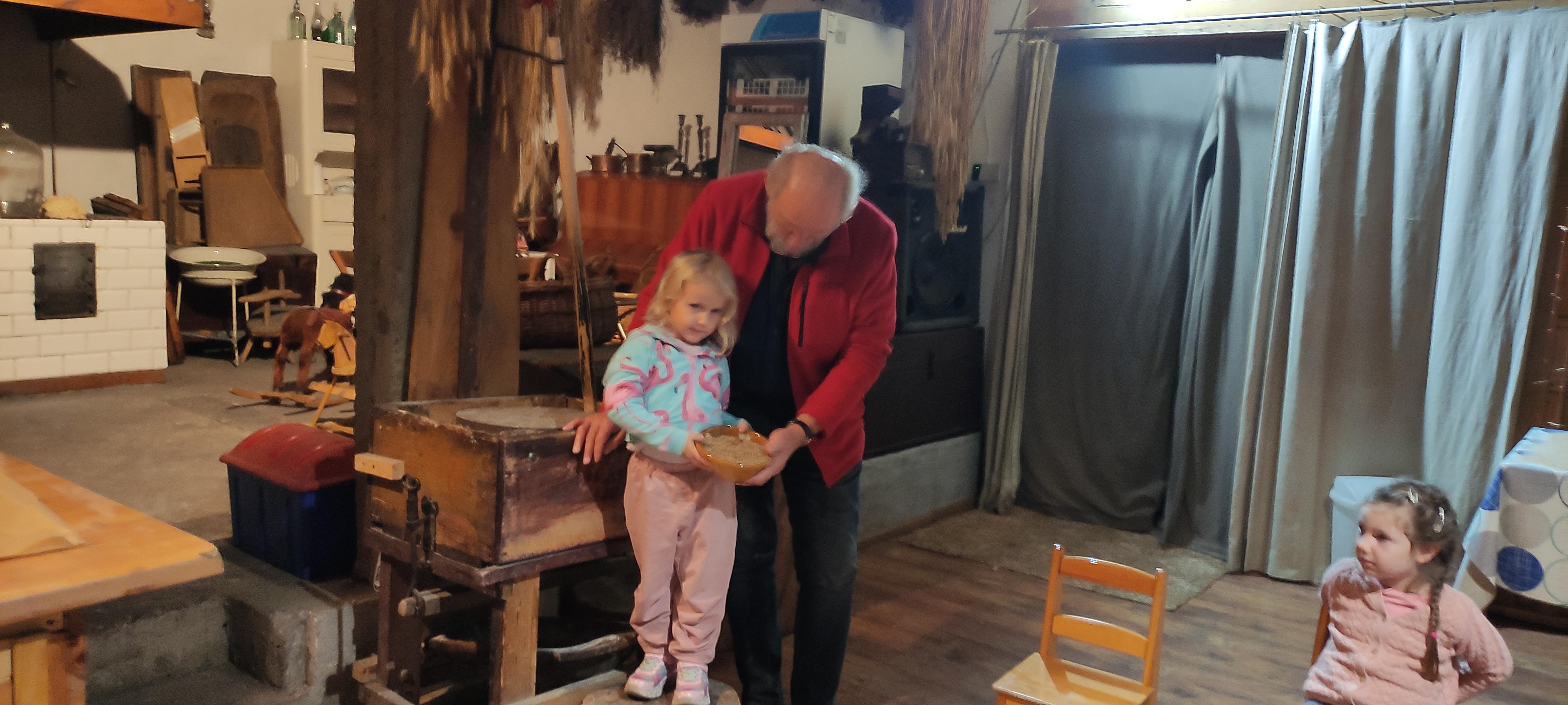 „Od kamienia do chleba” historia zbóż i chleba, mielenie ziarna na mąkę w żarnach, pokaz wyrabiania chleba, formowanie bochenków, wypiek chleba.