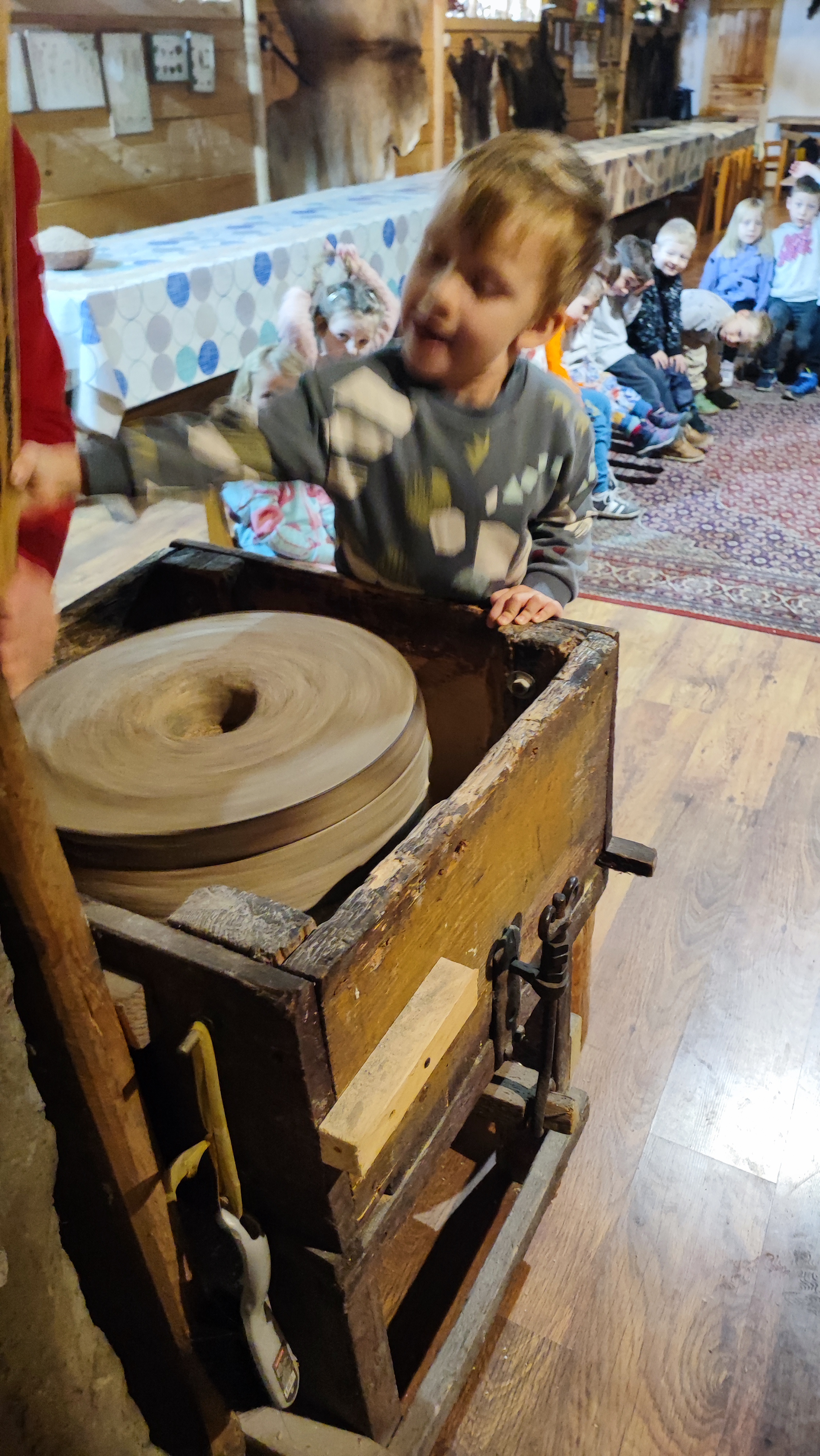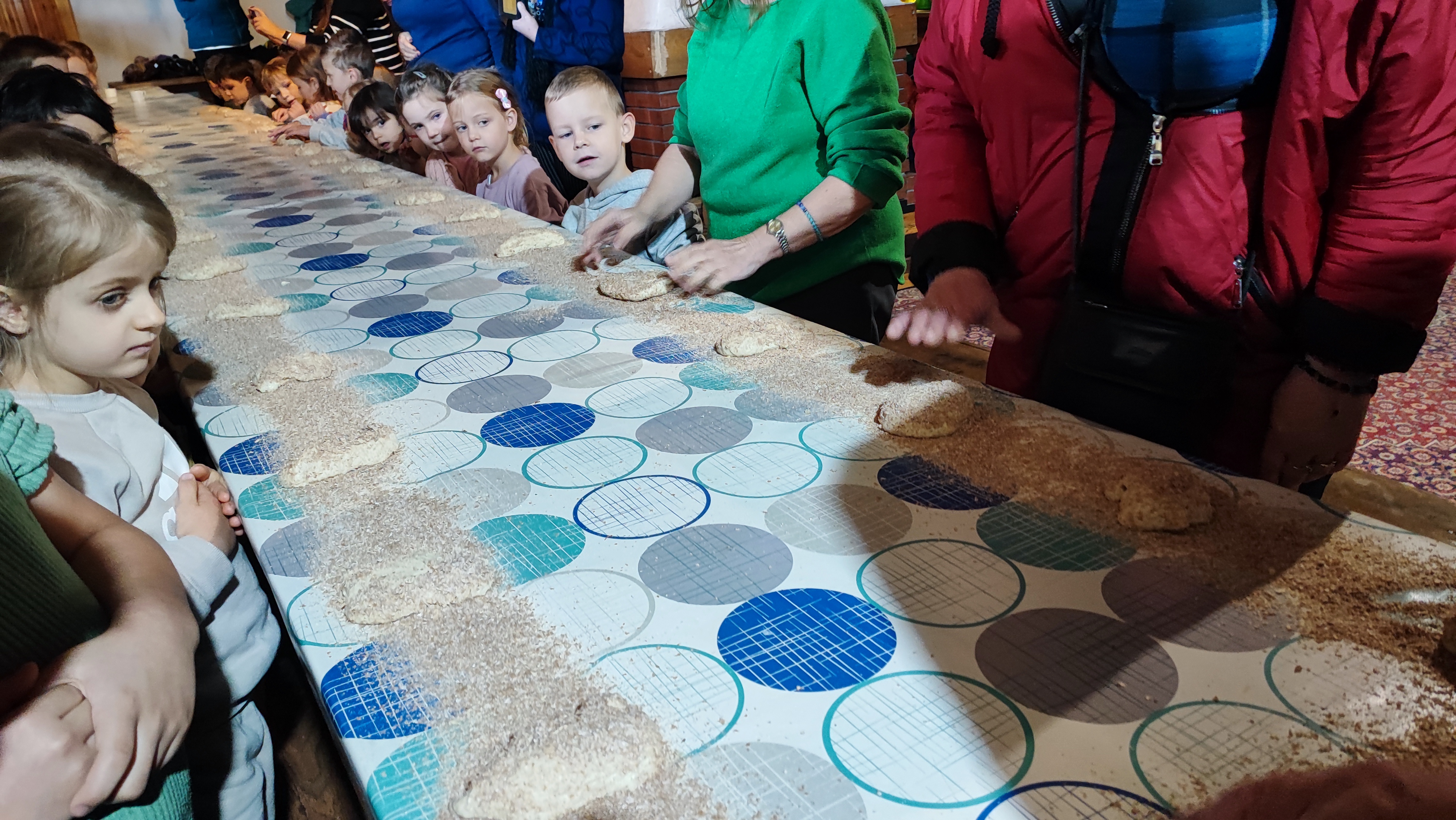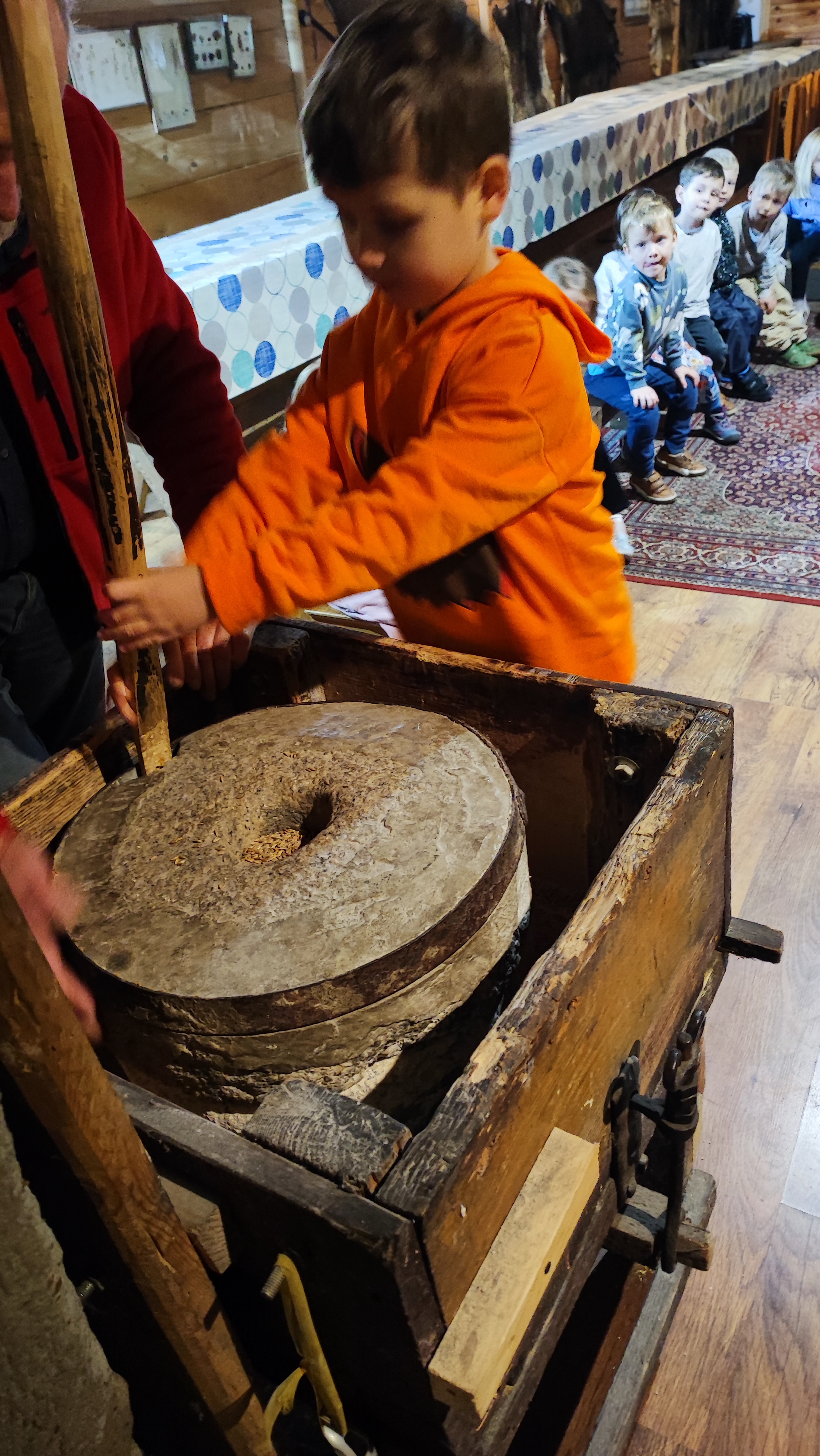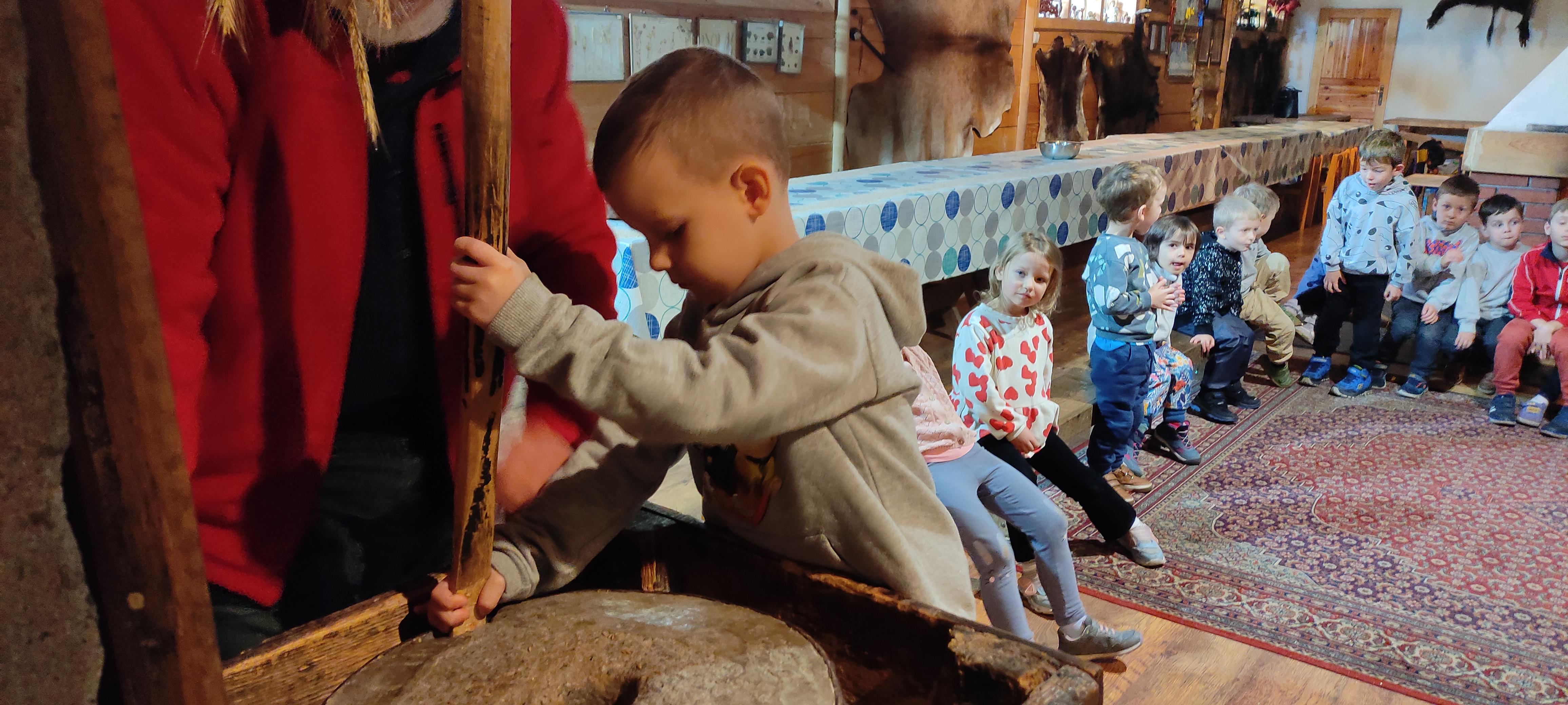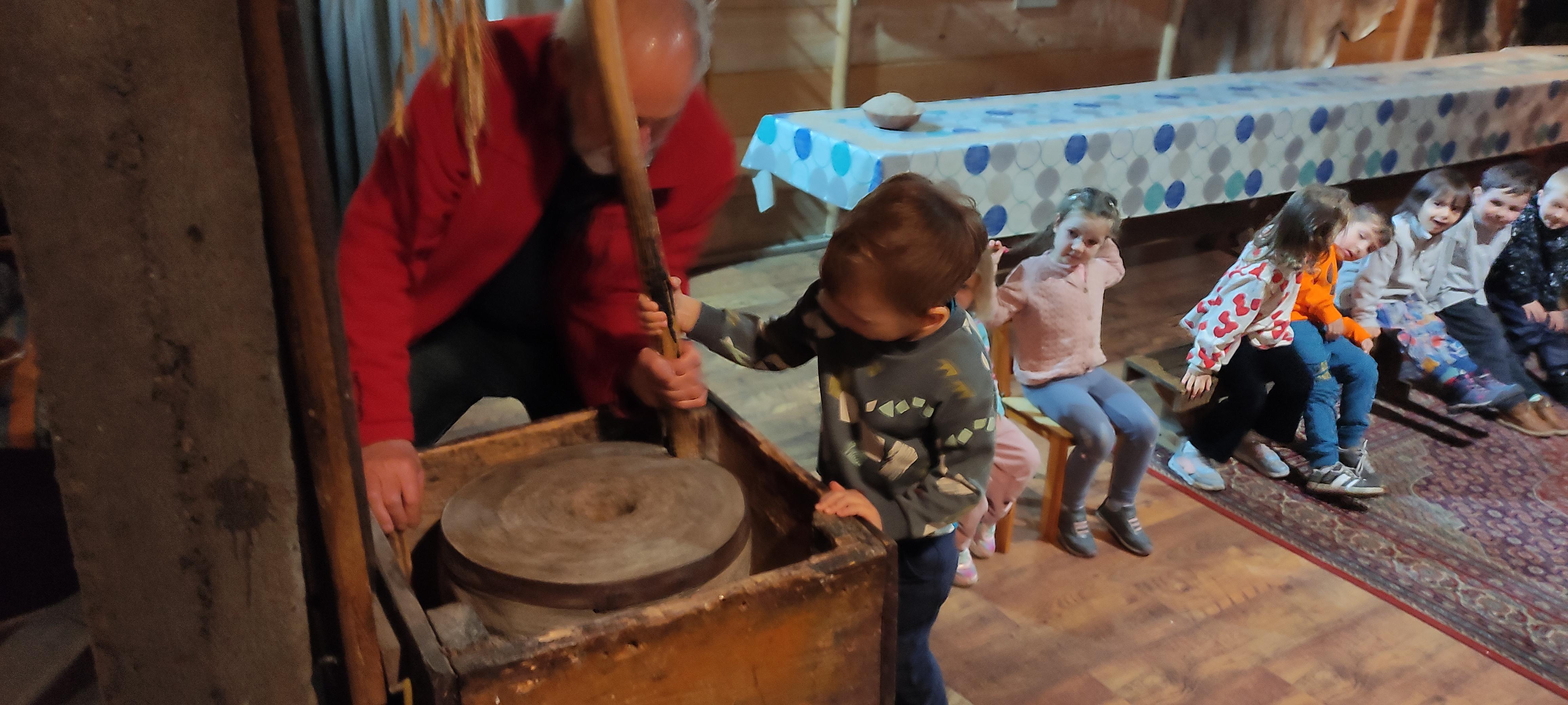 „Od kamienia do chleba” historia zbóż i chleba, mielenie ziarna na mąkę w żarnach, pokaz wyrabiania chleba, formowanie bochenków, wypiek chleba.