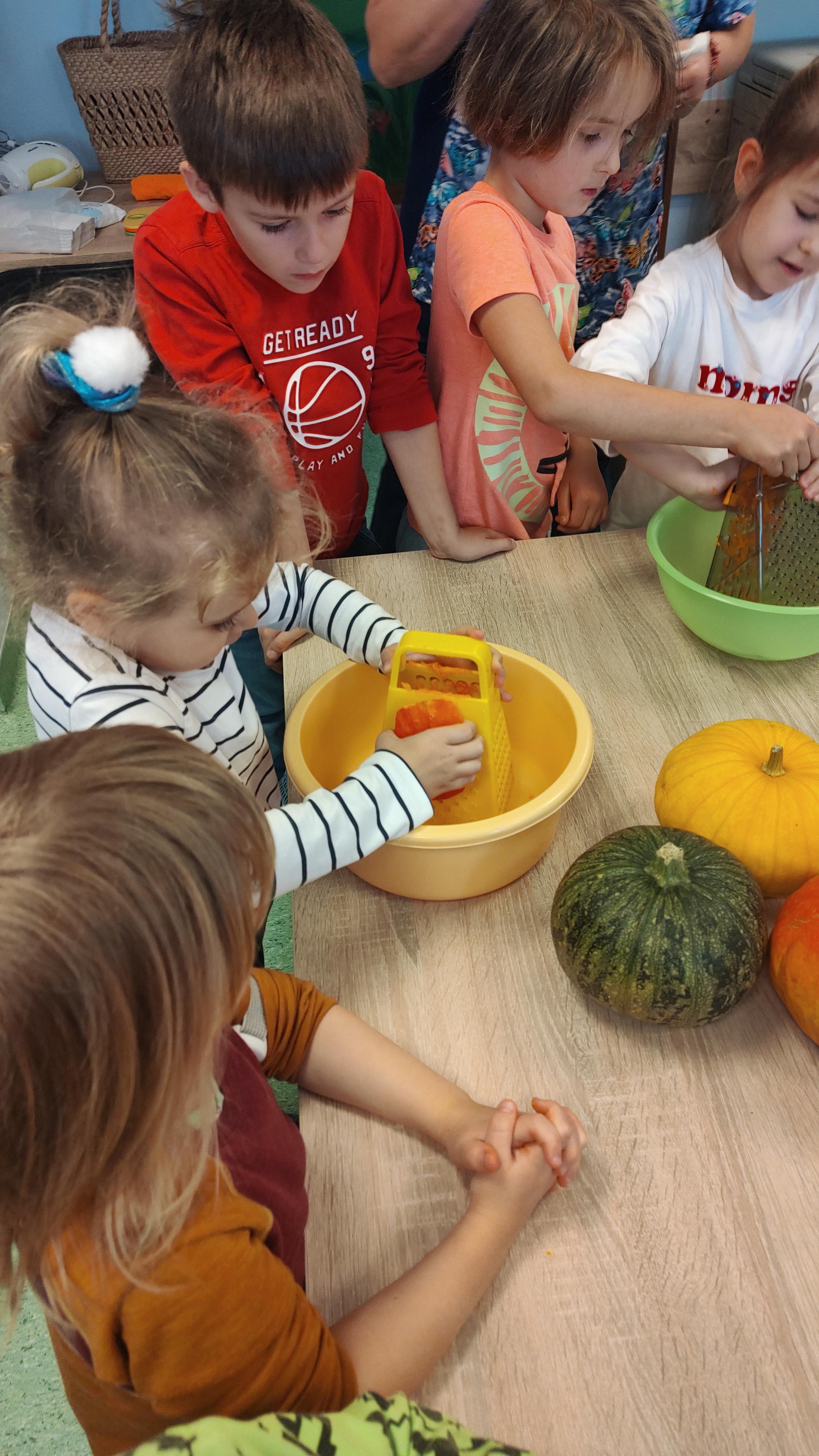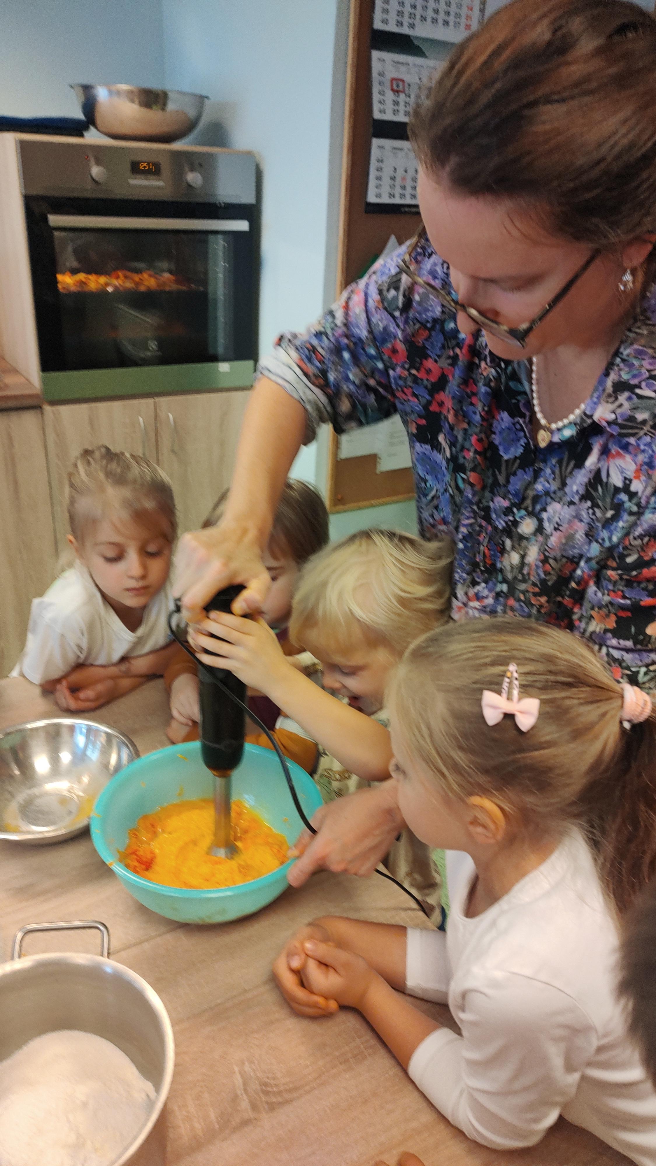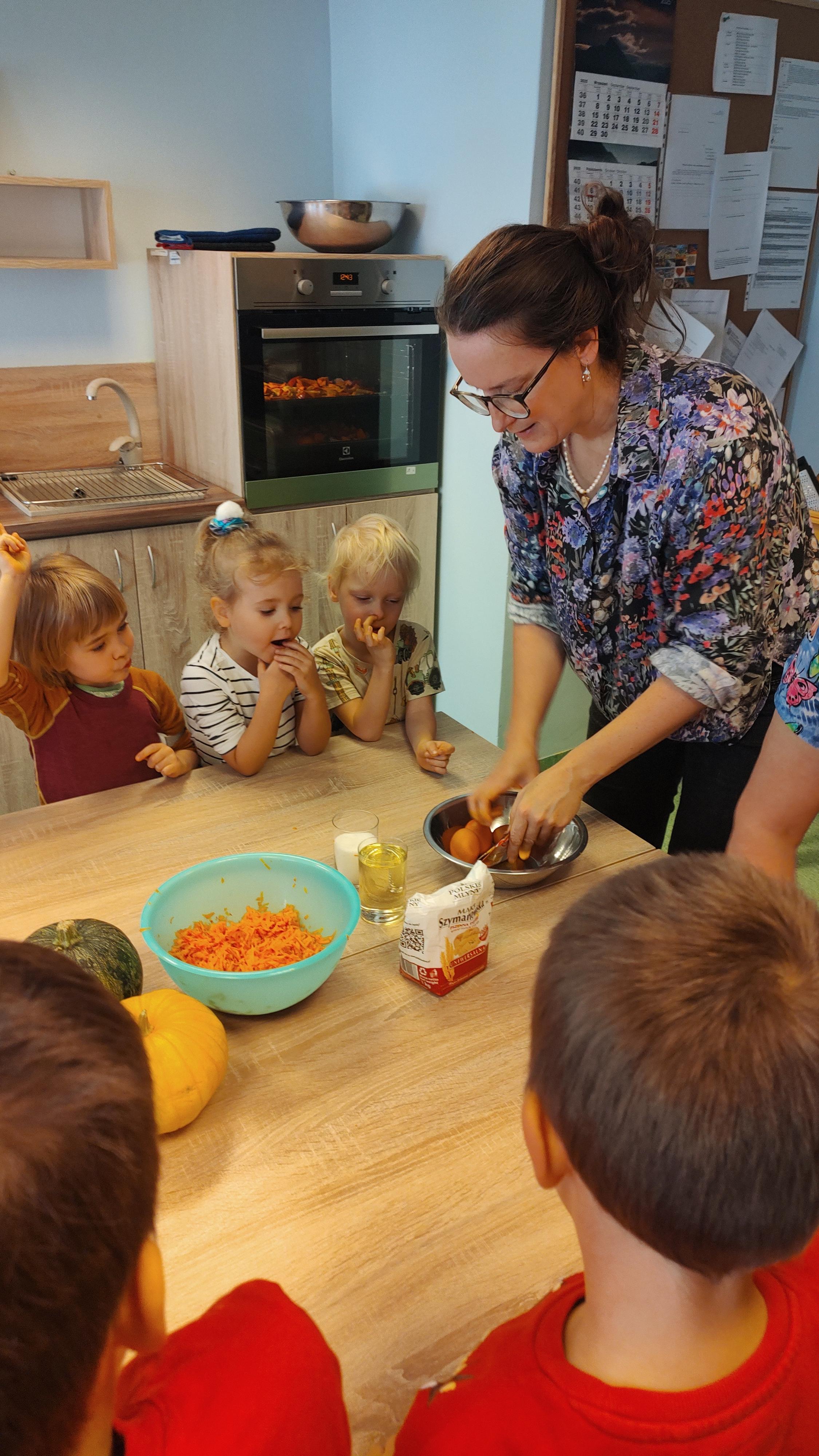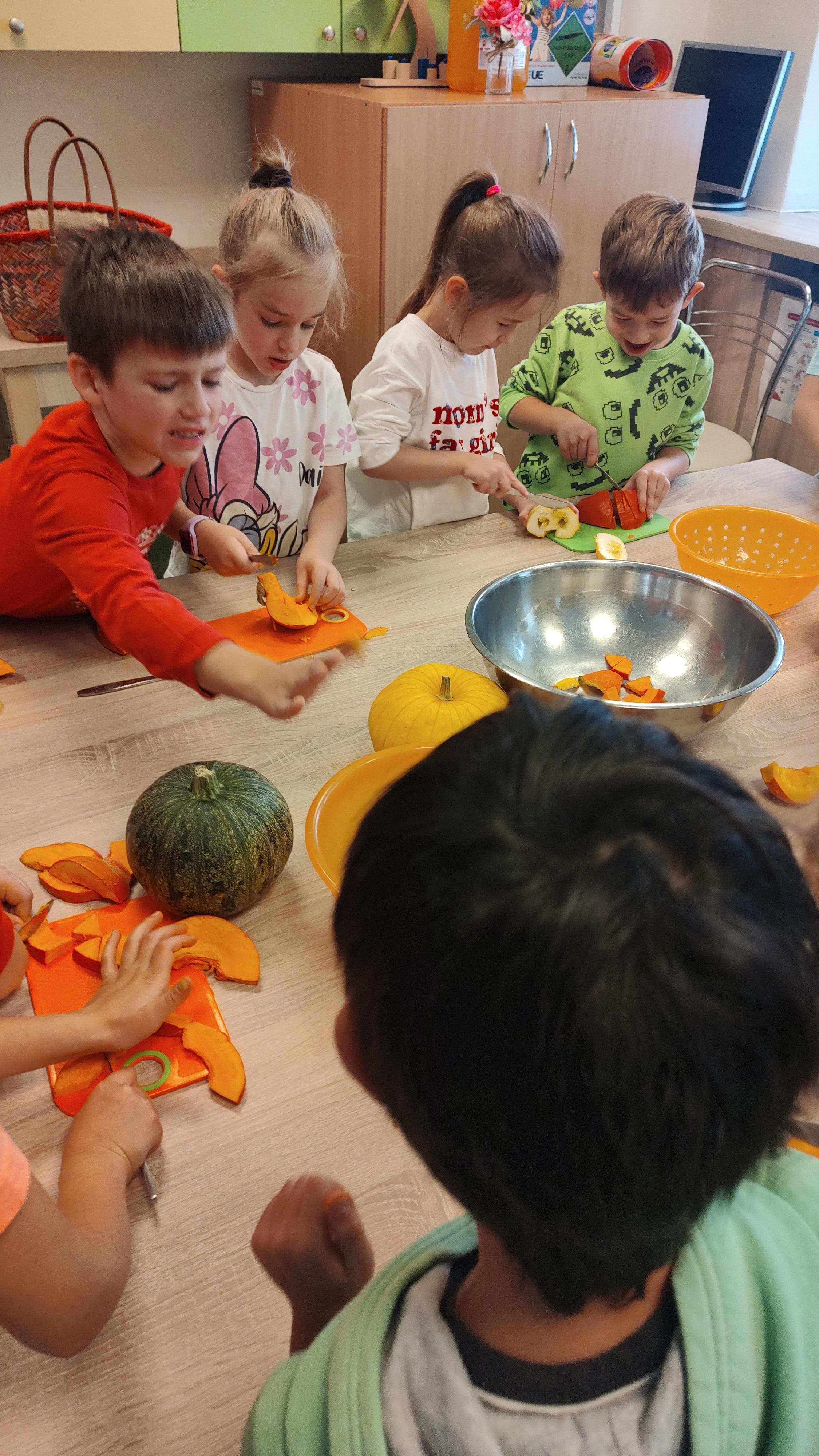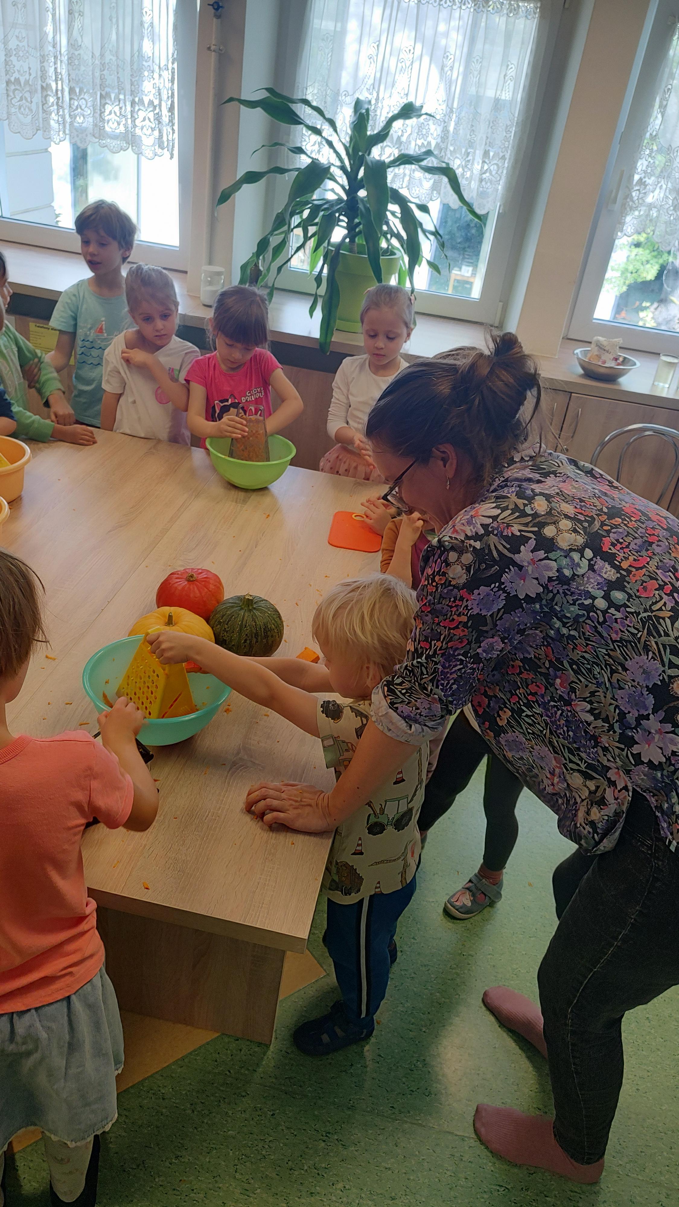 W poniedziałek 6.10.25 dzieci wspólnie z Panią Małgosią przygotowały i upiekły- dynię i ciasto dyniowe. Robota szła doskonale- było krojenie, ścieranie, mieszanie, miksowanie. Nie obyło się bez "pierwszej pomocy"! Niektóre palce ucierpiały podczas działeń! Ale było warto! Zjedliśmy dynię z przyprawami - sól, czosnek i chili i słodkie, wilgotne ciasto!