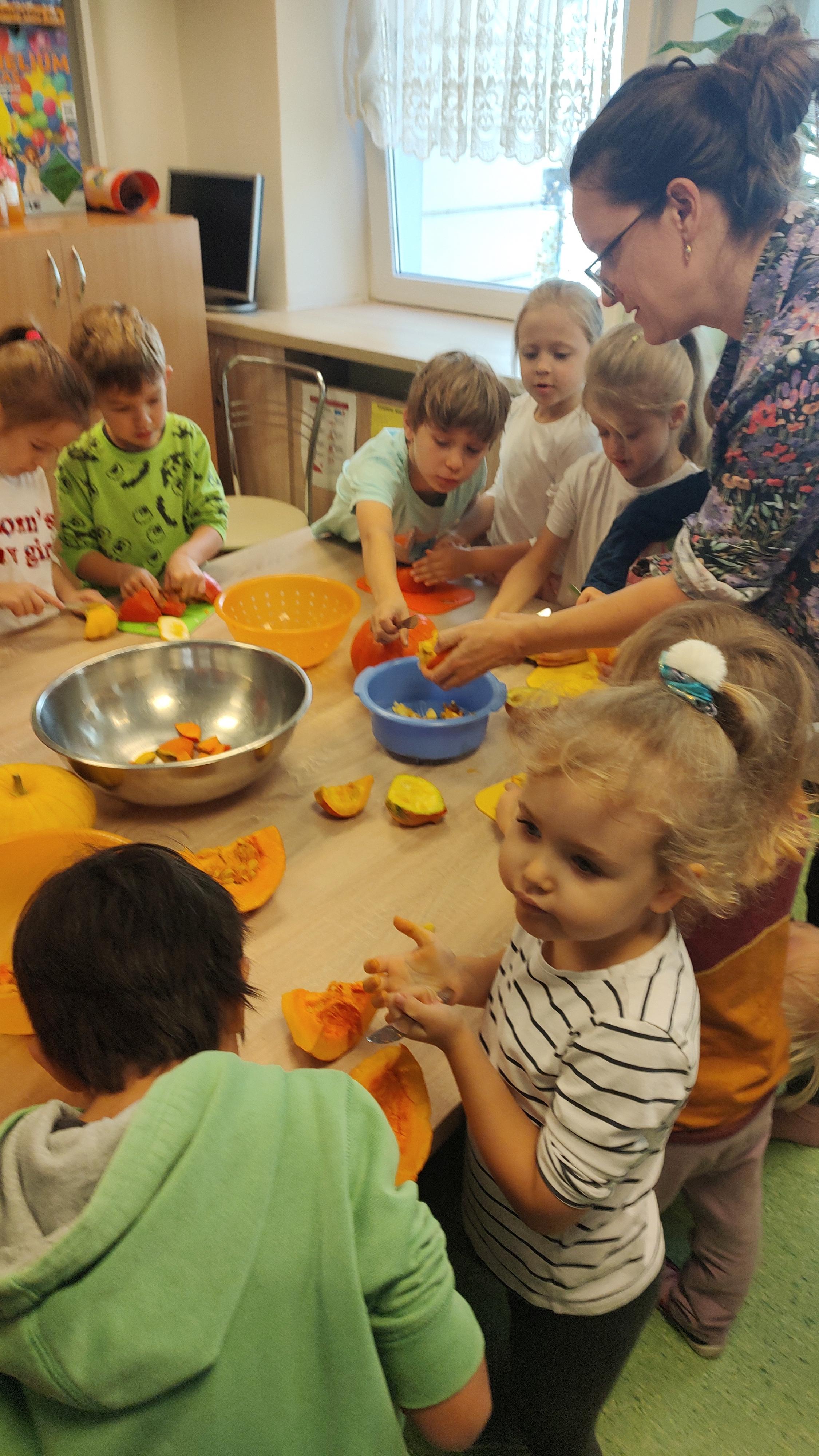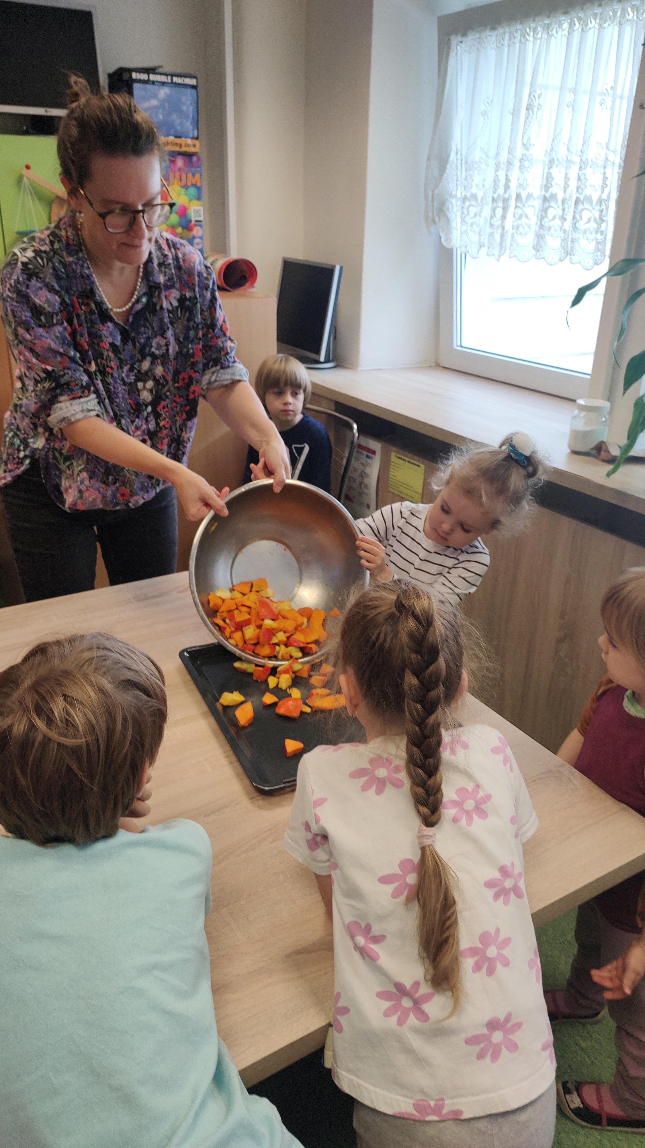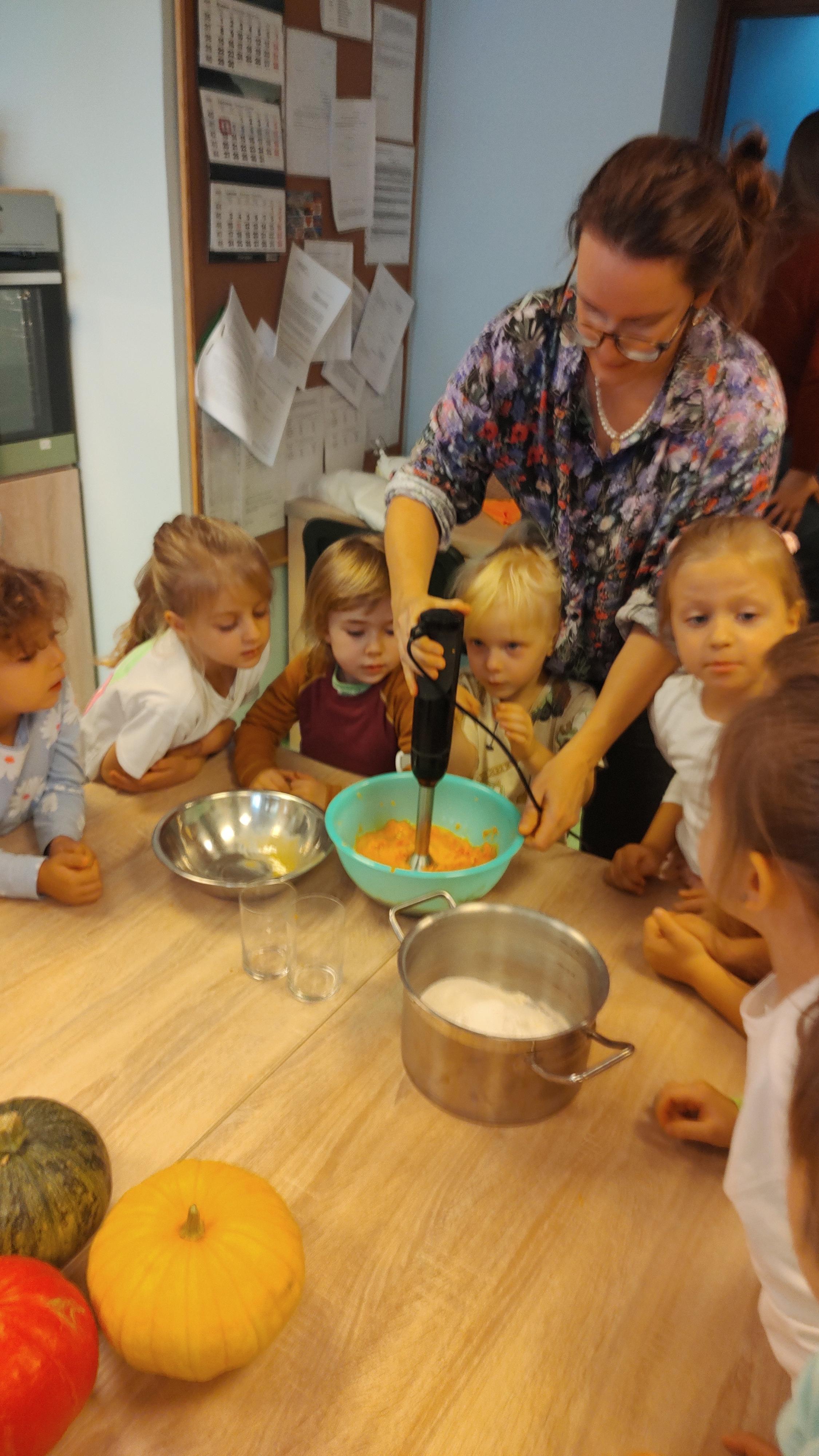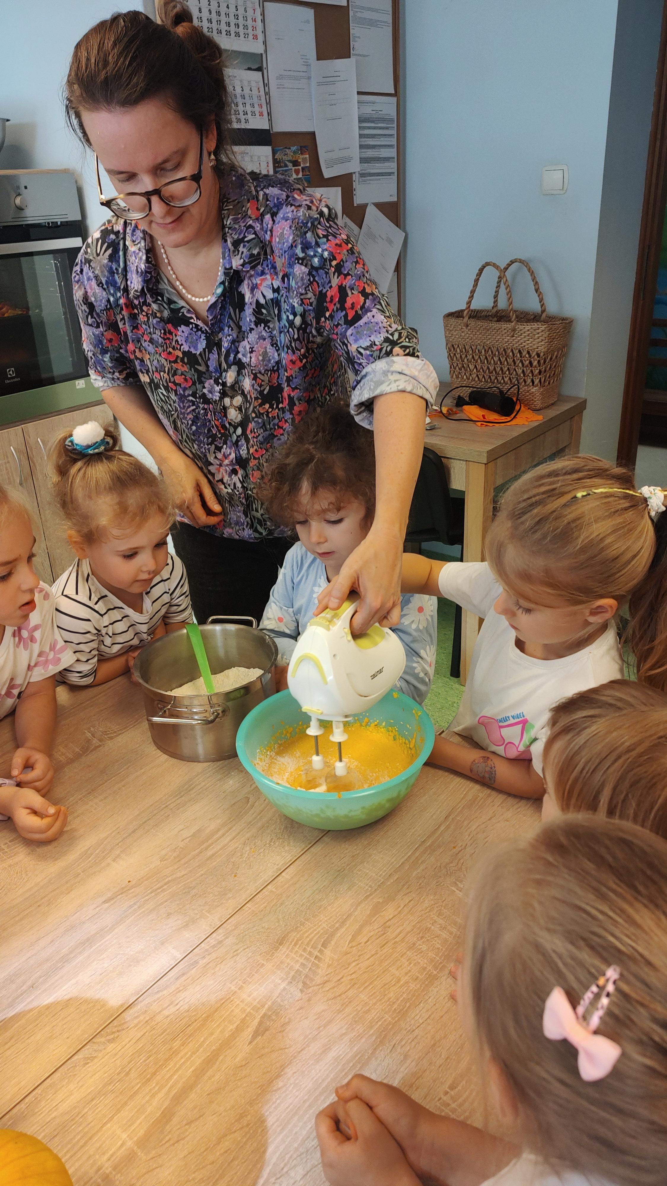 W poniedziałek 6.10.25 dzieci wspólnie z Panią Małgosią przygotowały i upiekły- dynię i ciasto dyniowe. Robota szła doskonale- było krojenie, ścieranie, mieszanie, miksowanie. Nie obyło się bez "pierwszej pomocy"! Niektóre palce ucierpiały podczas działeń! Ale było warto! Zjedliśmy dynię z przyprawami - sól, czosnek i chili i słodkie, wilgotne ciasto!