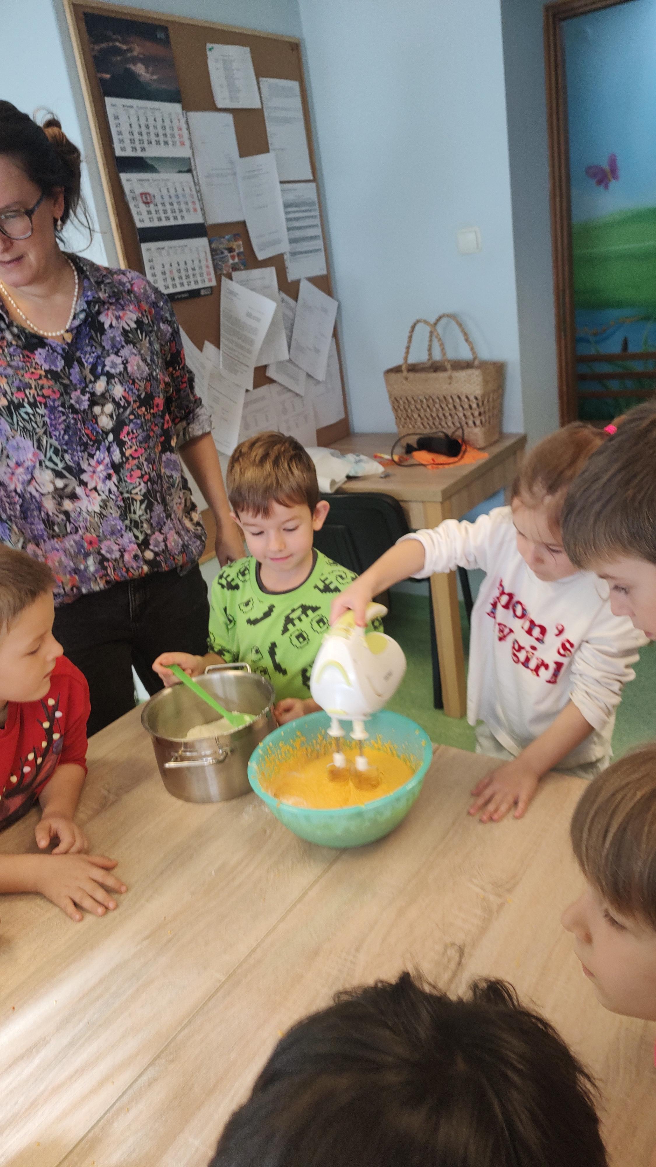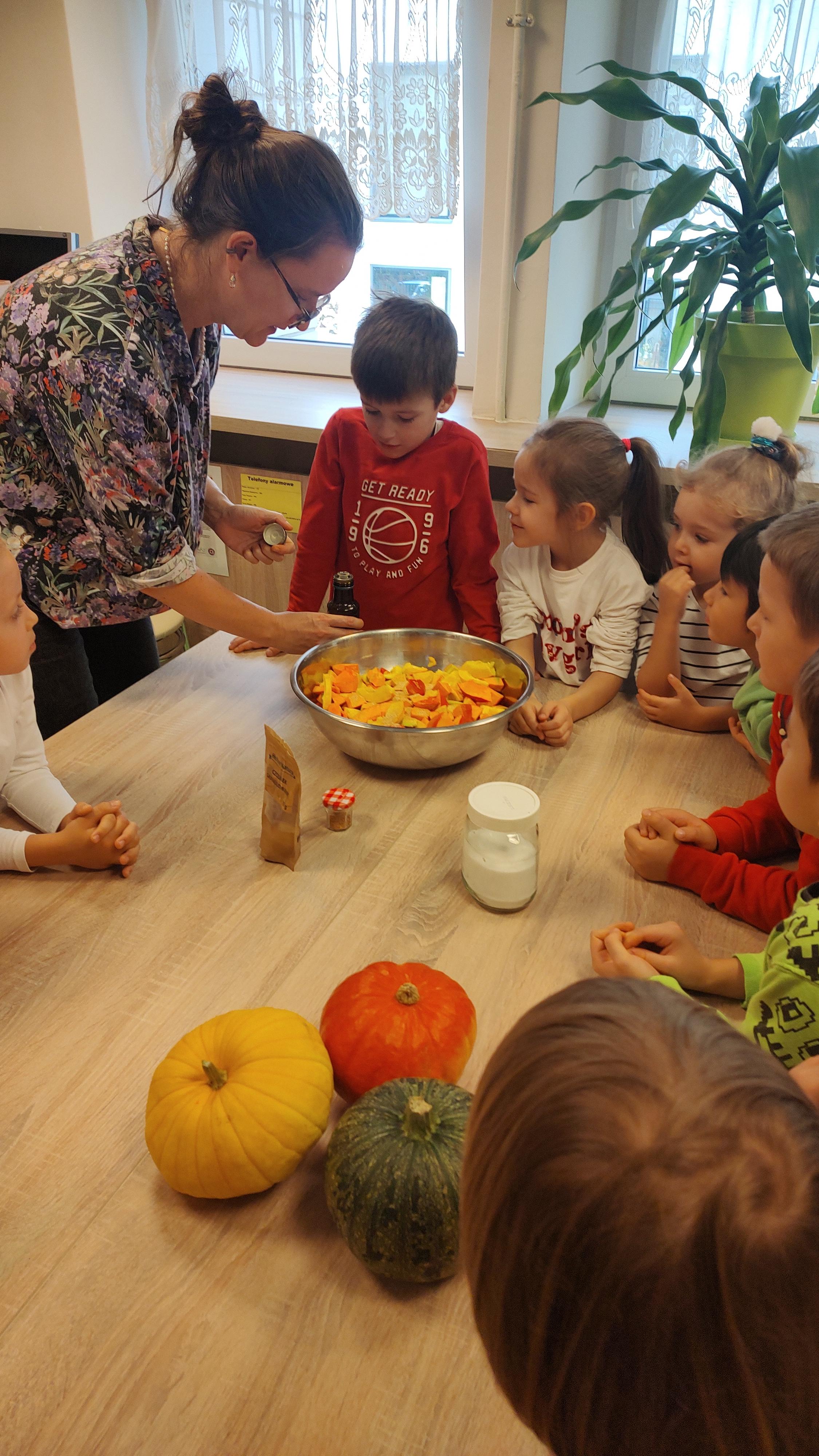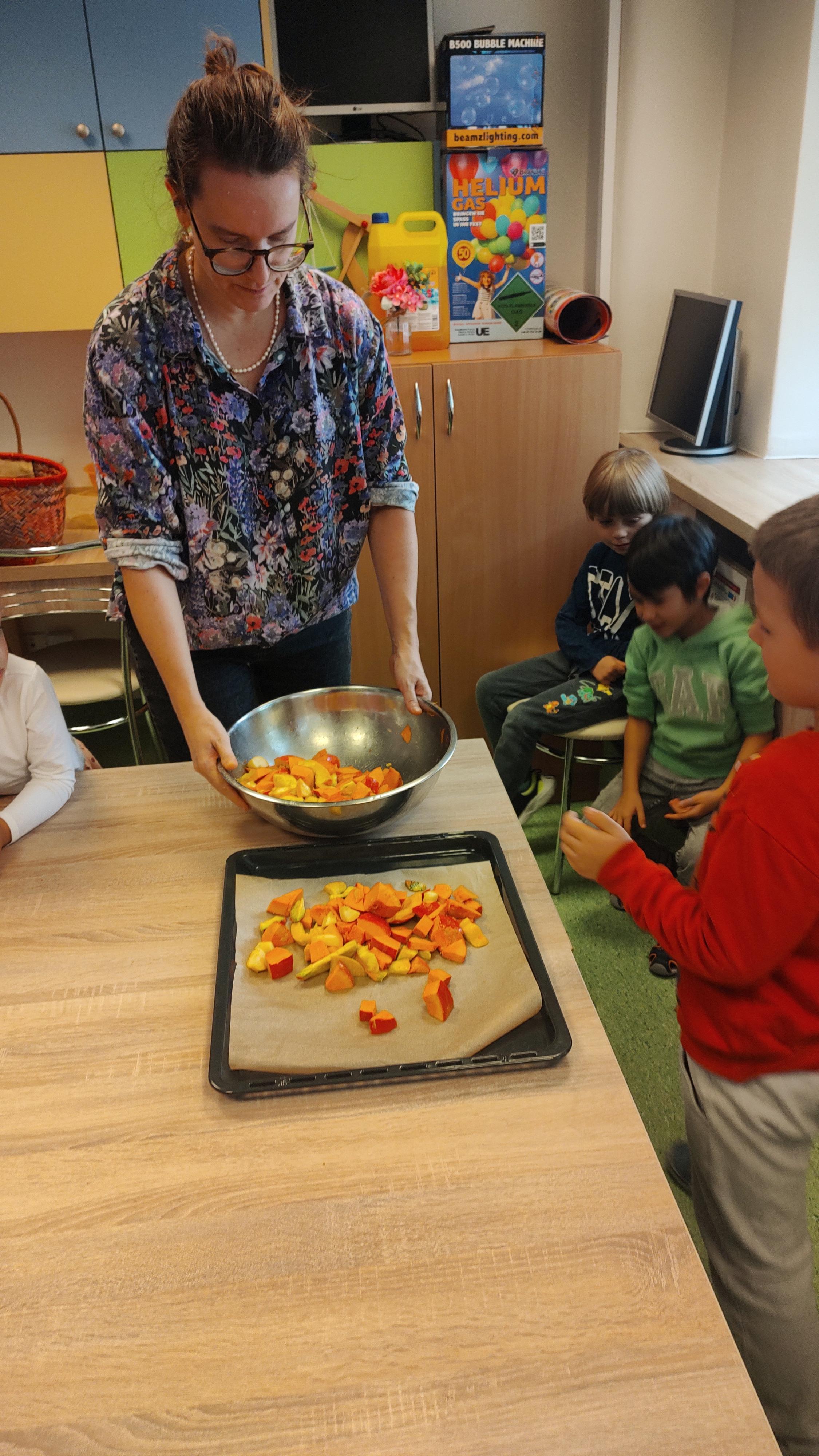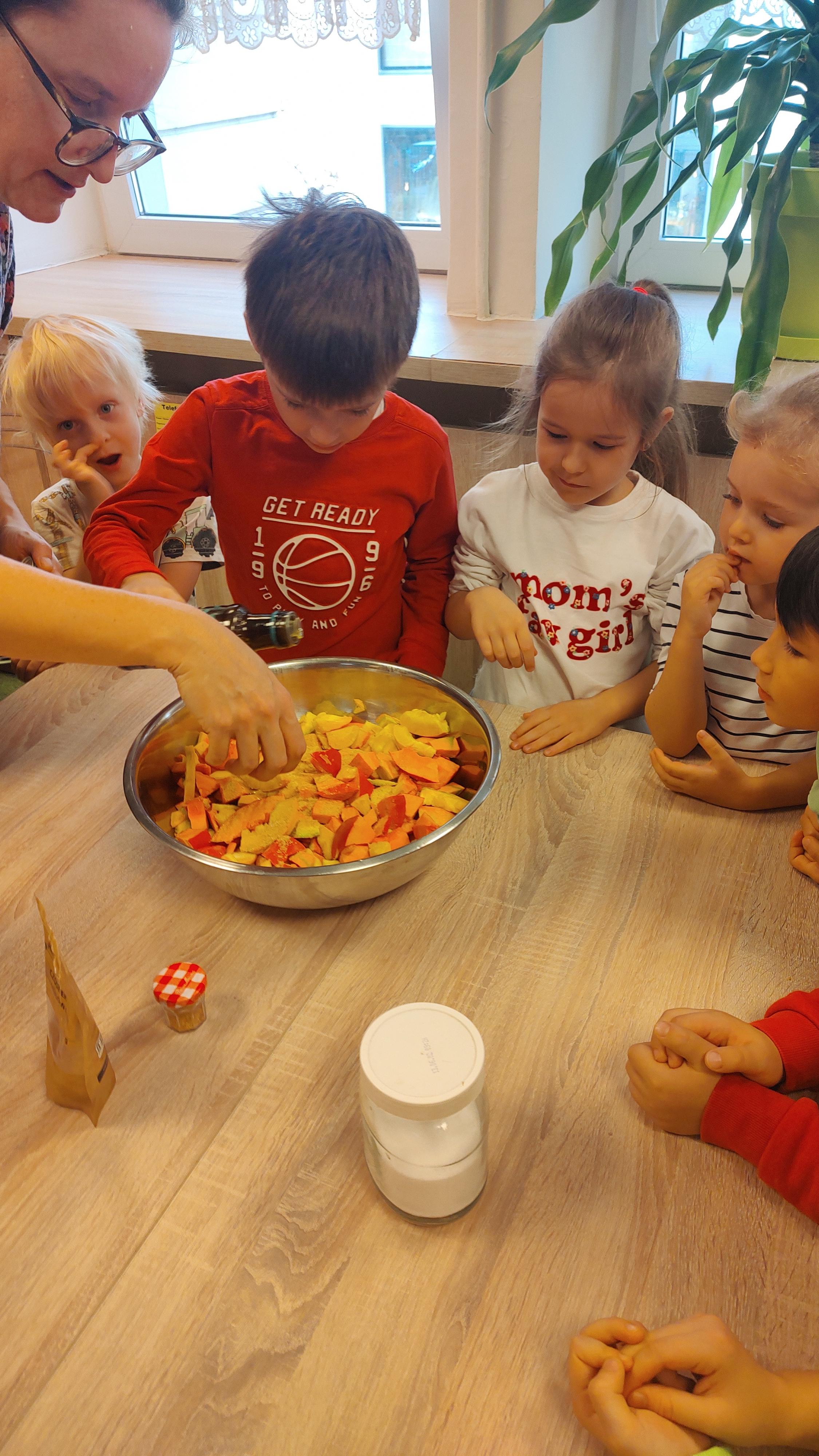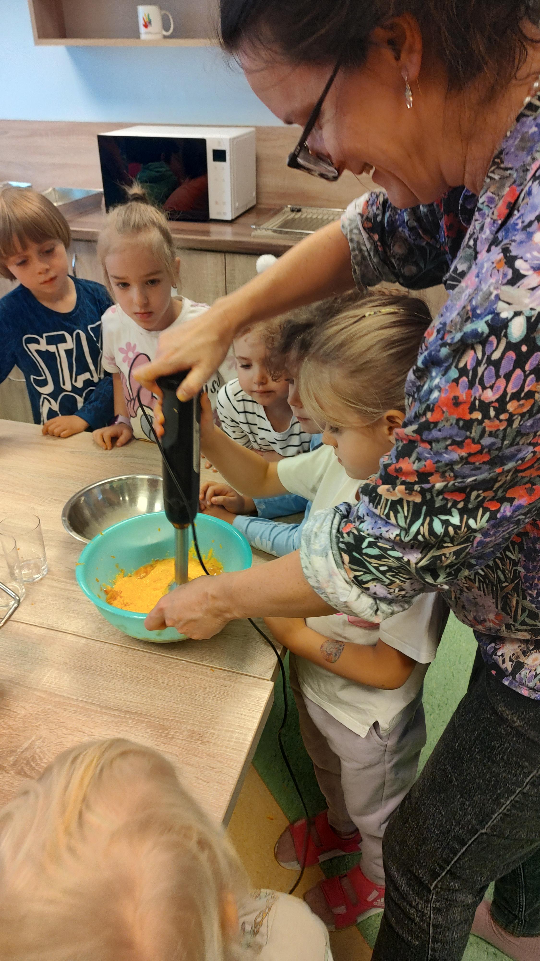 W poniedziałek 6.10.25 dzieci wspólnie z Panią Małgosią przygotowały i upiekły- dynię i ciasto dyniowe. Robota szła doskonale- było krojenie, ścieranie, mieszanie, miksowanie. Nie obyło się bez "pierwszej pomocy"! Niektóre palce ucierpiały podczas działeń! Ale było warto! Zjedliśmy dynię z przyprawami - sól, czosnek i chili i słodkie, wilgotne ciasto!
