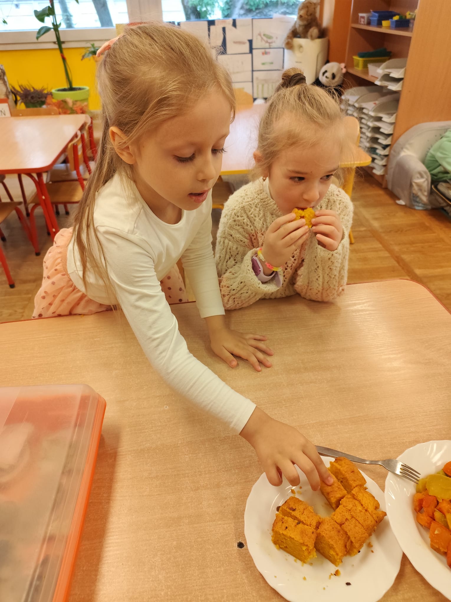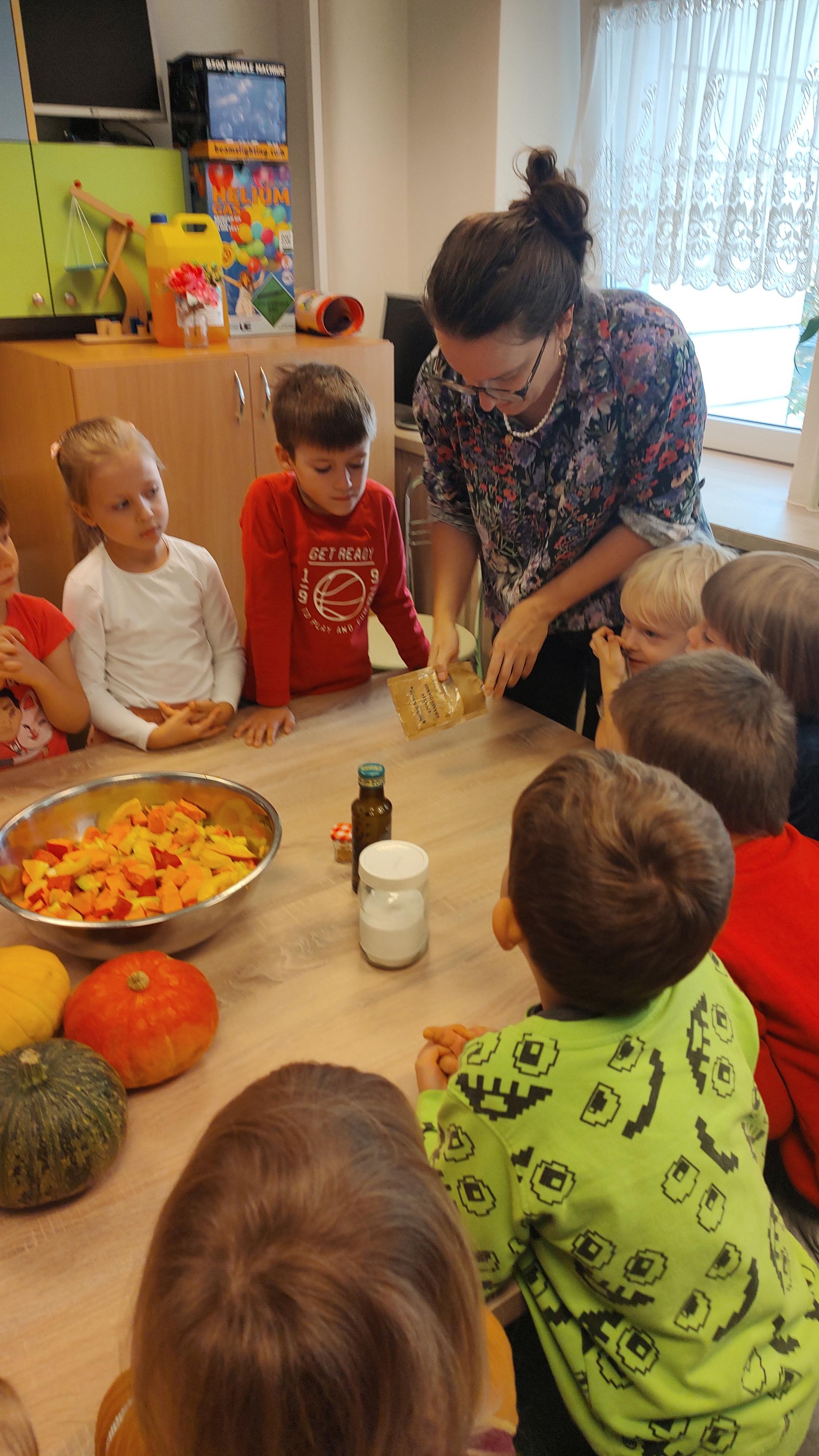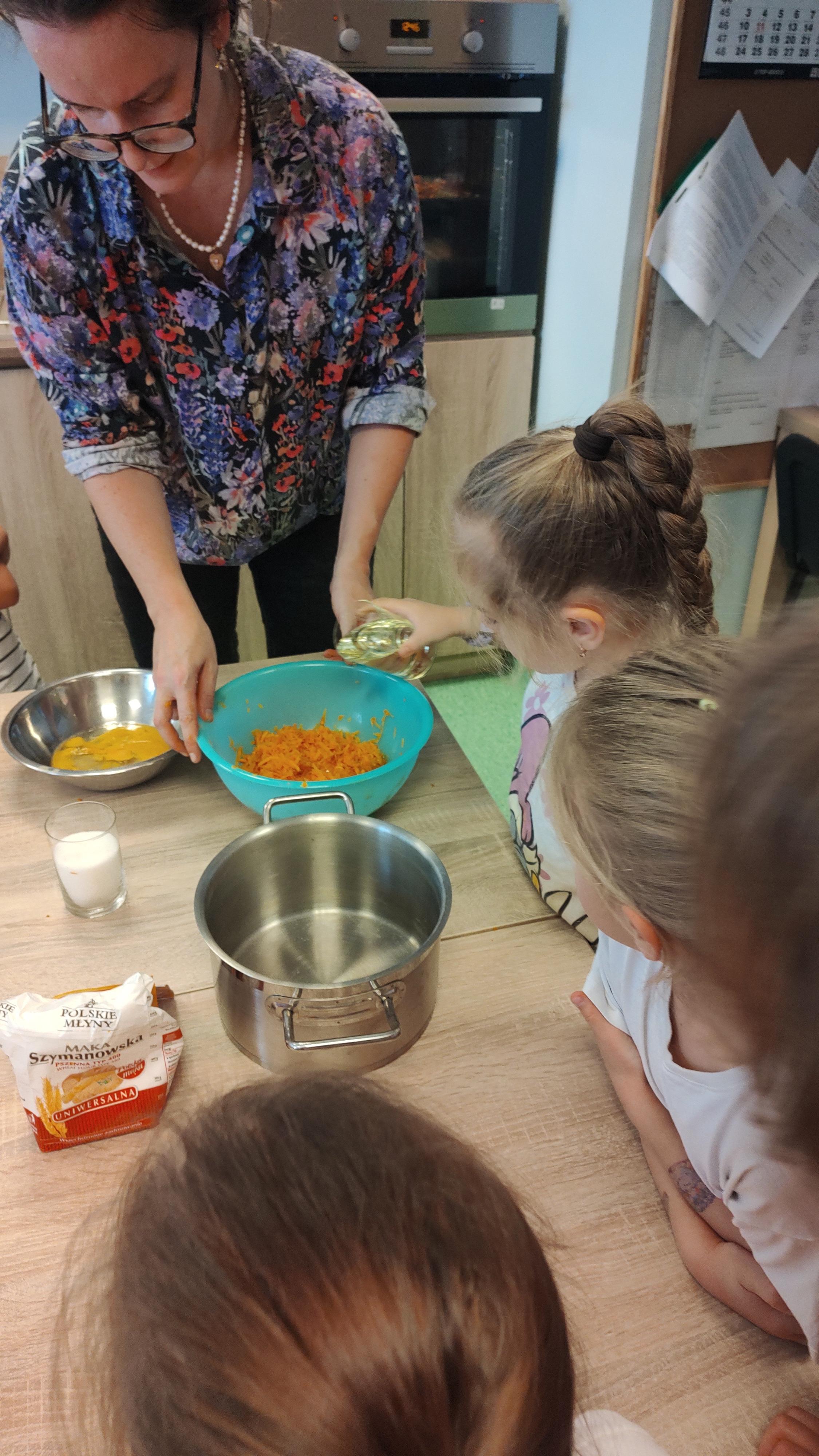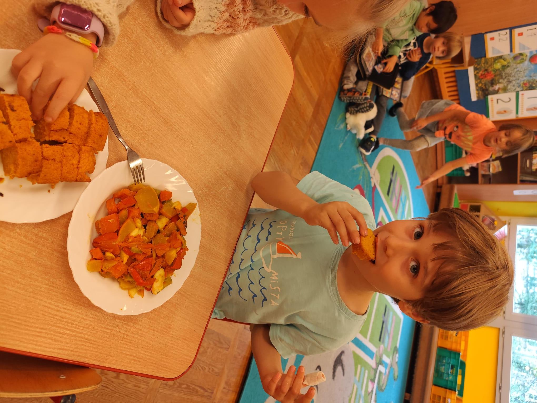 W poniedziałek 6.10.25 dzieci wspólnie z Panią Małgosią przygotowały i upiekły- dynię i ciasto dyniowe. Robota szła doskonale- było krojenie, ścieranie, mieszanie, miksowanie. Nie obyło się bez "pierwszej pomocy"! Niektóre palce ucierpiały podczas działeń! Ale było warto! Zjedliśmy dynię z przyprawami - sól, czosnek i chili i słodkie, wilgotne ciasto!