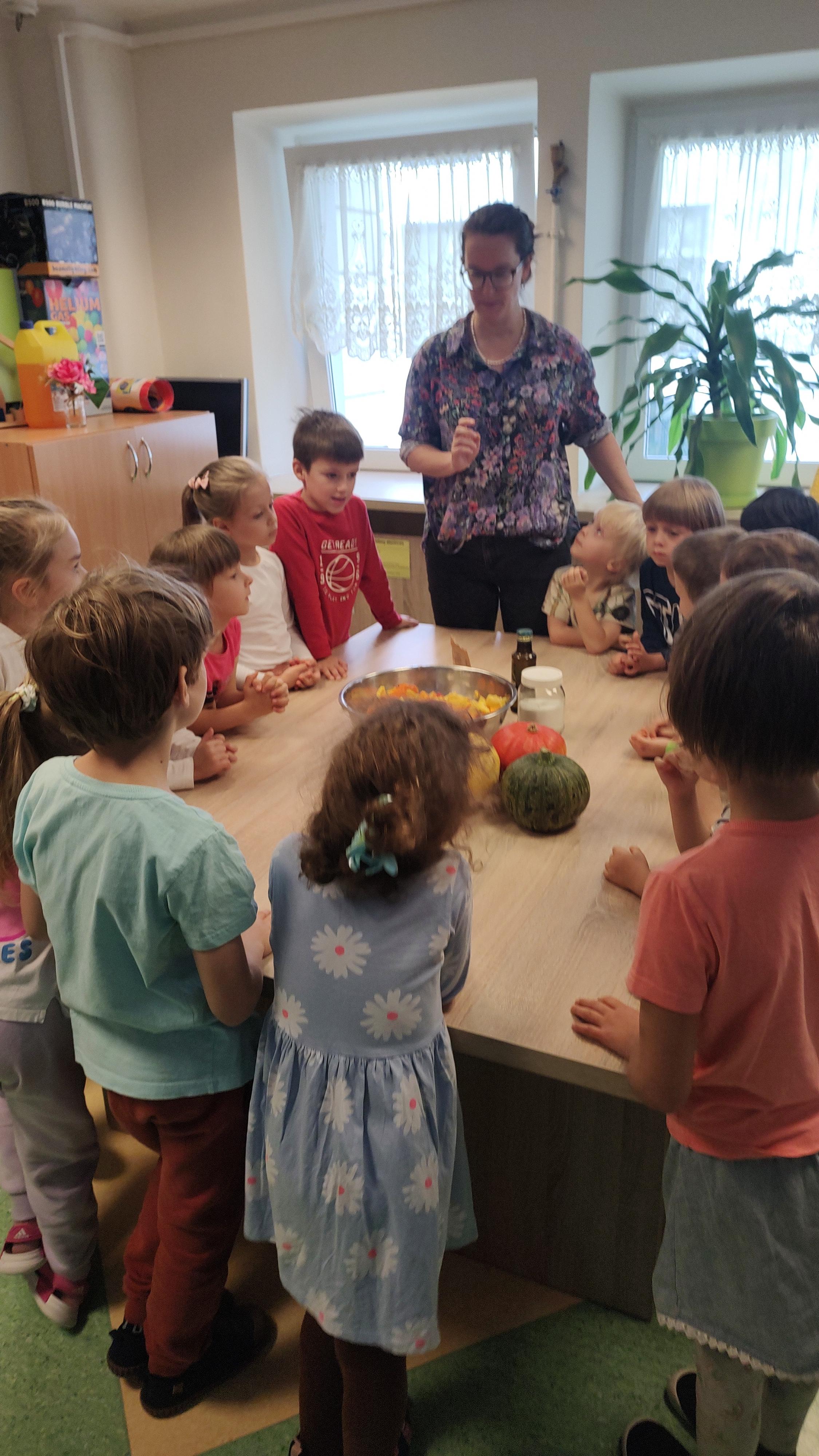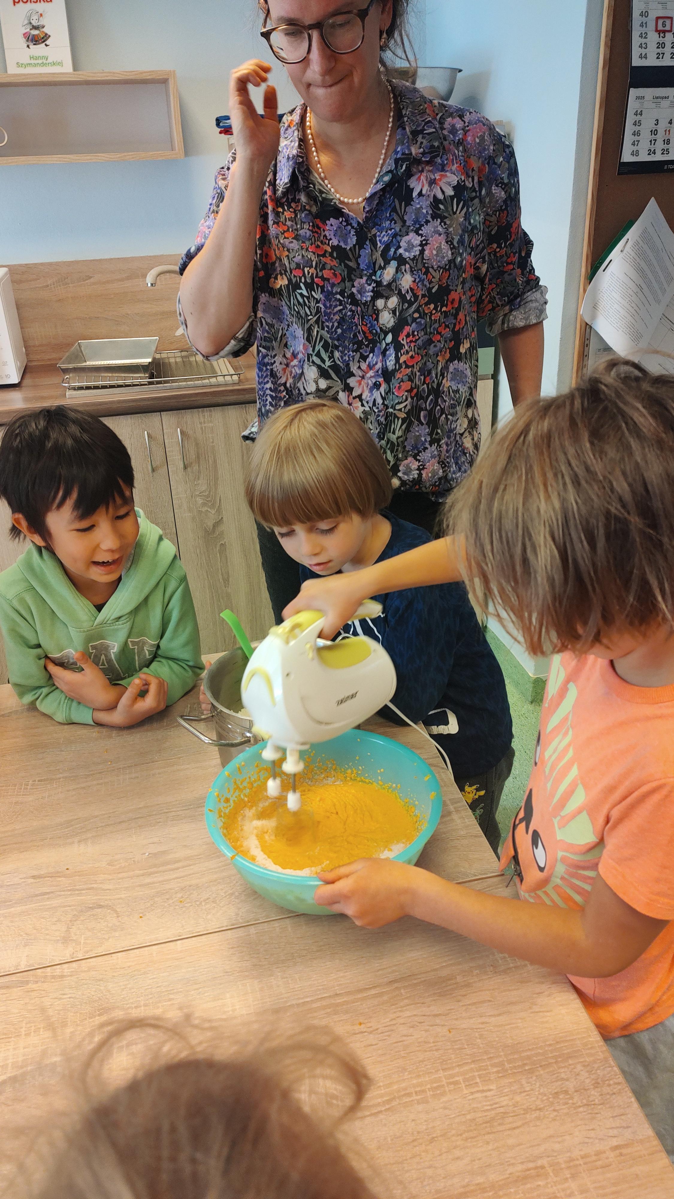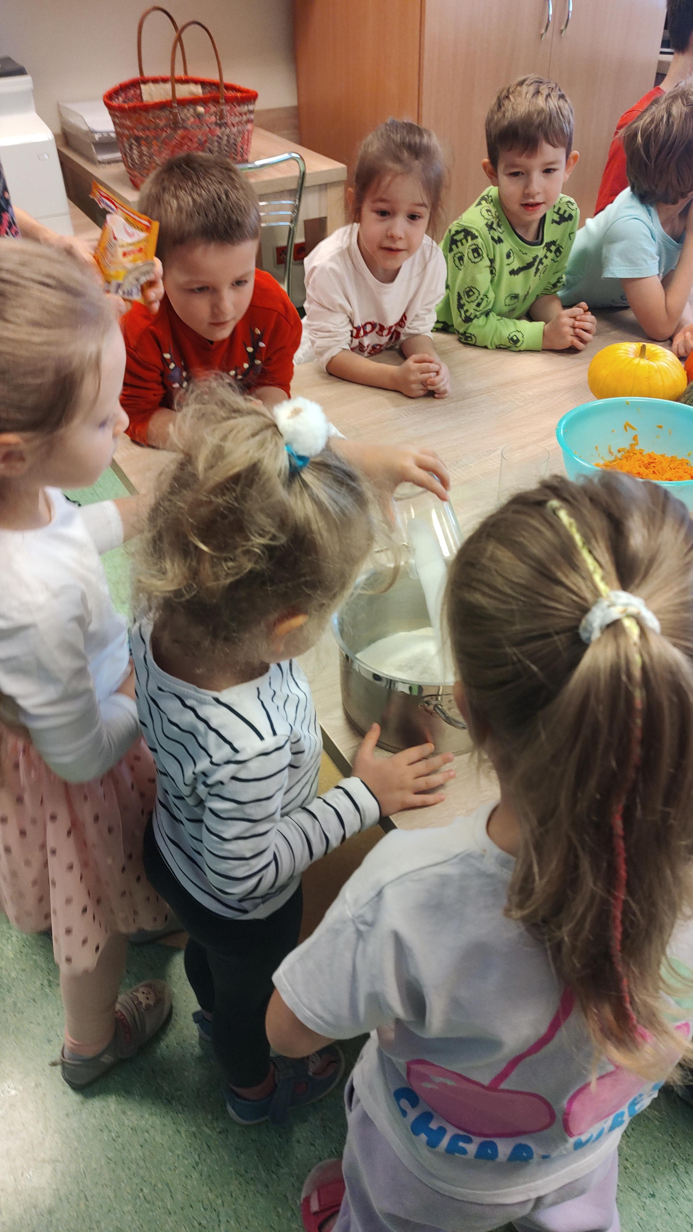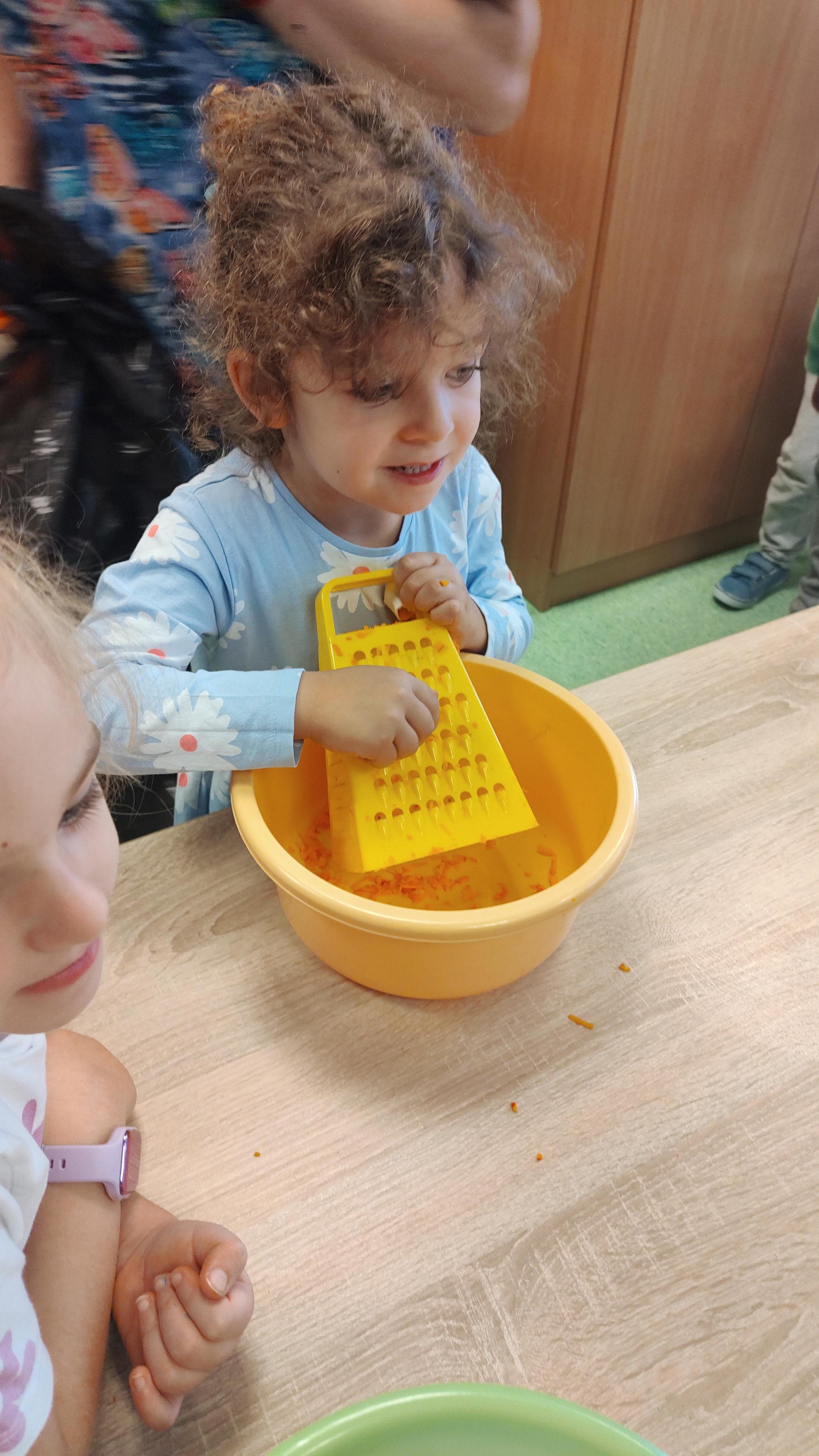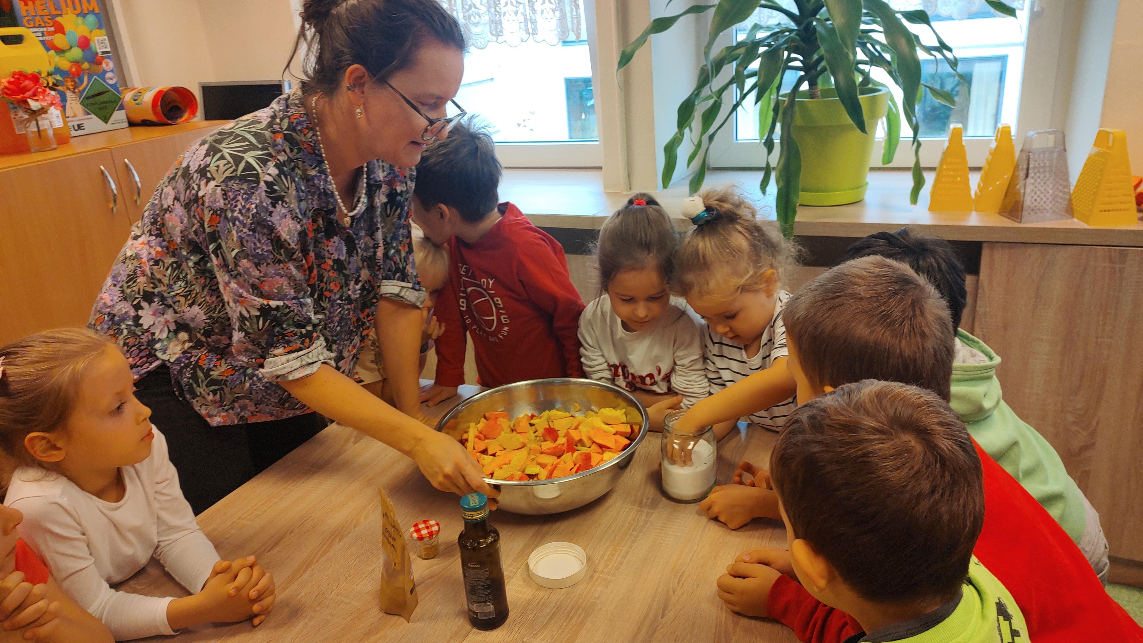 W poniedziałek 6.10.25 dzieci wspólnie z Panią Małgosią przygotowały i upiekły- dynię i ciasto dyniowe. Robota szła doskonale- było krojenie, ścieranie, mieszanie, miksowanie. Nie obyło się bez "pierwszej pomocy"! Niektóre palce ucierpiały podczas działeń! Ale było warto! Zjedliśmy dynię z przyprawami - sól, czosnek i chili i słodkie, wilgotne ciasto!