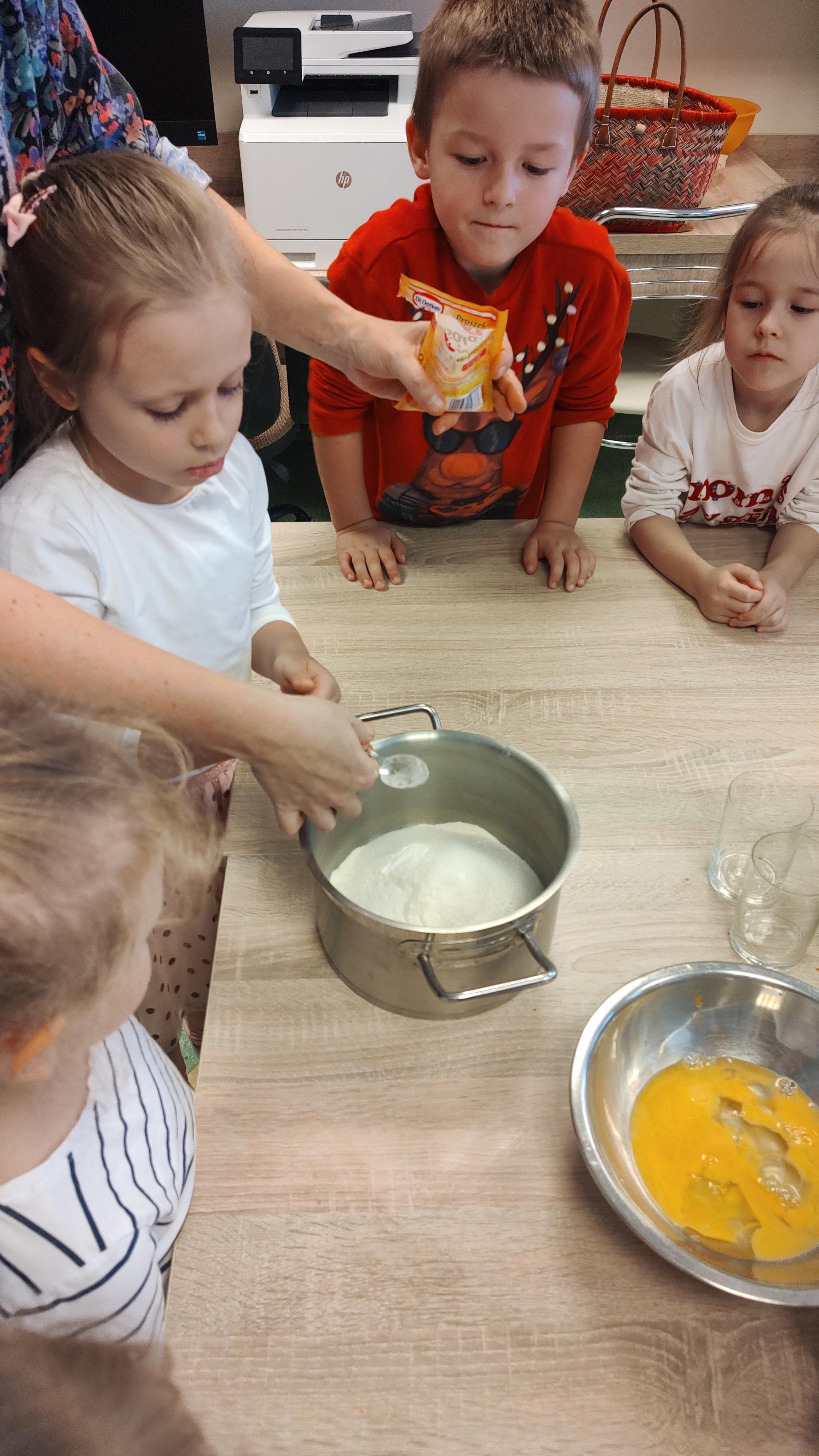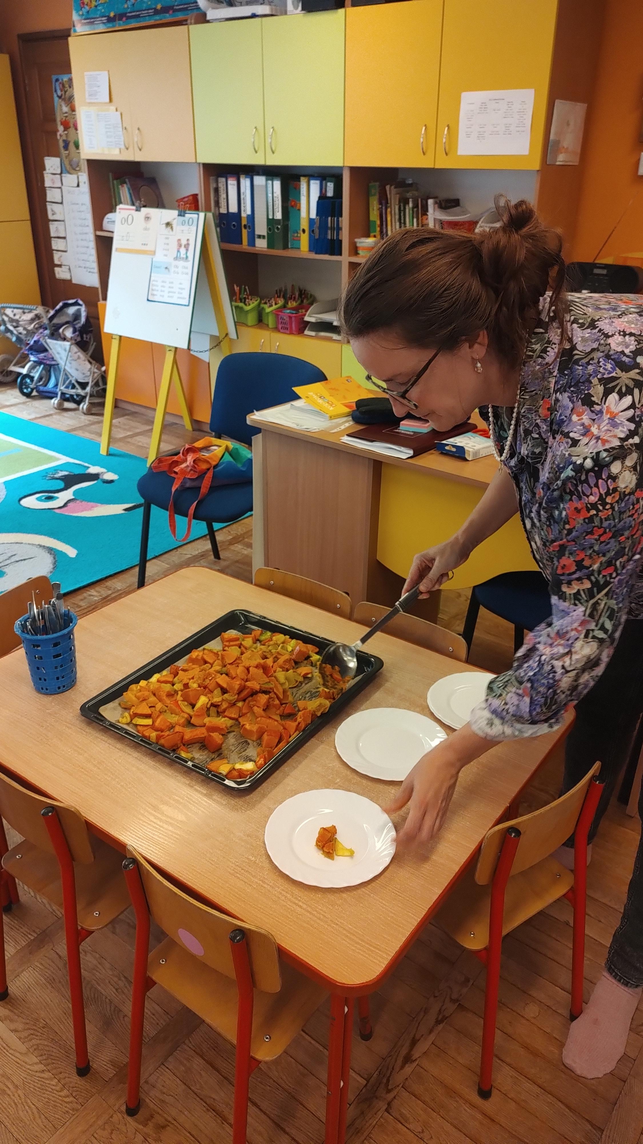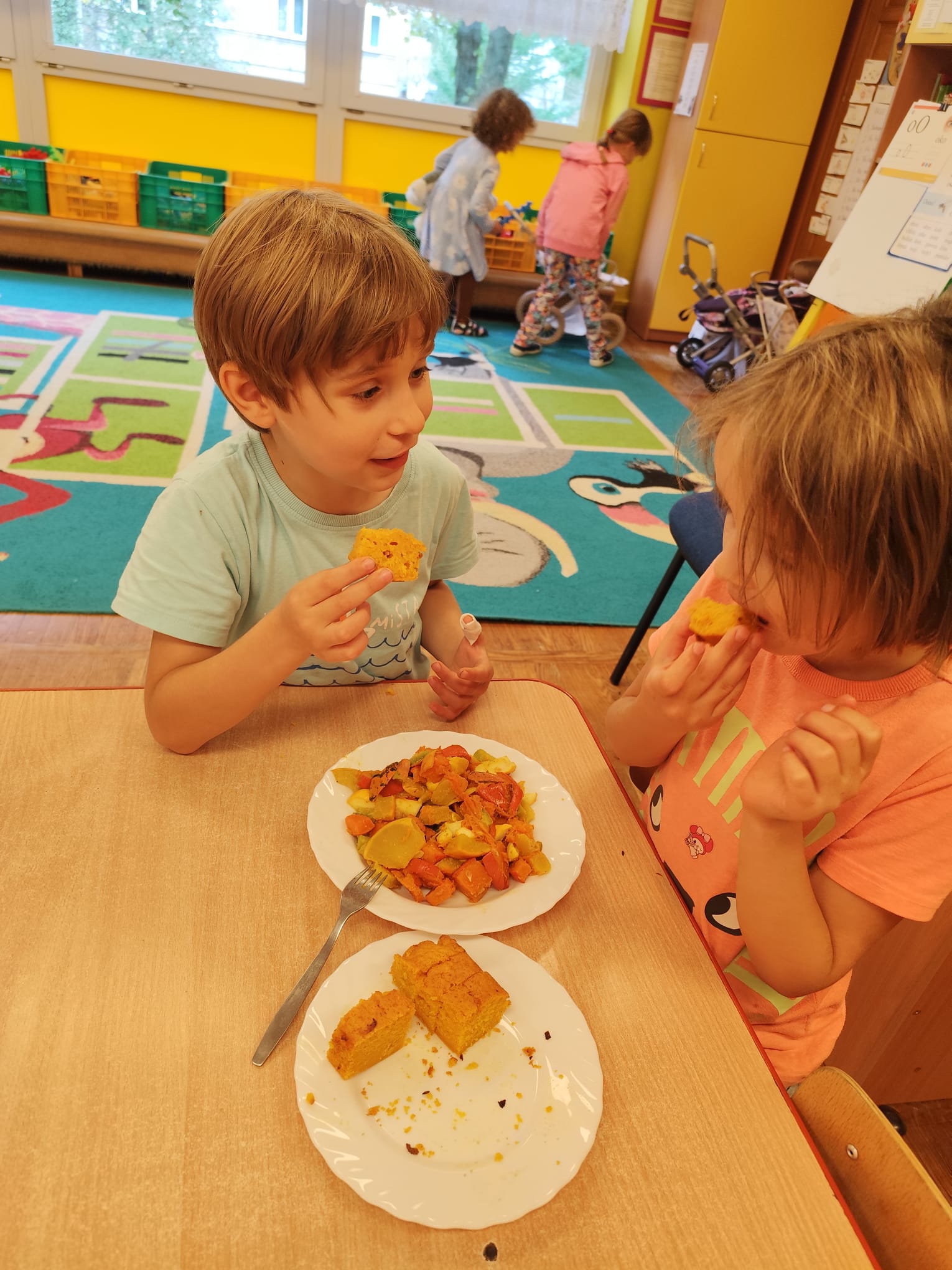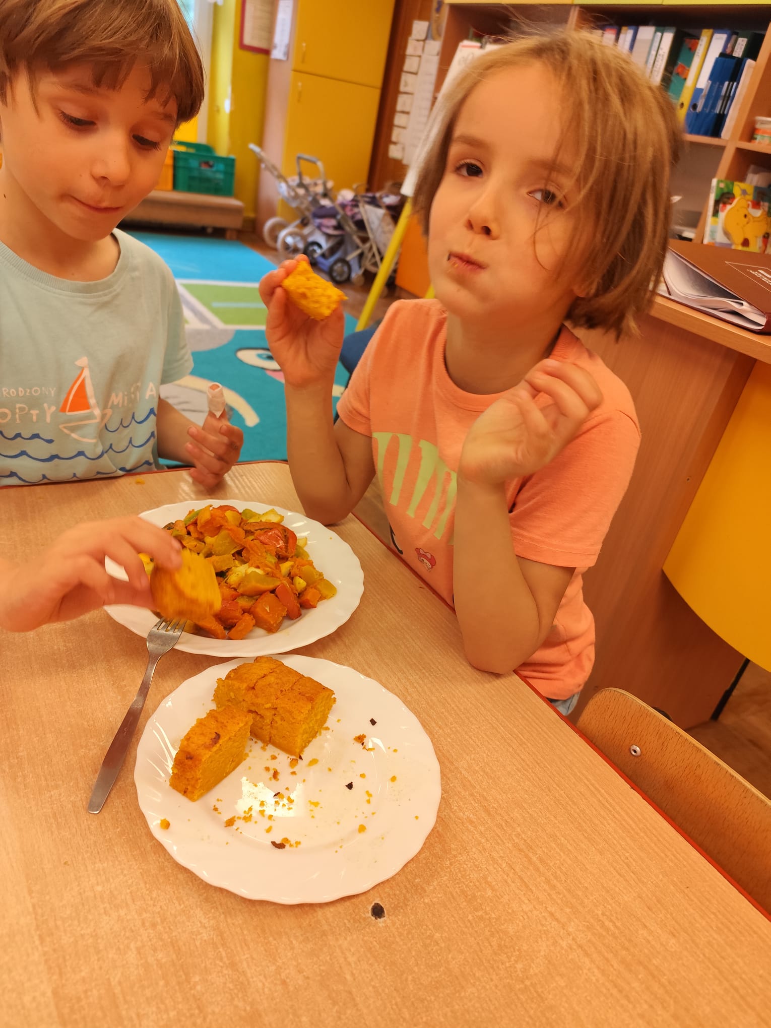W poniedziałek 6.10.25 dzieci wspólnie z Panią Małgosią przygotowały i upiekły- dynię i ciasto dyniowe. Robota szła doskonale- było krojenie, ścieranie, mieszanie, miksowanie. Nie obyło się bez "pierwszej pomocy"! Niektóre palce ucierpiały podczas działeń! Ale było warto! Zjedliśmy dynię z przyprawami - sól, czosnek i chili i słodkie, wilgotne ciasto!